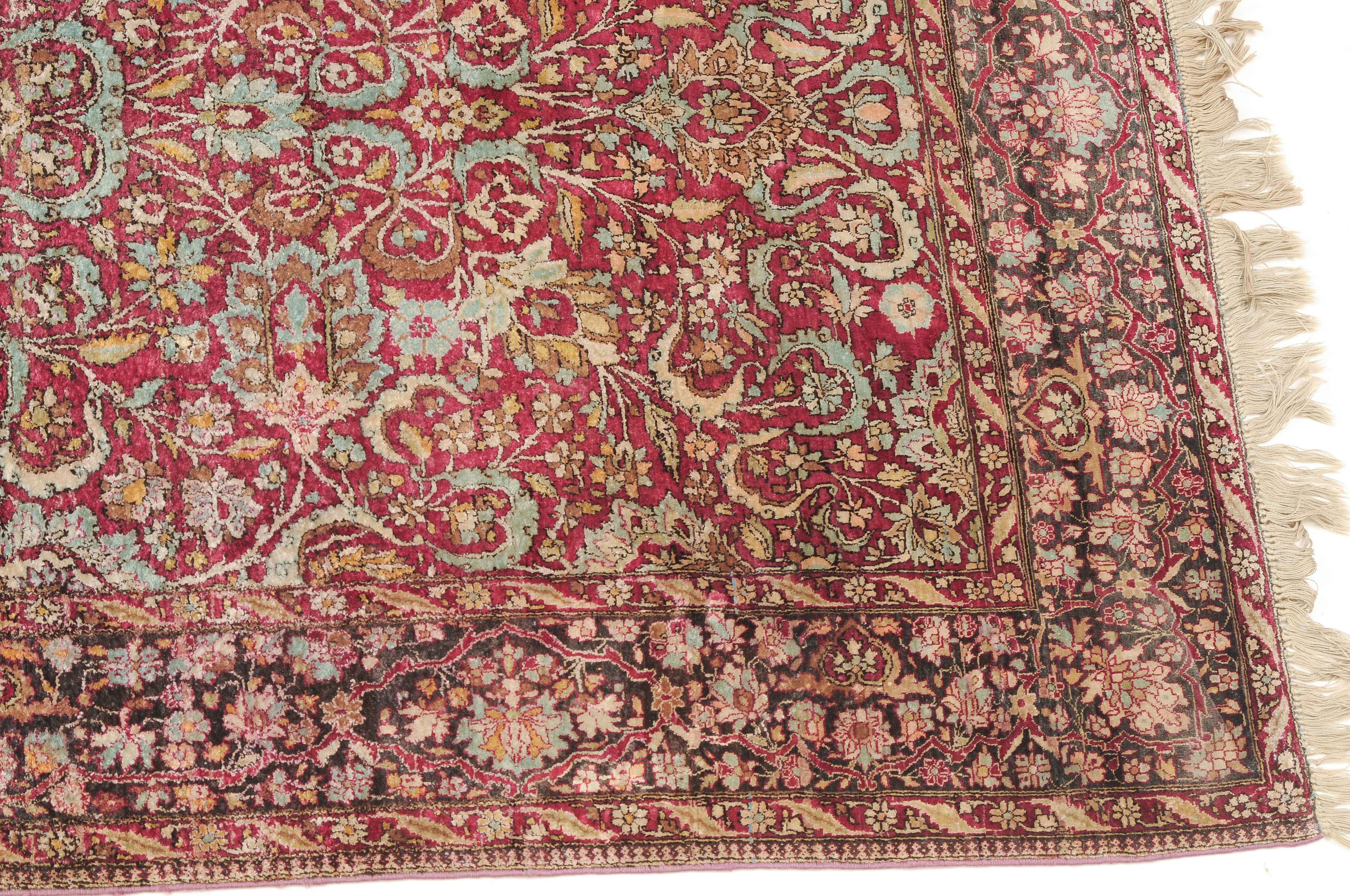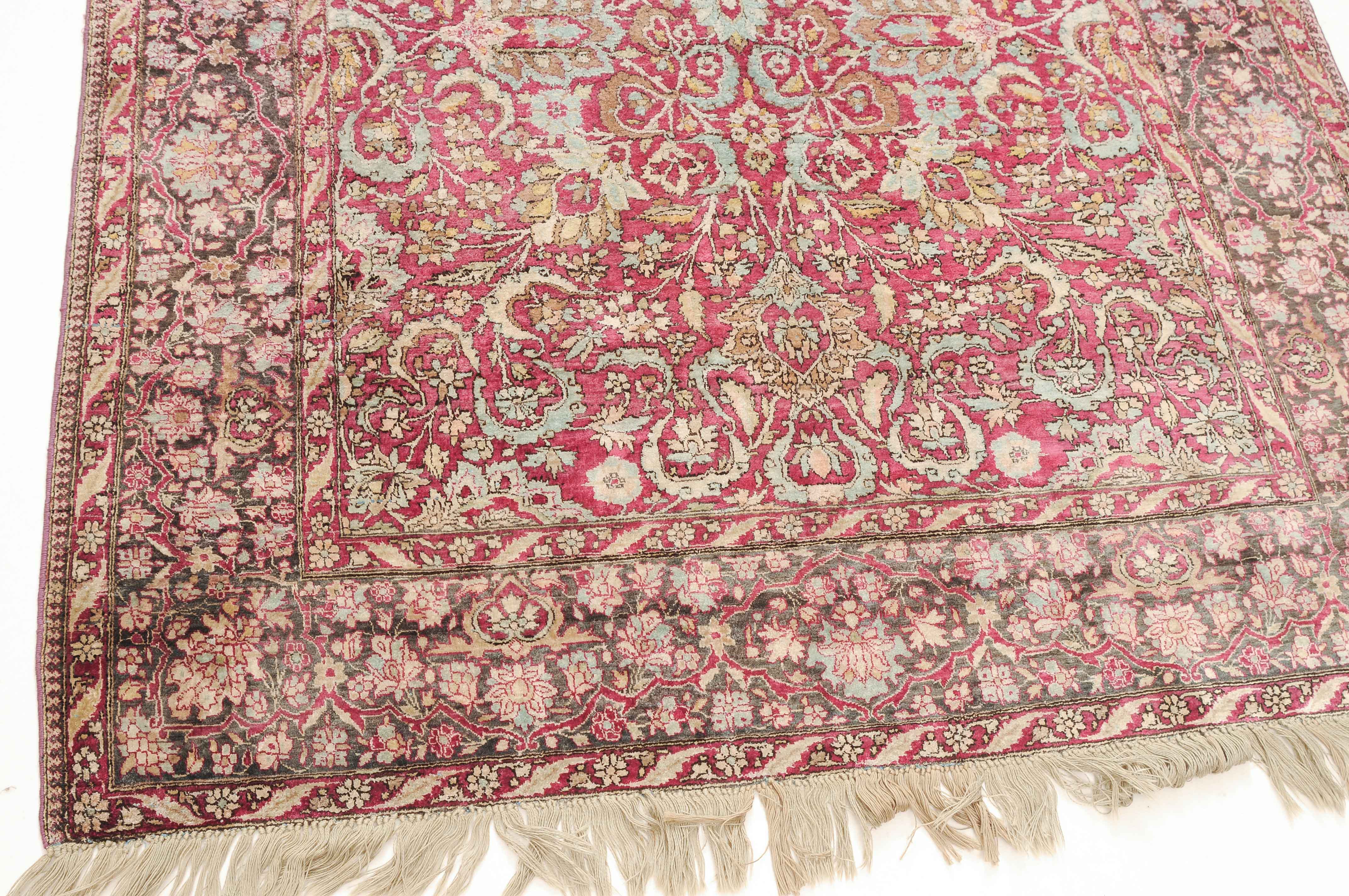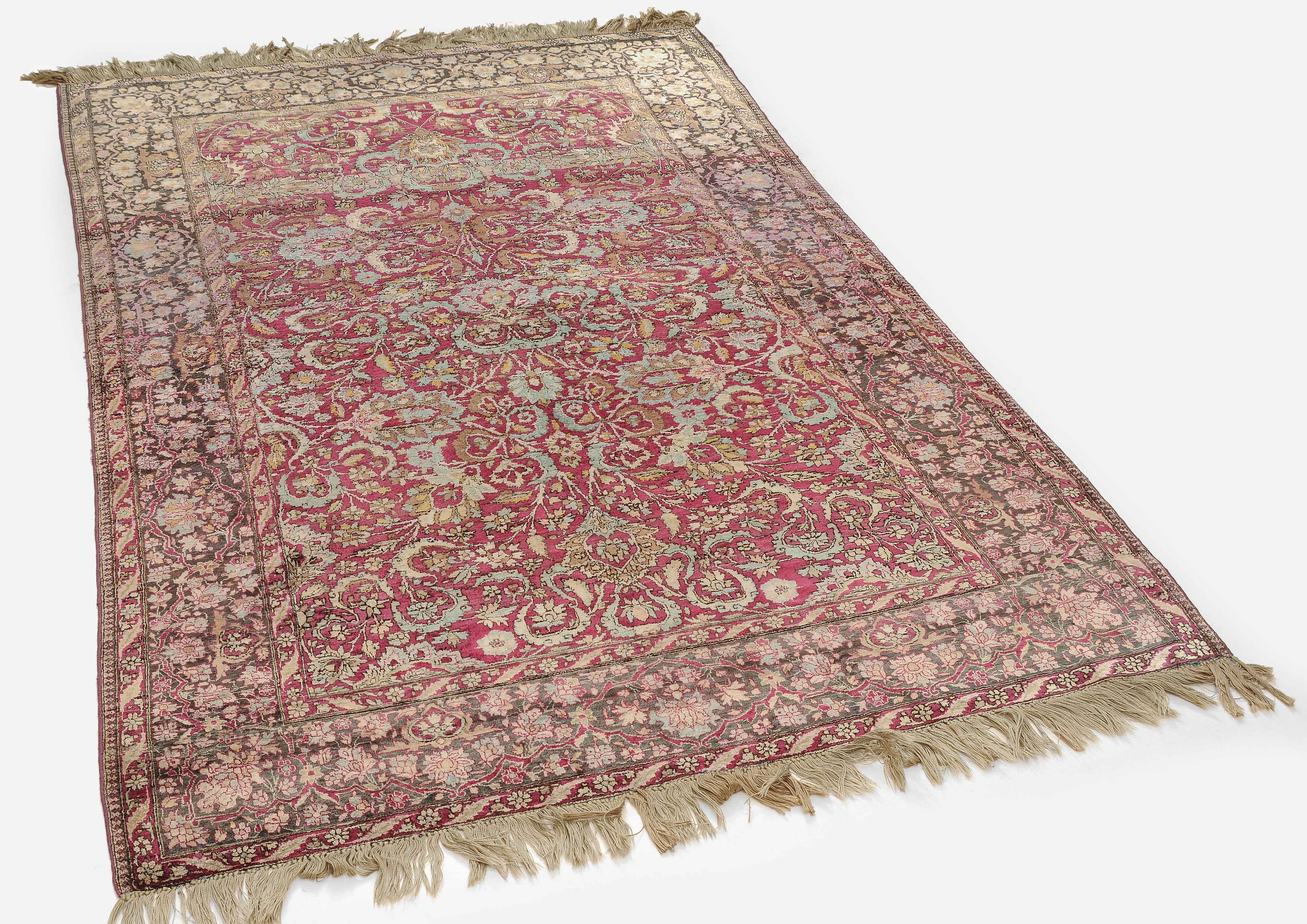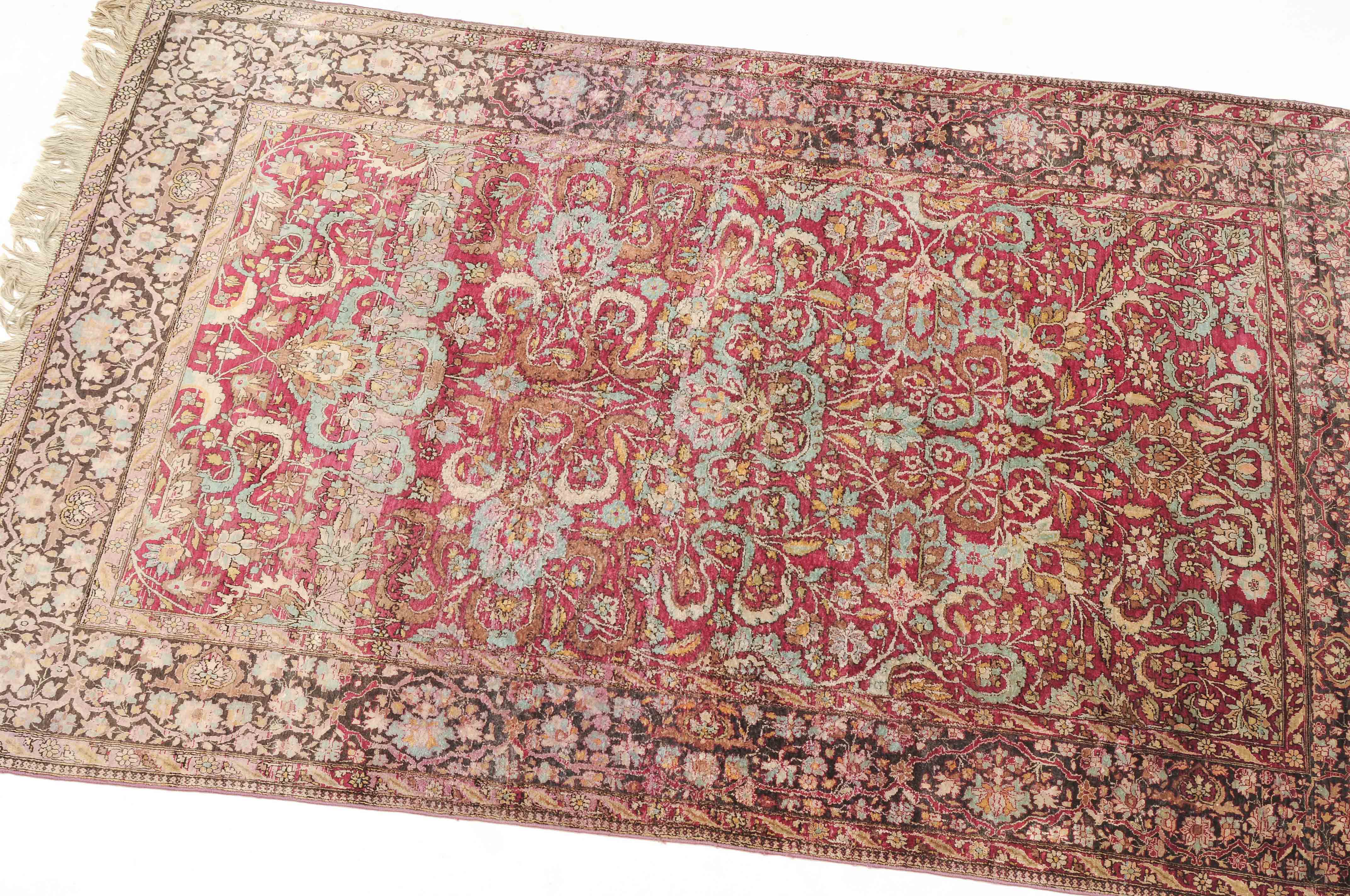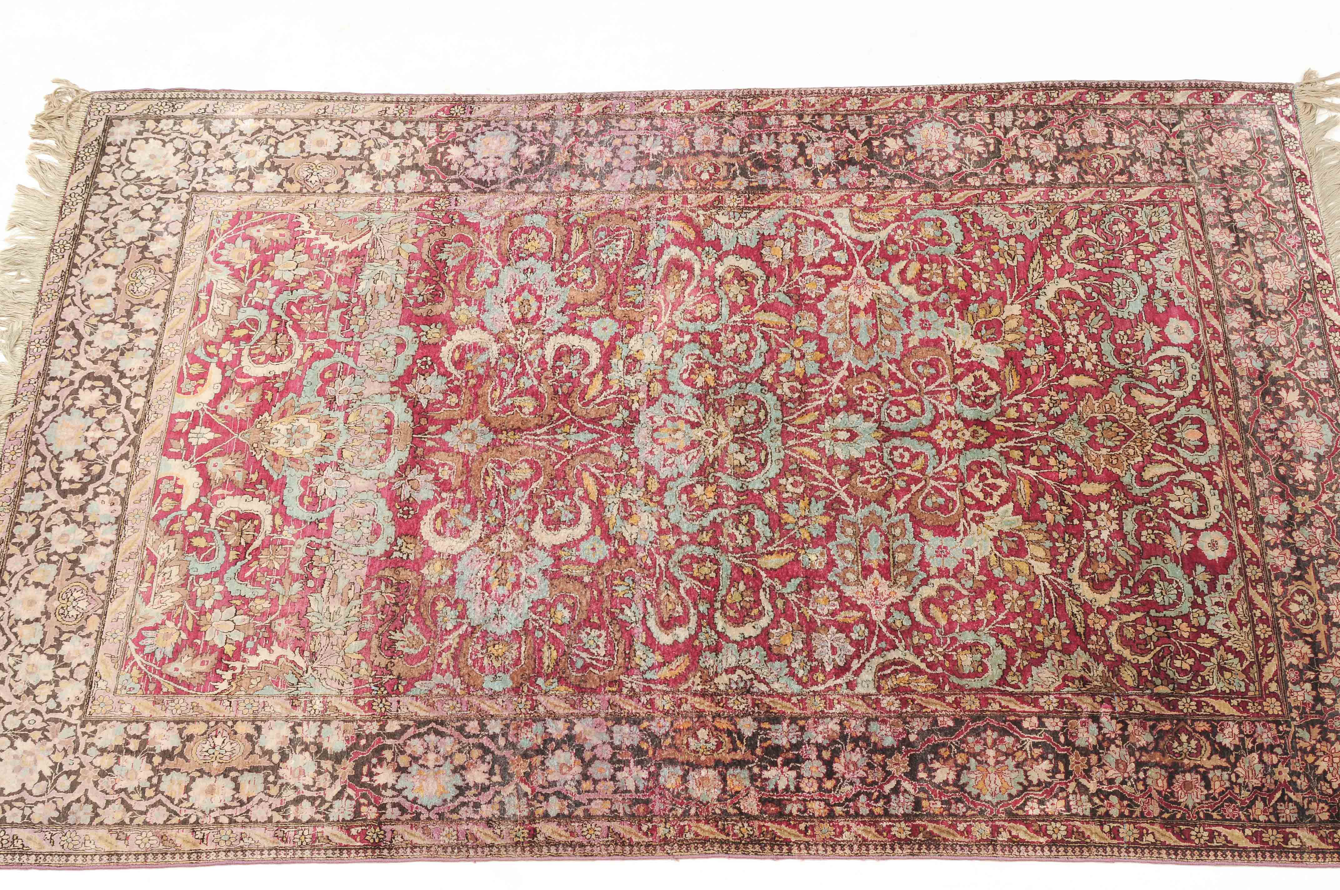 Z-Persien, um 1900. Flormaterial reine Seide. Rotes, durchgehend mit aparten Palmetten, Blattranken, Blüten und hellblauen Wolkenbändern in unendlichem Rapport belegtes Mittelfeld. 2 Nebenbordüren umranden die breite braune Hauptbordüre, die mit prächtigen Blüten, Kartuschen und Blattranken auf dekorative Weise geschmückt ist. Natürlicher Abrash. Gute Erhaltung. 126x205 cm (ft. 4.2x6.8).