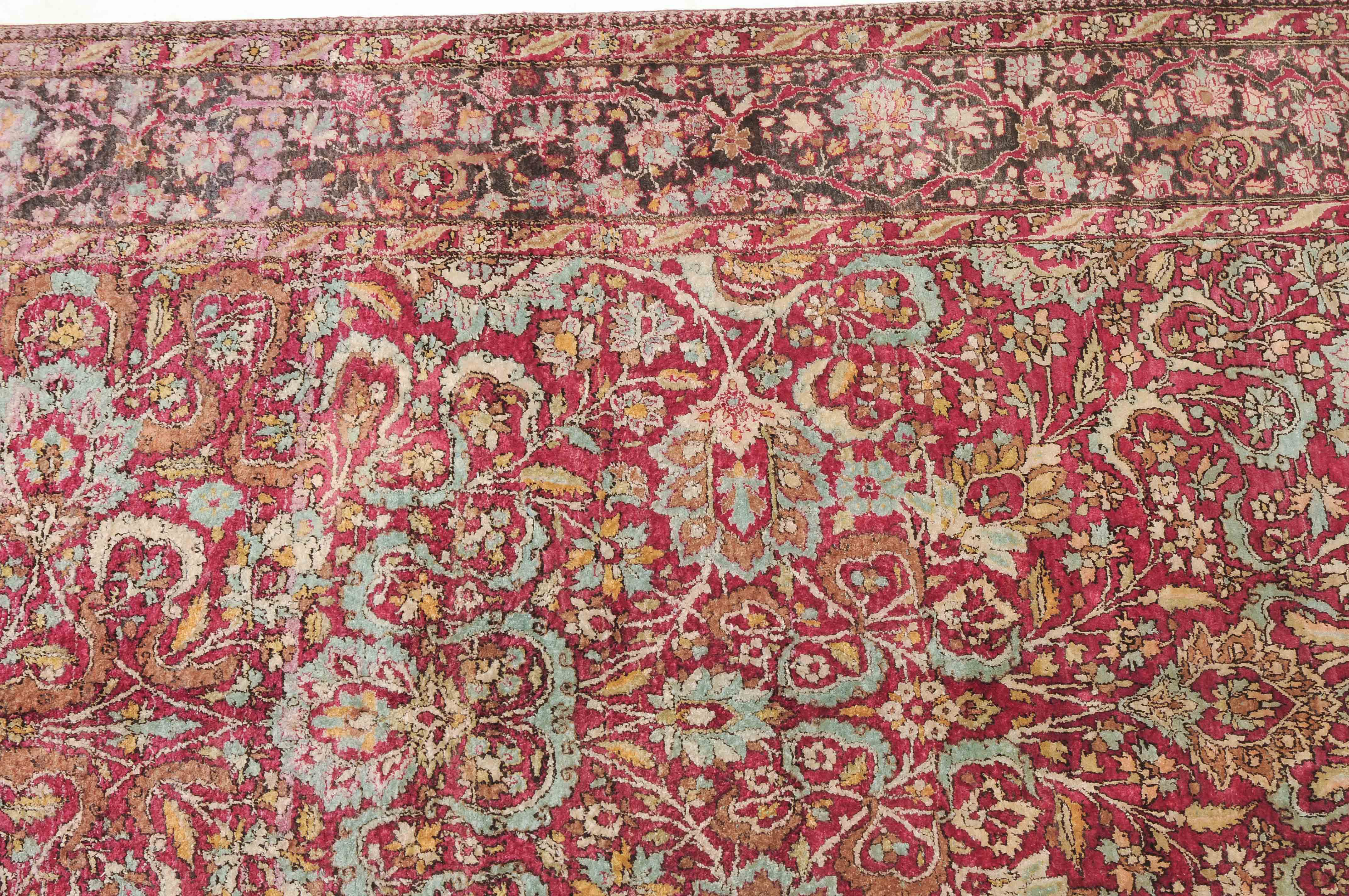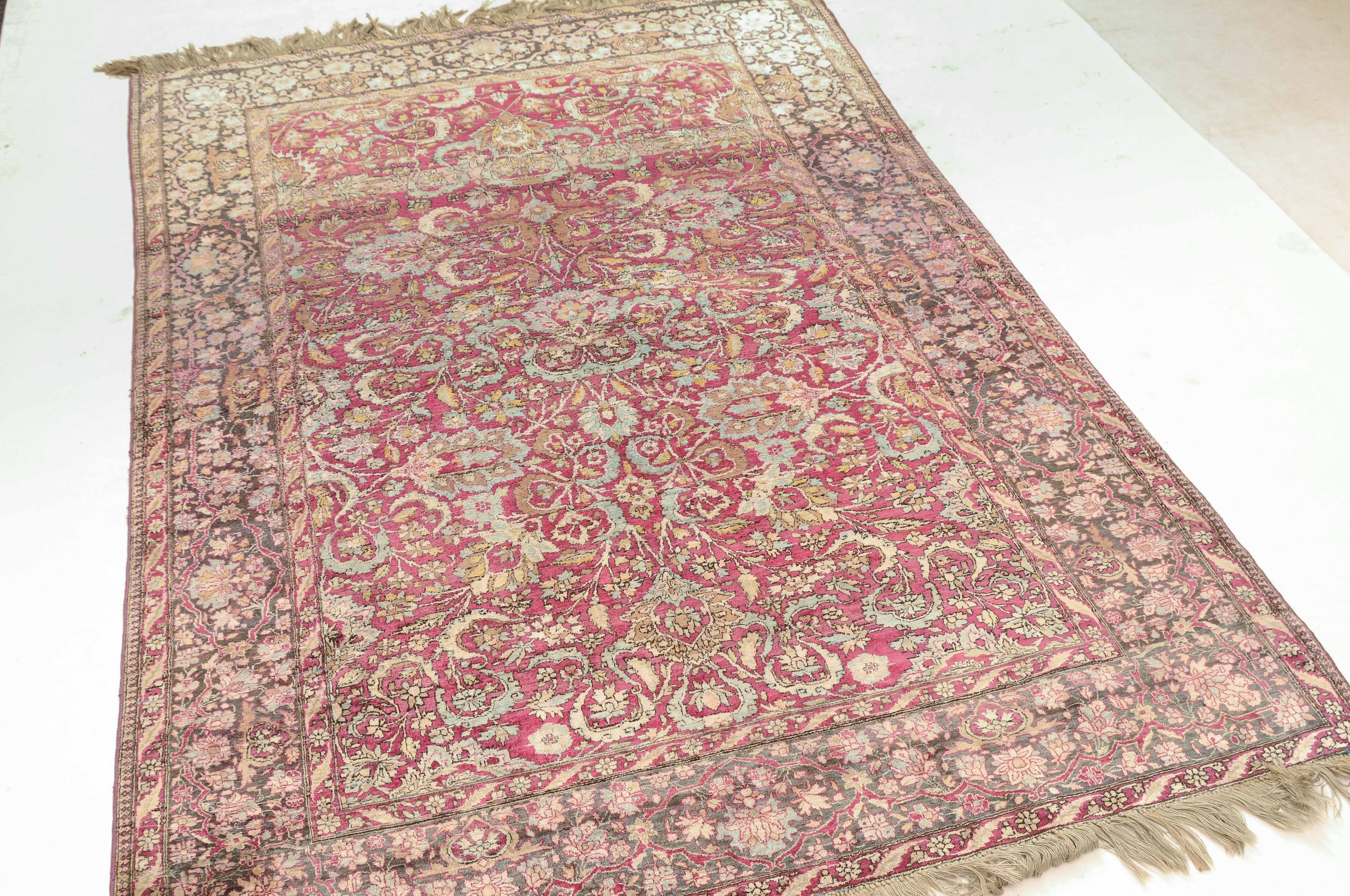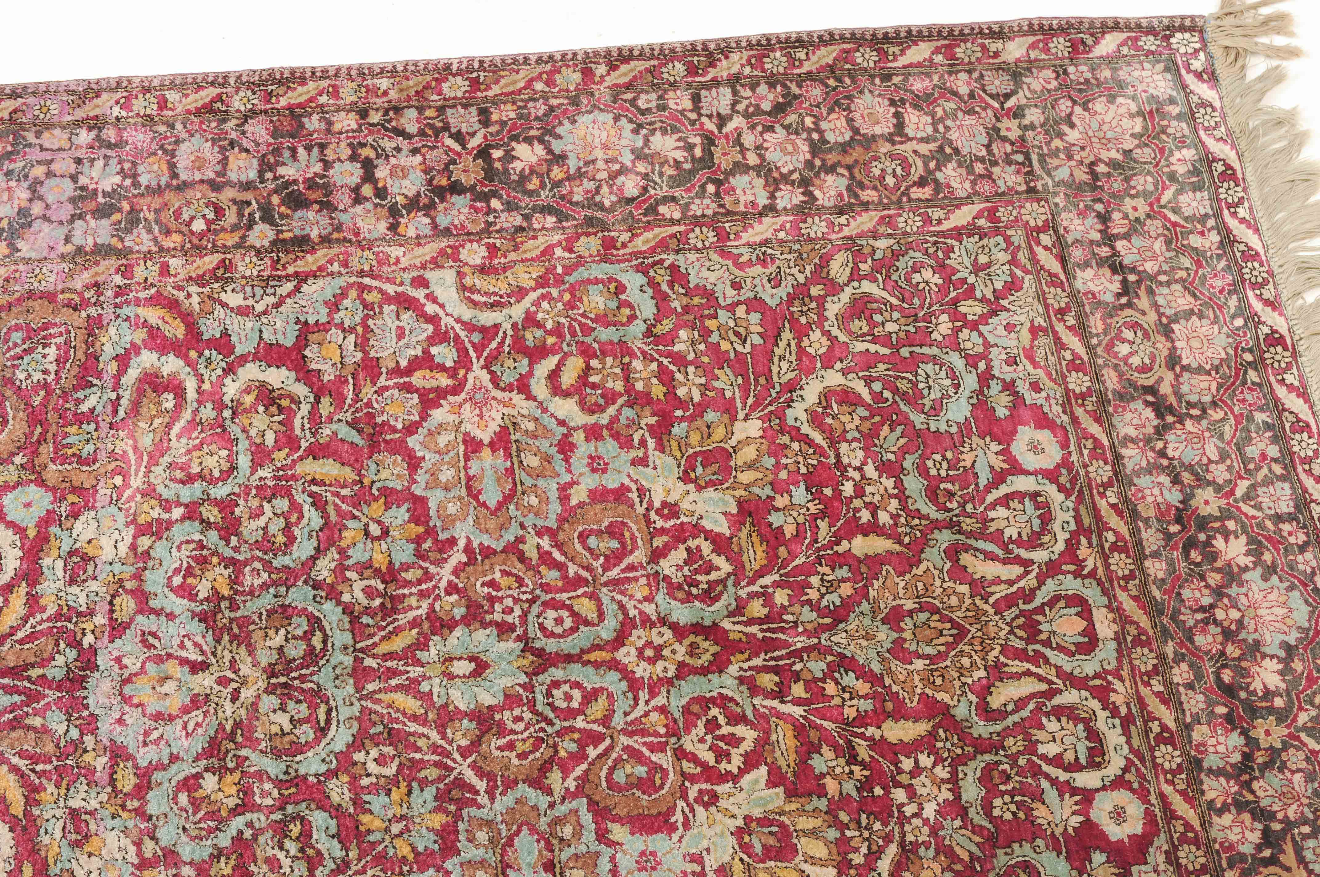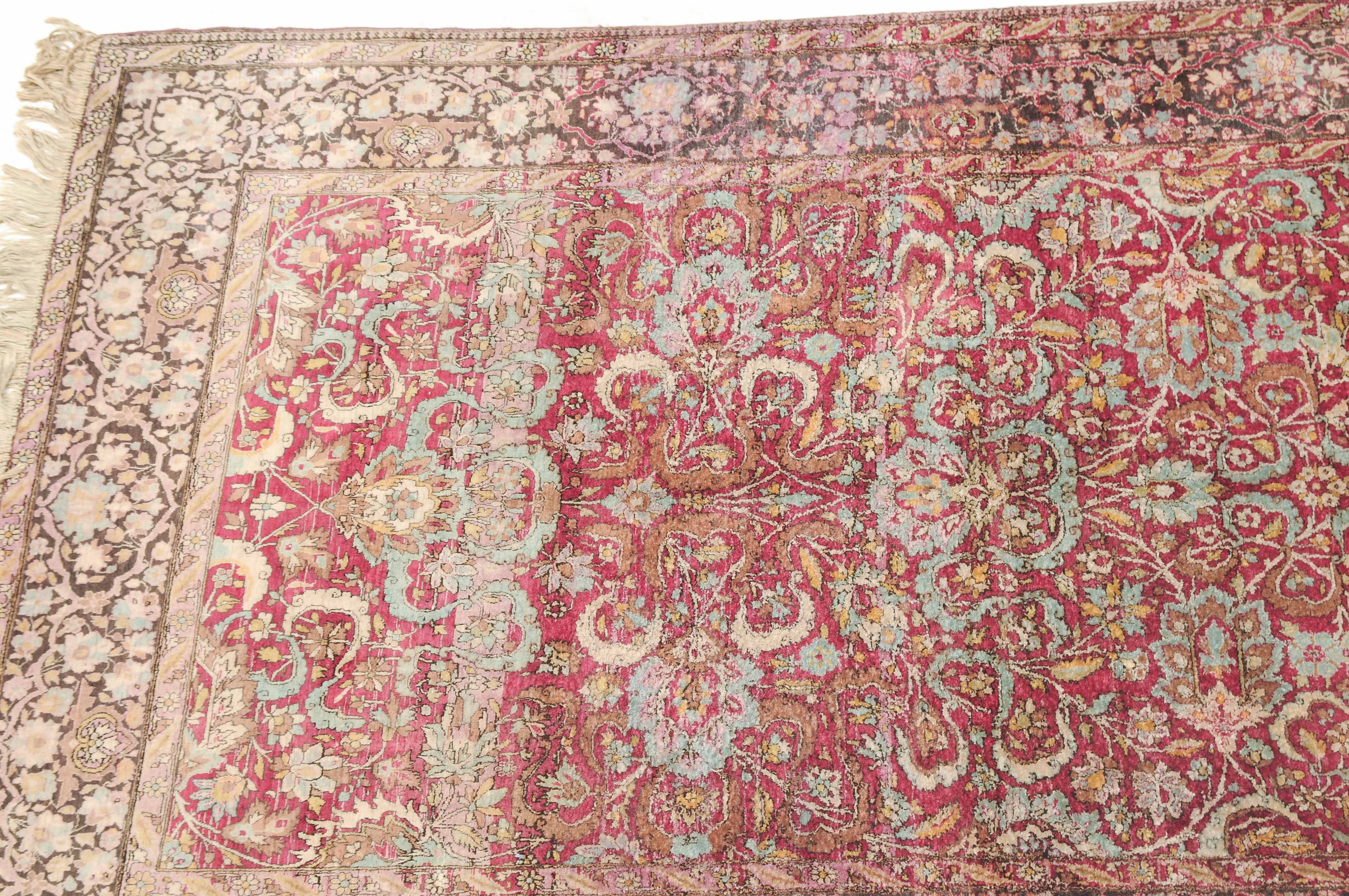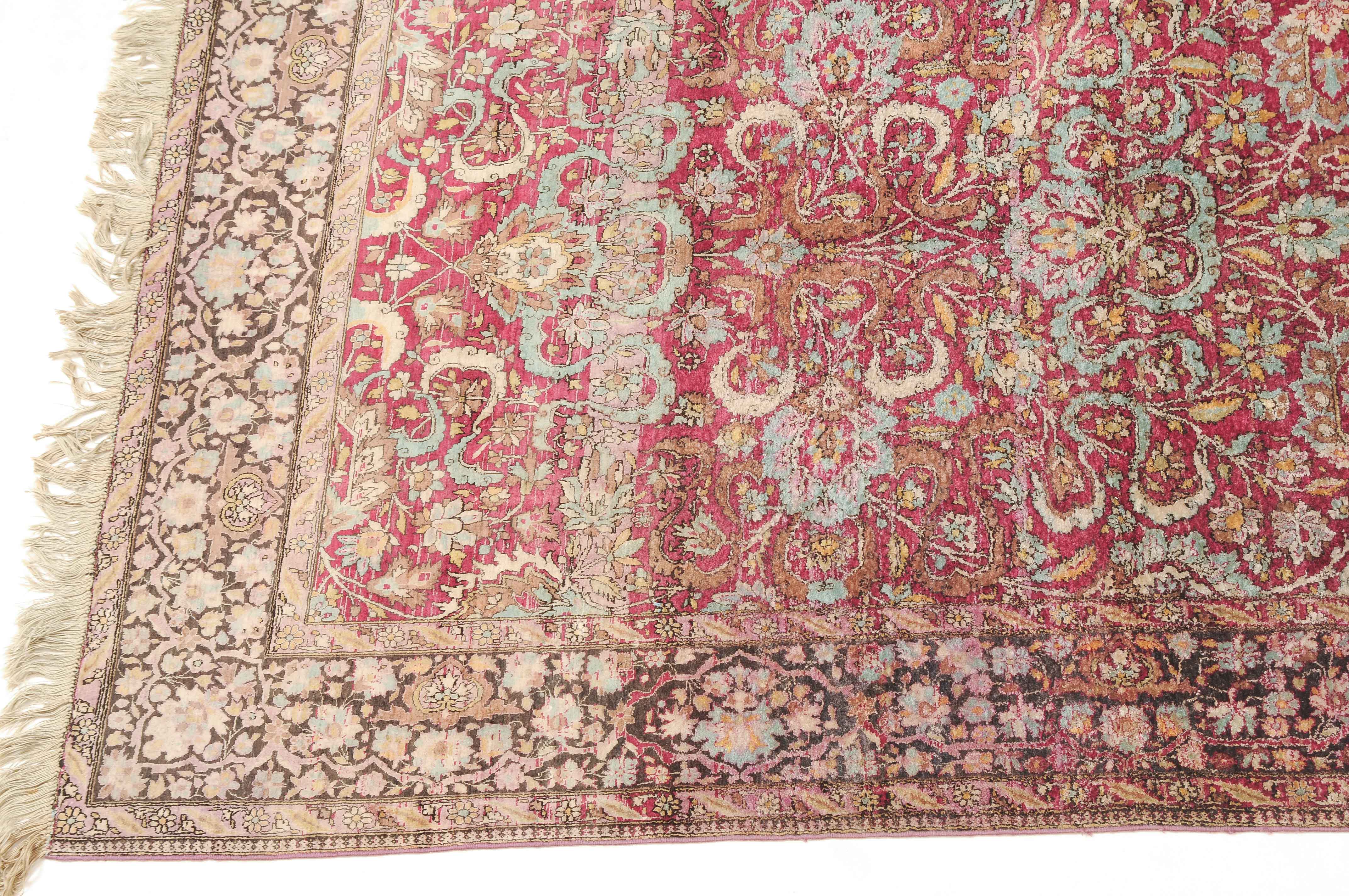 Z-Persien, um 1900. Flormaterial reine Seide. Rotes, durchgehend mit aparten Palmetten, Blattranken, Blüten und hellblauen Wolkenbändern in unendlichem Rapport belegtes Mittelfeld. 2 Nebenbordüren umranden die breite braune Hauptbordüre, die mit prächtigen Blüten, Kartuschen und Blattranken auf dekorative Weise geschmückt ist. Natürlicher Abrash. Gute Erhaltung. 126x205 cm (ft. 4.2x6.8).