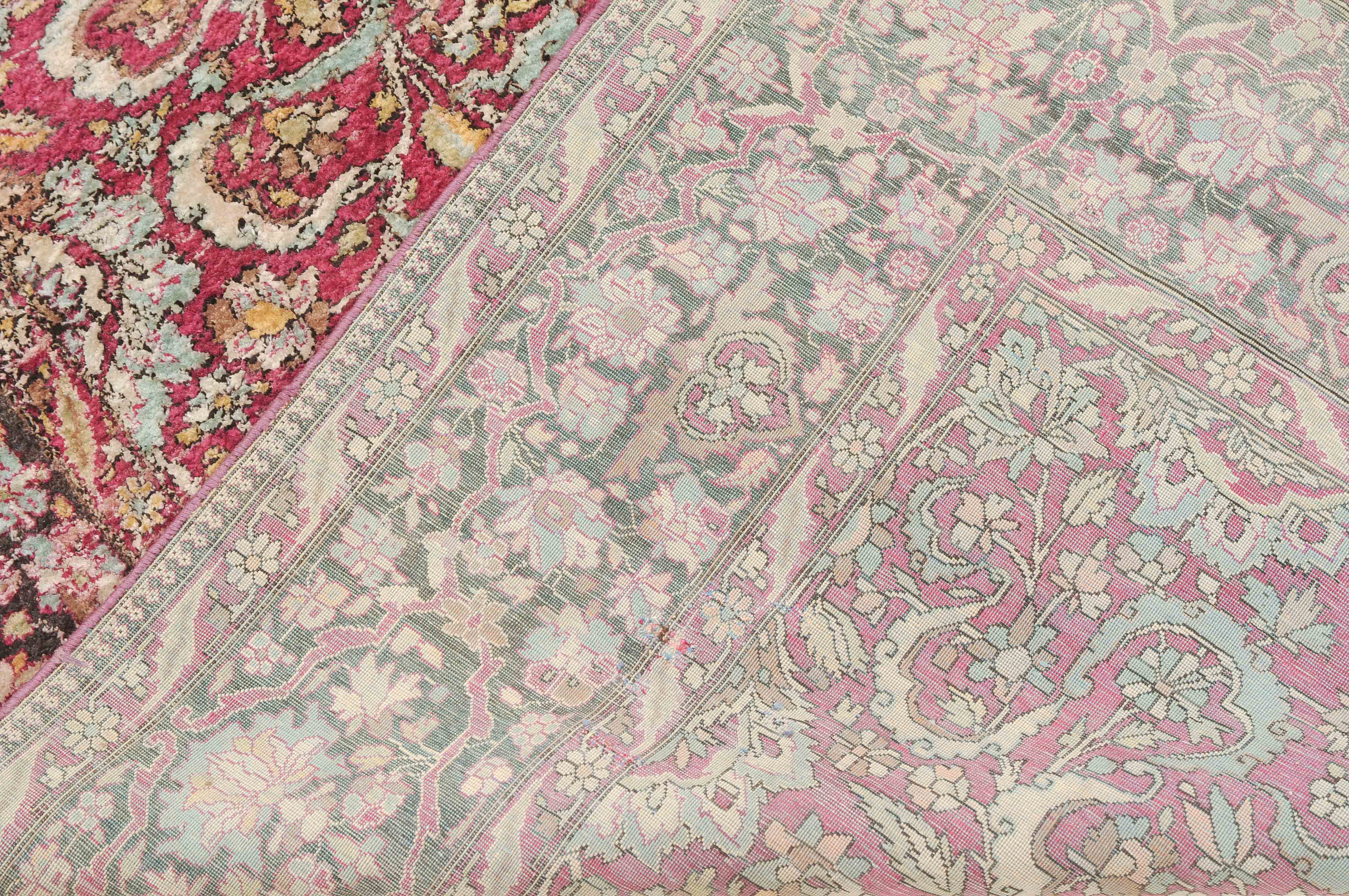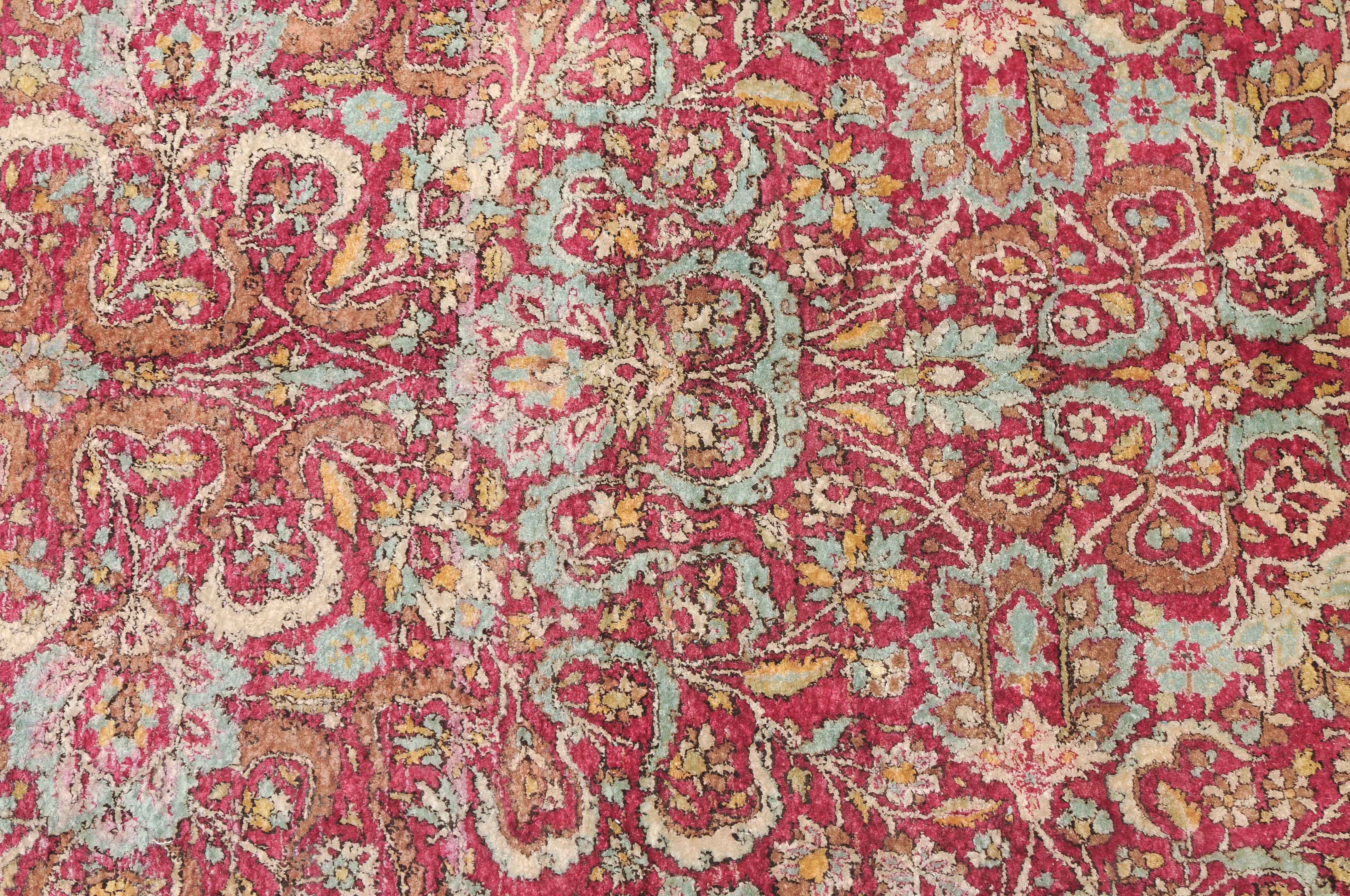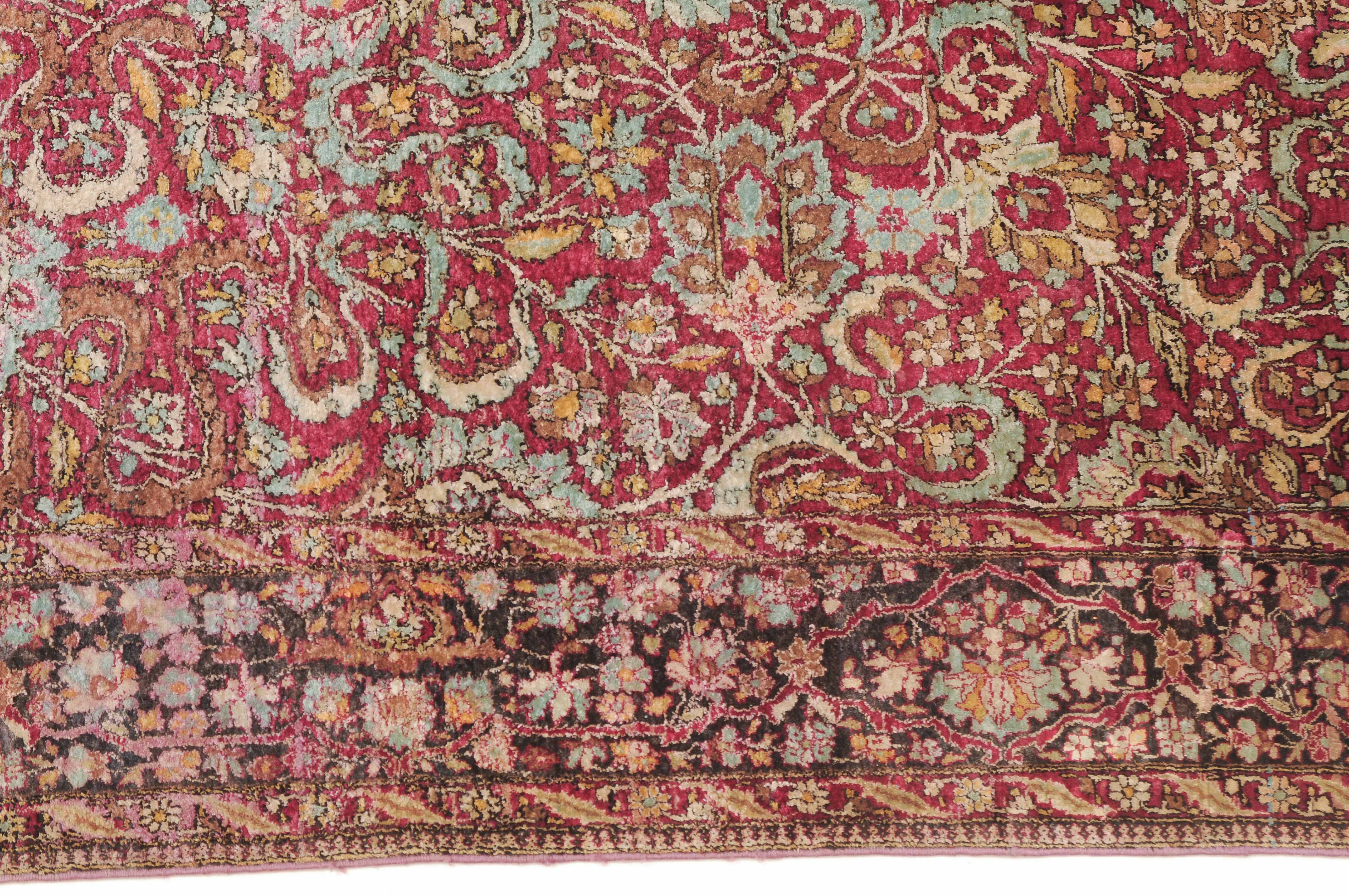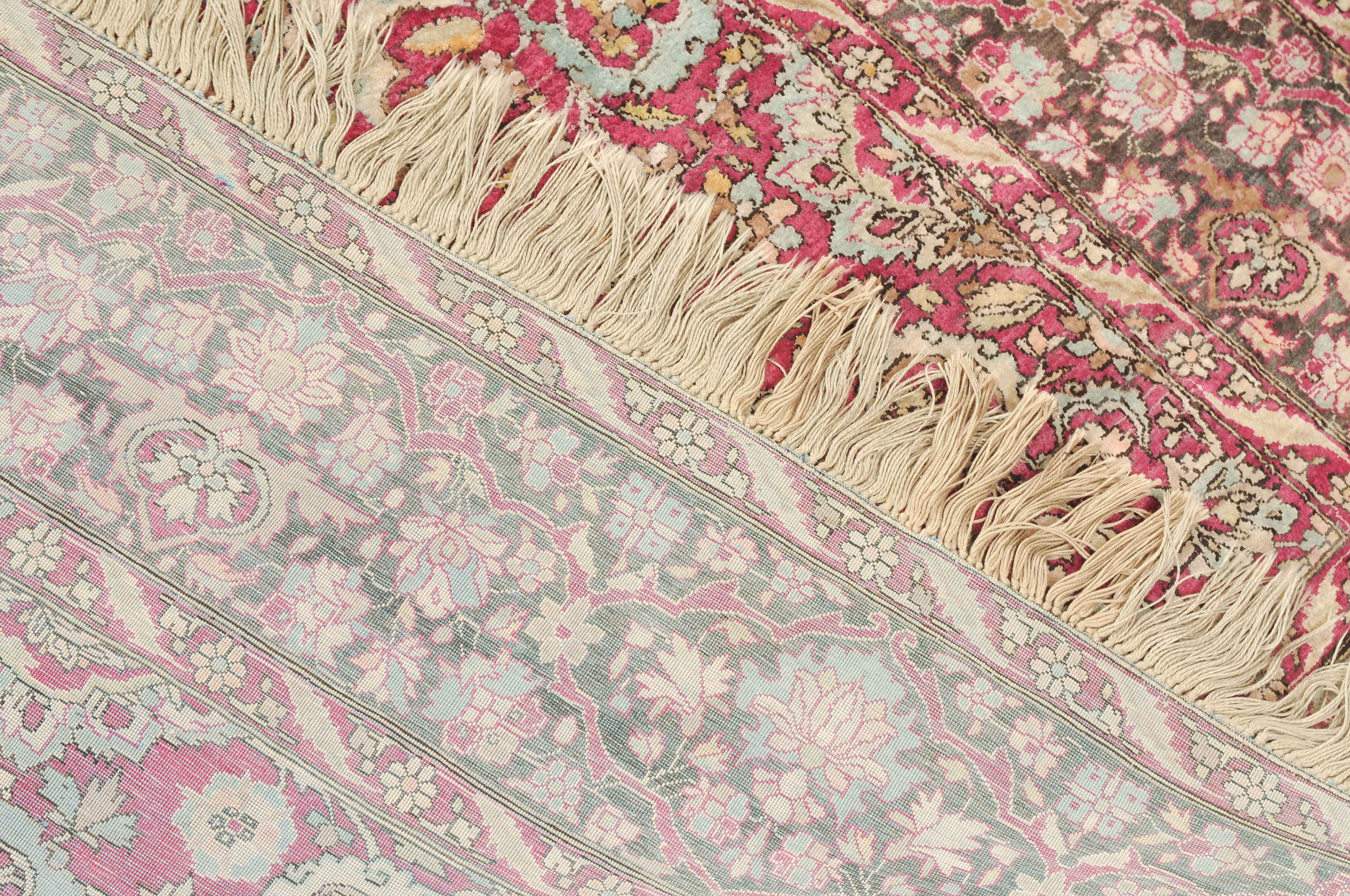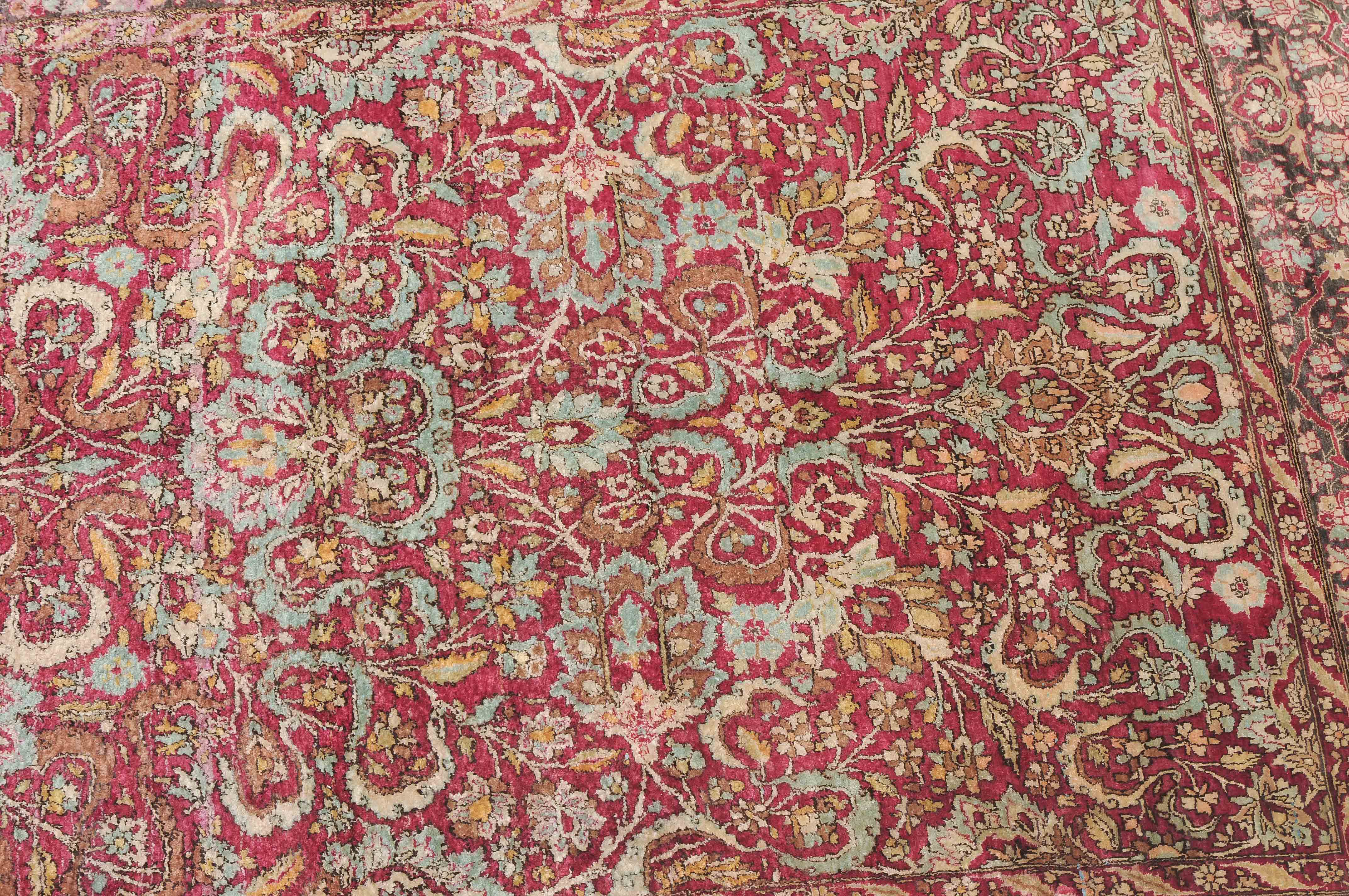 Z-Persien, um 1900. Flormaterial reine Seide. Rotes, durchgehend mit aparten Palmetten, Blattranken, Blüten und hellblauen Wolkenbändern in unendlichem Rapport belegtes Mittelfeld. 2 Nebenbordüren umranden die breite braune Hauptbordüre, die mit prächtigen Blüten, Kartuschen und Blattranken auf dekorative Weise geschmückt ist. Natürlicher Abrash. Gute Erhaltung. 126x205 cm (ft. 4.2x6.8).
