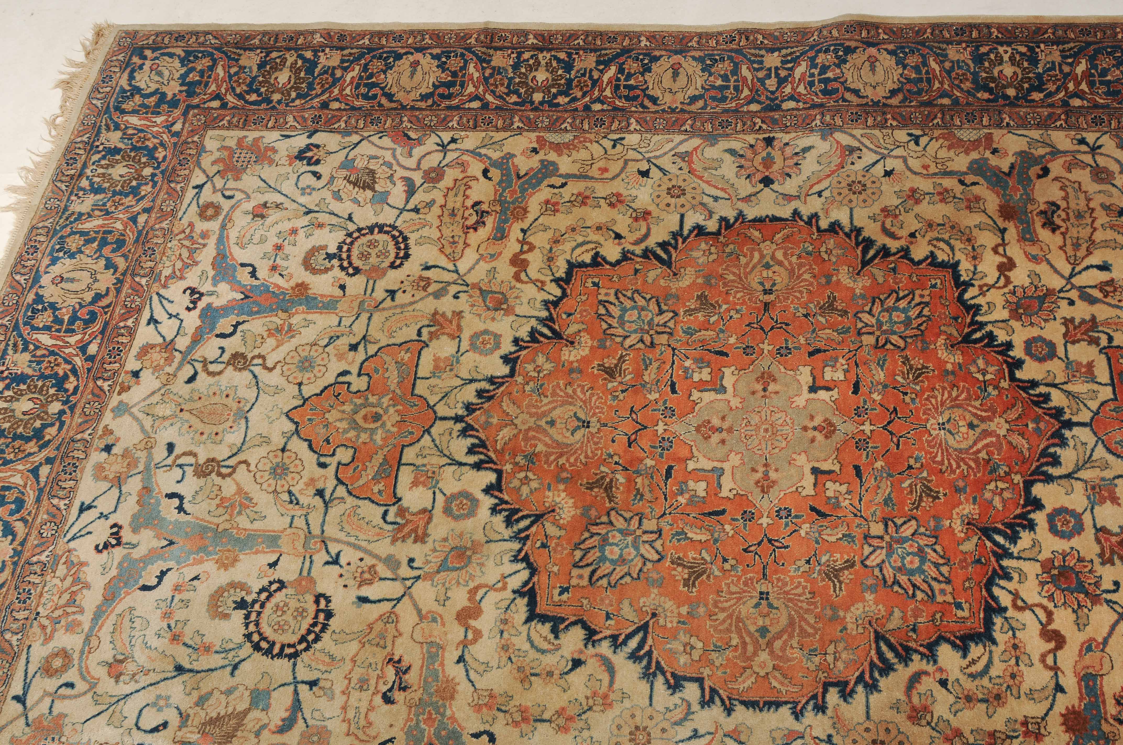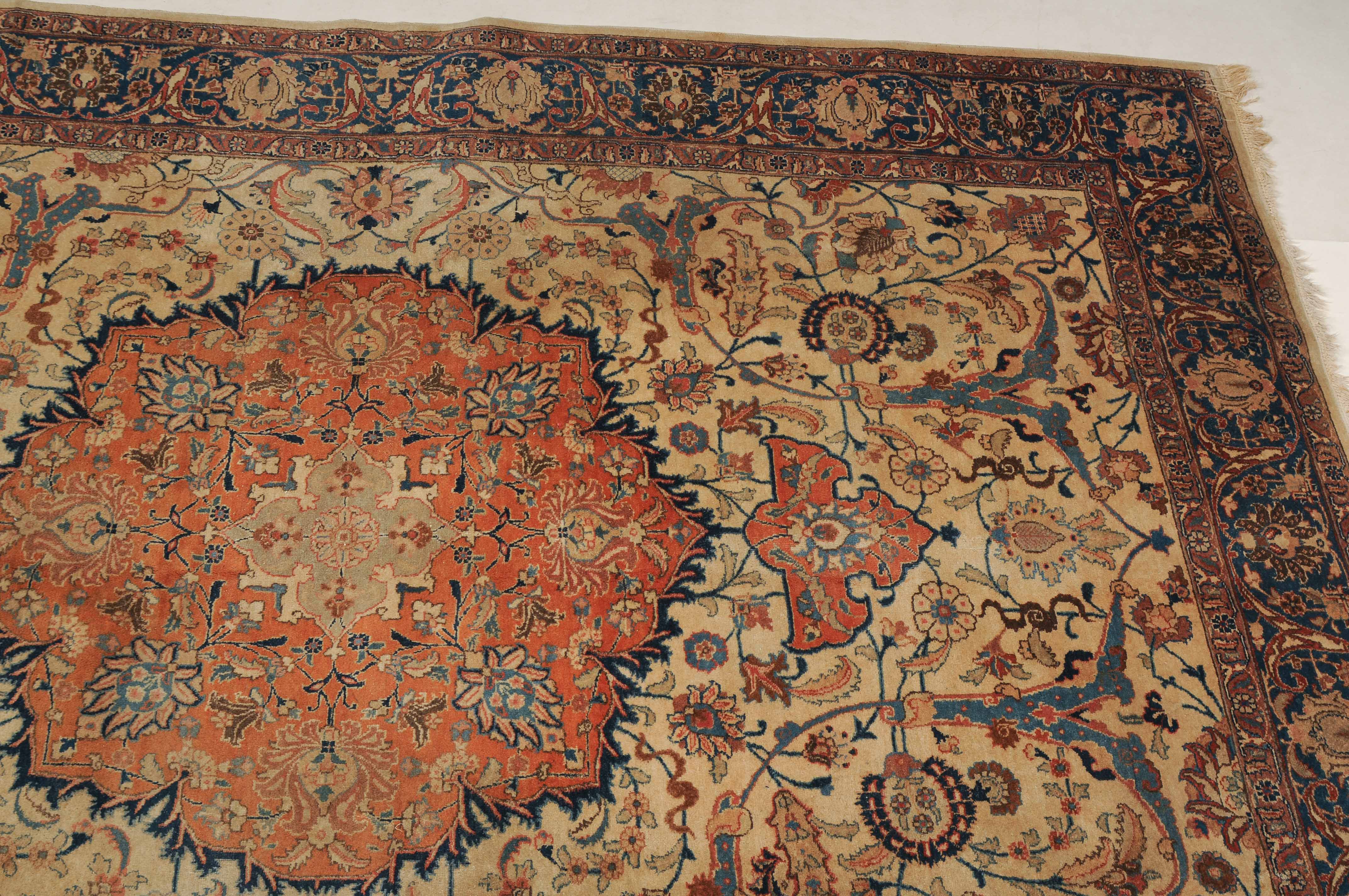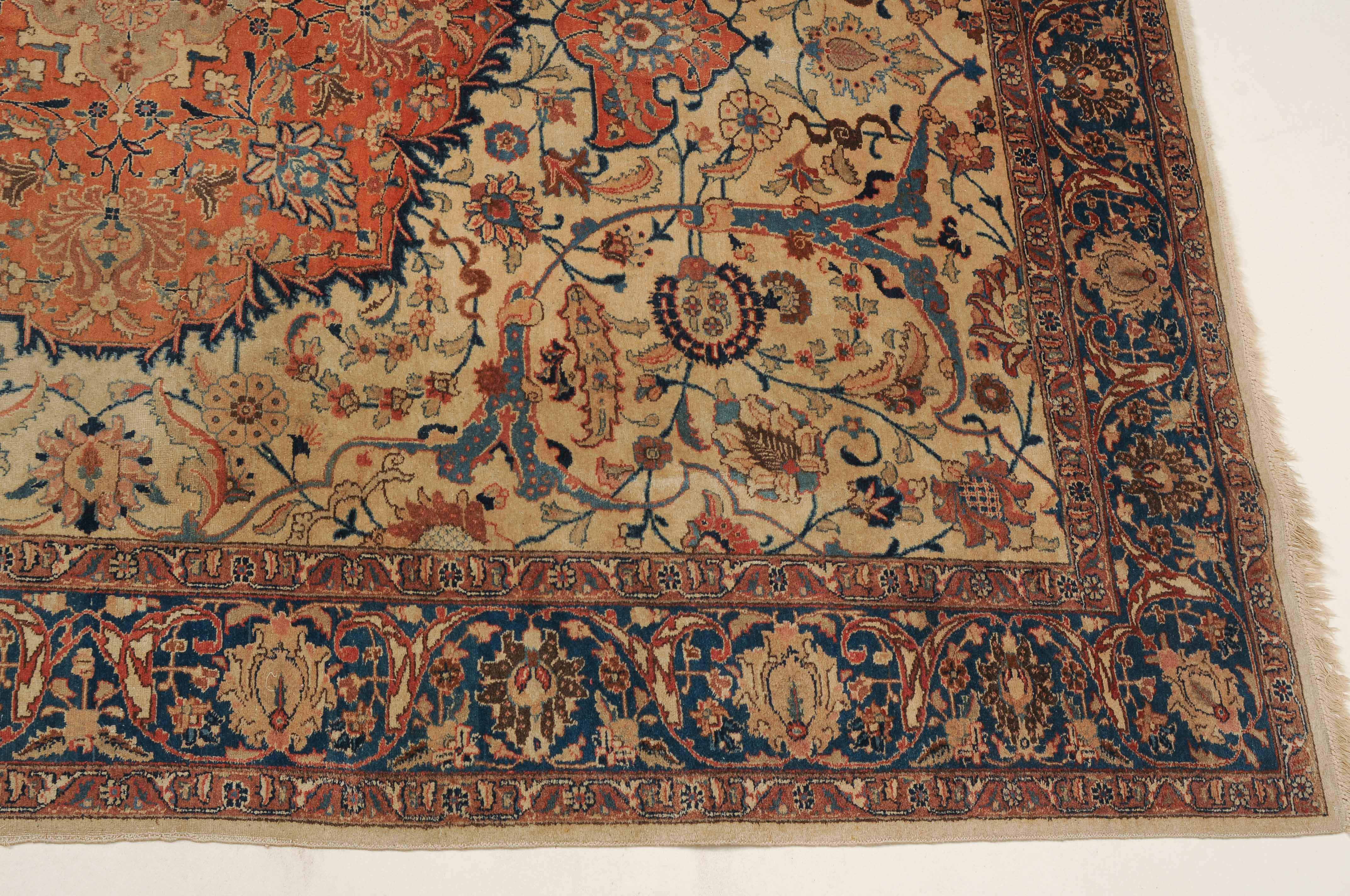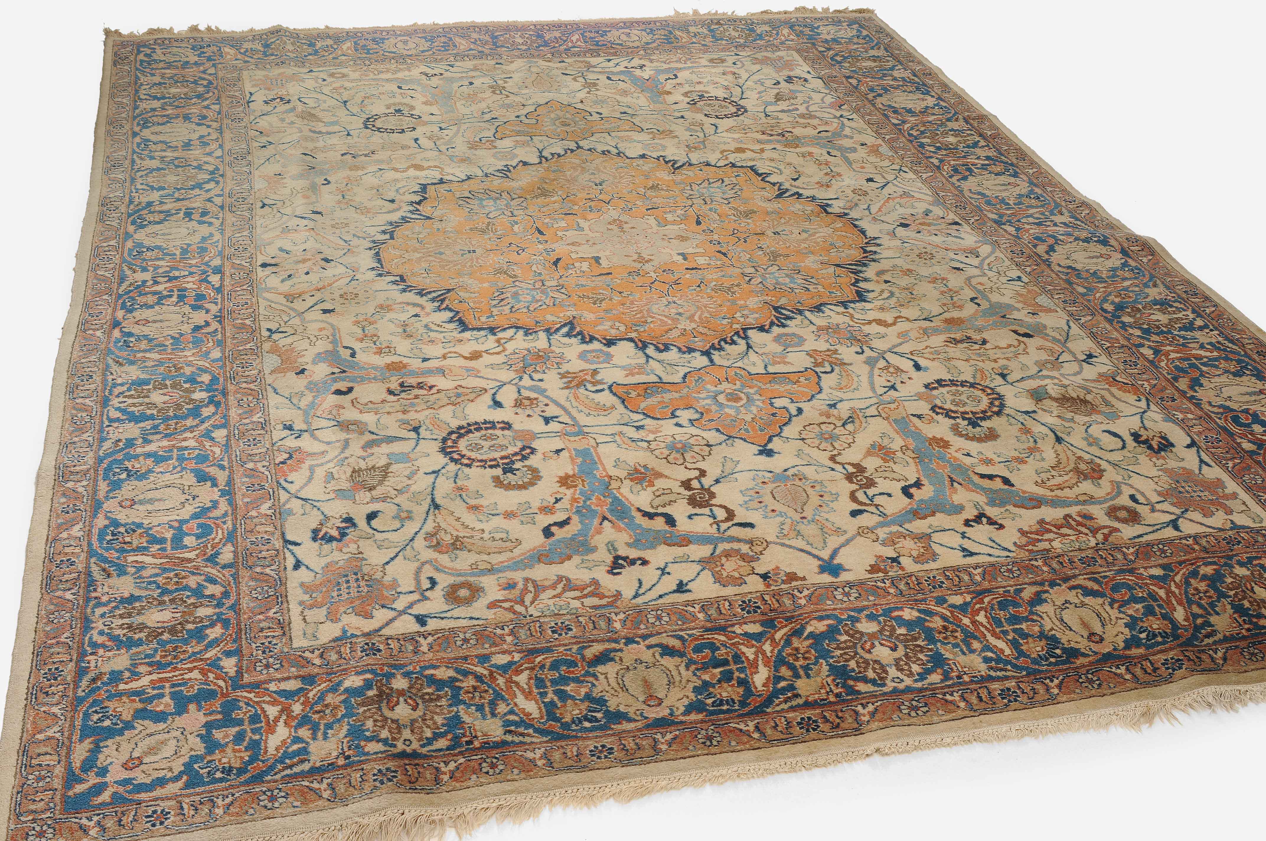 NW-Persien, um 1910. Auf gelbem Grund figuriert ein rötliches geflammtes Rundmedaillon mit 2 Anhängern, flankiert von Palmetten, Ranken-Kompositionen und hellblauen, dekorativ angeordneten Arabesken. 2 florale Nebenbordüren umranden die blaue, mit gerankten Blütenpalmetten apart geschmückte Hauptbordüre. Gebrauchsspuren, reinigungsbedürftig. 240x340 cm (ft. 7.9x11.2).