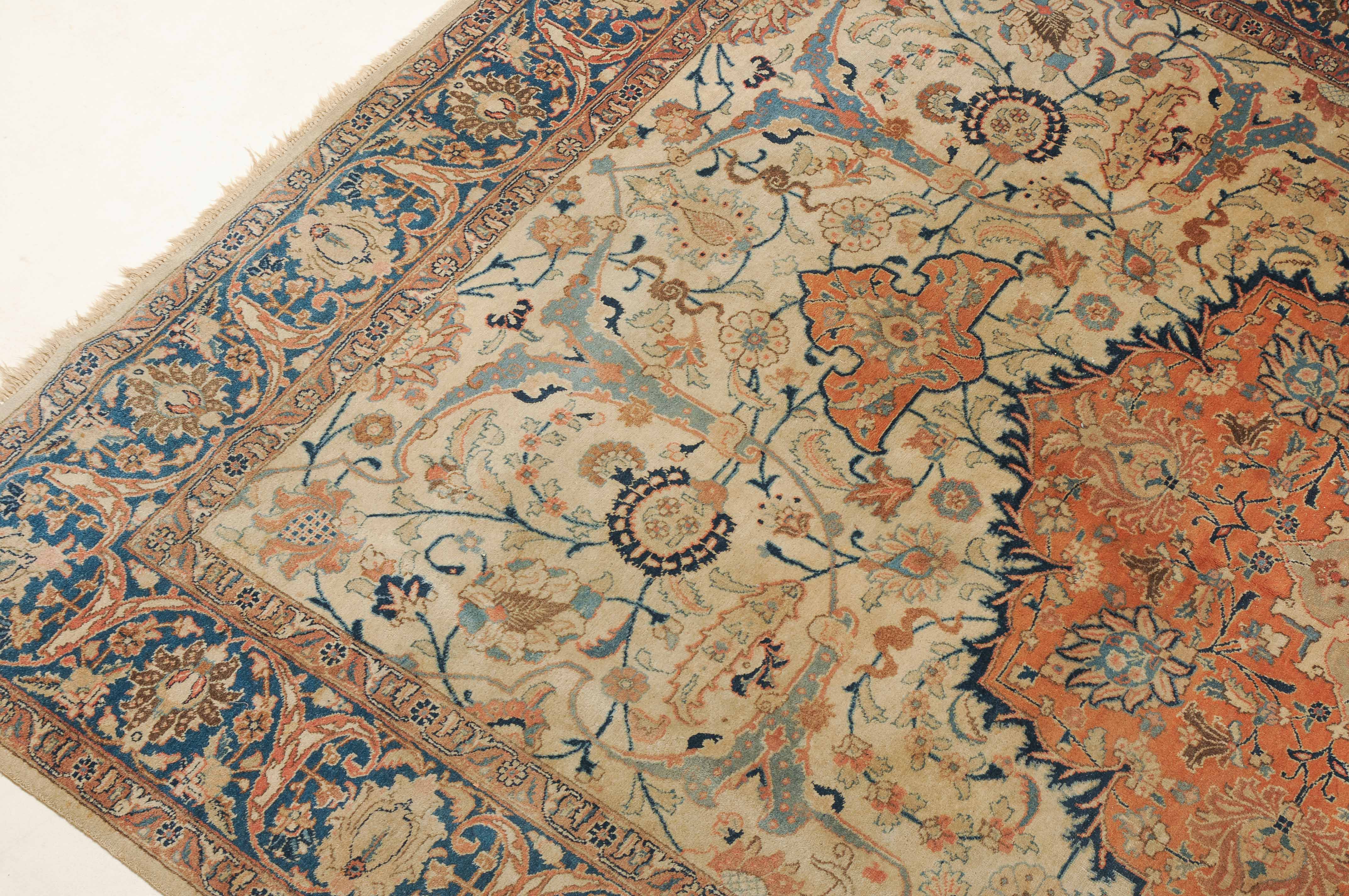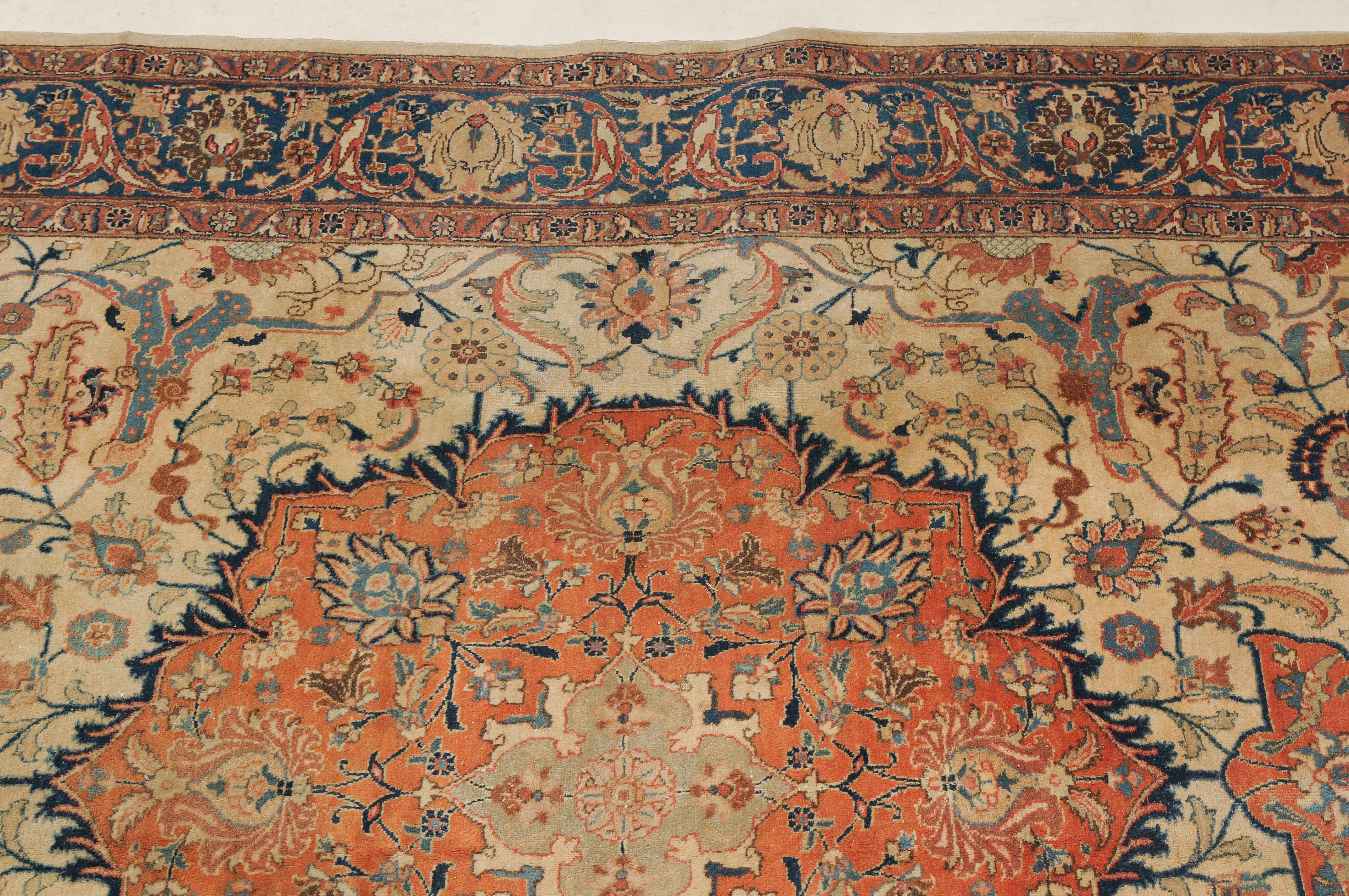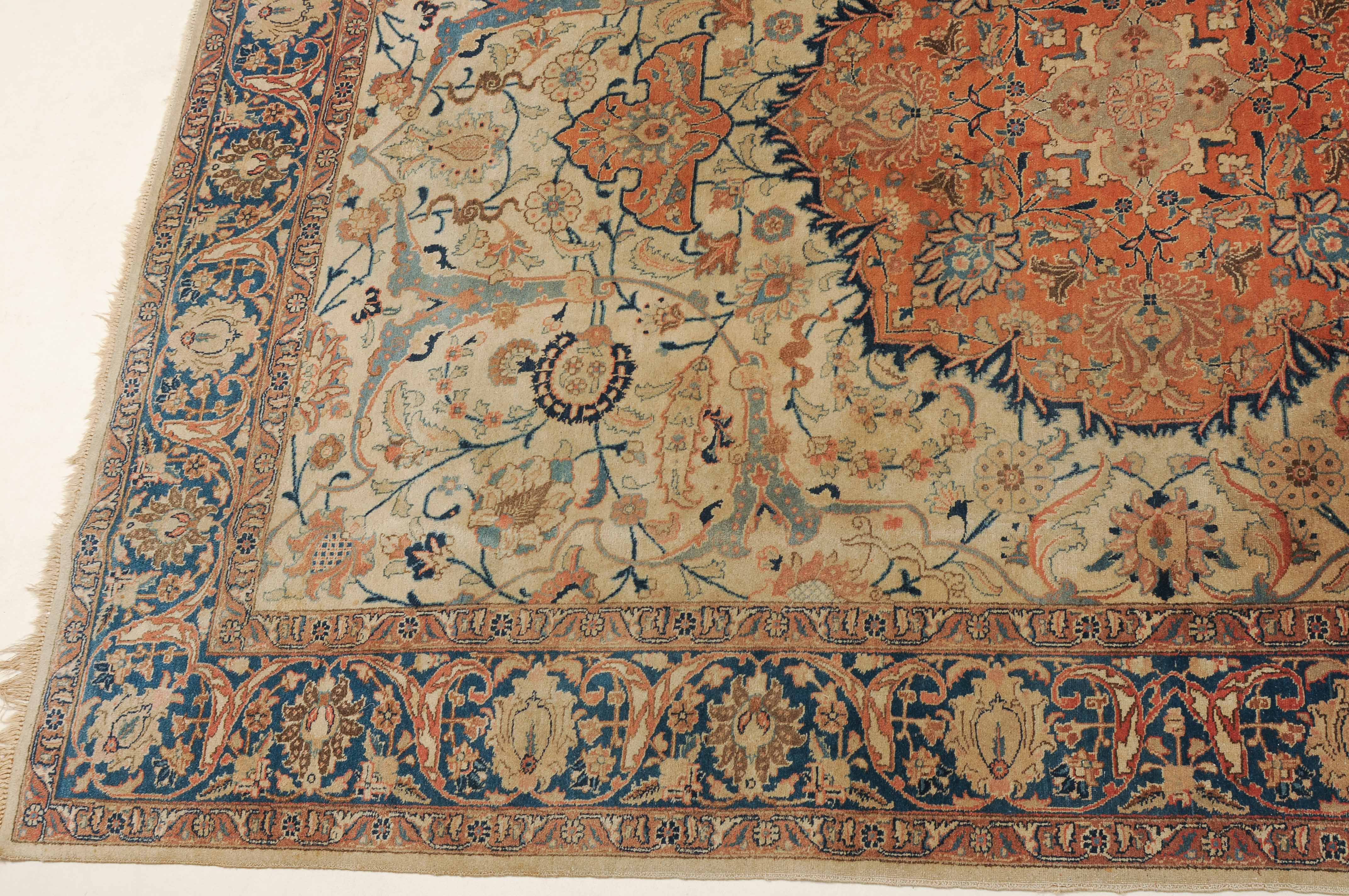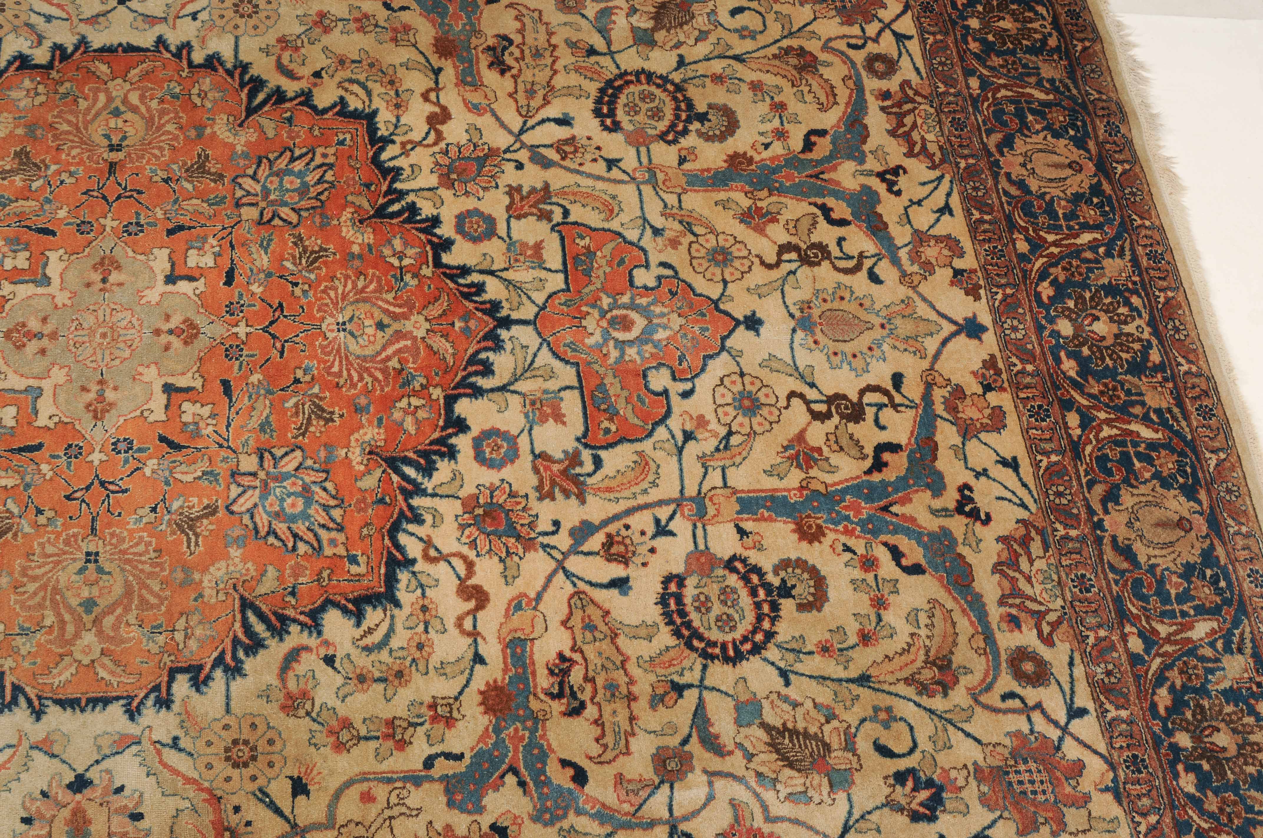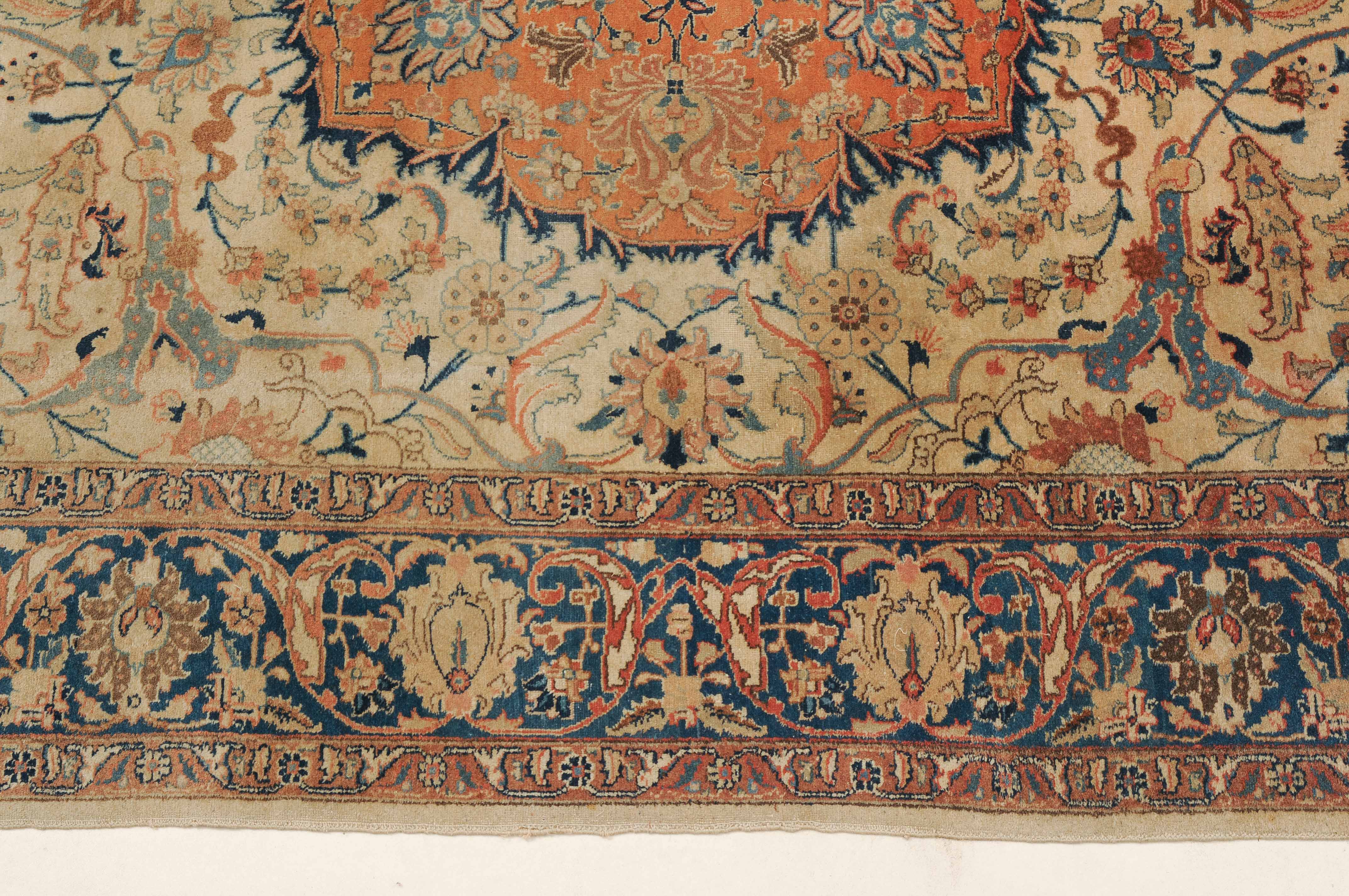 NW-Persien, um 1910. Auf gelbem Grund figuriert ein rötliches geflammtes Rundmedaillon mit 2 Anhängern, flankiert von Palmetten, Ranken-Kompositionen und hellblauen, dekorativ angeordneten Arabesken. 2 florale Nebenbordüren umranden die blaue, mit gerankten Blütenpalmetten apart geschmückte Hauptbordüre. Gebrauchsspuren, reinigungsbedürftig. 240x340 cm (ft. 7.9x11.2).