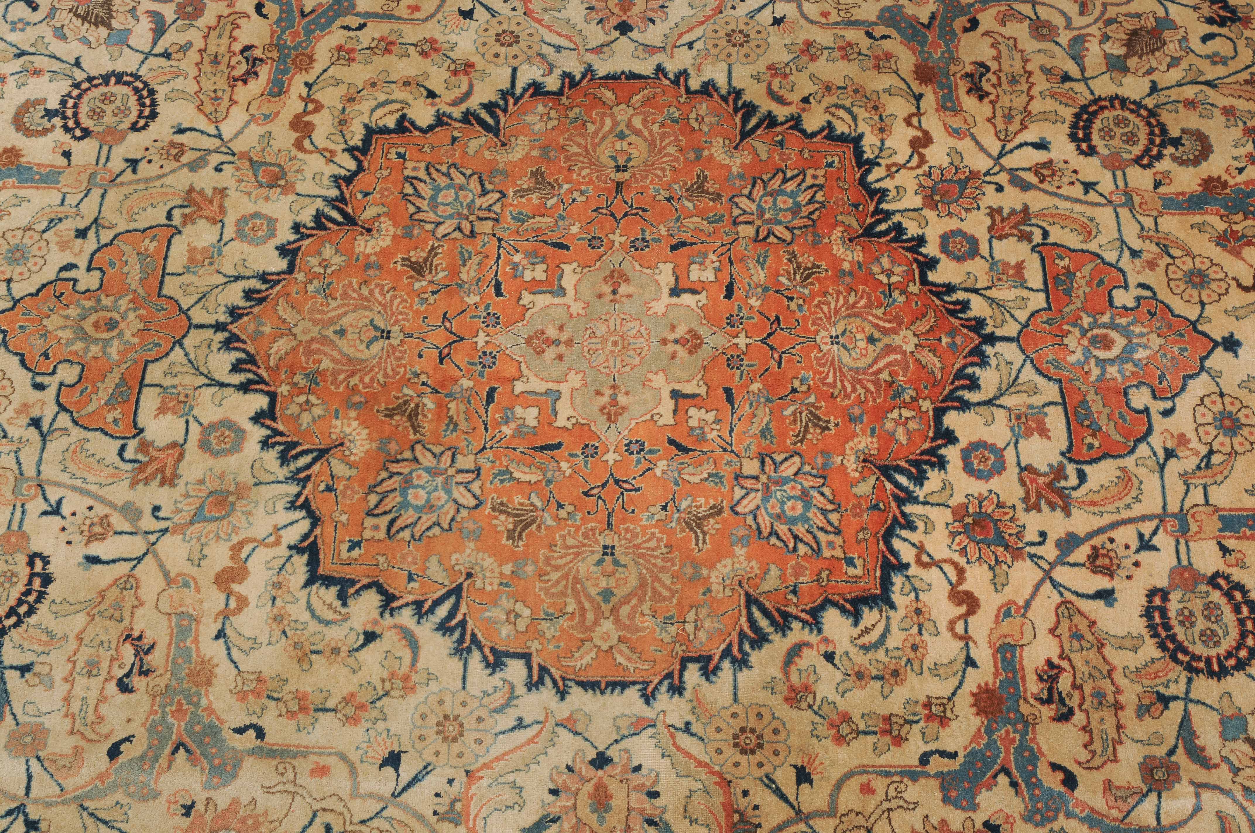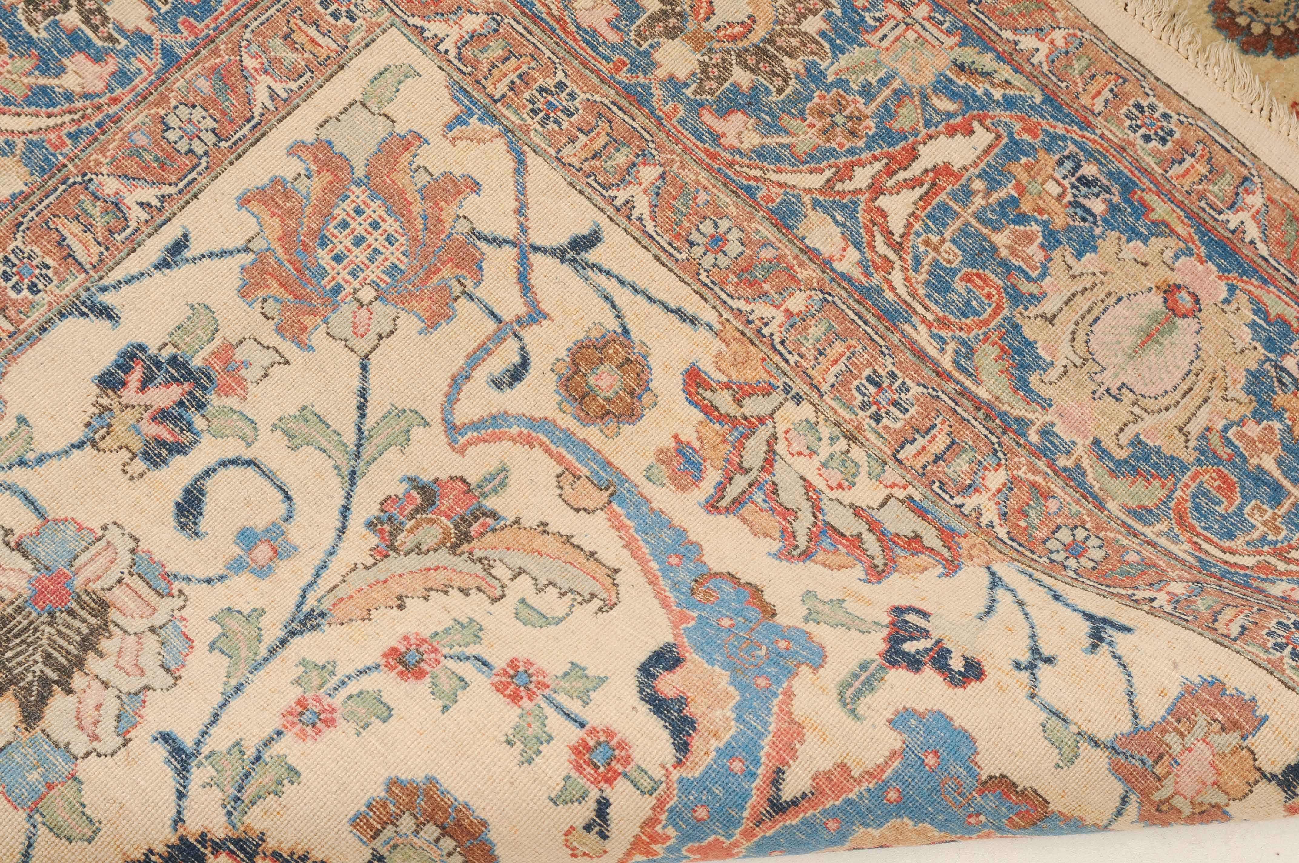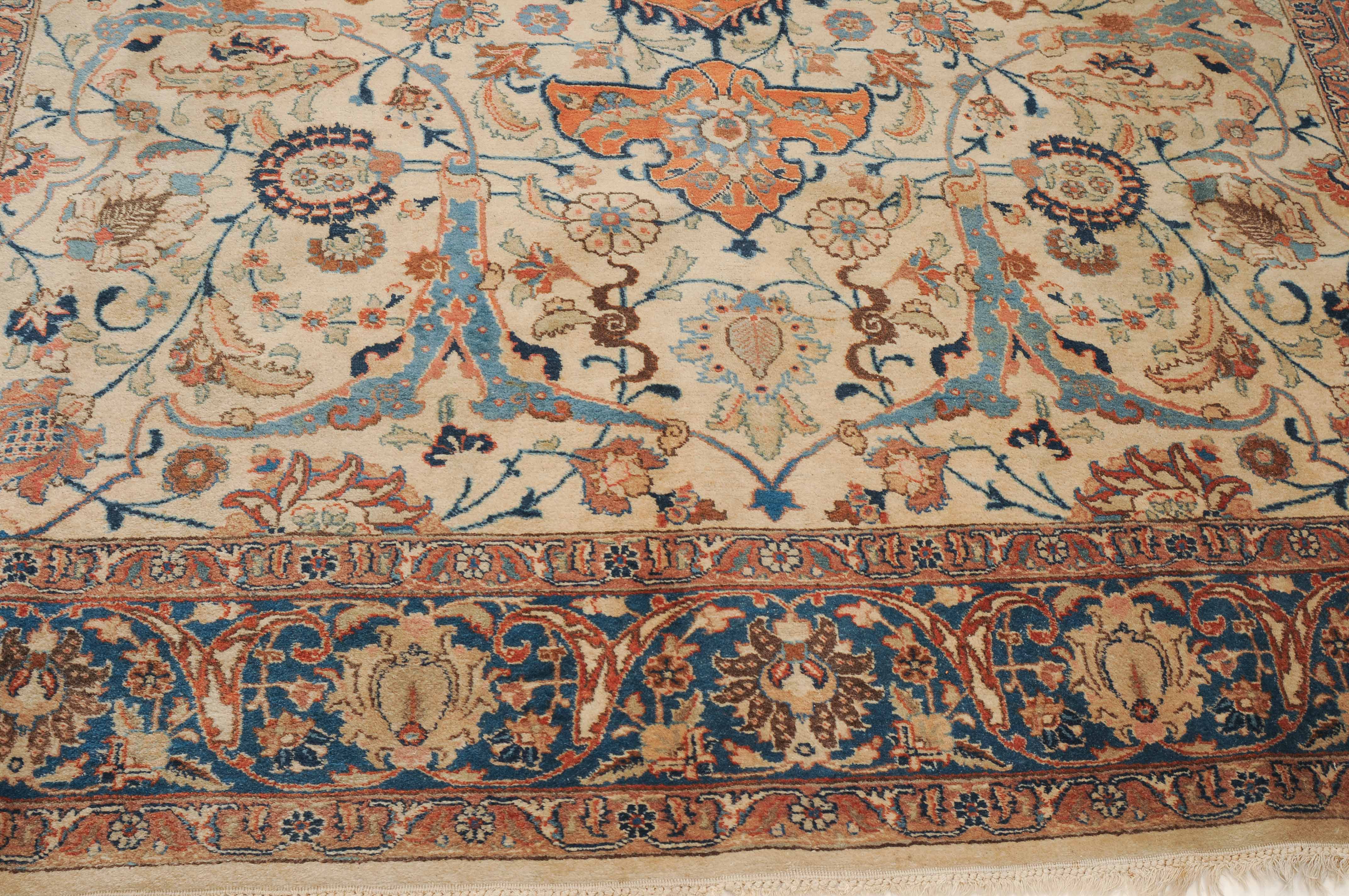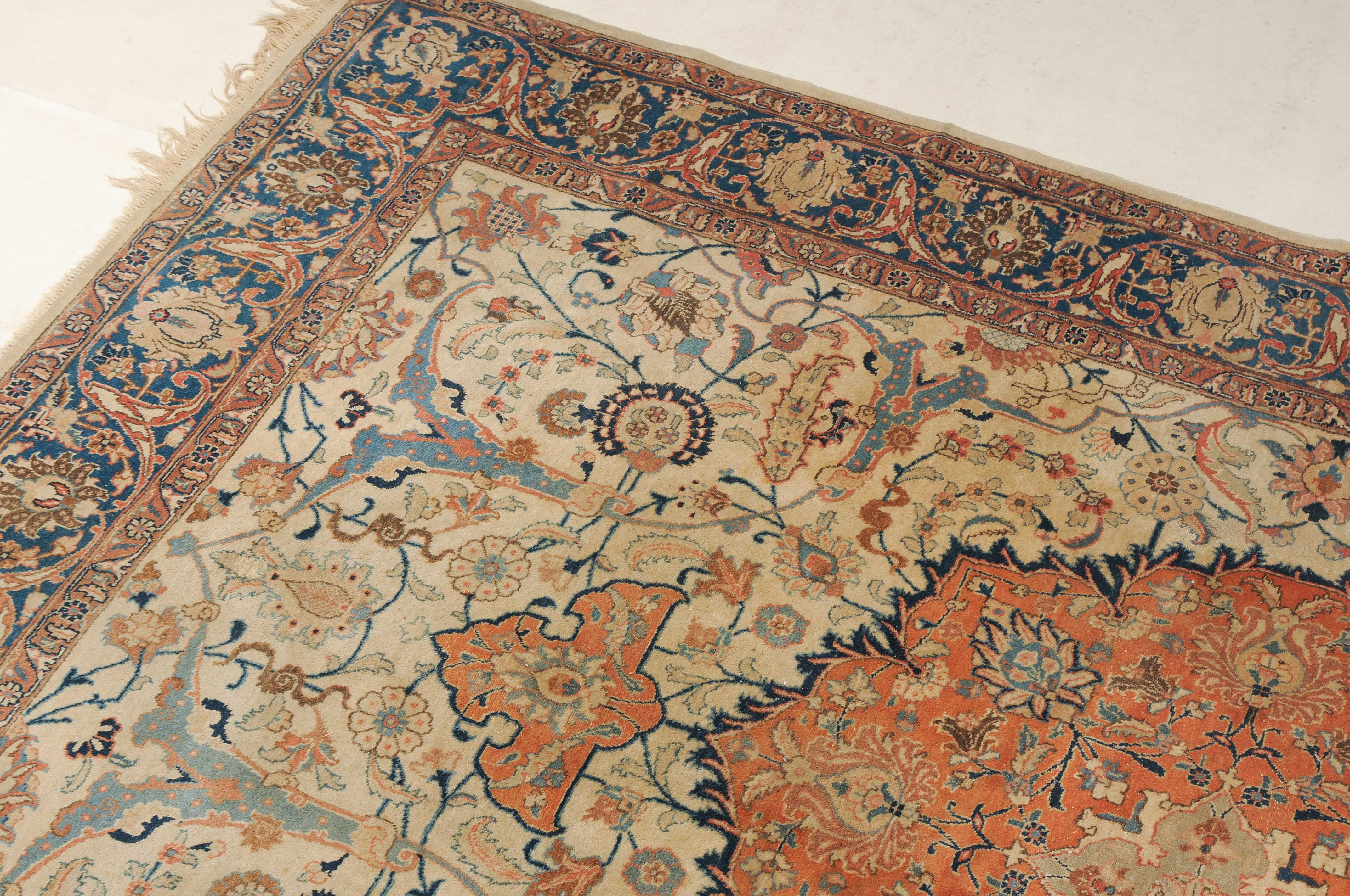 NW-Persien, um 1910. Auf gelbem Grund figuriert ein rötliches geflammtes Rundmedaillon mit 2 Anhängern, flankiert von Palmetten, Ranken-Kompositionen und hellblauen, dekorativ angeordneten Arabesken. 2 florale Nebenbordüren umranden die blaue, mit gerankten Blütenpalmetten apart geschmückte Hauptbordüre. Gebrauchsspuren, reinigungsbedürftig. 240x340 cm (ft. 7.9x11.2).