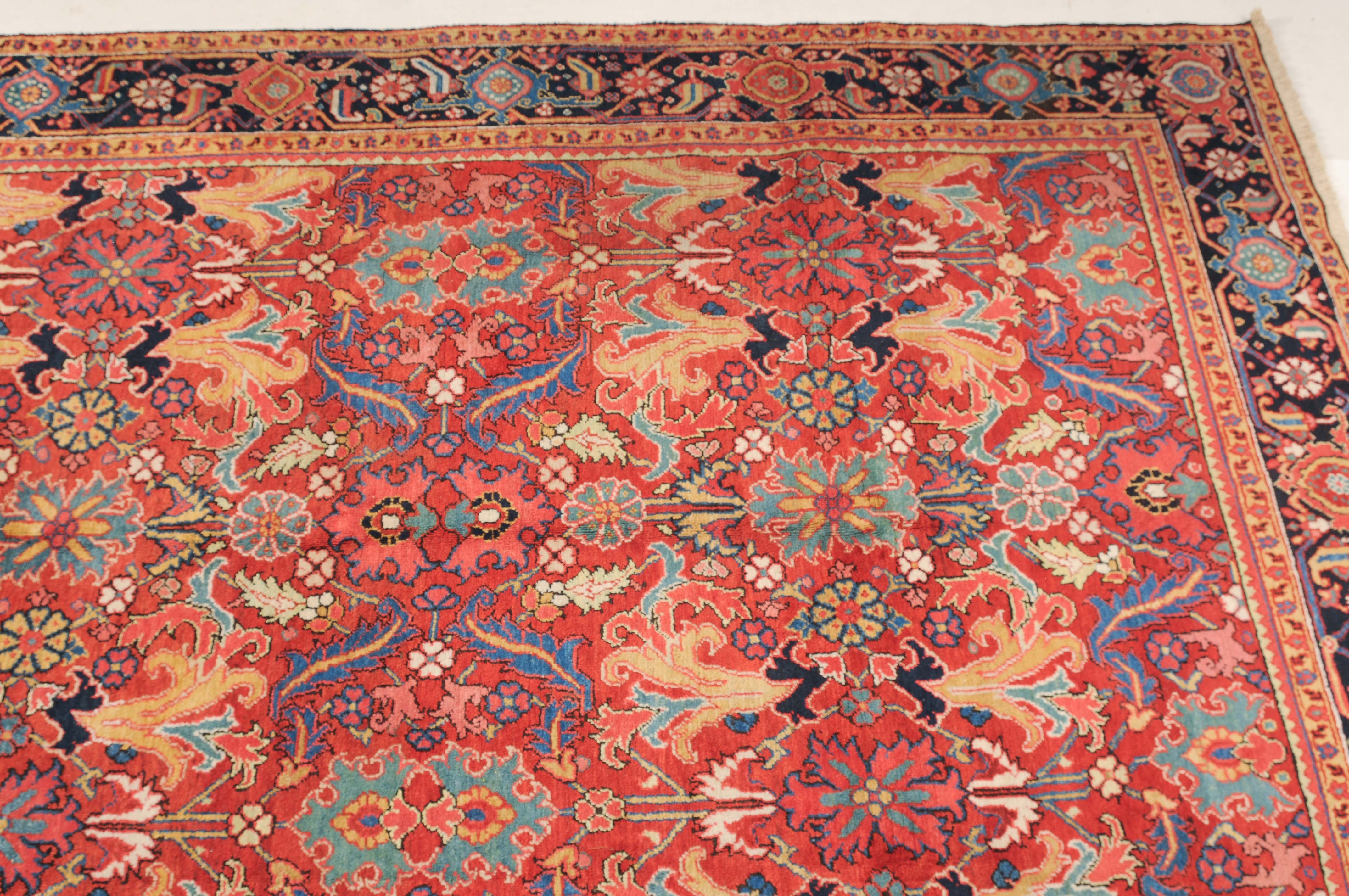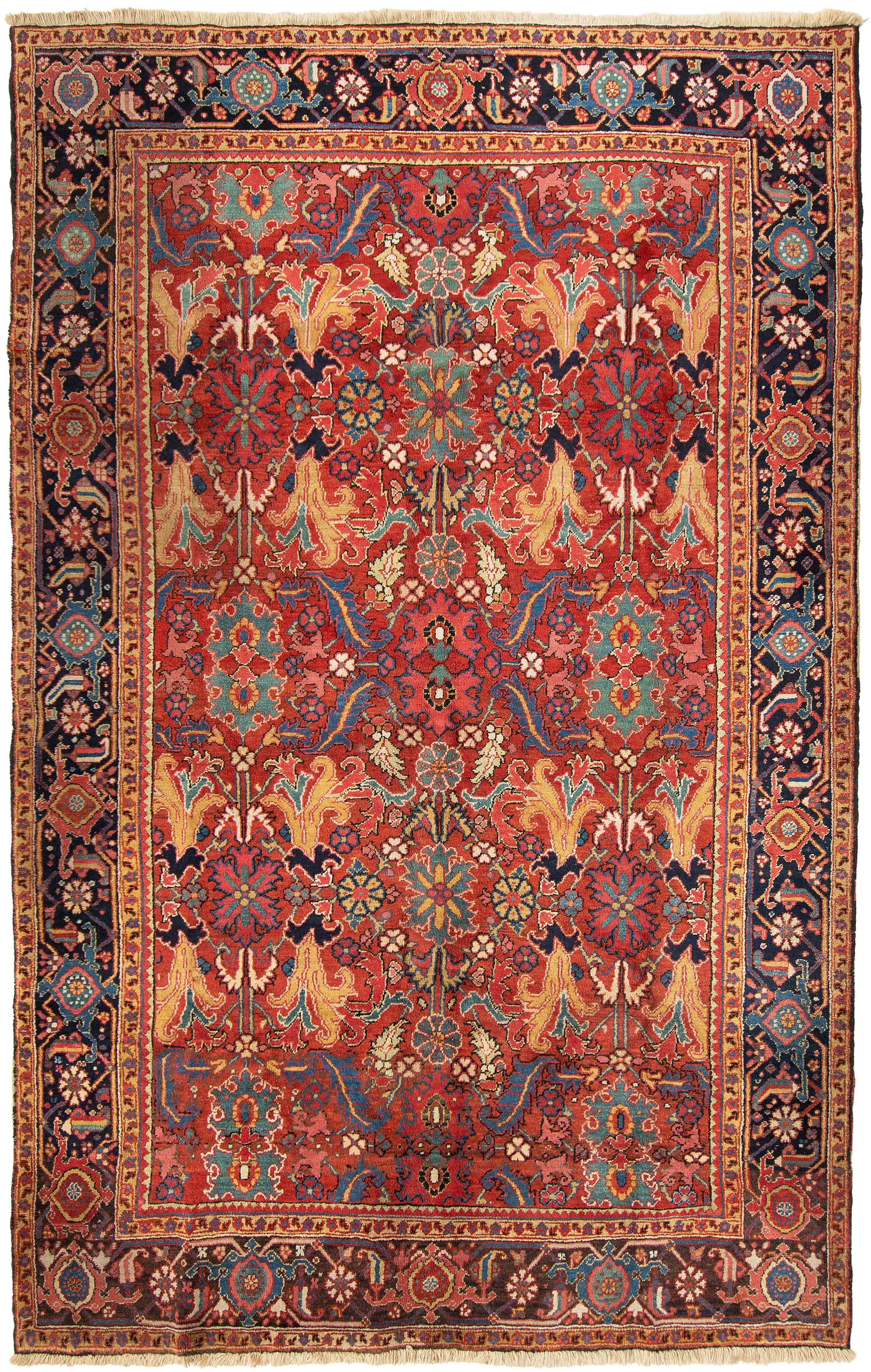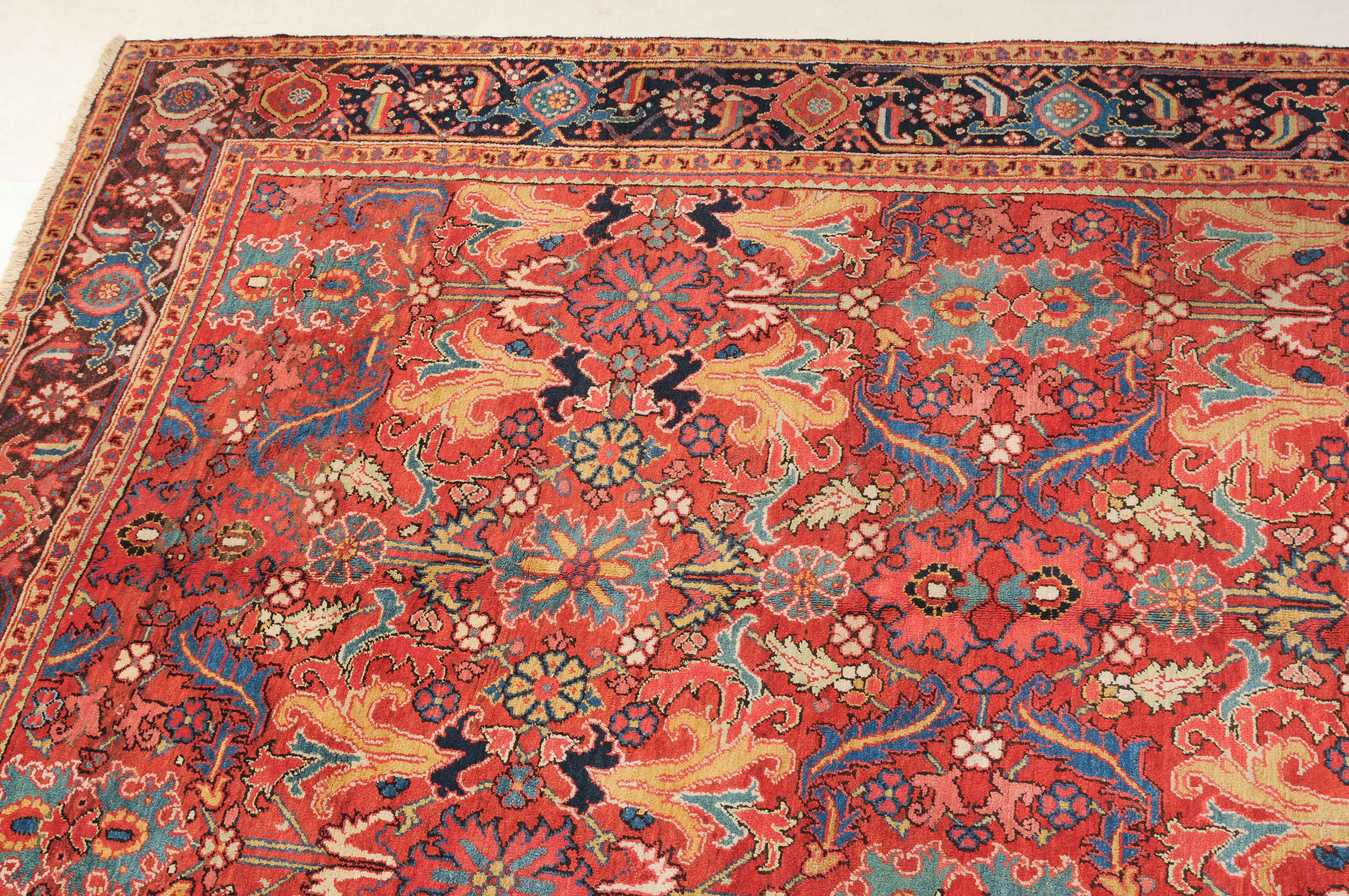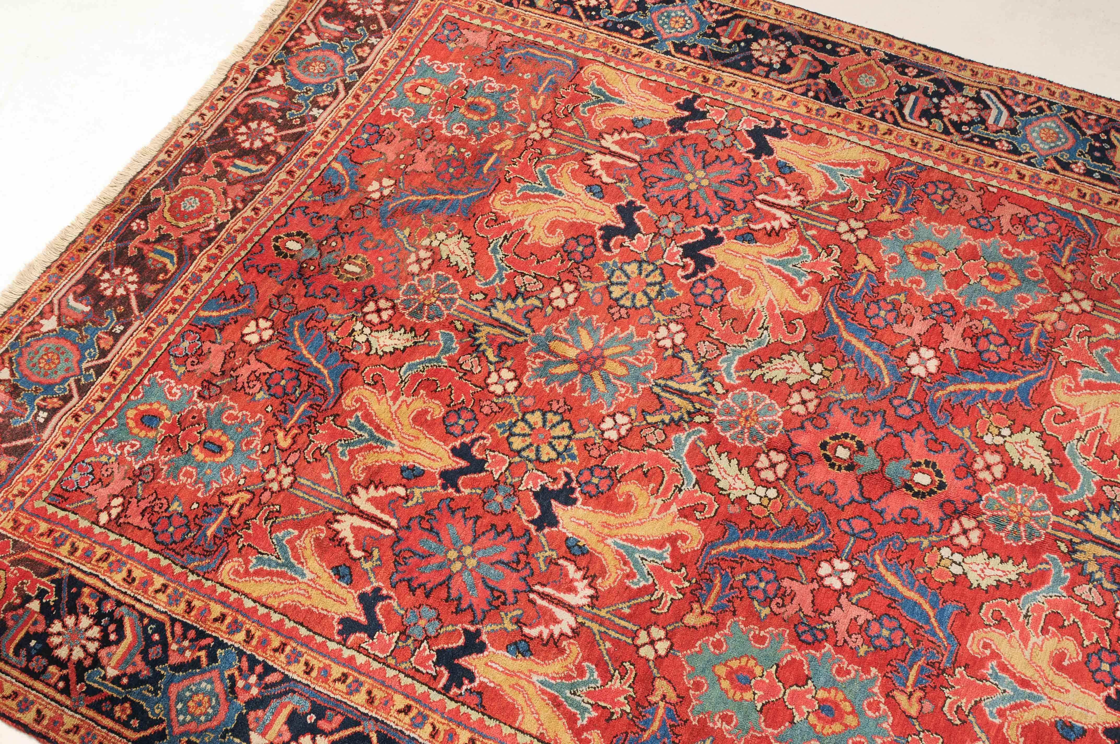NW-Persien, um 1910. Im roten Mittelfeld figurieren flächendeckend gestreute, stark stilisierte Blüten-Palmetten, Blattranken sowie weitere dekorative Heriz-Elemente. 2 gelbe Blütenborten umgeben die breite nachtblaue, mit Palmetten und Ranken in alternierenden Farben geschmückte Hauptbordüre. Gute Erhaltung. 230x353 cm (ft. 7.6x11.6).