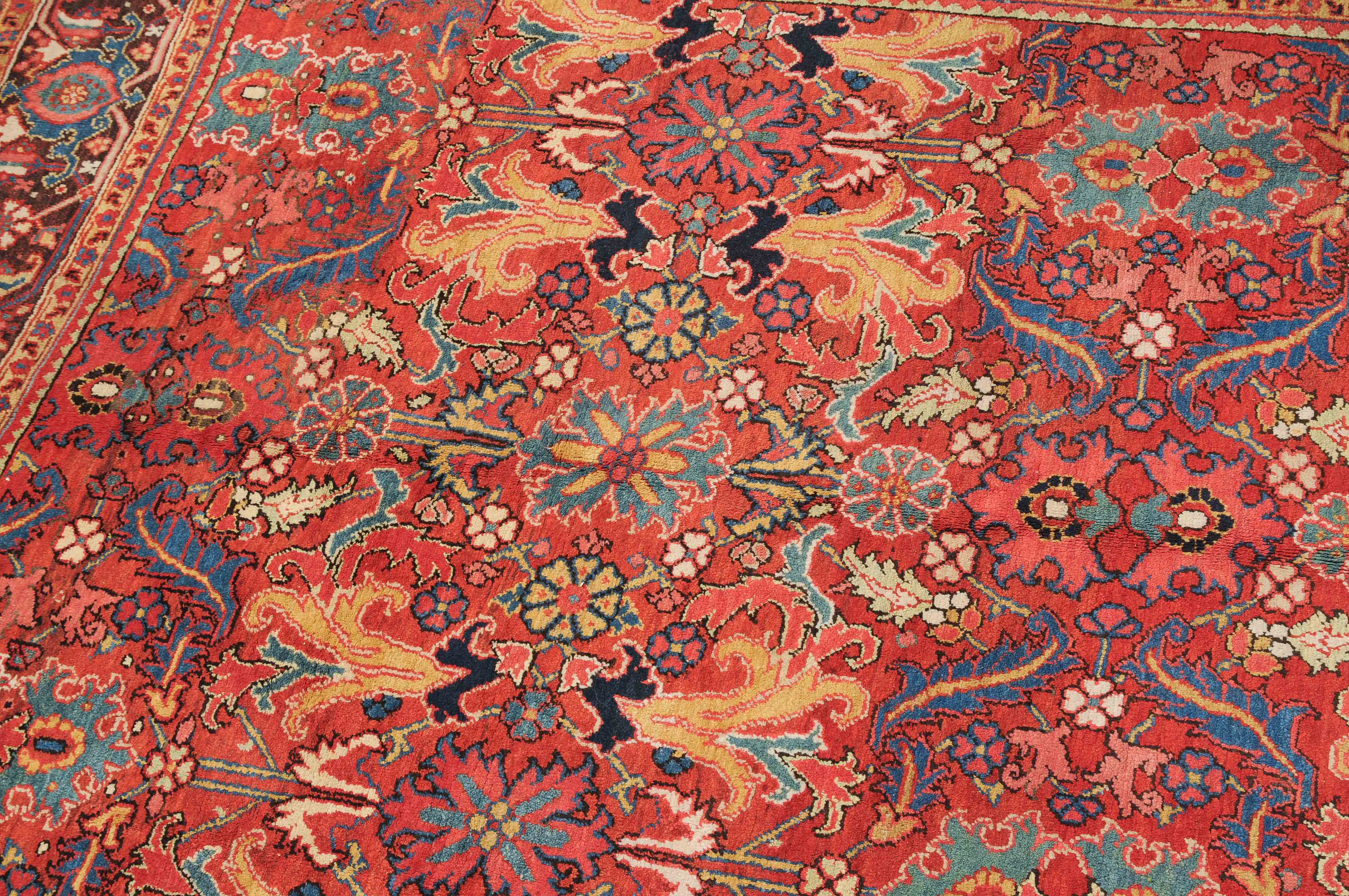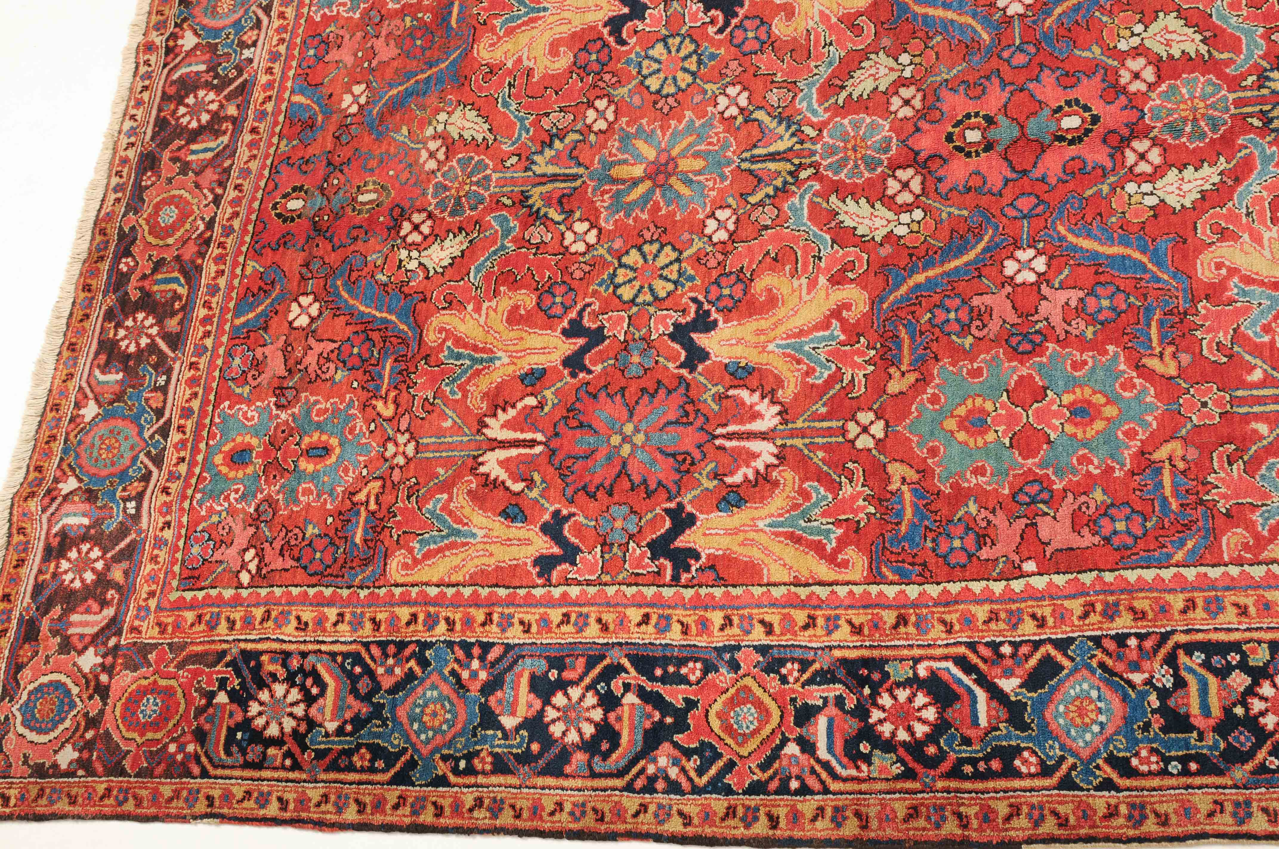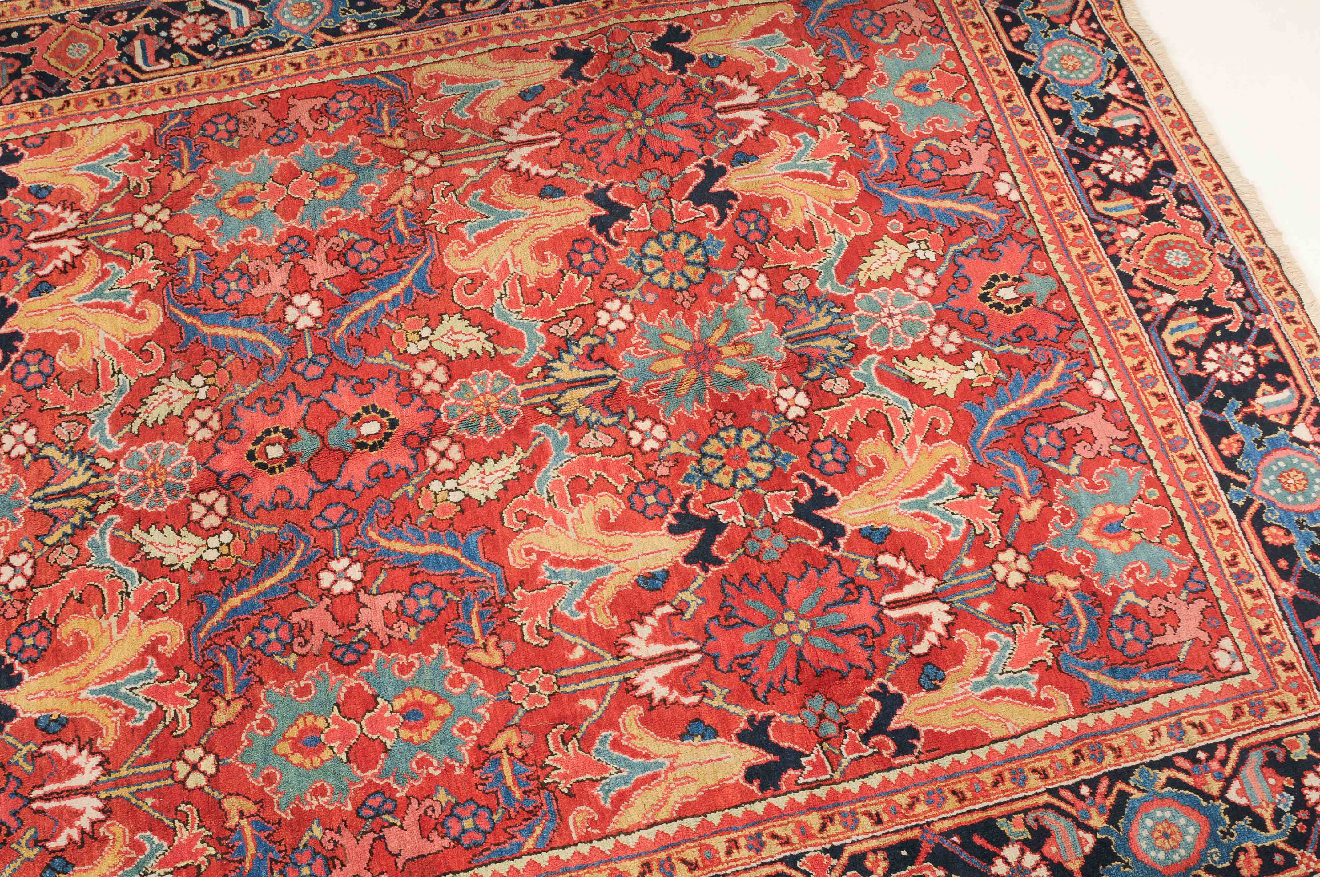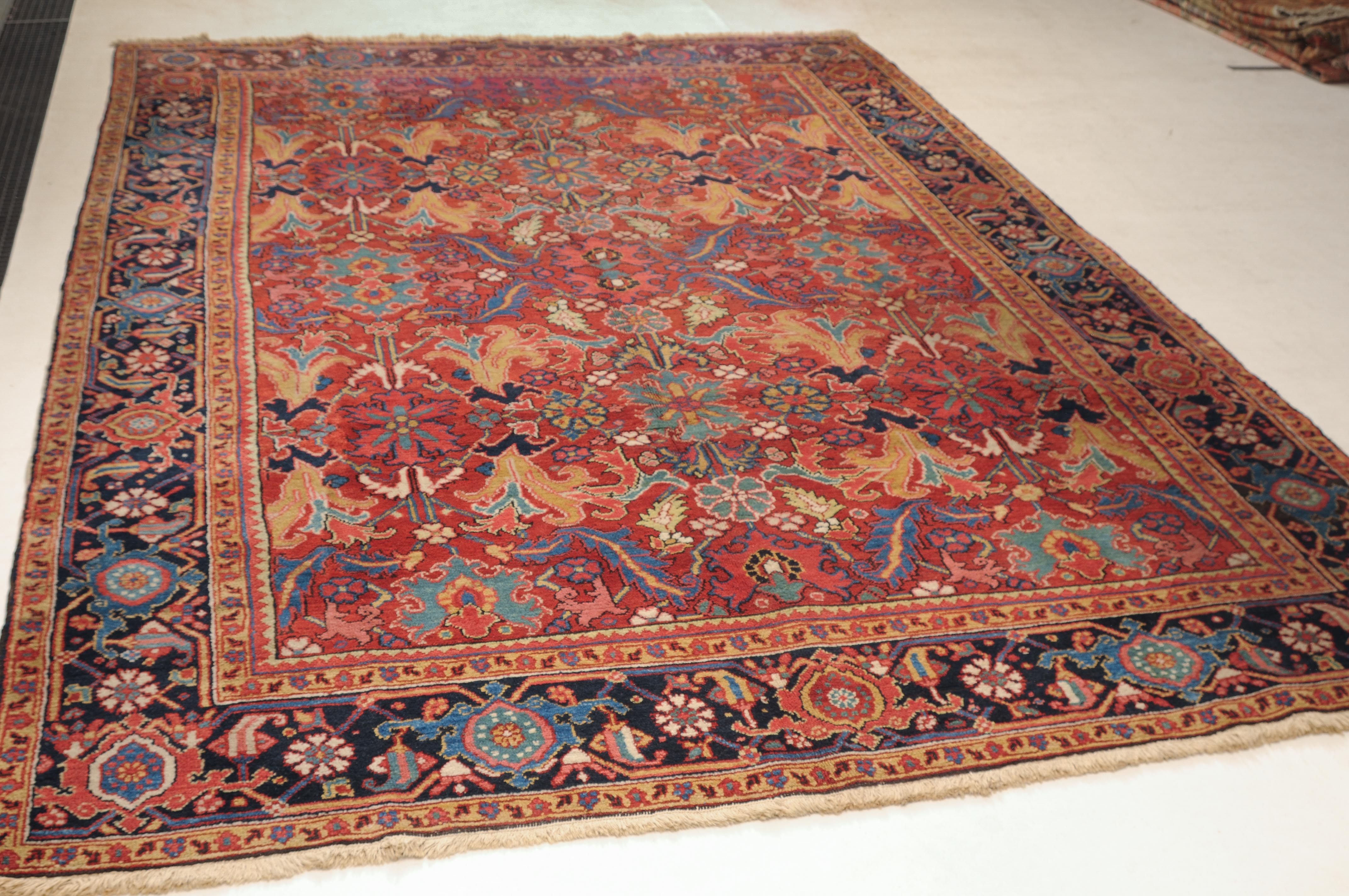 NW-Persien, um 1910. Im roten Mittelfeld figurieren flächendeckend gestreute, stark stilisierte Blüten-Palmetten, Blattranken sowie weitere dekorative Heriz-Elemente. 2 gelbe Blütenborten umgeben die breite nachtblaue, mit Palmetten und Ranken in alternierenden Farben geschmückte Hauptbordüre. Gute Erhaltung. 230x353 cm (ft. 7.6x11.6).