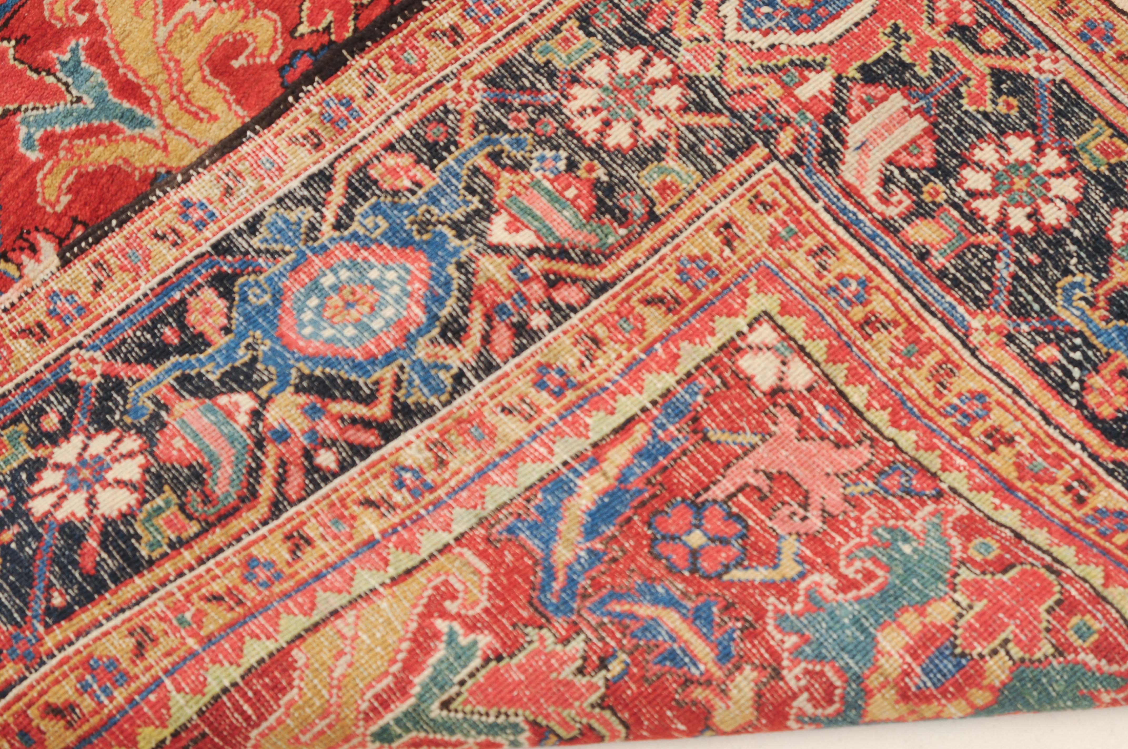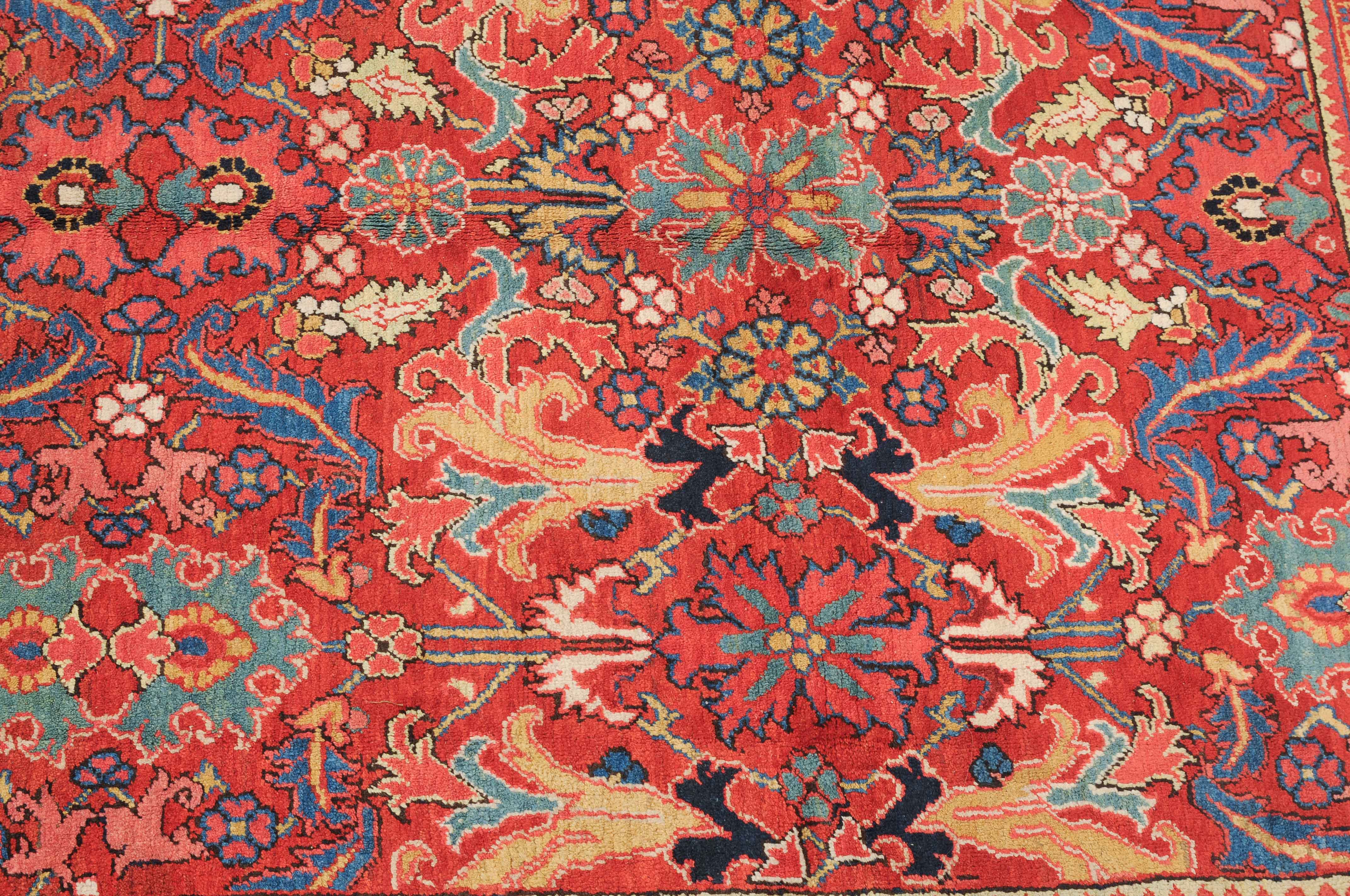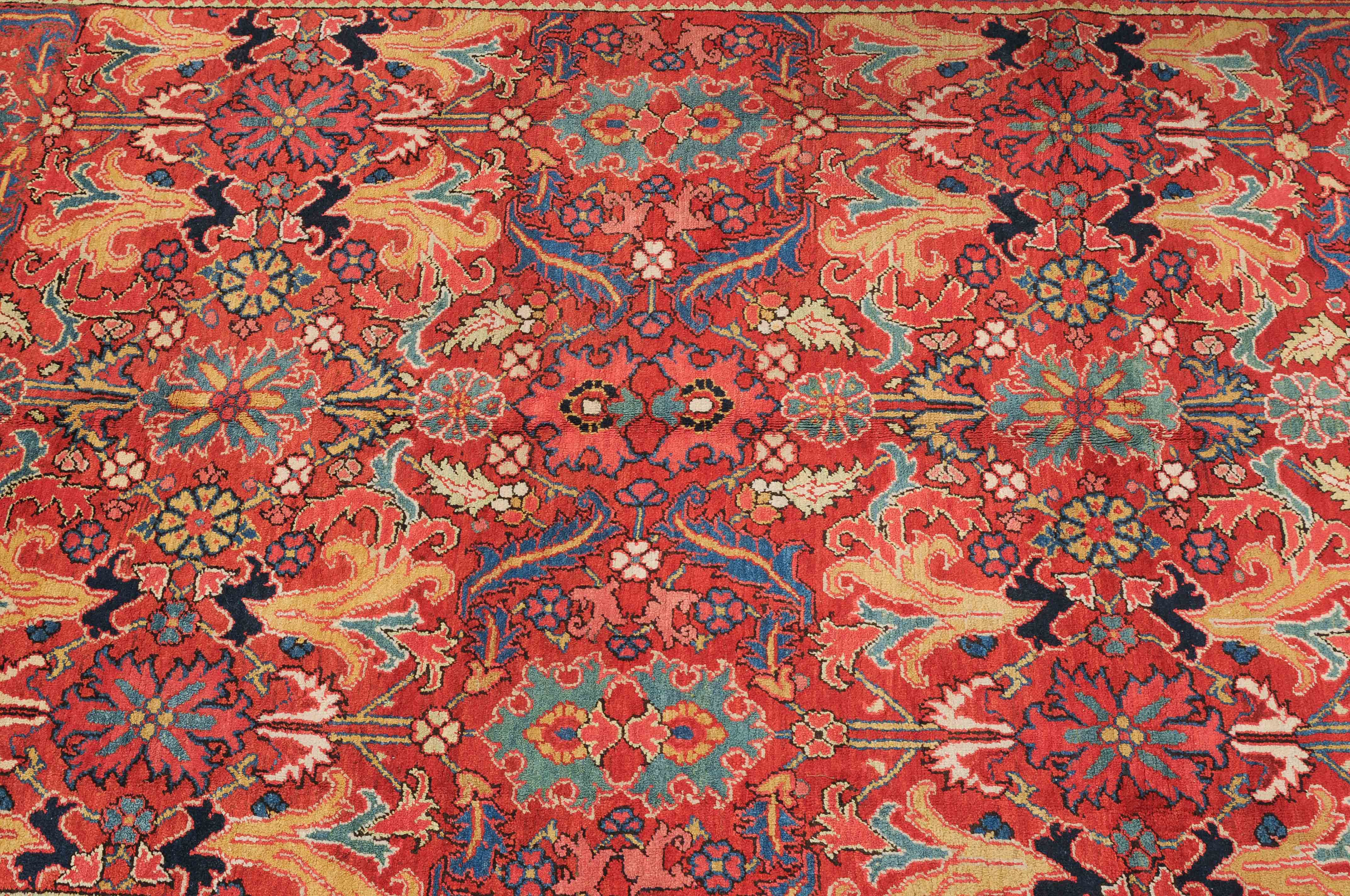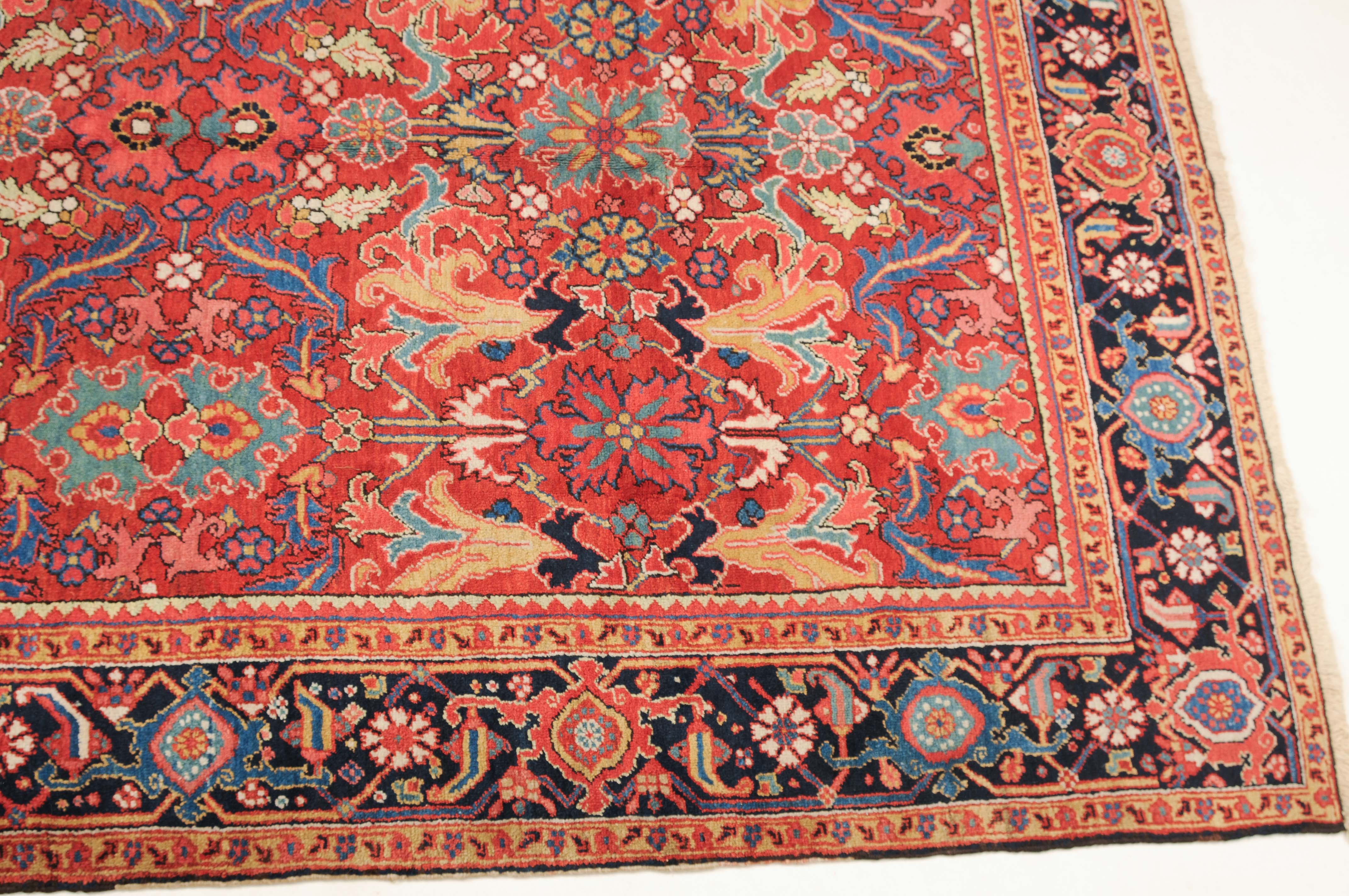 NW-Persien, um 1910. Im roten Mittelfeld figurieren flächendeckend gestreute, stark stilisierte Blüten-Palmetten, Blattranken sowie weitere dekorative Heriz-Elemente. 2 gelbe Blütenborten umgeben die breite nachtblaue, mit Palmetten und Ranken in alternierenden Farben geschmückte Hauptbordüre. Gute Erhaltung. 230x353 cm (ft. 7.6x11.6).