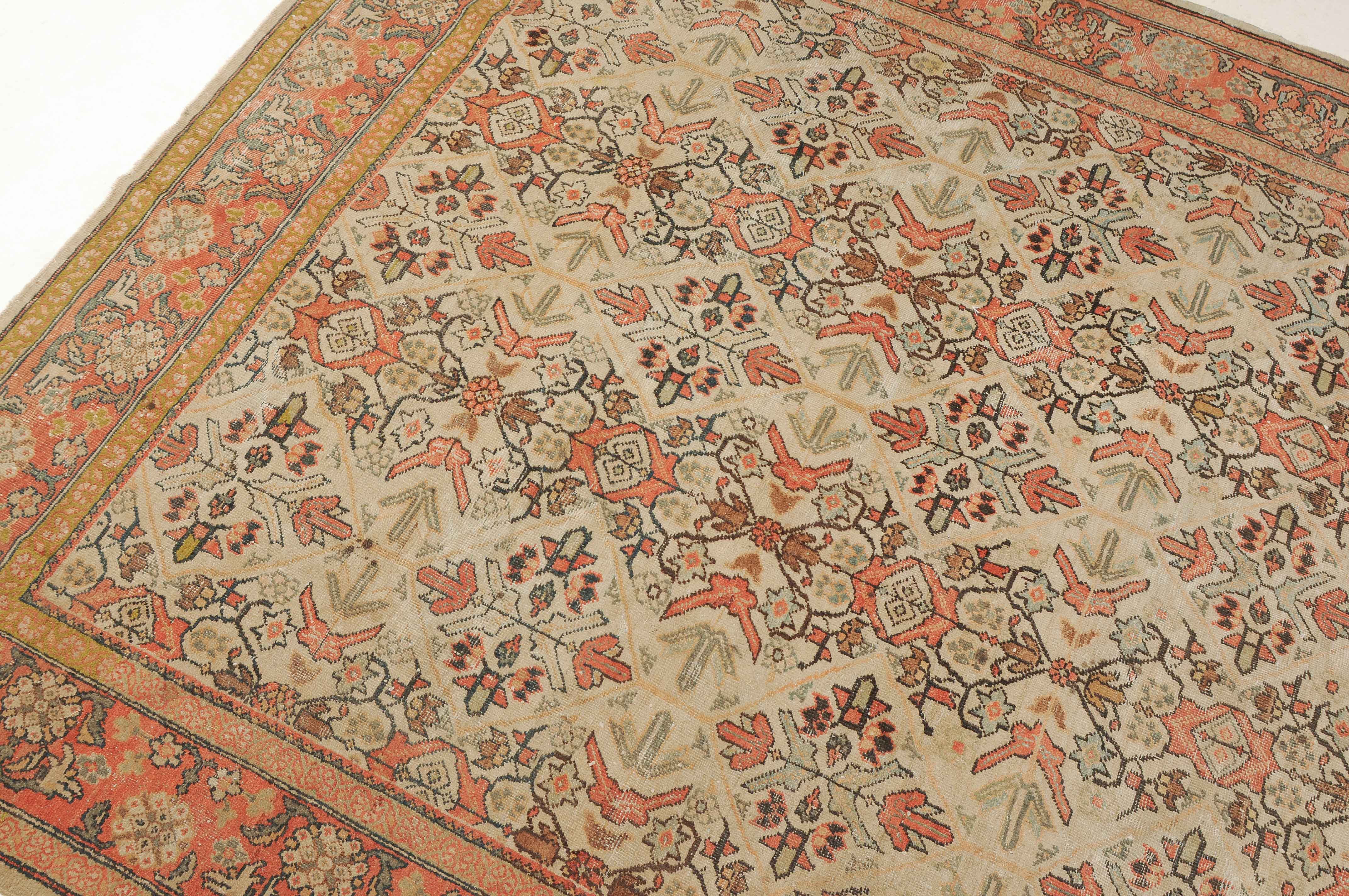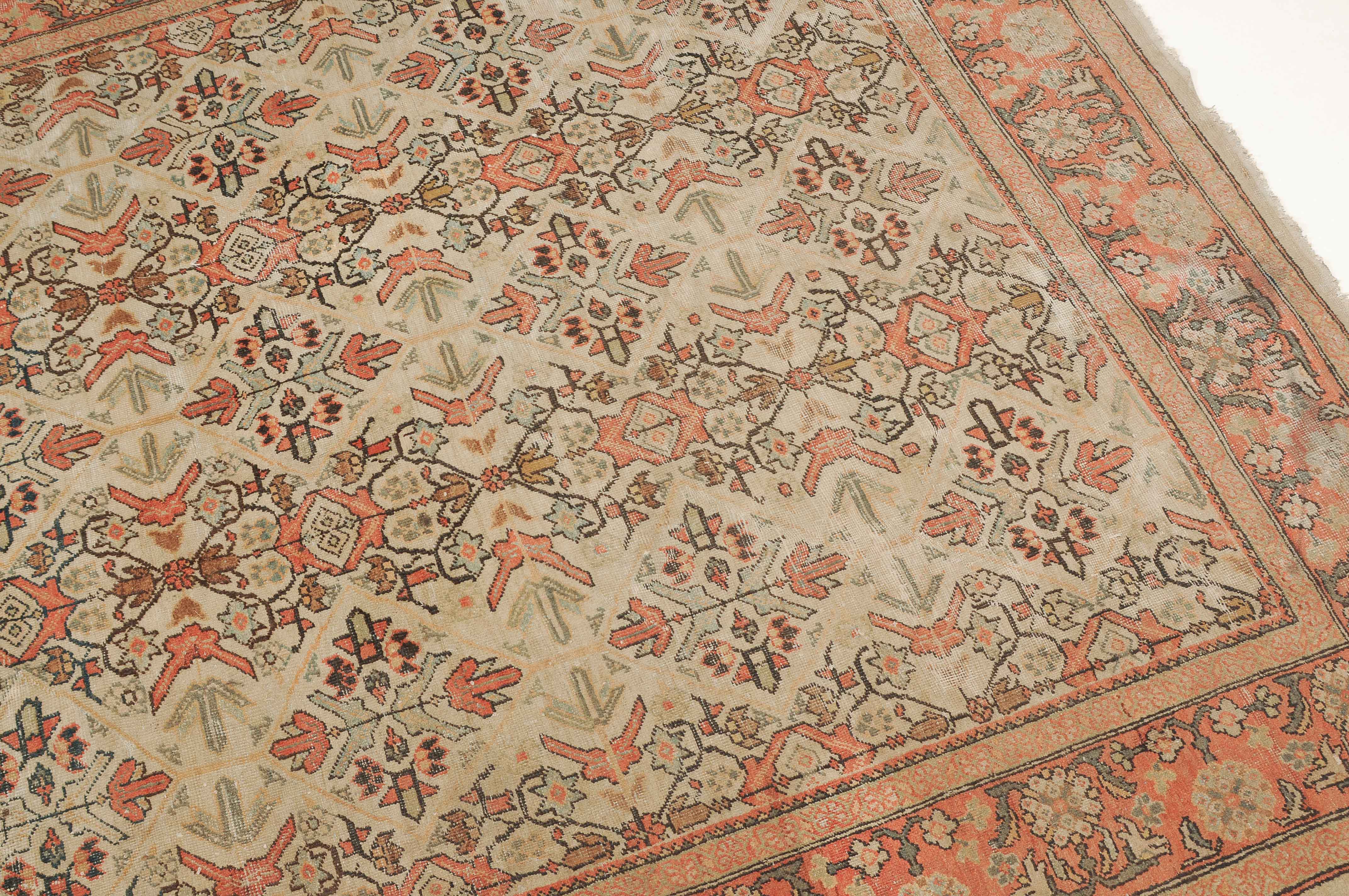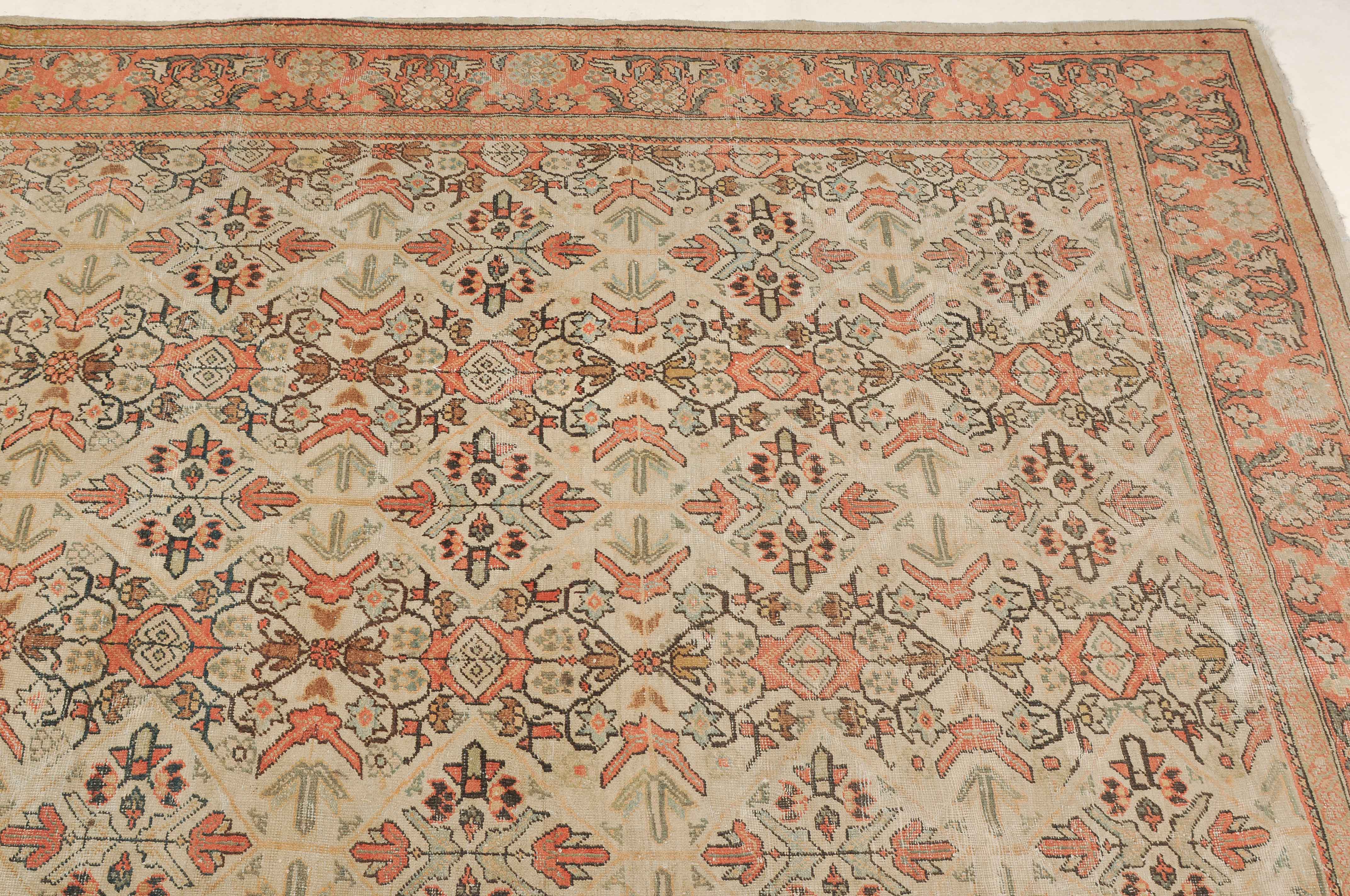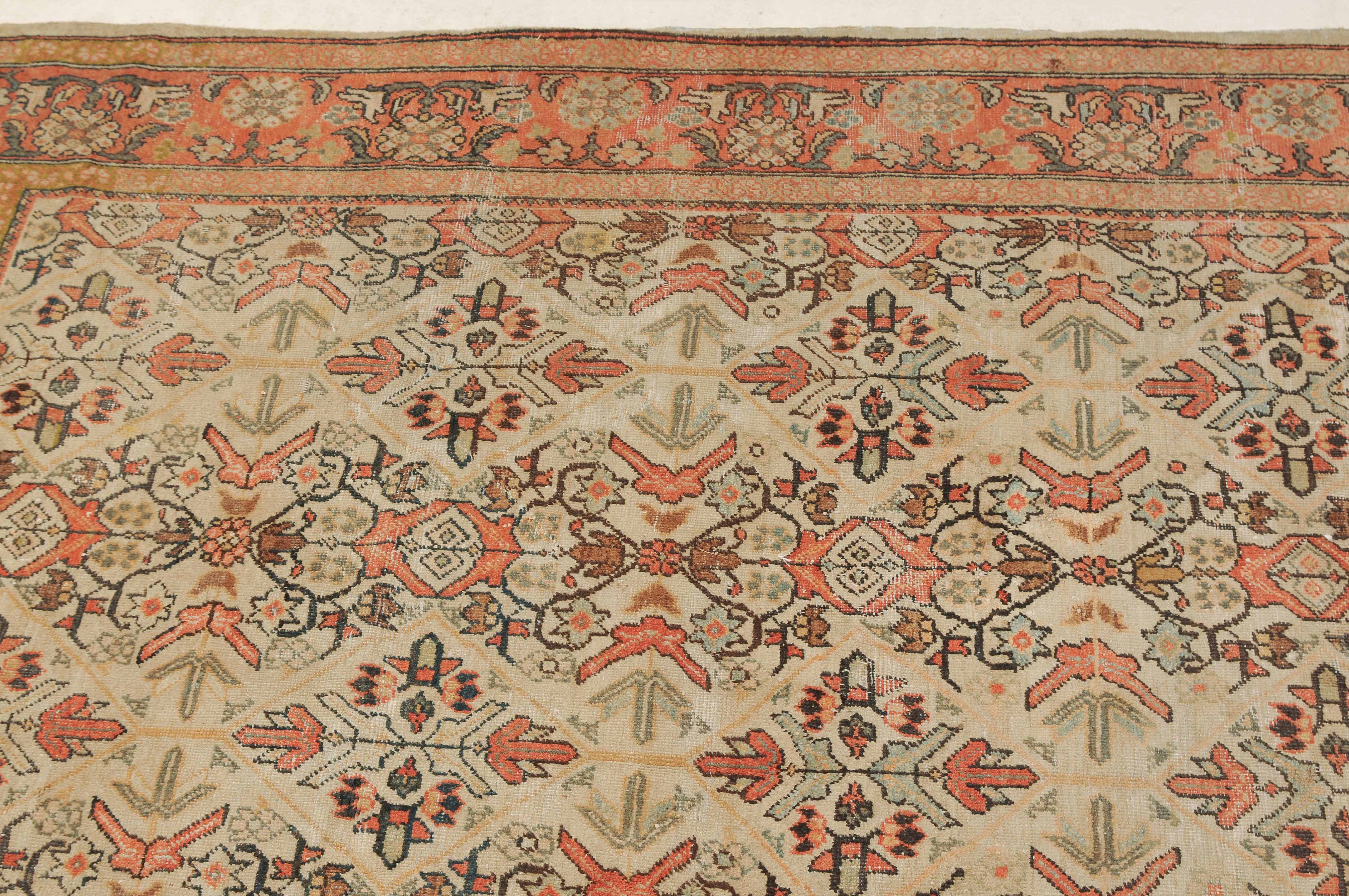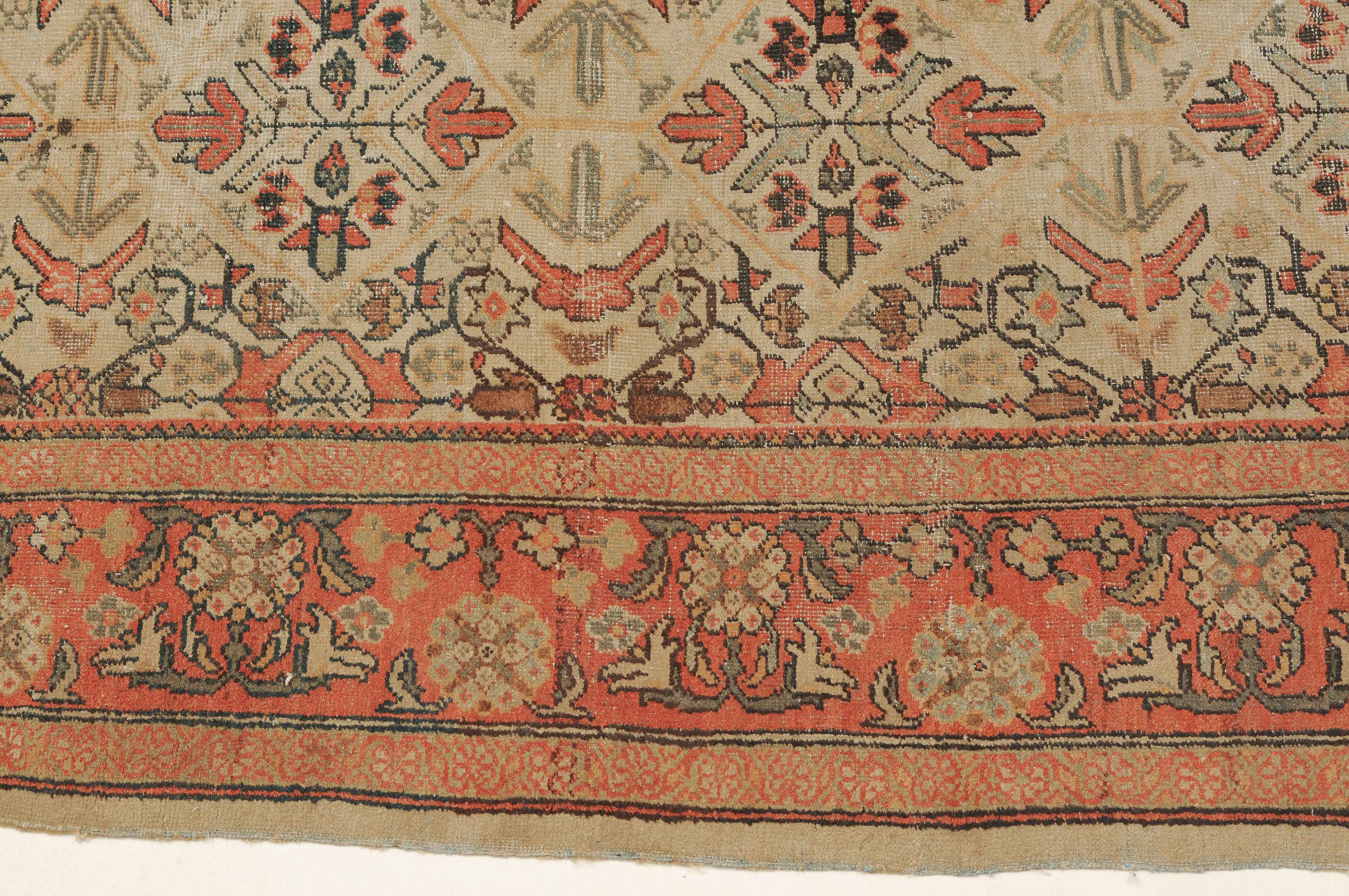 Z-Persien, um 1910. Das beige Feld ist durchgehend mit wirkungsvollen Rauten, Blütenmotiven, Blattranken und Zweigen in unendlichem Rapport überzogen. Die 2 helle florale Borten umfassen die dekorative rote Palmetten- und Blattranken-Bordüre. Starke Gebrauchsspuren, fleckig. 260x315 cm (ft. 8.6x10.4).