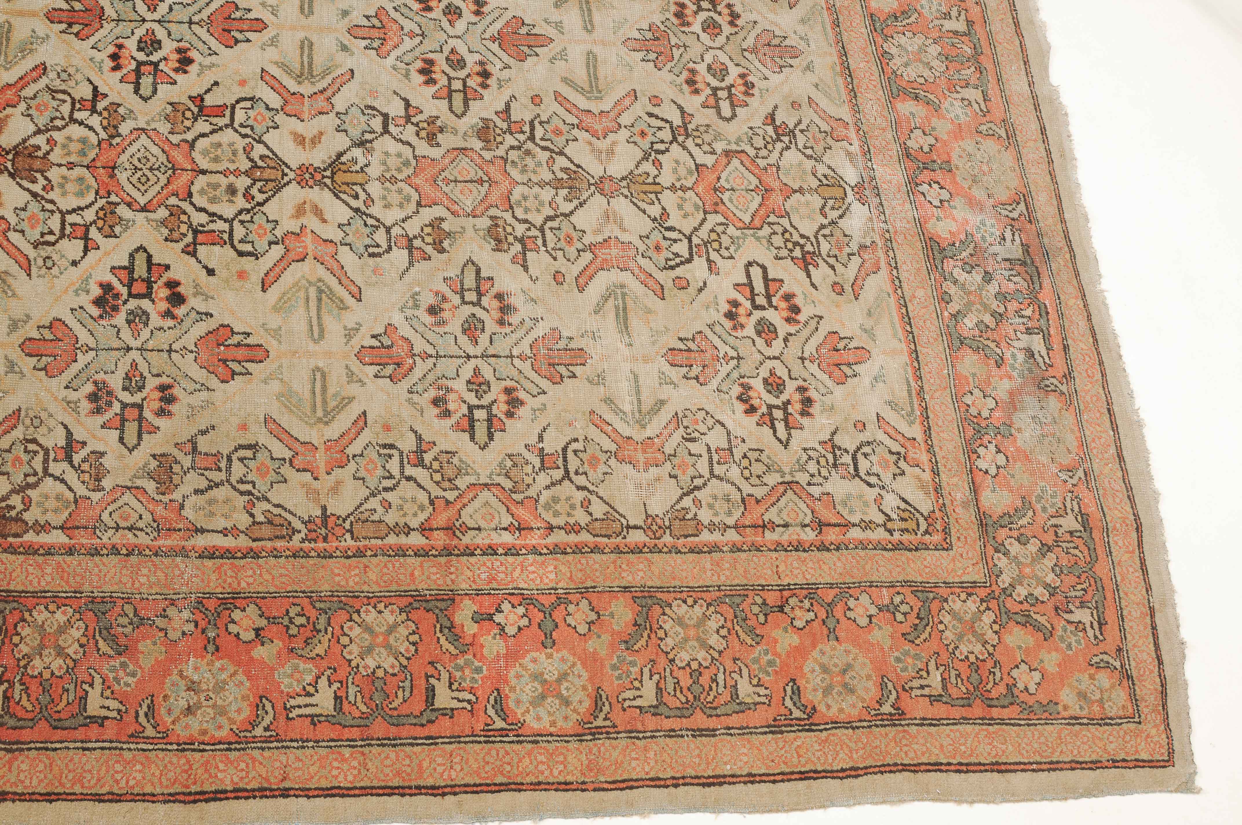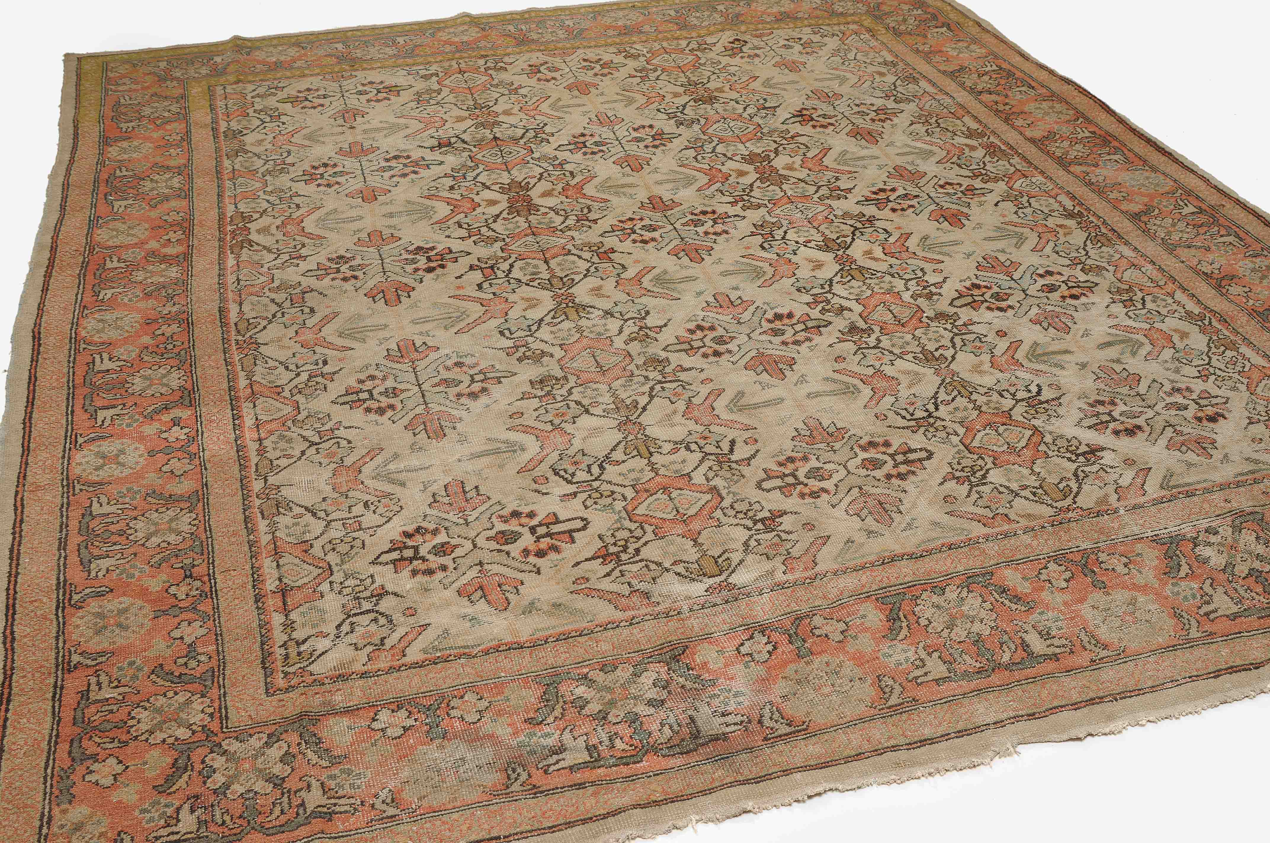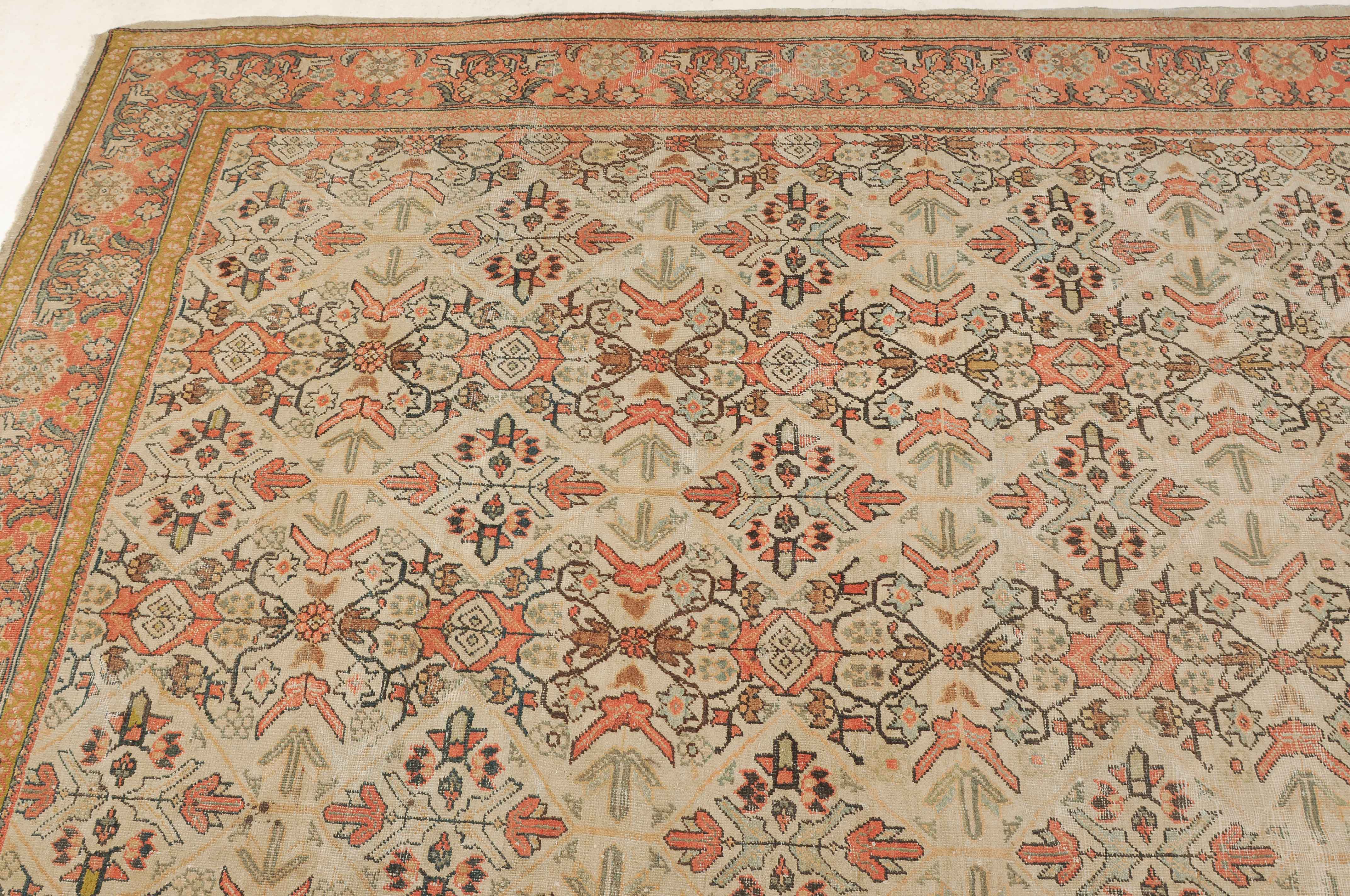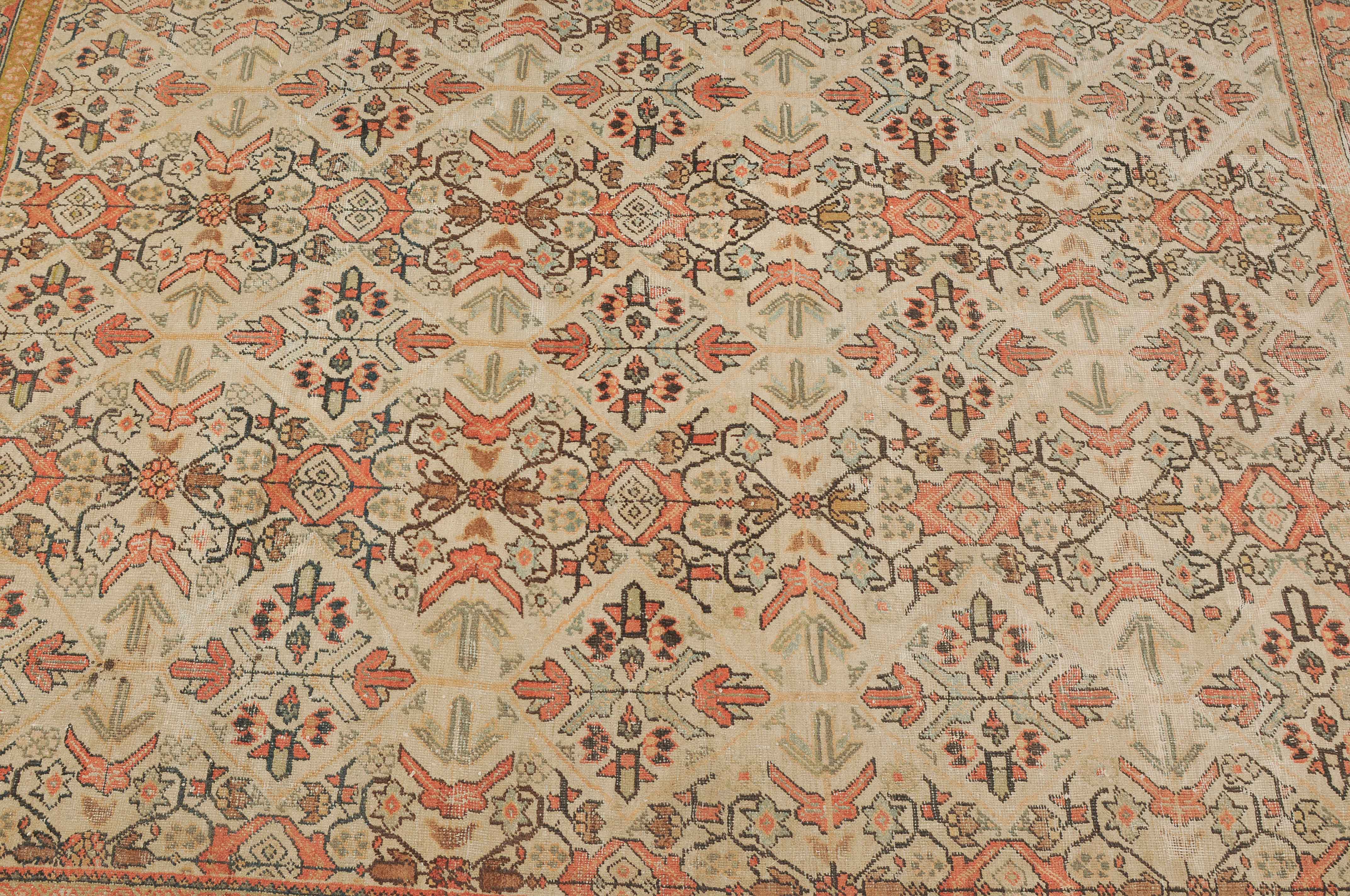 Z-Persien, um 1910. Das beige Feld ist durchgehend mit wirkungsvollen Rauten, Blütenmotiven, Blattranken und Zweigen in unendlichem Rapport überzogen. Die 2 helle florale Borten umfassen die dekorative rote Palmetten- und Blattranken-Bordüre. Starke Gebrauchsspuren, fleckig. 260x315 cm (ft. 8.6x10.4).