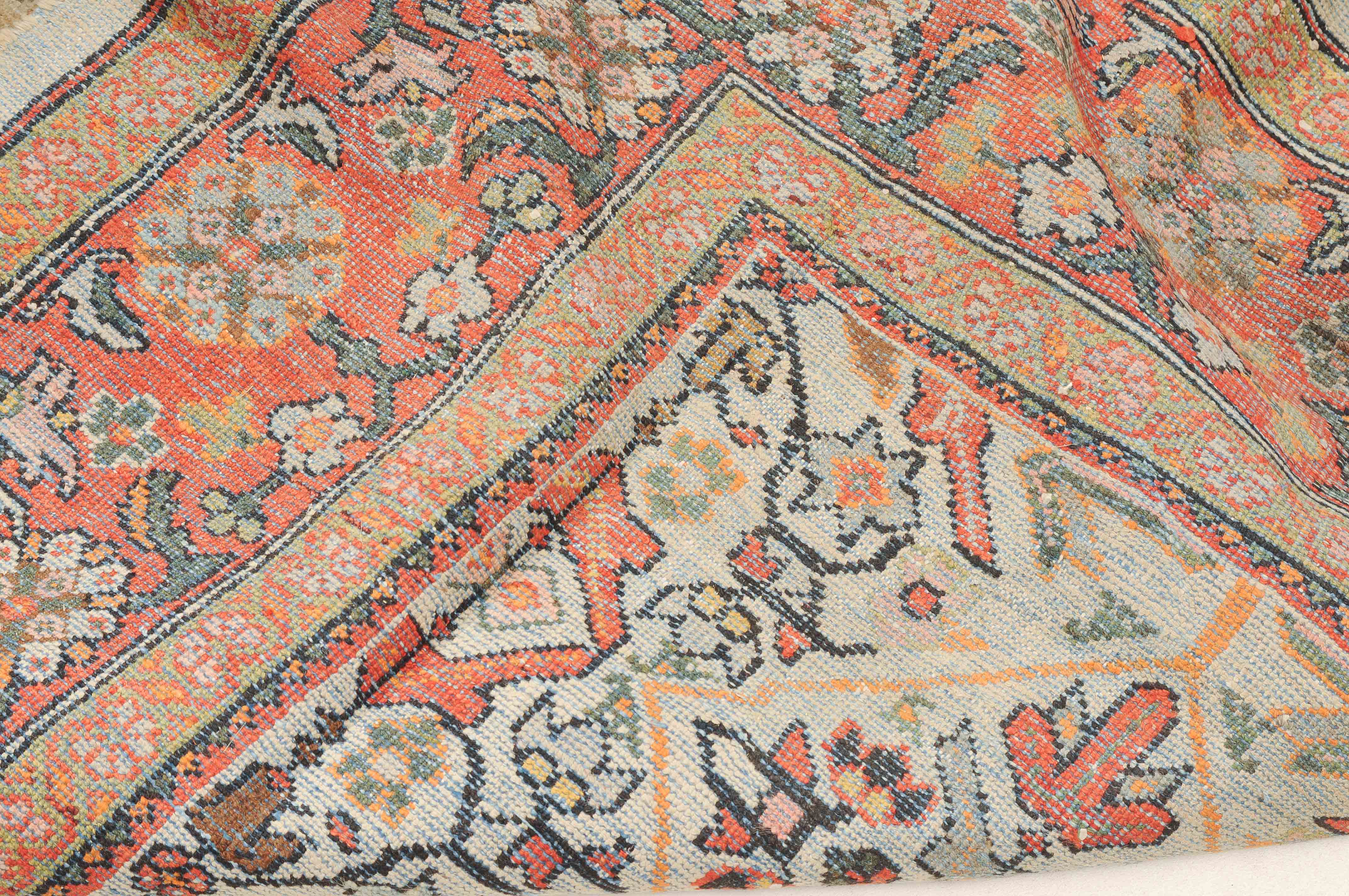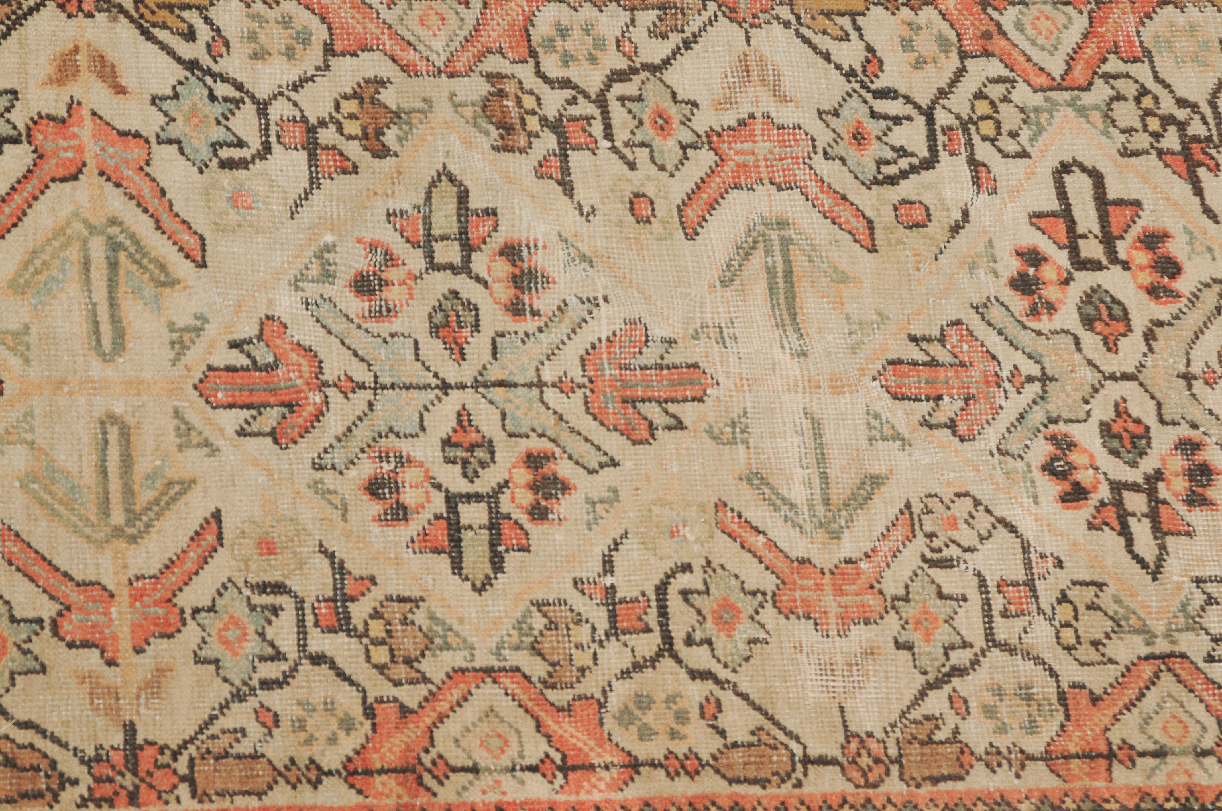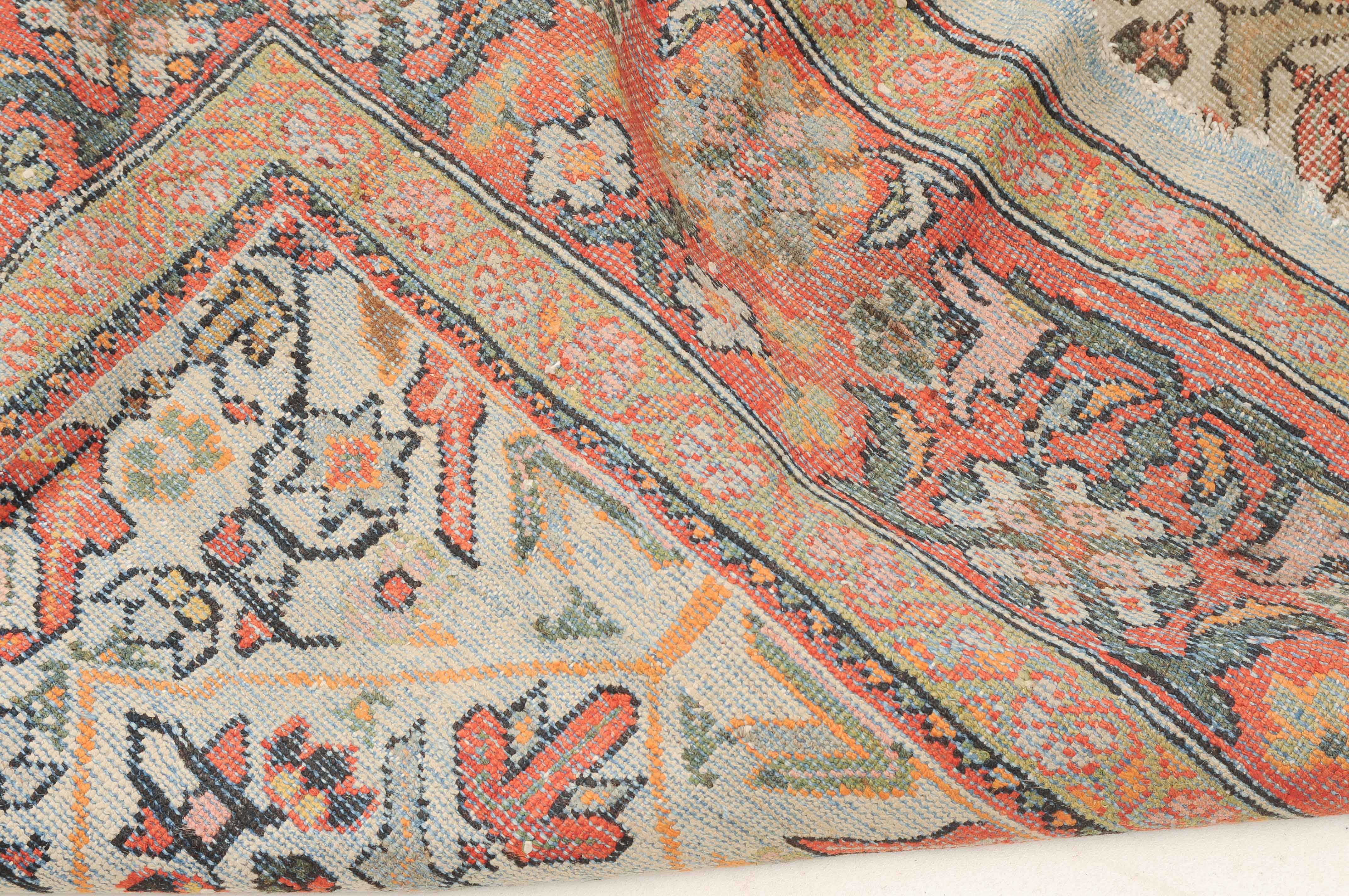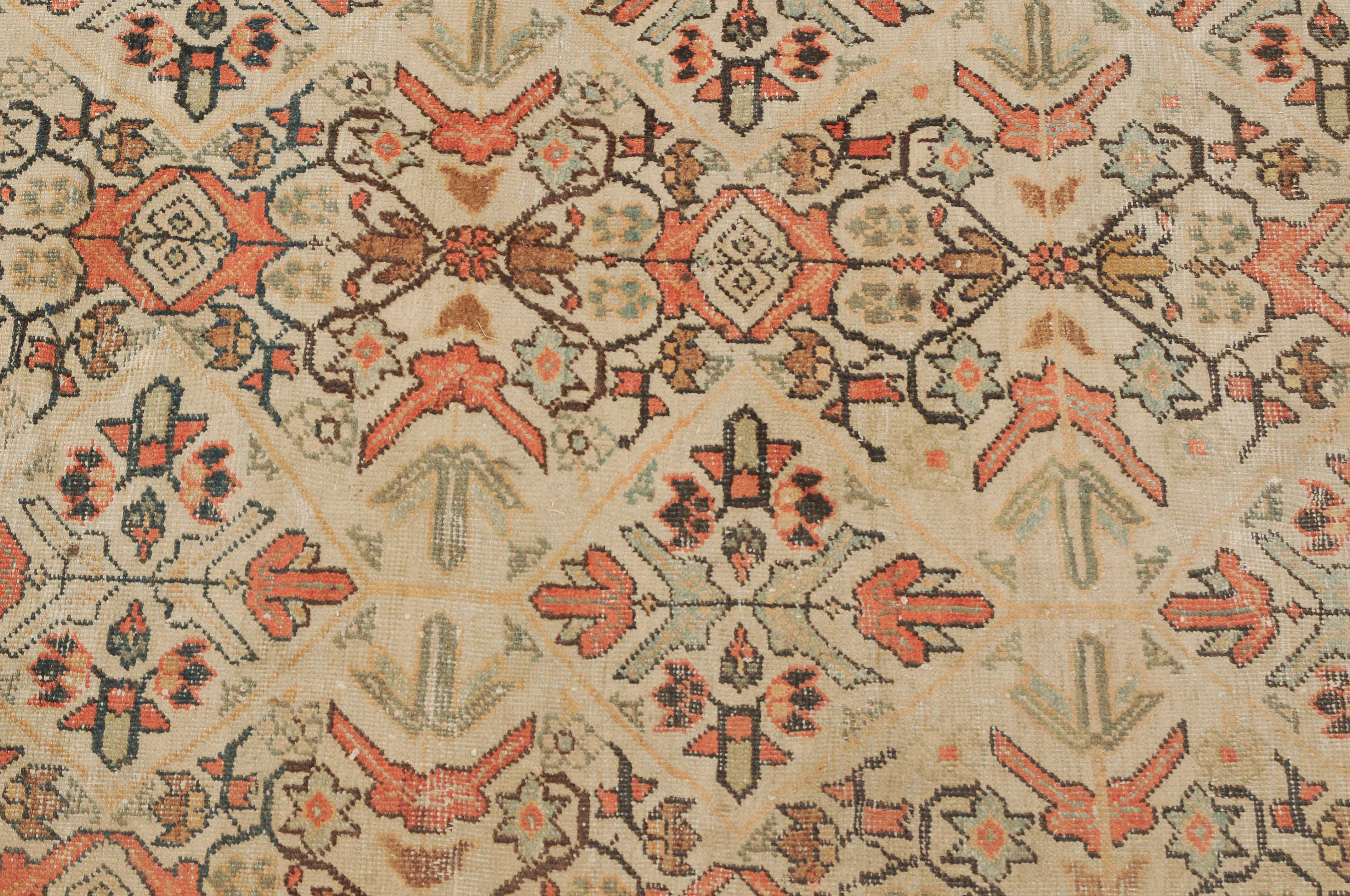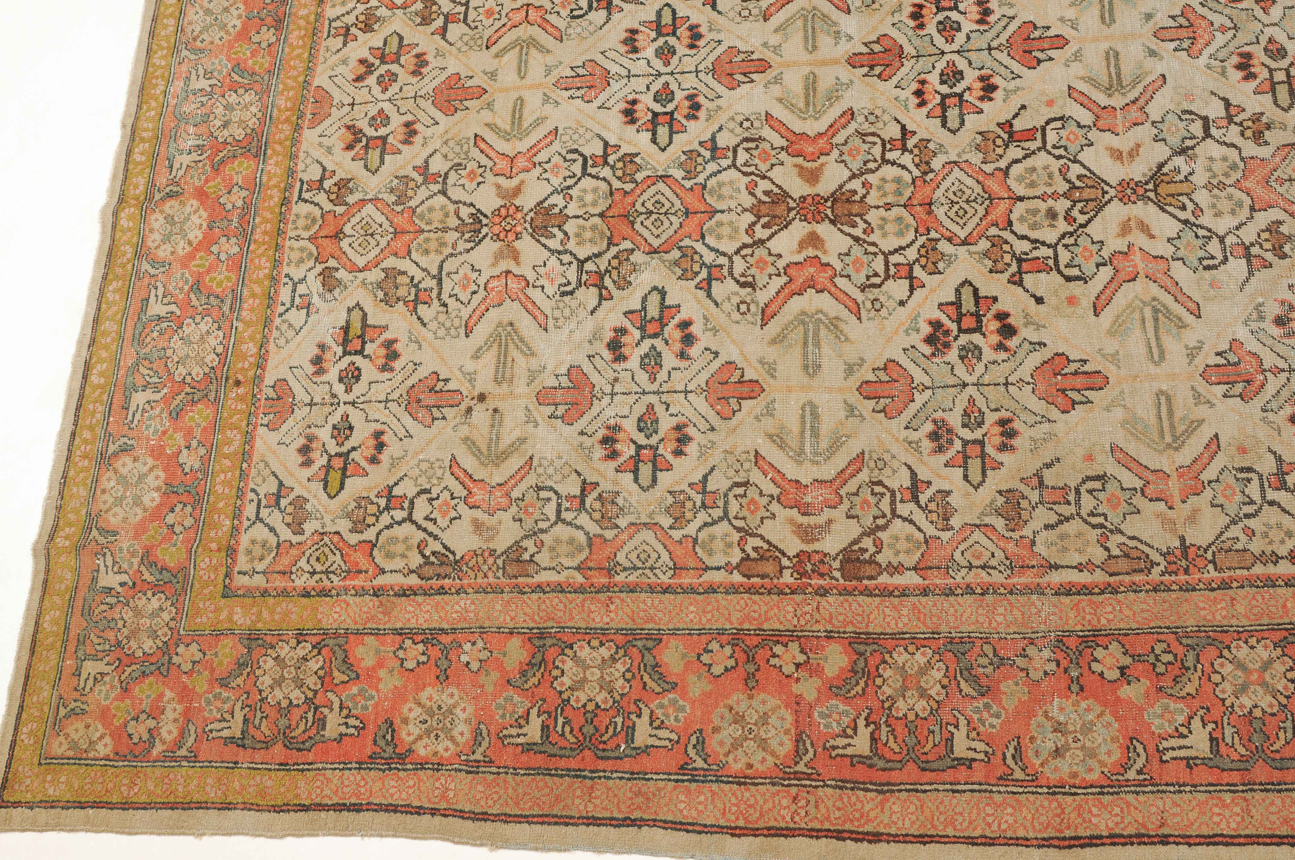Z-Persien, um 1910. Das beige Feld ist durchgehend mit wirkungsvollen Rauten, Blütenmotiven, Blattranken und Zweigen in unendlichem Rapport überzogen. Die 2 helle florale Borten umfassen die dekorative rote Palmetten- und Blattranken-Bordüre. Starke Gebrauchsspuren, fleckig. 260x315 cm (ft. 8.6x10.4).