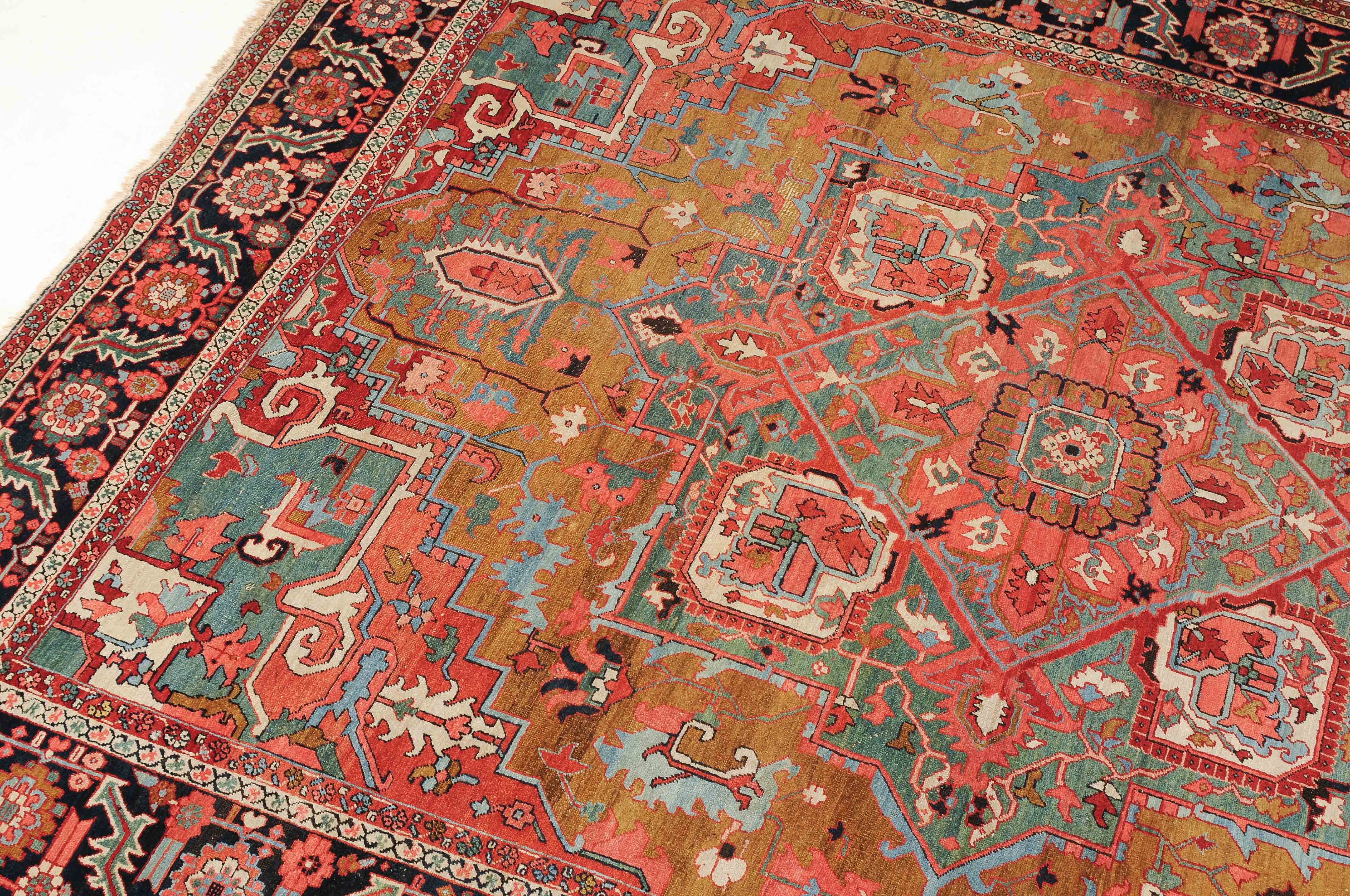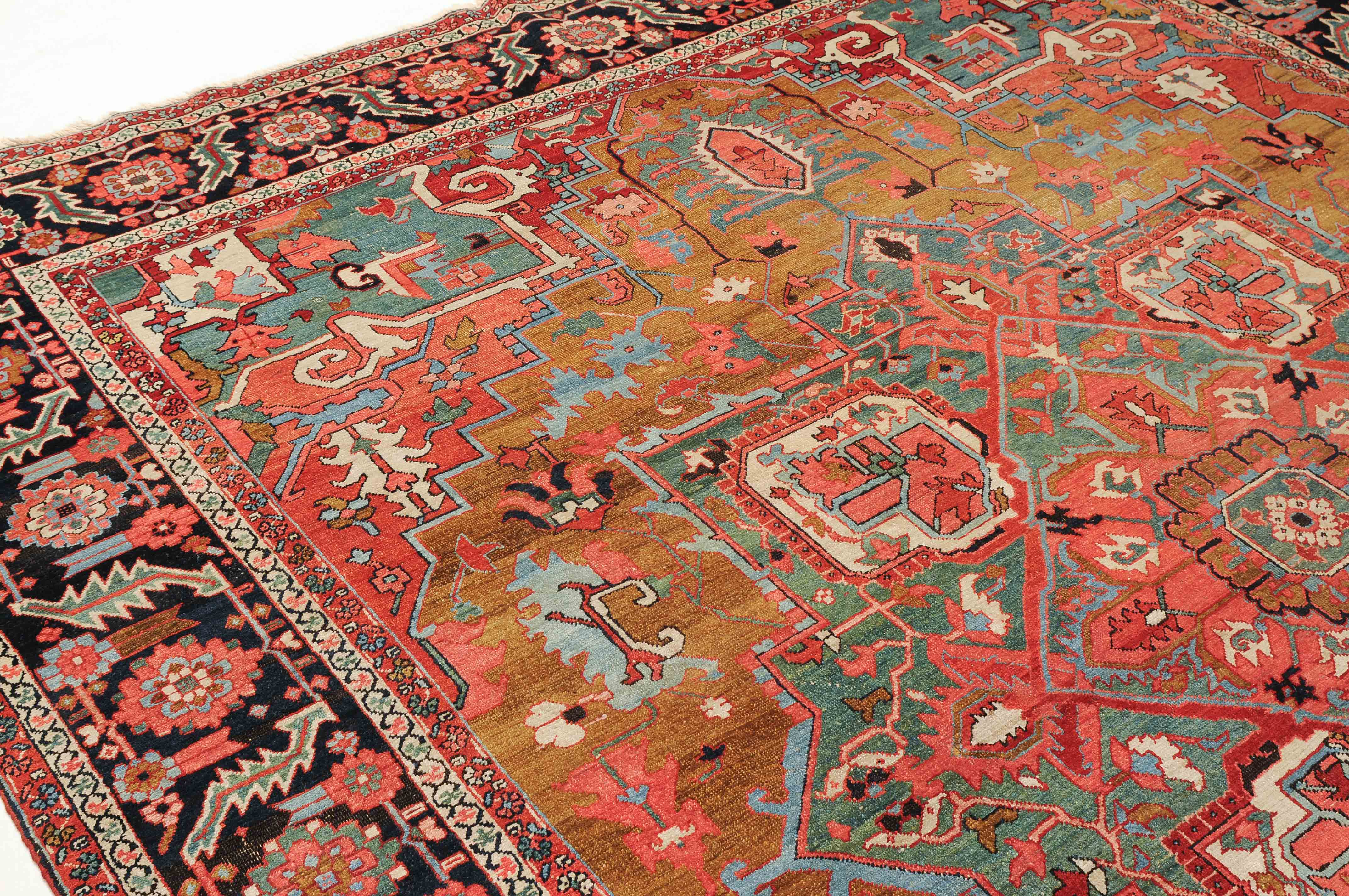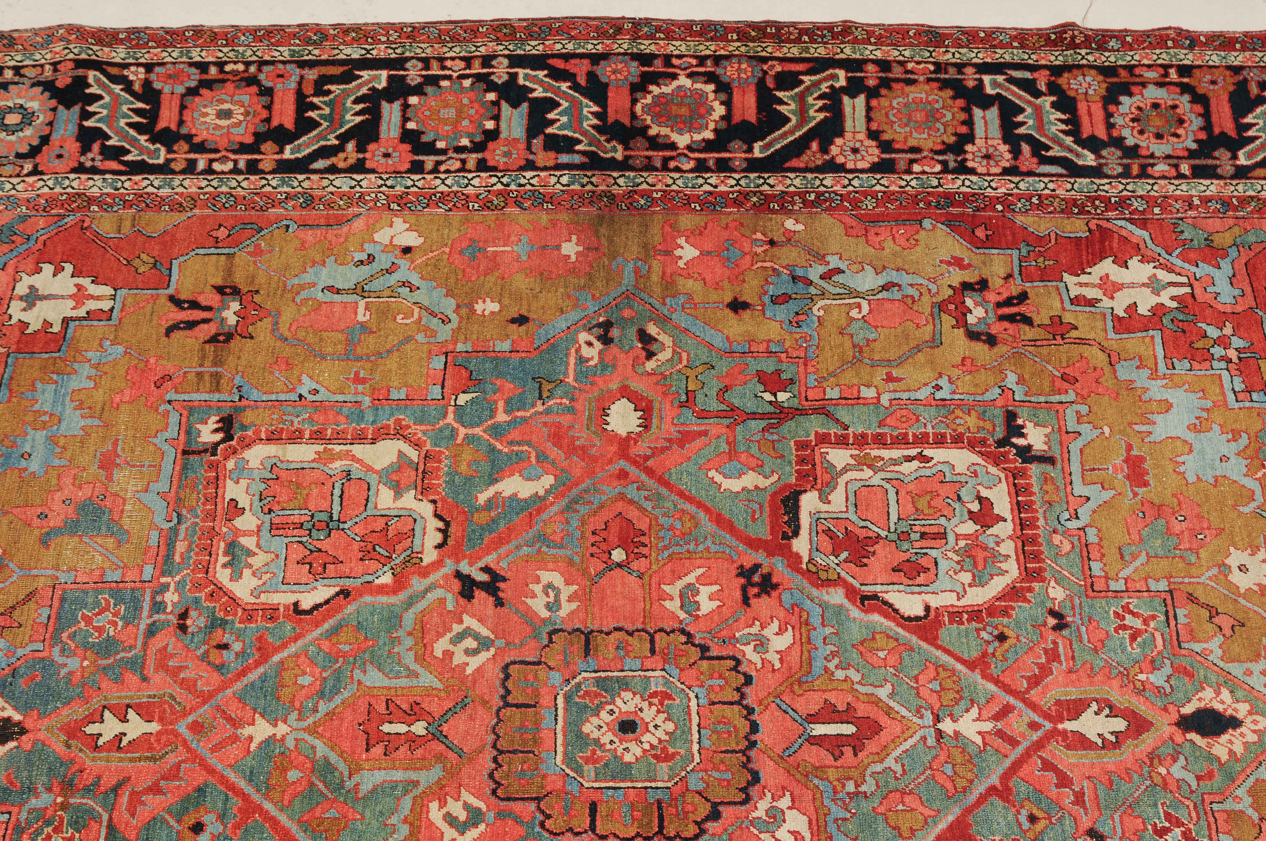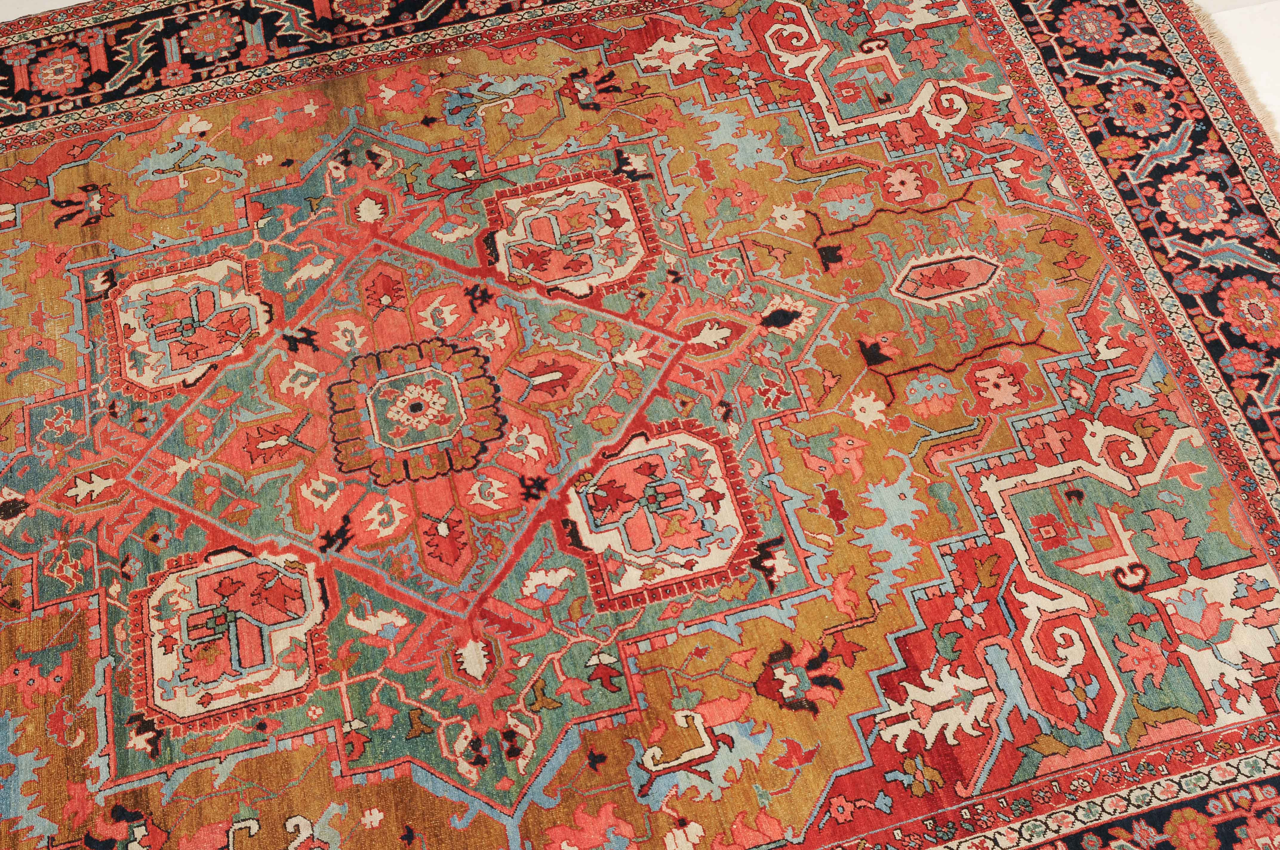 NW-Persien, um 1900. Im seltenen kamelhaarfarbenen Mittelfeld liegt ein prächtiges türkisblaues Heriz-Medaillon mit 2 aussergewöhnlichen Palmetten-Anhängern, flankiert von stark geometrischen Blattranken, Blüten sowie 4 stilvollen türkisblauen Eckzwickeln. 4 florale Borten in Weiss und Rot säumen die grosszügig angelegte nachtblaue Palmetten- und Sägeblatt-Hauptbordüre. Natürlicher Abrash. Gute Erhaltung. 275x340 cm (ft. 9.1x11.2).
