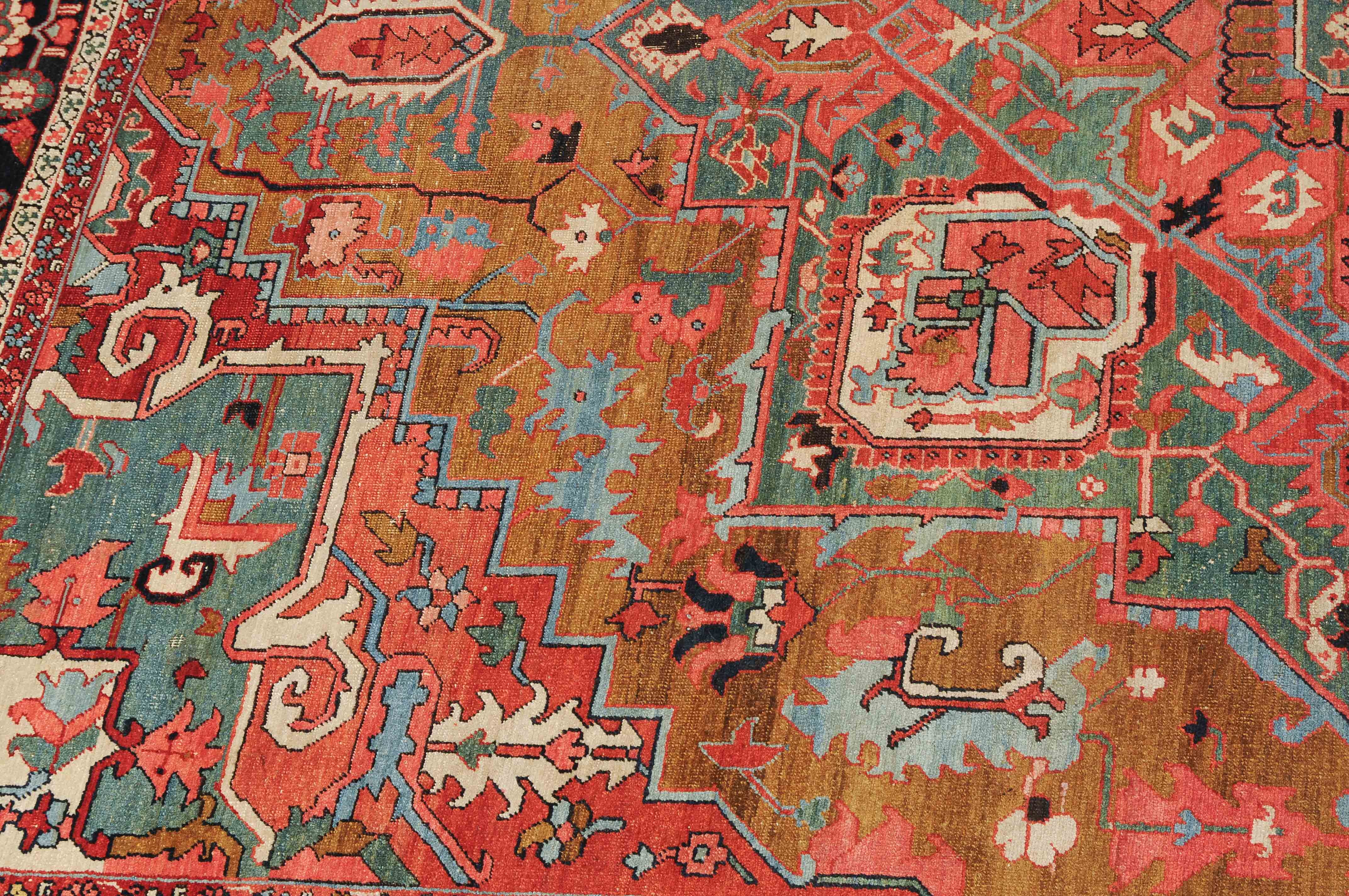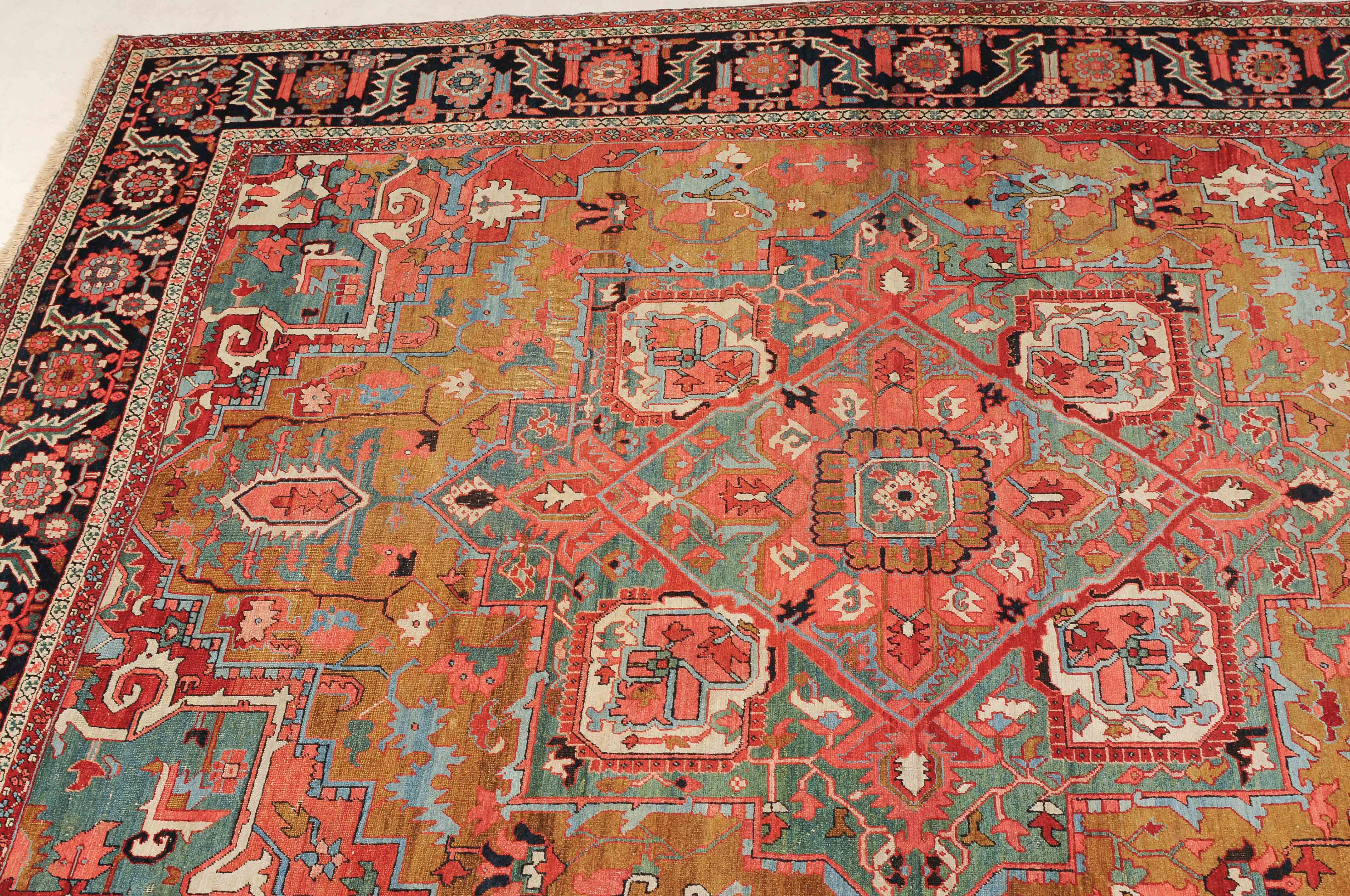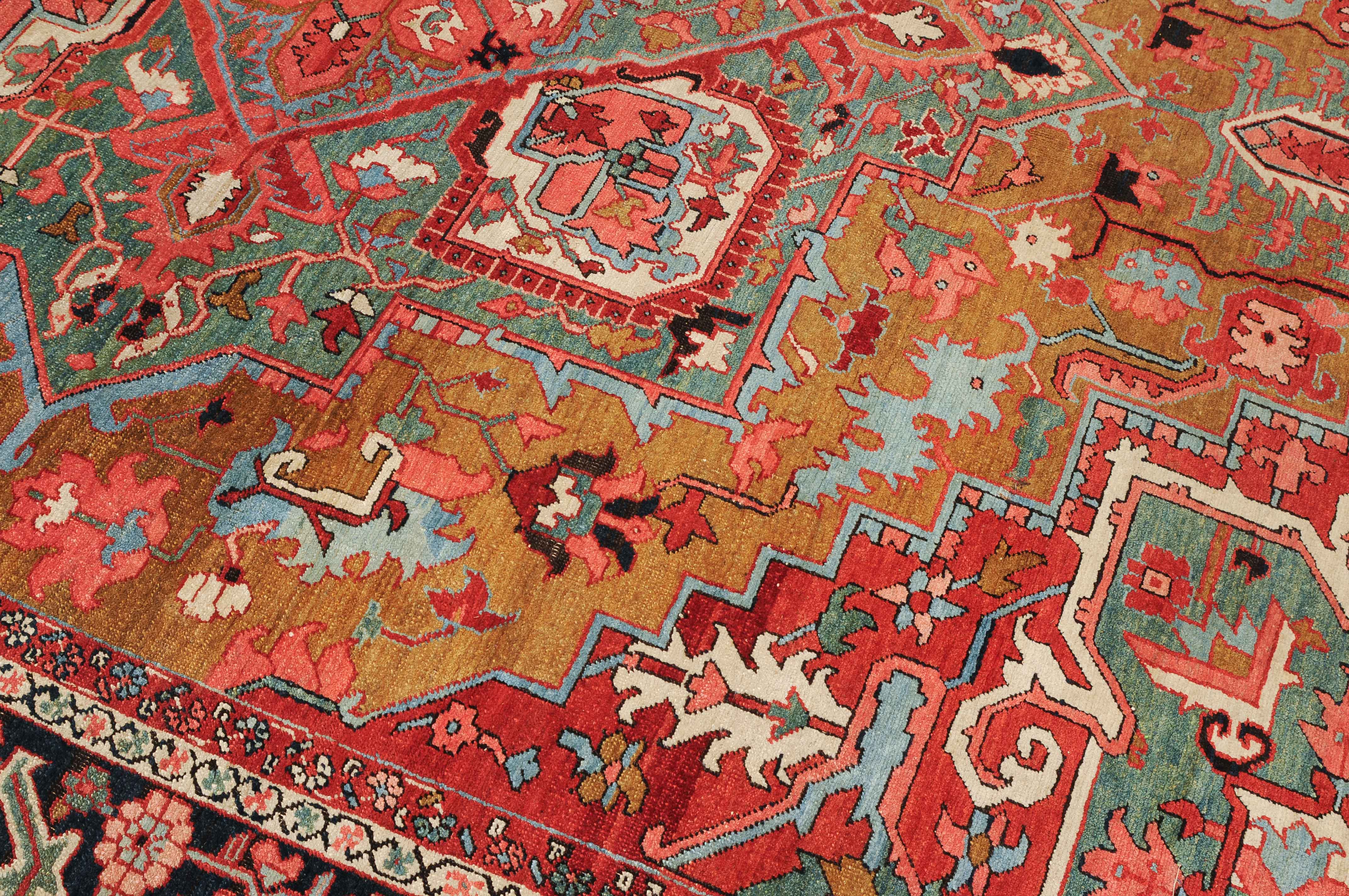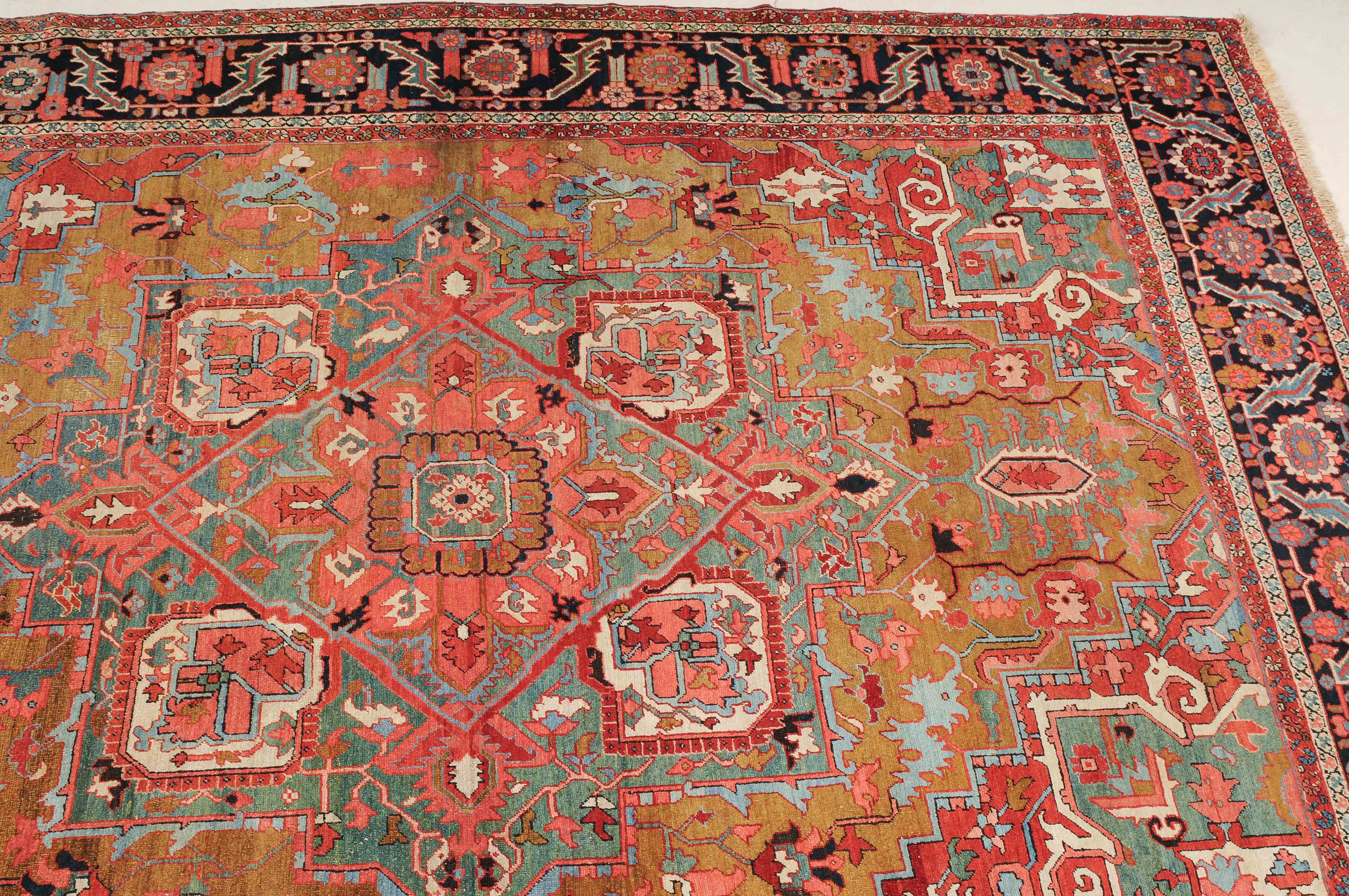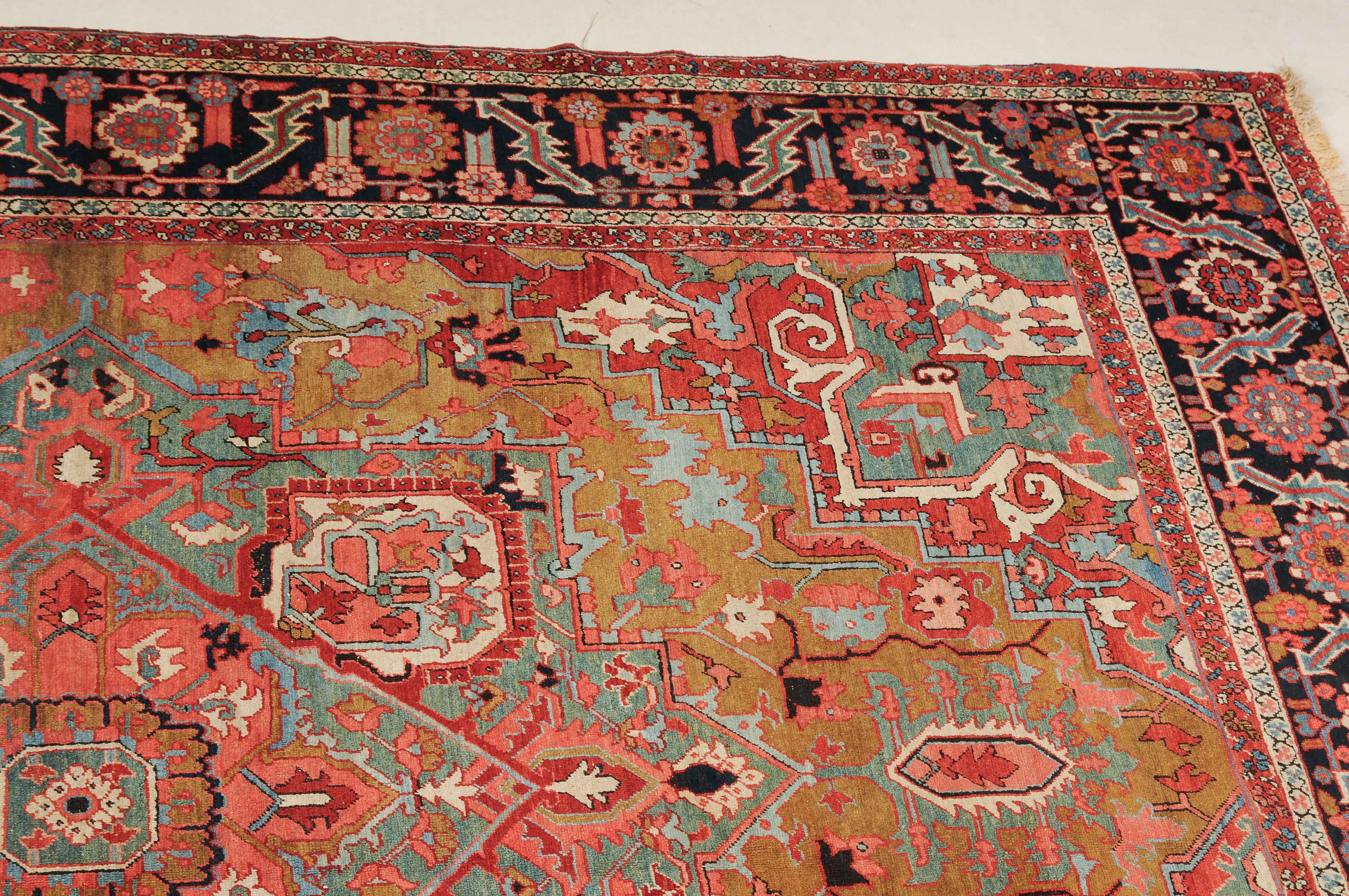 NW-Persien, um 1900. Im seltenen kamelhaarfarbenen Mittelfeld liegt ein prächtiges türkisblaues Heriz-Medaillon mit 2 aussergewöhnlichen Palmetten-Anhängern, flankiert von stark geometrischen Blattranken, Blüten sowie 4 stilvollen türkisblauen Eckzwickeln. 4 florale Borten in Weiss und Rot säumen die grosszügig angelegte nachtblaue Palmetten- und Sägeblatt-Hauptbordüre. Natürlicher Abrash. Gute Erhaltung. 275x340 cm (ft. 9.1x11.2).