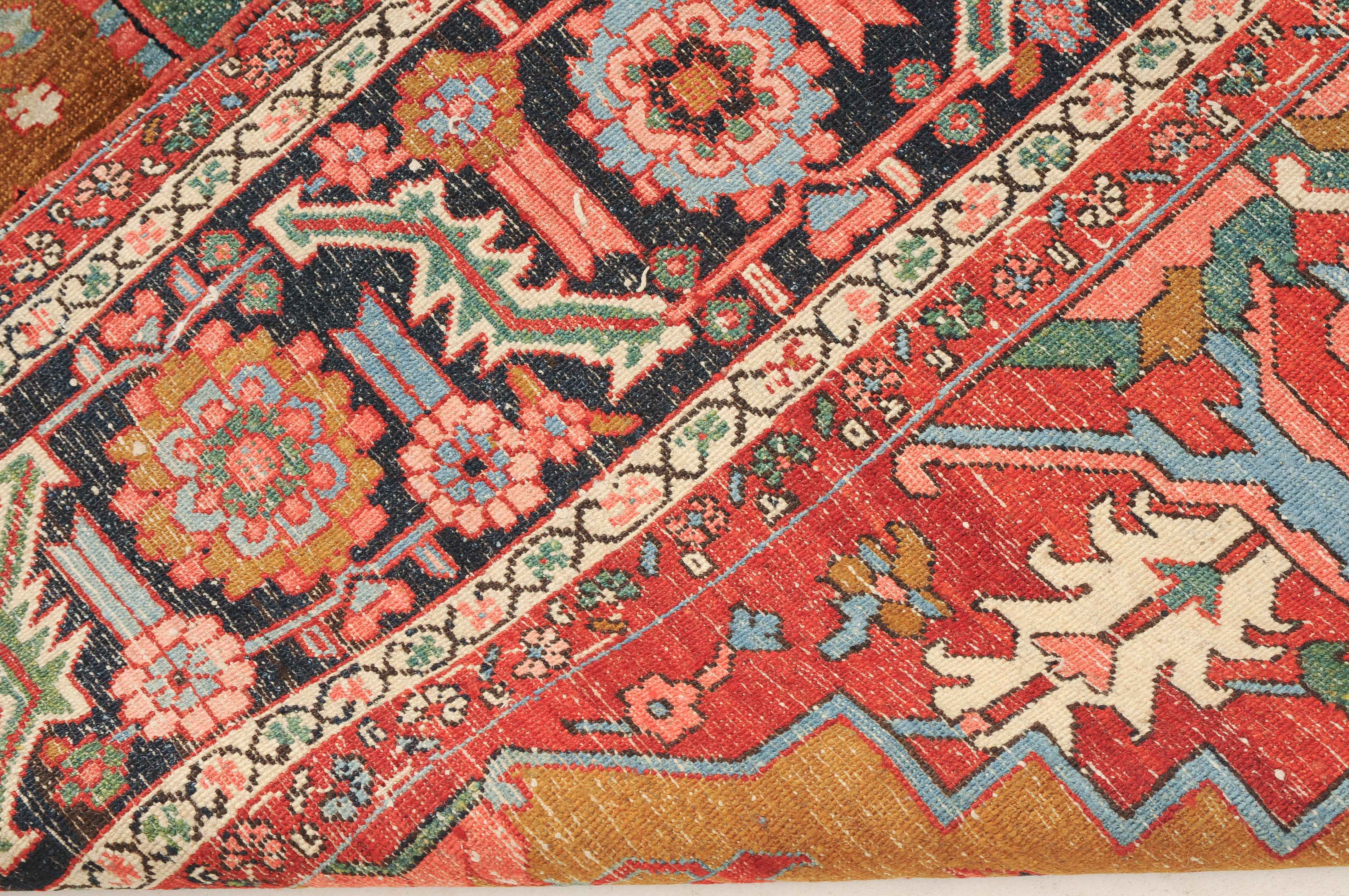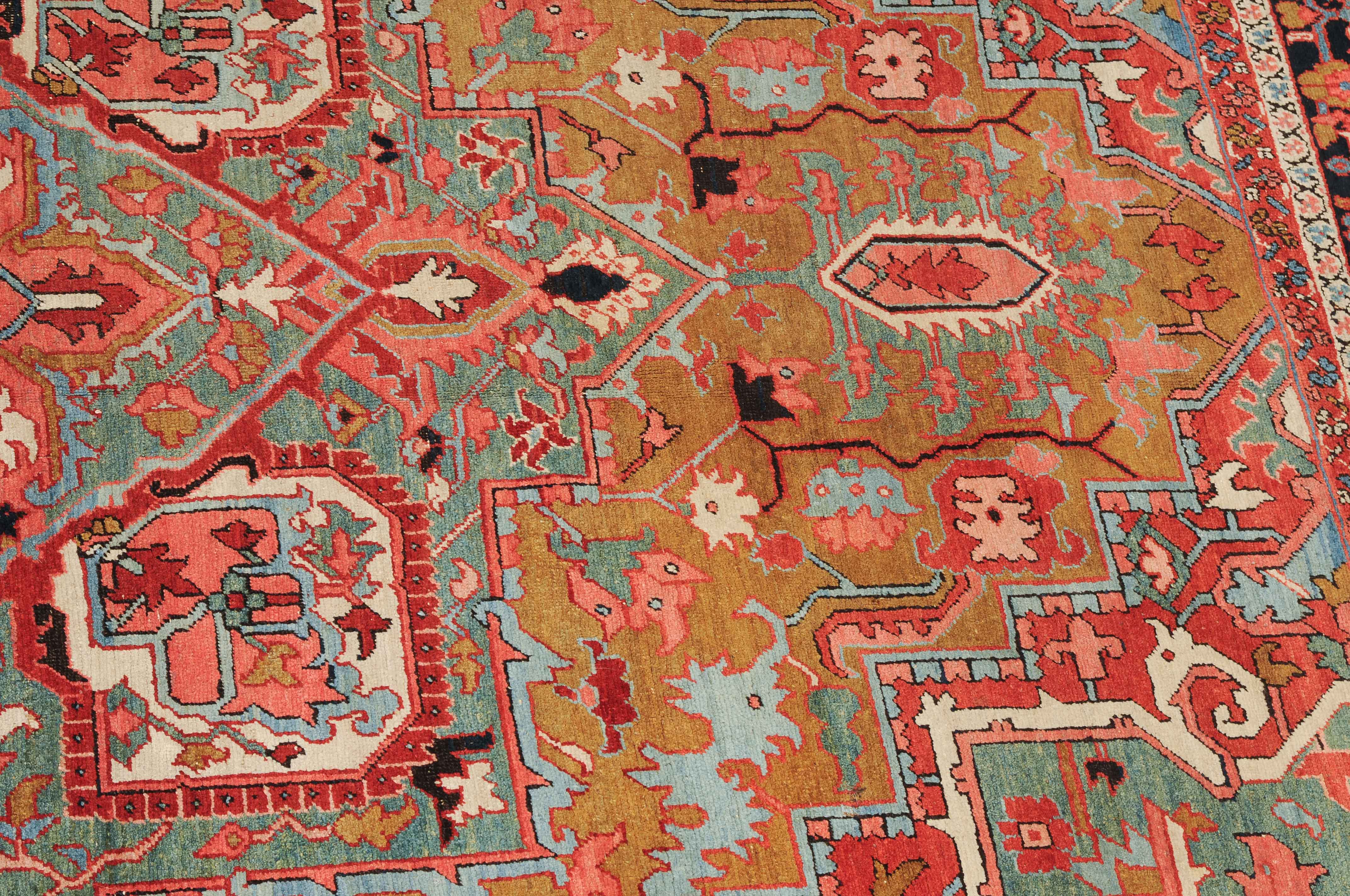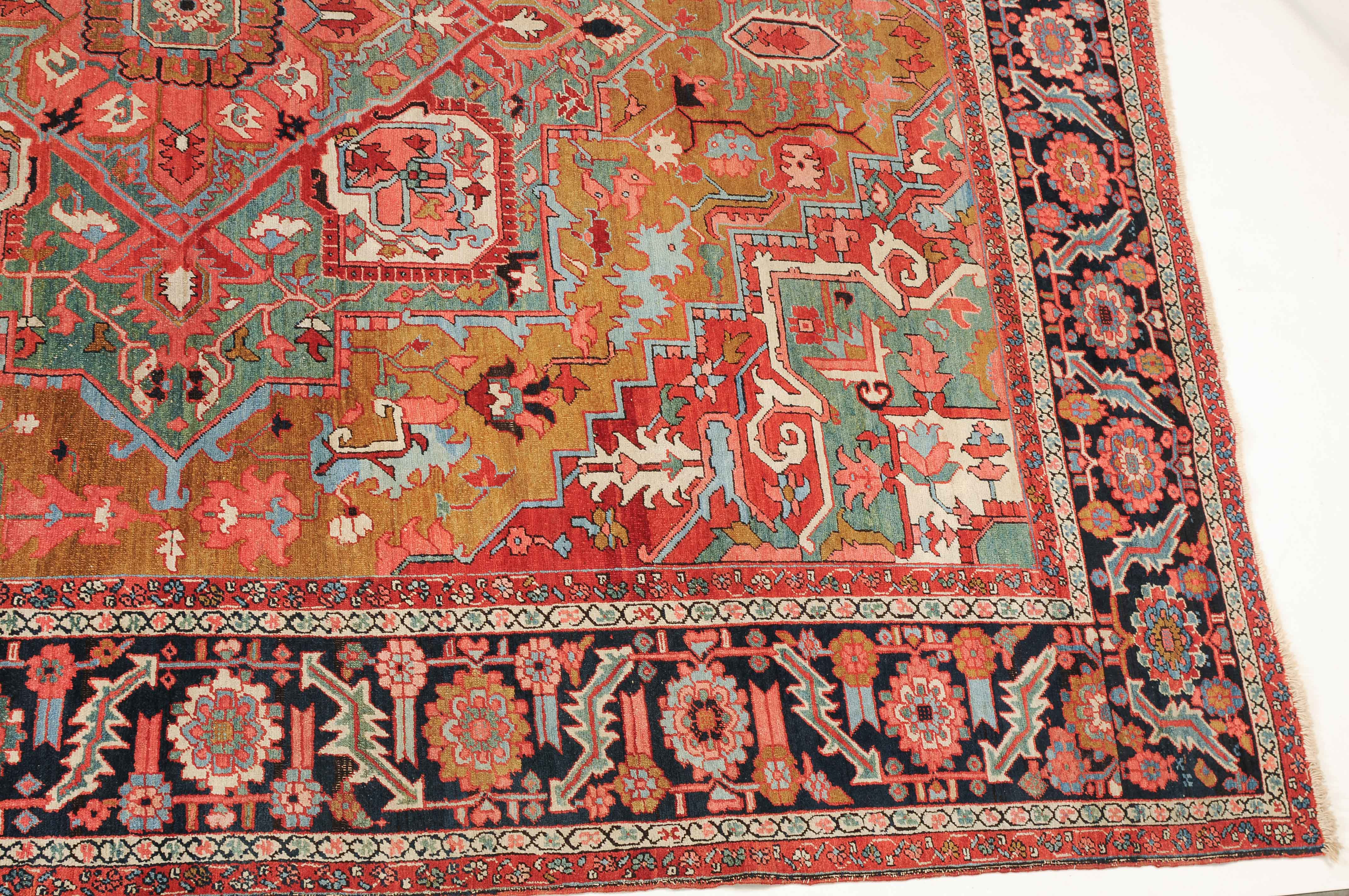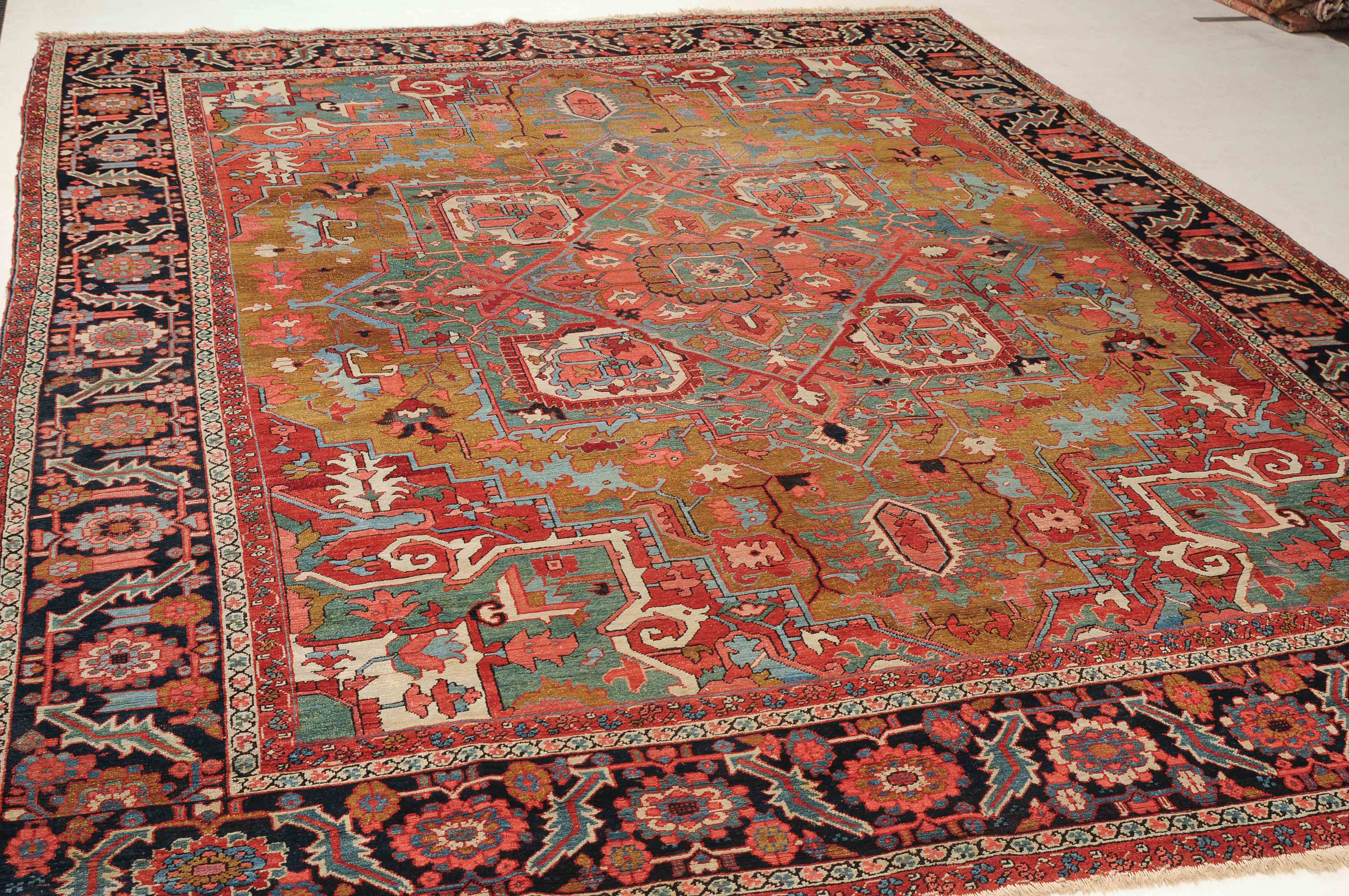 NW-Persien, um 1900. Im seltenen kamelhaarfarbenen Mittelfeld liegt ein prächtiges türkisblaues Heriz-Medaillon mit 2 aussergewöhnlichen Palmetten-Anhängern, flankiert von stark geometrischen Blattranken, Blüten sowie 4 stilvollen türkisblauen Eckzwickeln. 4 florale Borten in Weiss und Rot säumen die grosszügig angelegte nachtblaue Palmetten- und Sägeblatt-Hauptbordüre. Natürlicher Abrash. Gute Erhaltung. 275x340 cm (ft. 9.1x11.2).