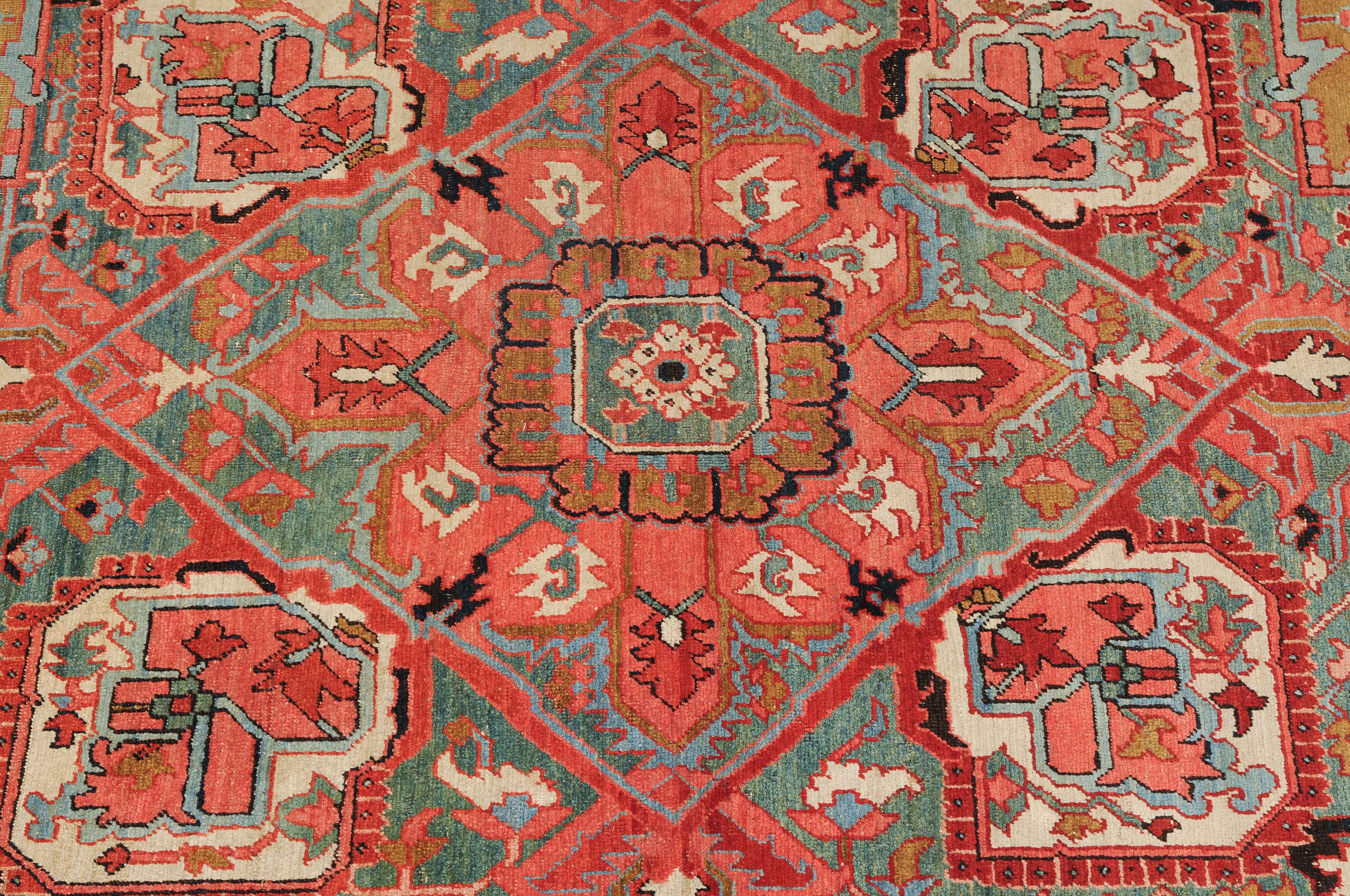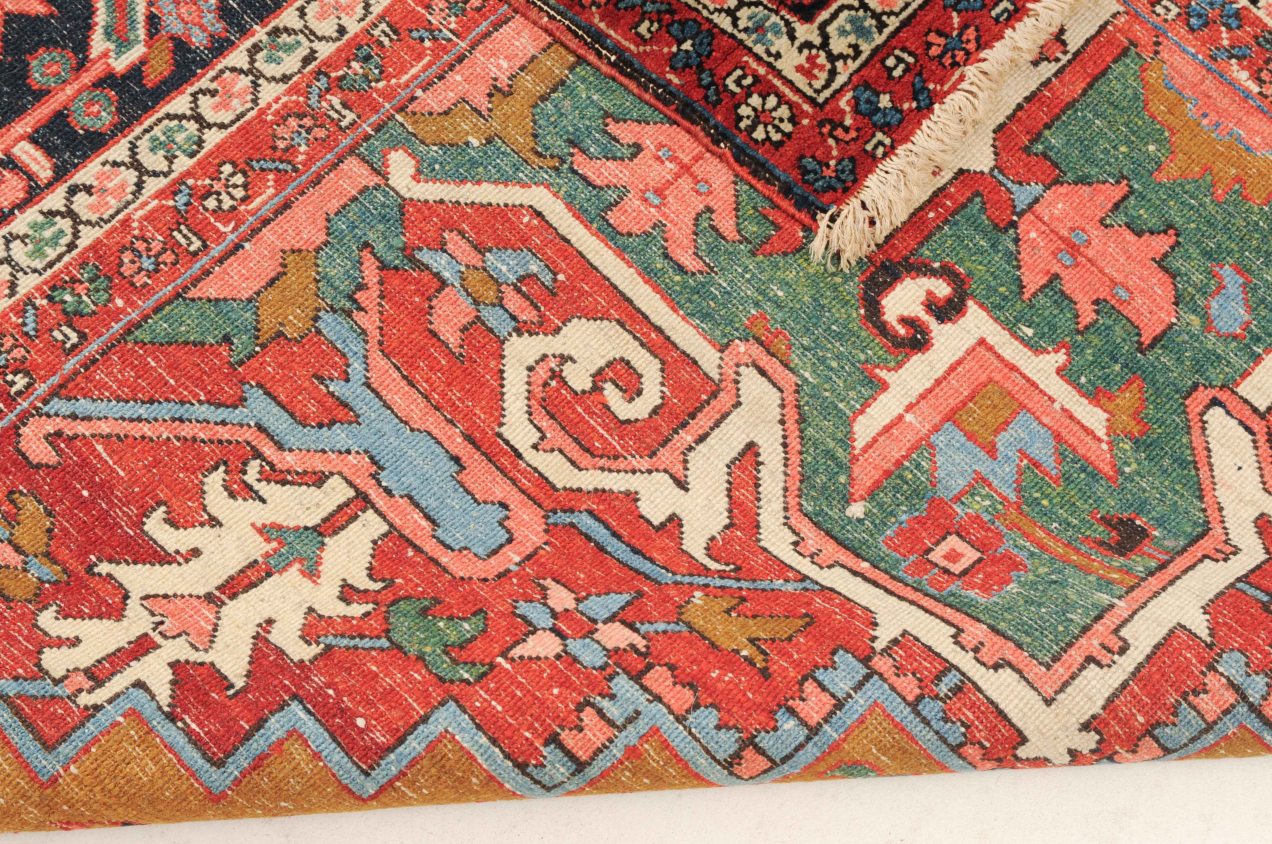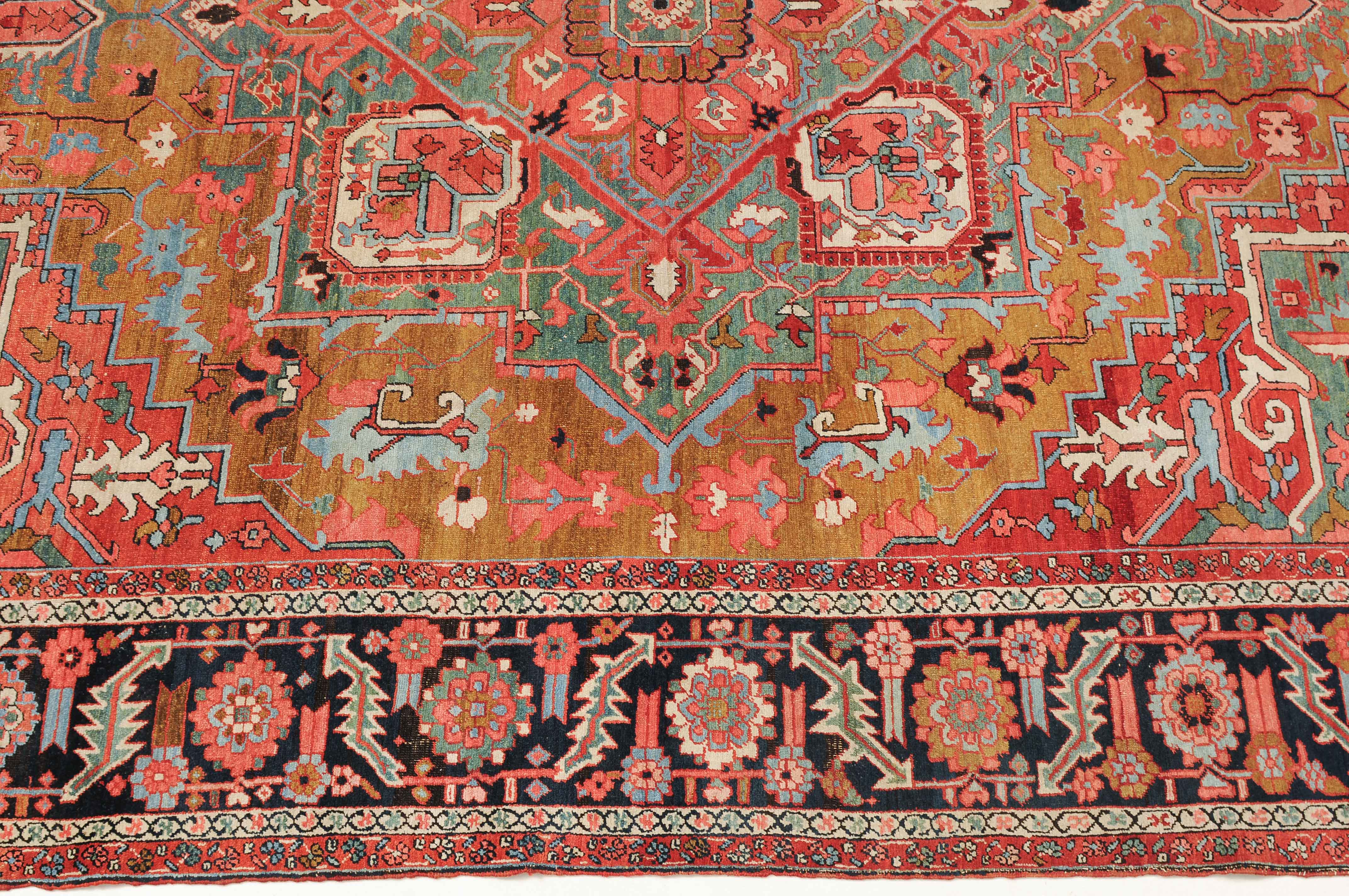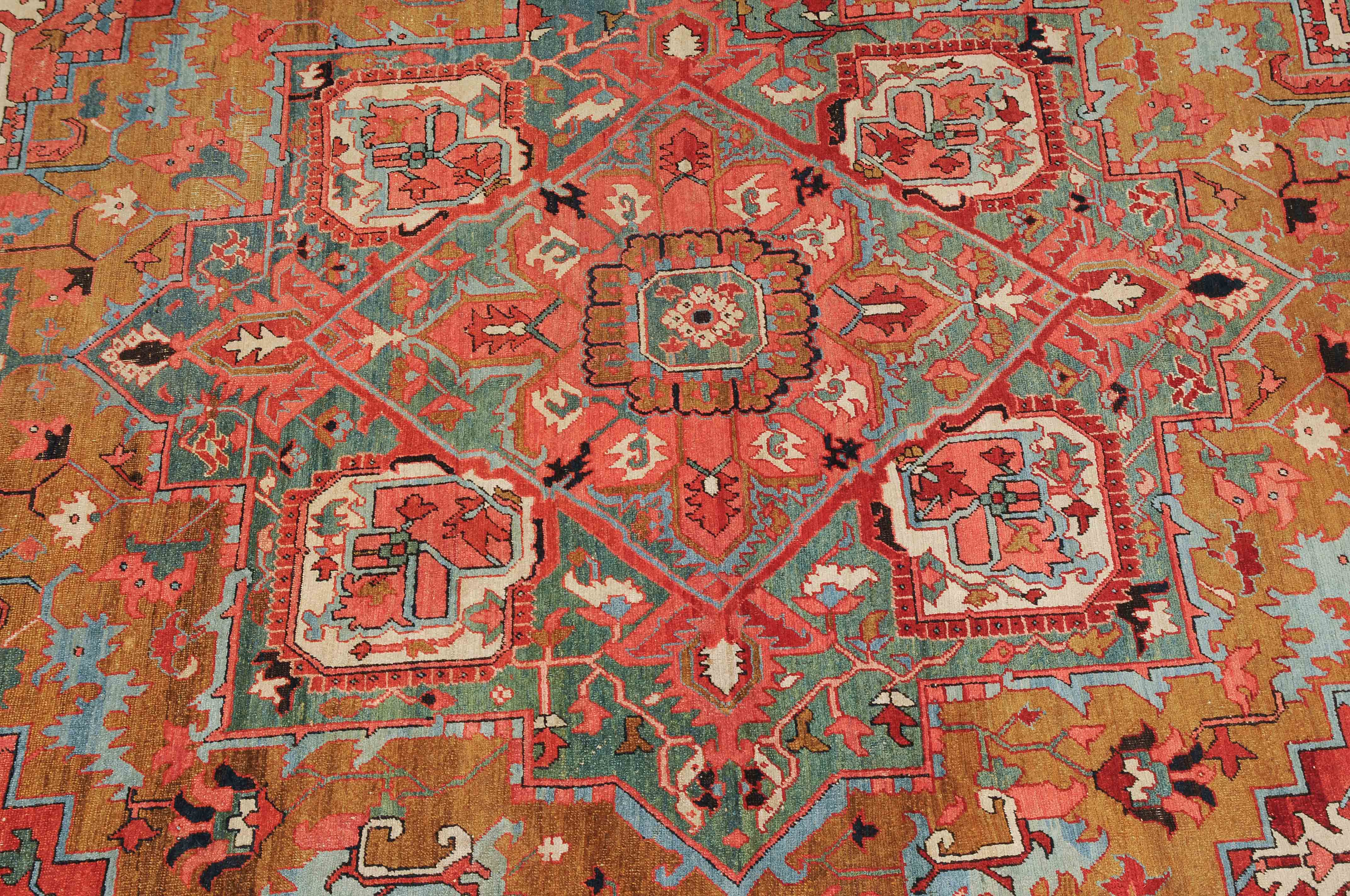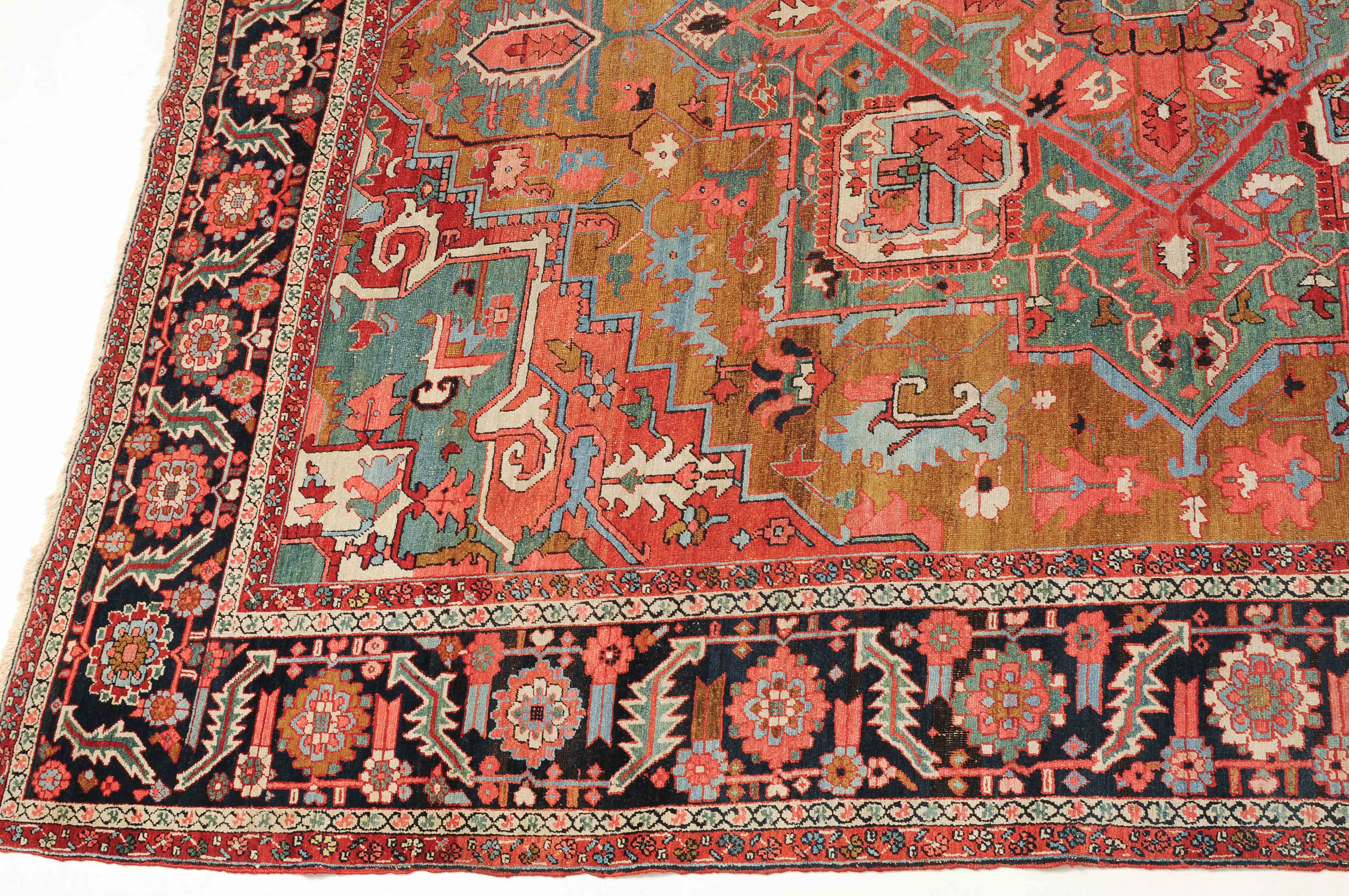 NW-Persien, um 1900. Im seltenen kamelhaarfarbenen Mittelfeld liegt ein prächtiges türkisblaues Heriz-Medaillon mit 2 aussergewöhnlichen Palmetten-Anhängern, flankiert von stark geometrischen Blattranken, Blüten sowie 4 stilvollen türkisblauen Eckzwickeln. 4 florale Borten in Weiss und Rot säumen die grosszügig angelegte nachtblaue Palmetten- und Sägeblatt-Hauptbordüre. Natürlicher Abrash. Gute Erhaltung. 275x340 cm (ft. 9.1x11.2).
