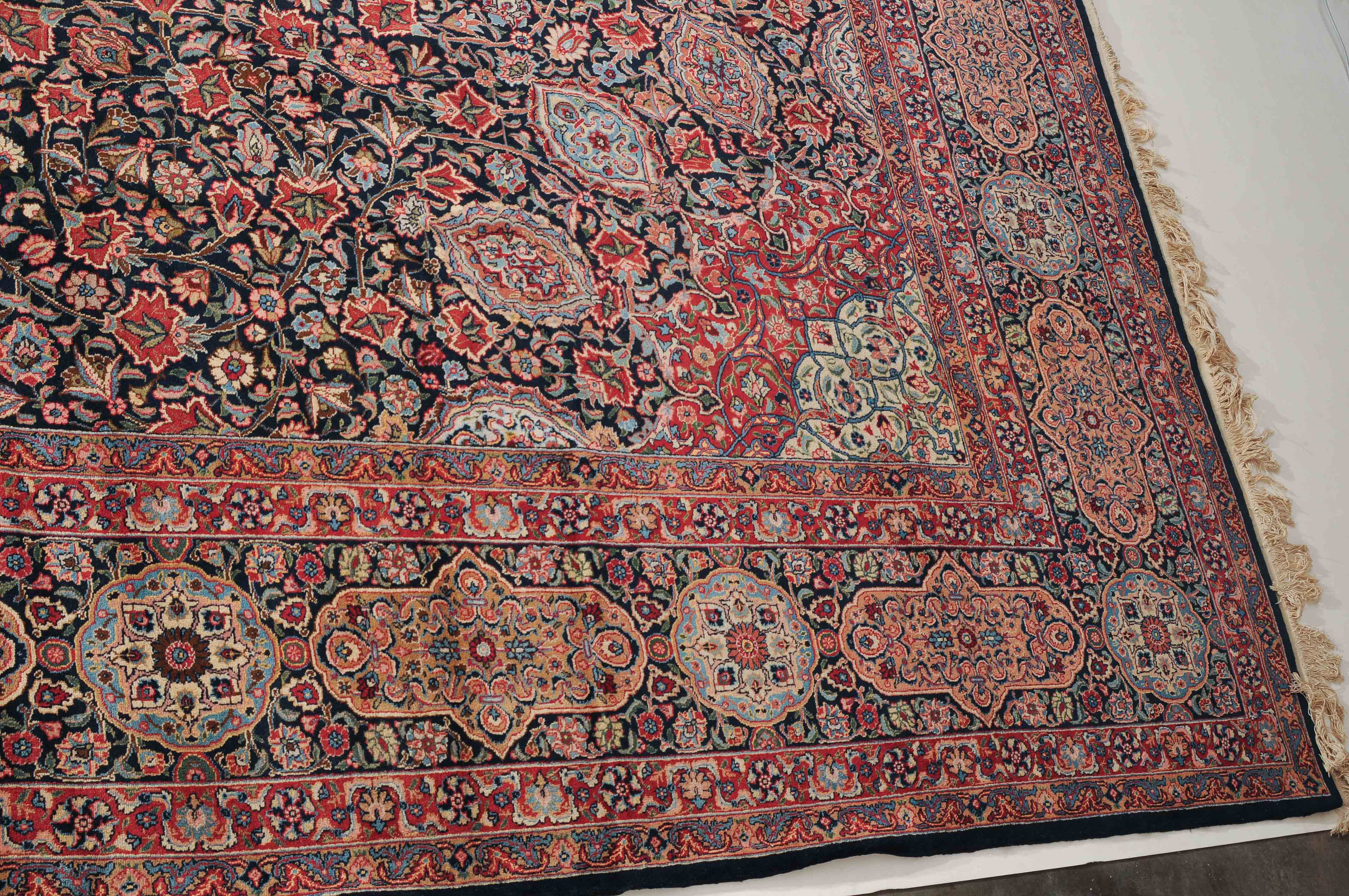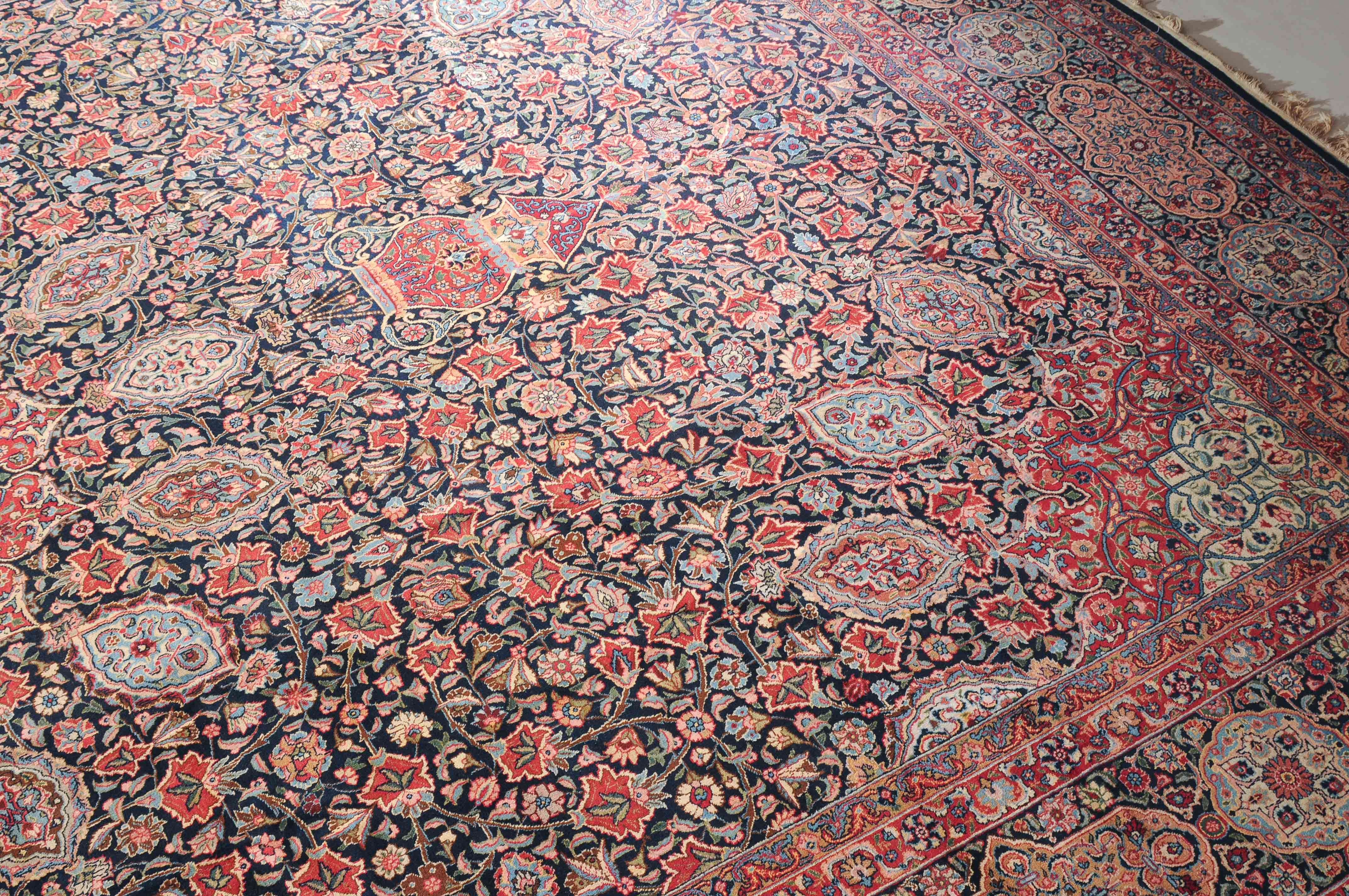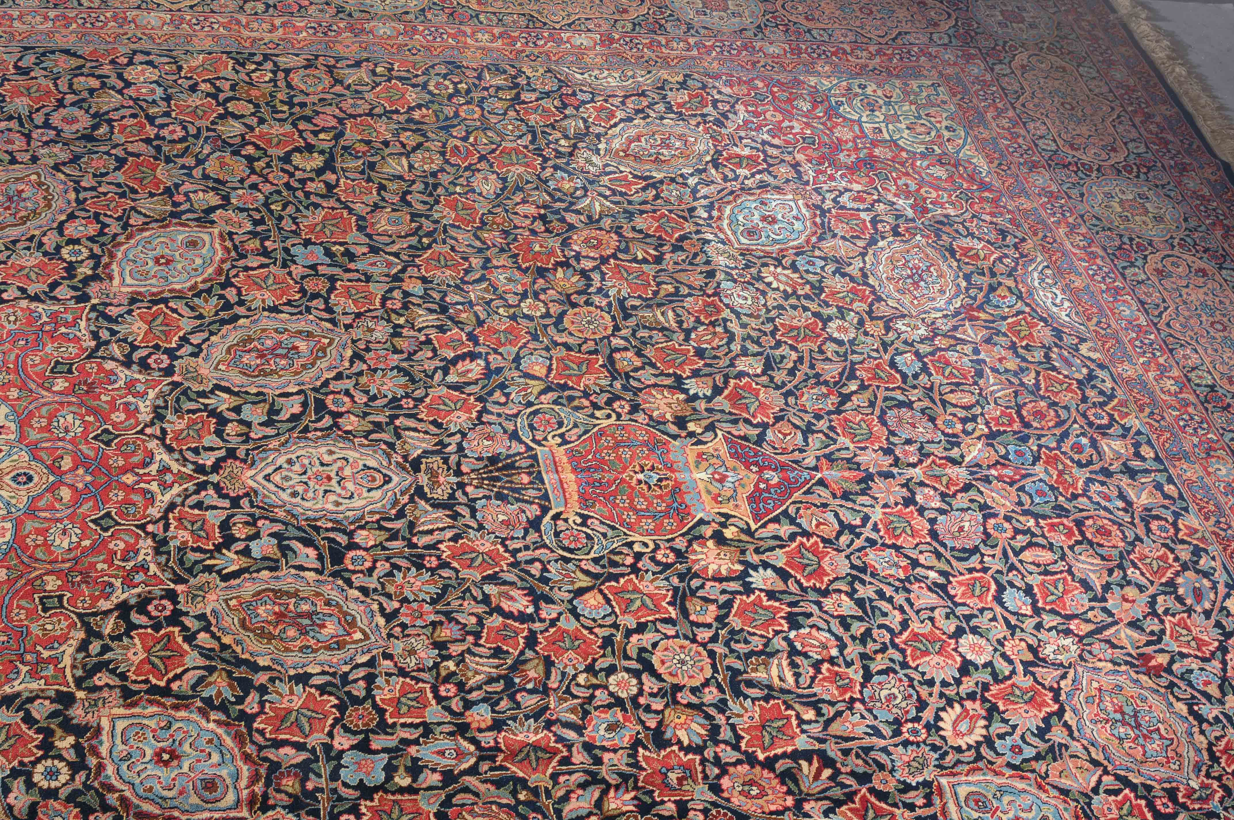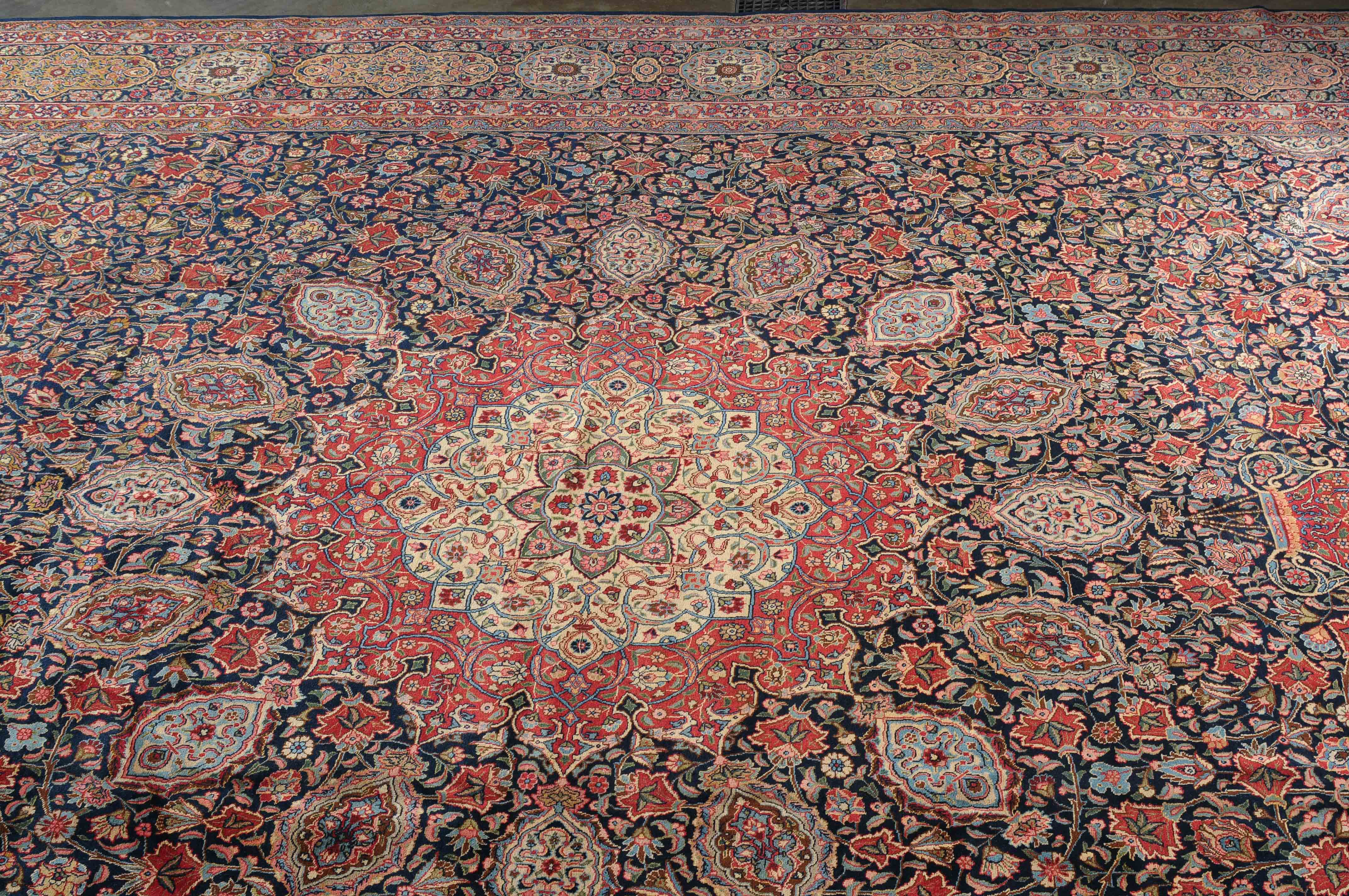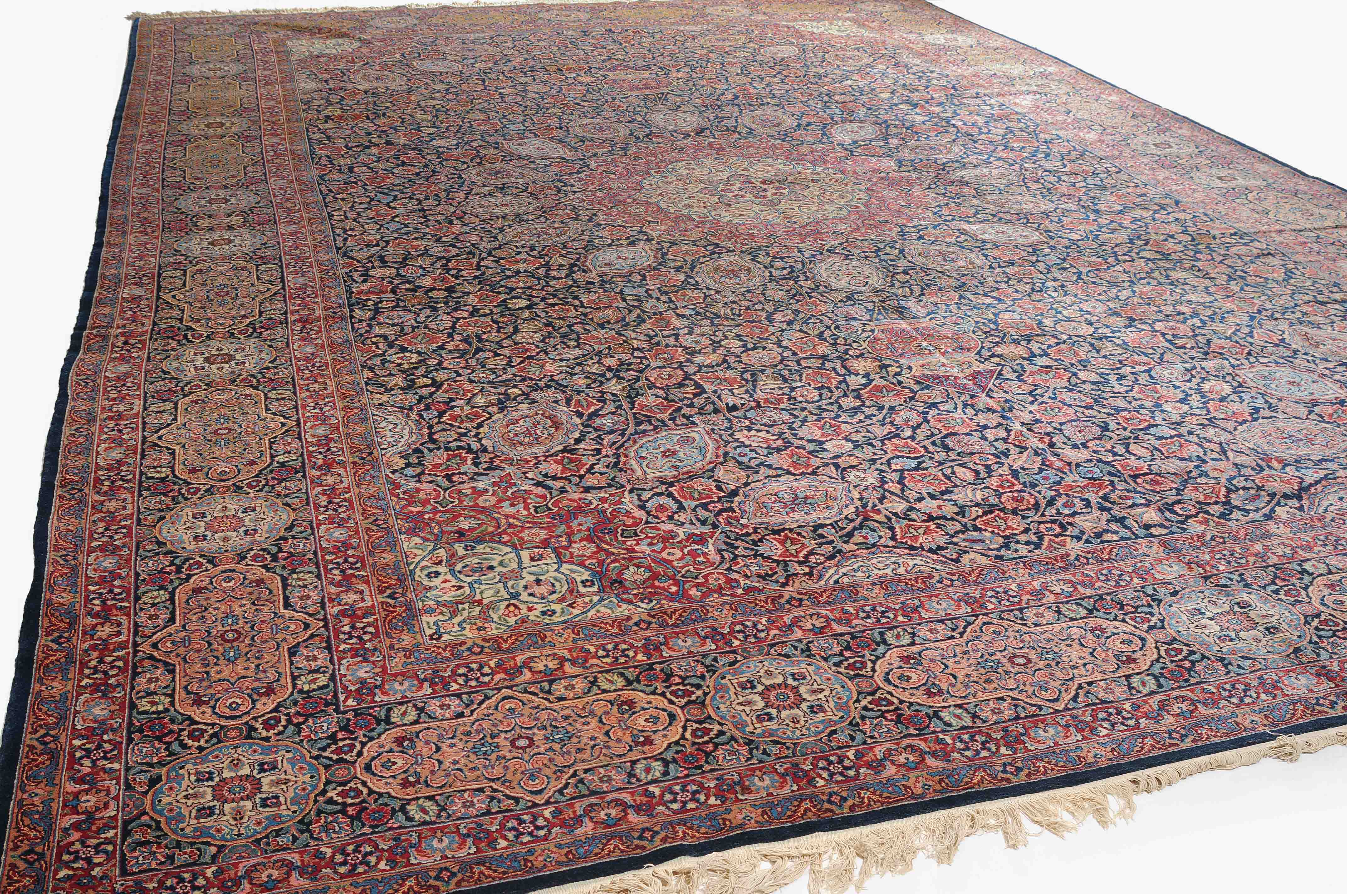 NW-Persien, um 1910. Sog. "Ardebil"-Musterung. Im stilvollen nachblauen Mittelfeld thront ein kunstvoll gestaltetes 16-Pass-Rundmedaillon mit 2 Ampelanhängern, flankiert von einem in unendlichem Rapport angelegten dichten floralen Dekor sowie 4 Eckzwickeln, die je mit einem Viertel des Medaillons belegt sind. 2 elegante Nebenbordüren umlaufen die ebenfalls nachtblaue, mit Kartuschen und Blütenmedaillons auf dekorative Weise geschmückte Hauptbordüre. Sehr gute Erhaltung. 395x644 cm (ft. 13x21.2).