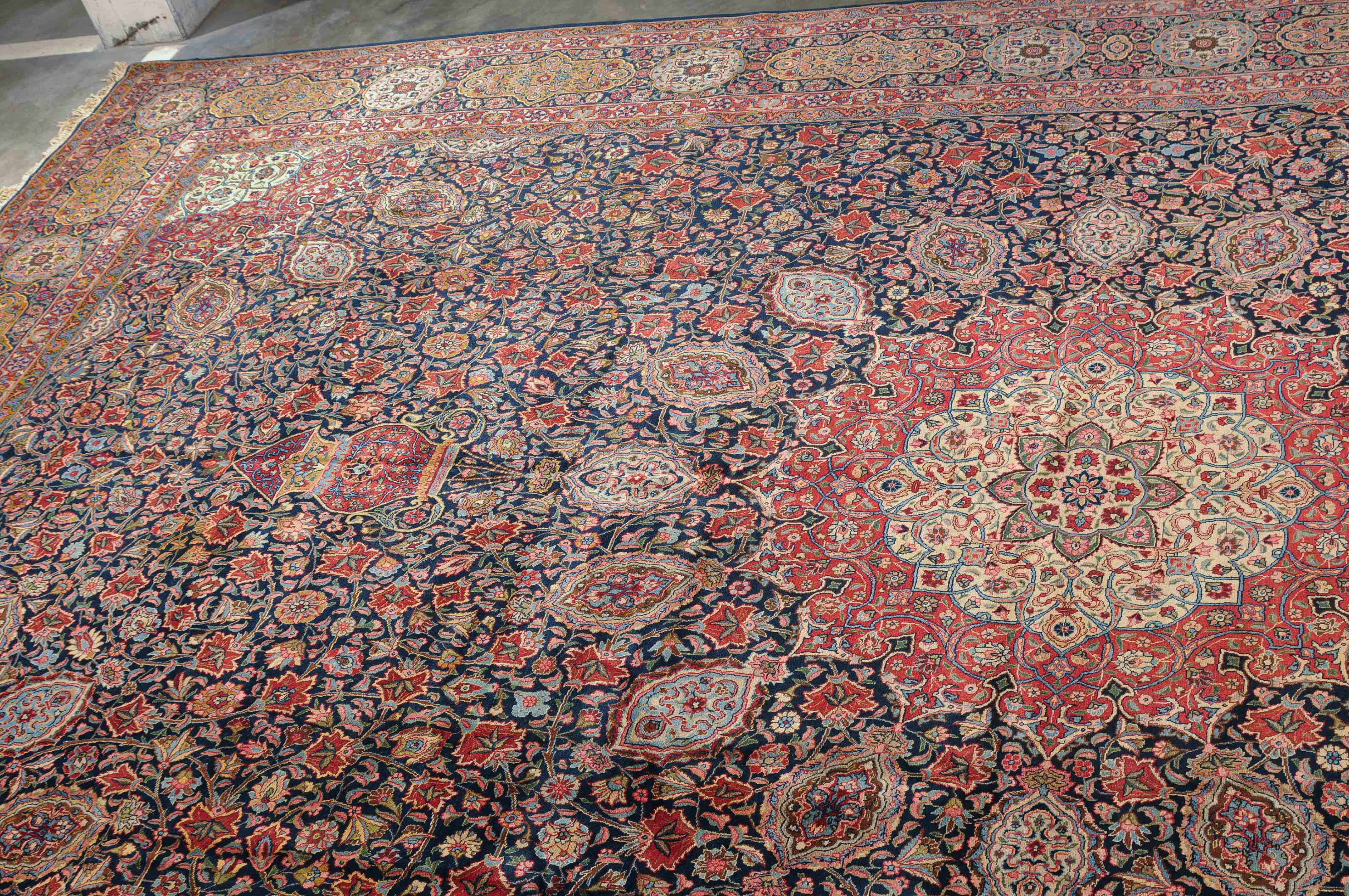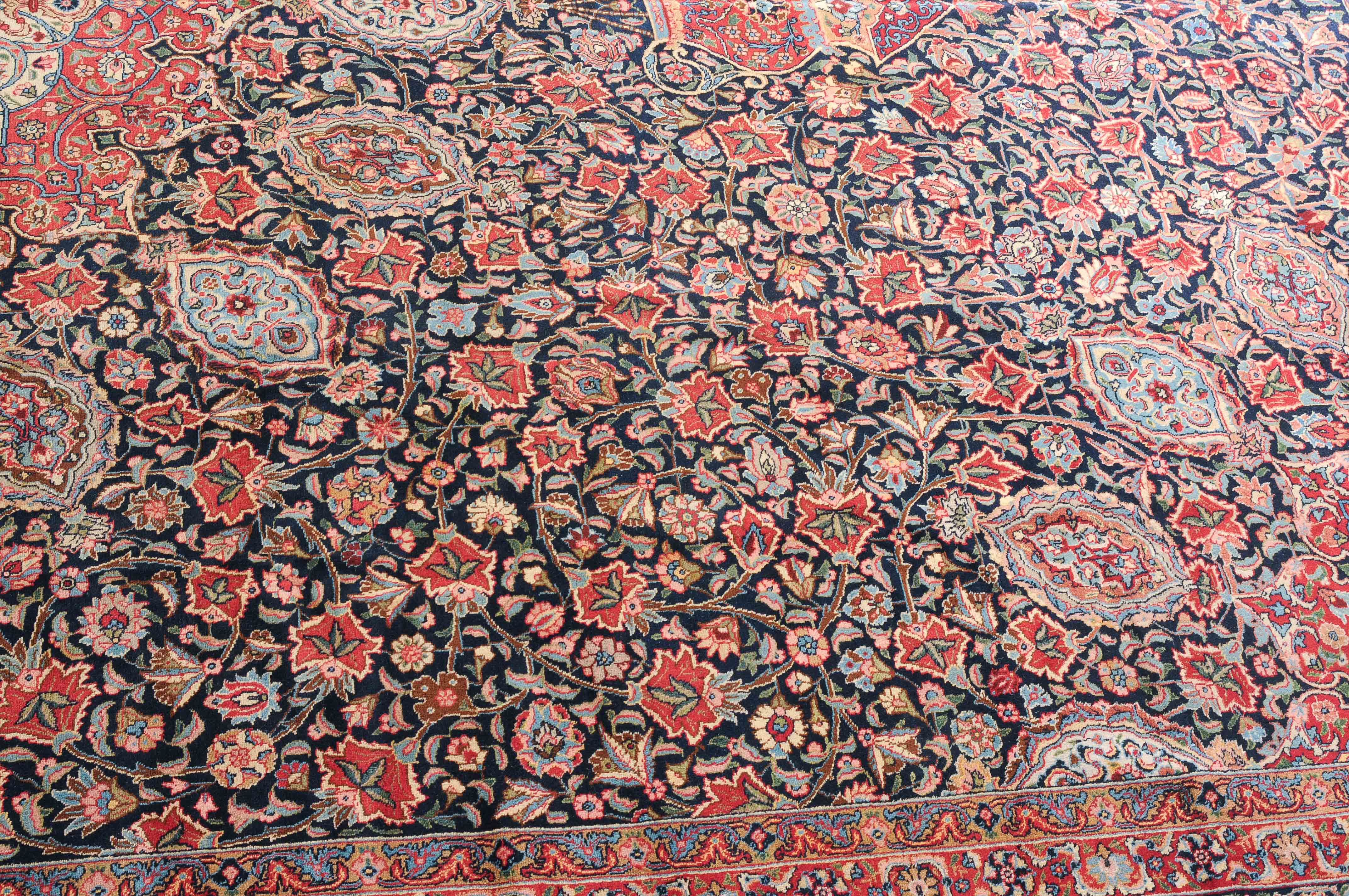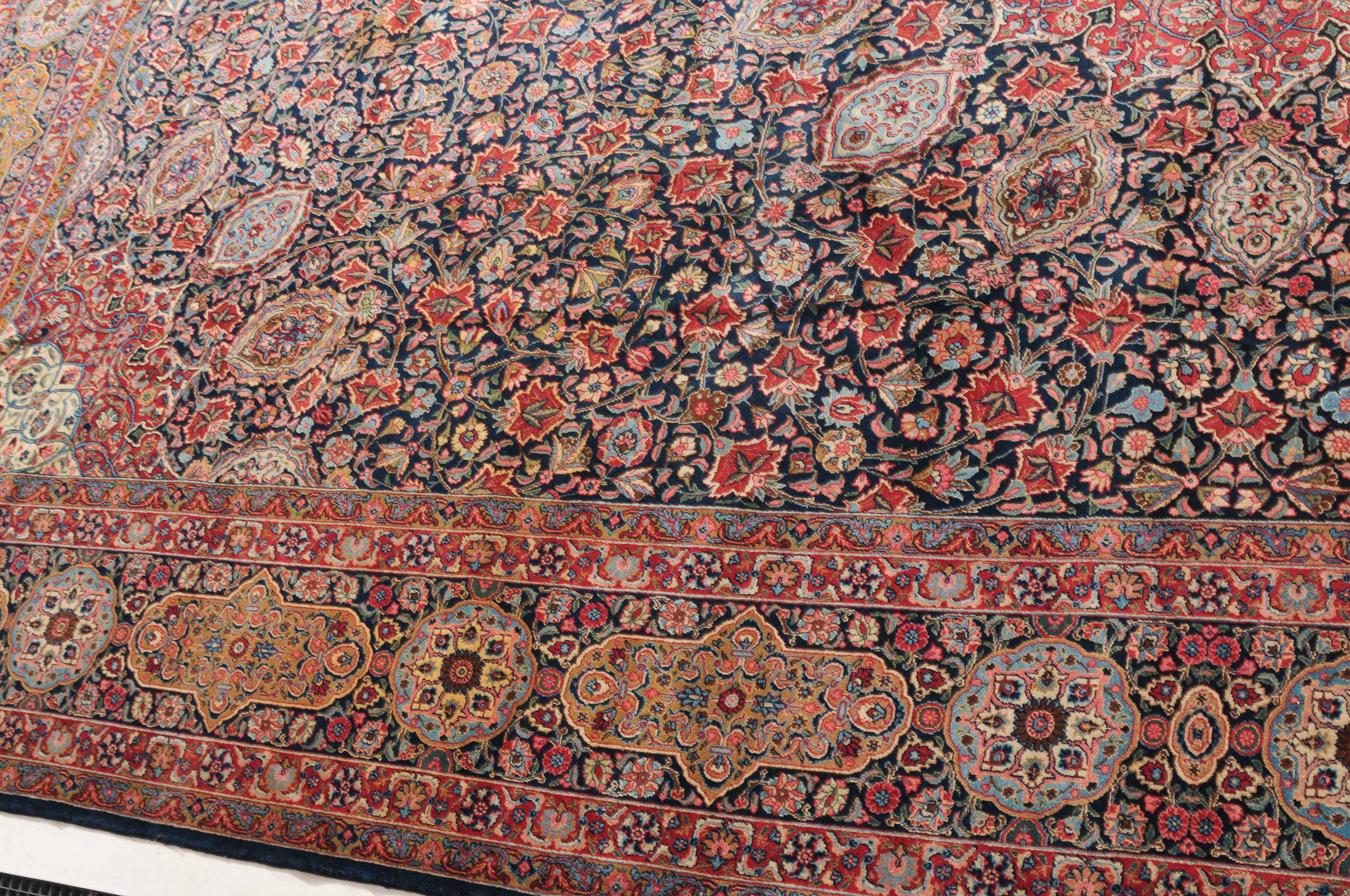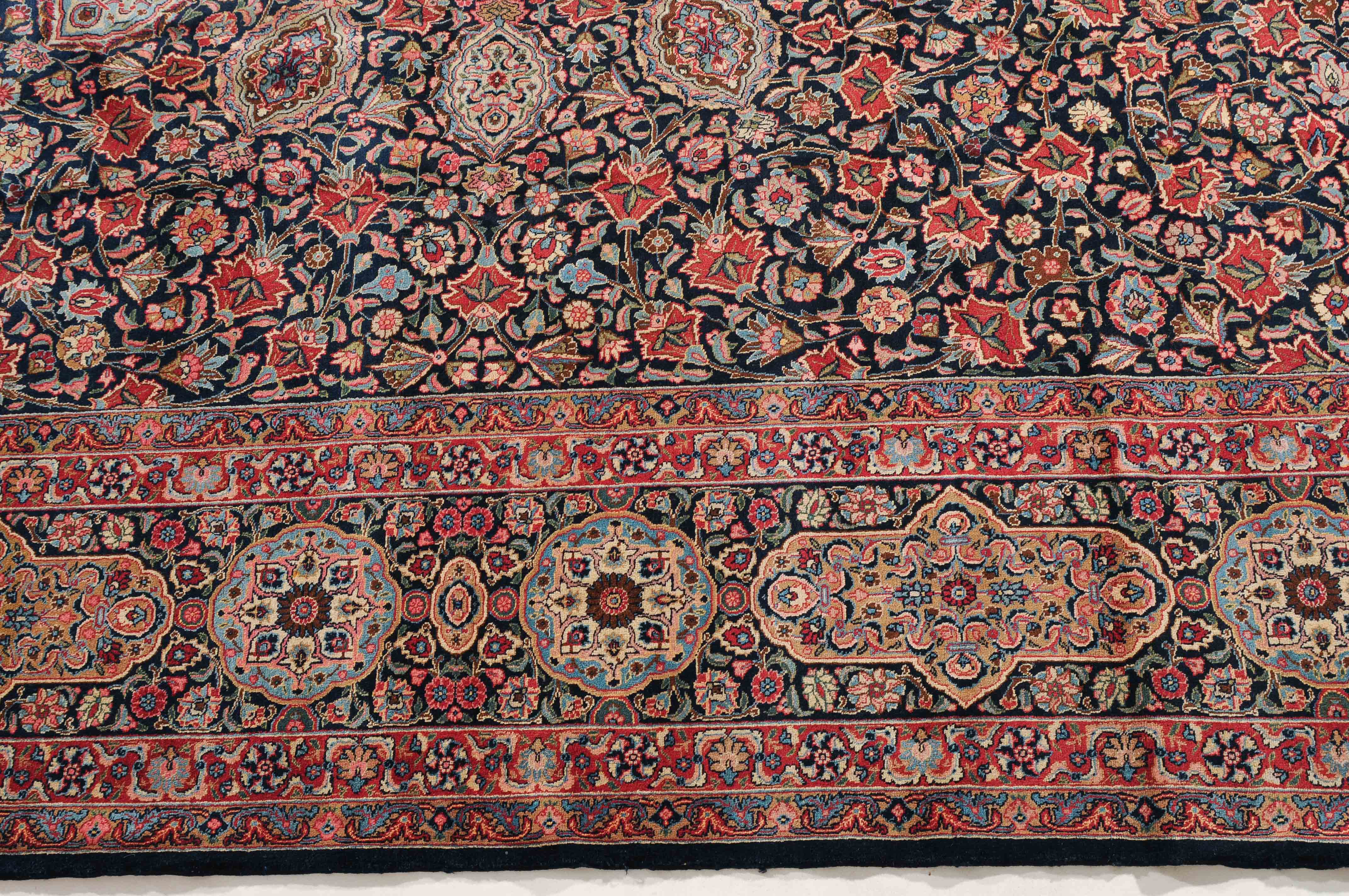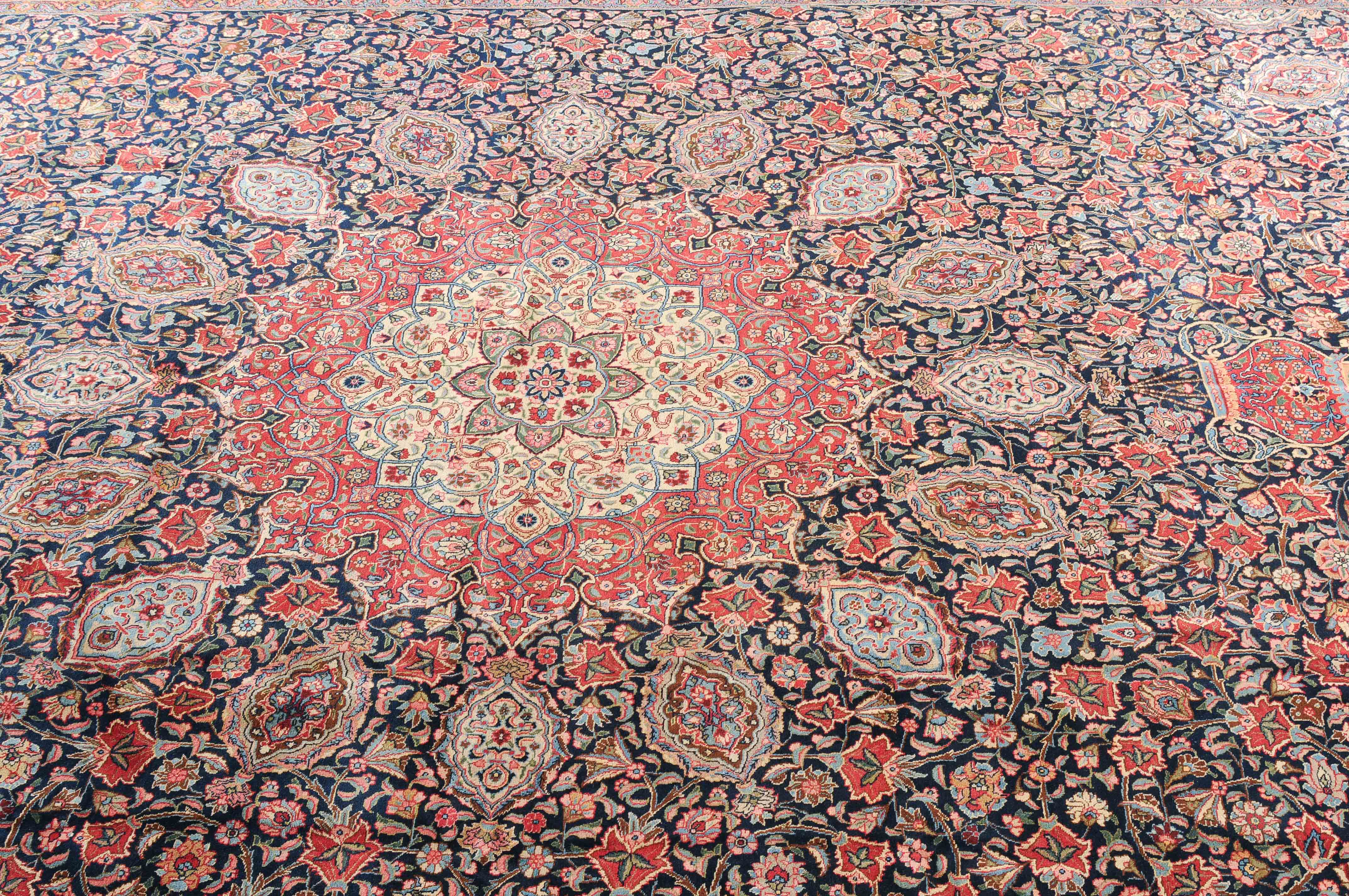 NW-Persien, um 1910. Sog. "Ardebil"-Musterung. Im stilvollen nachblauen Mittelfeld thront ein kunstvoll gestaltetes 16-Pass-Rundmedaillon mit 2 Ampelanhängern, flankiert von einem in unendlichem Rapport angelegten dichten floralen Dekor sowie 4 Eckzwickeln, die je mit einem Viertel des Medaillons belegt sind. 2 elegante Nebenbordüren umlaufen die ebenfalls nachtblaue, mit Kartuschen und Blütenmedaillons auf dekorative Weise geschmückte Hauptbordüre. Sehr gute Erhaltung. 395x644 cm (ft. 13x21.2).