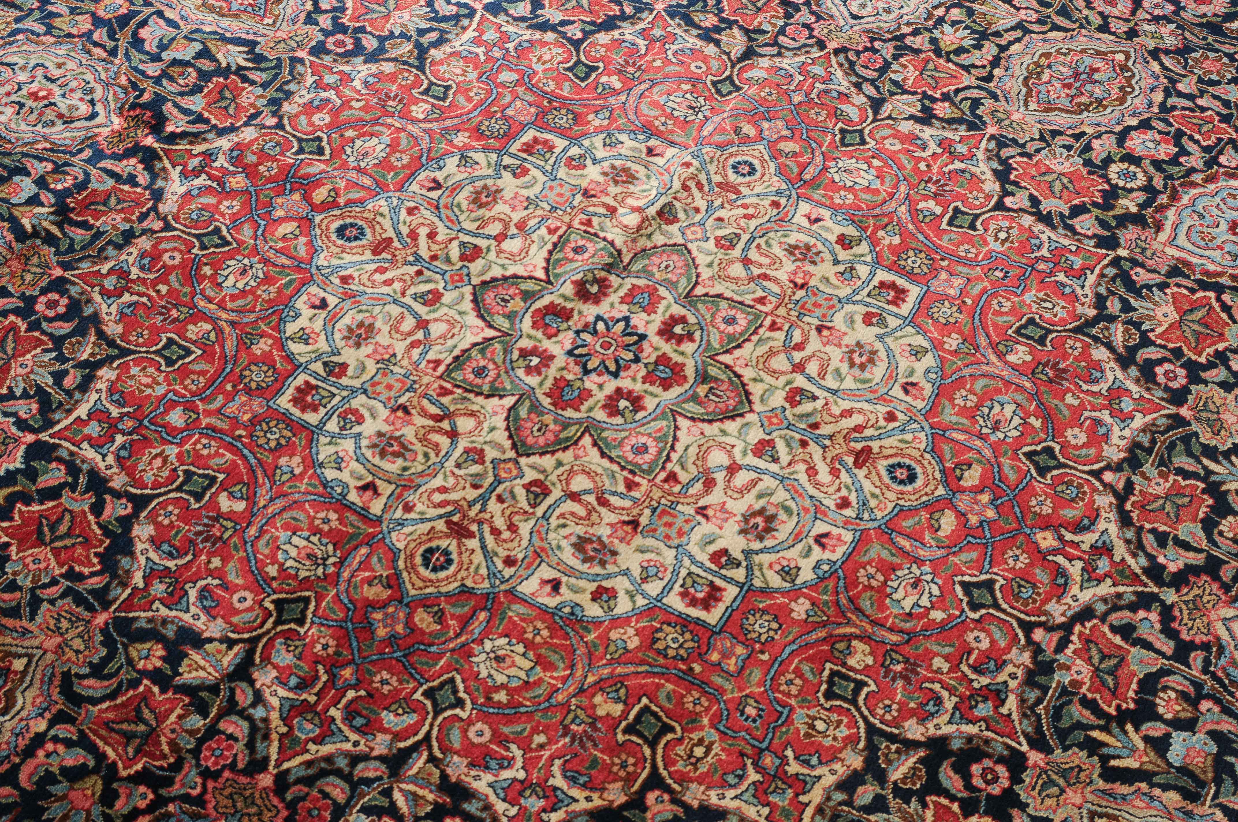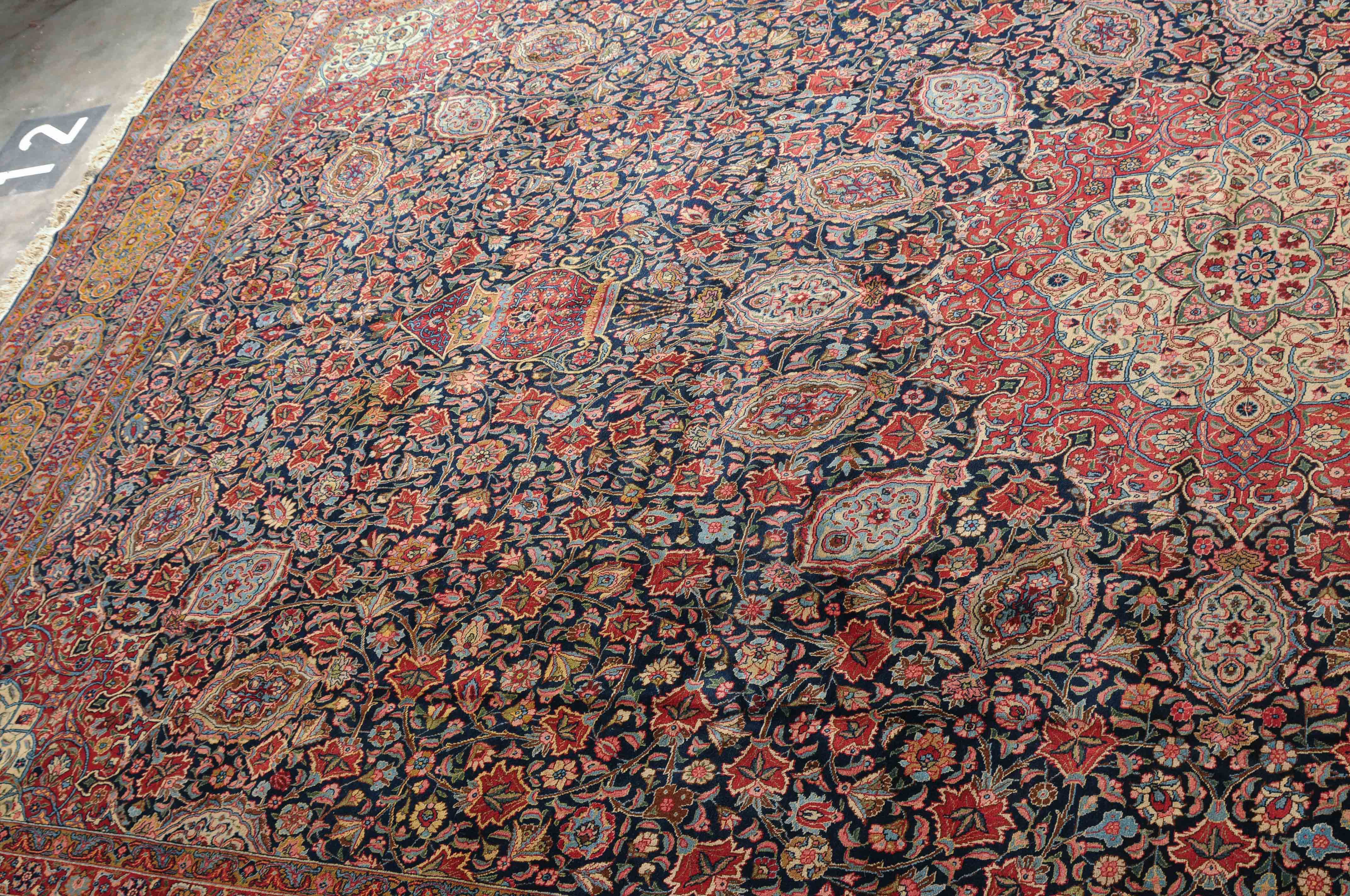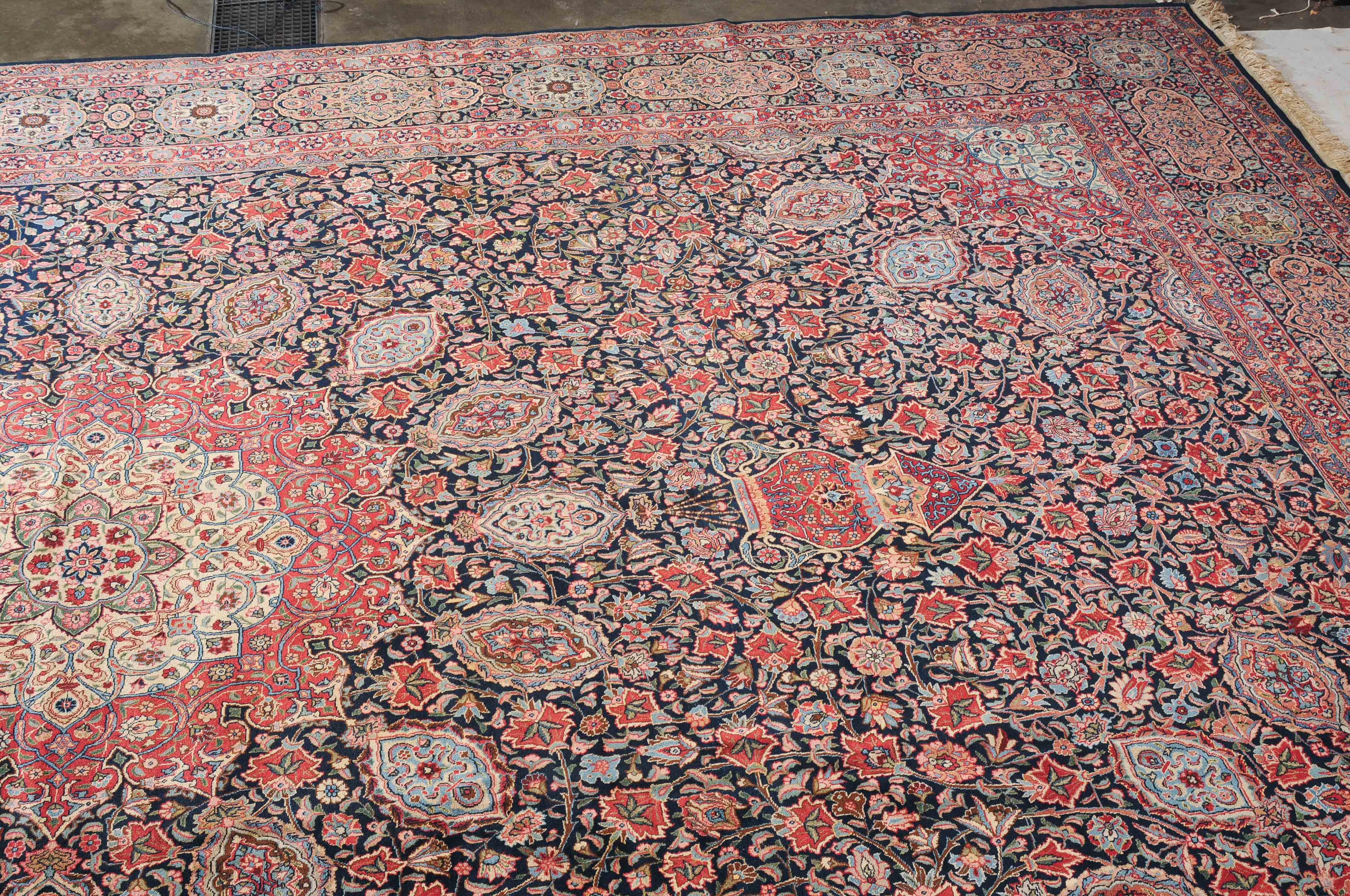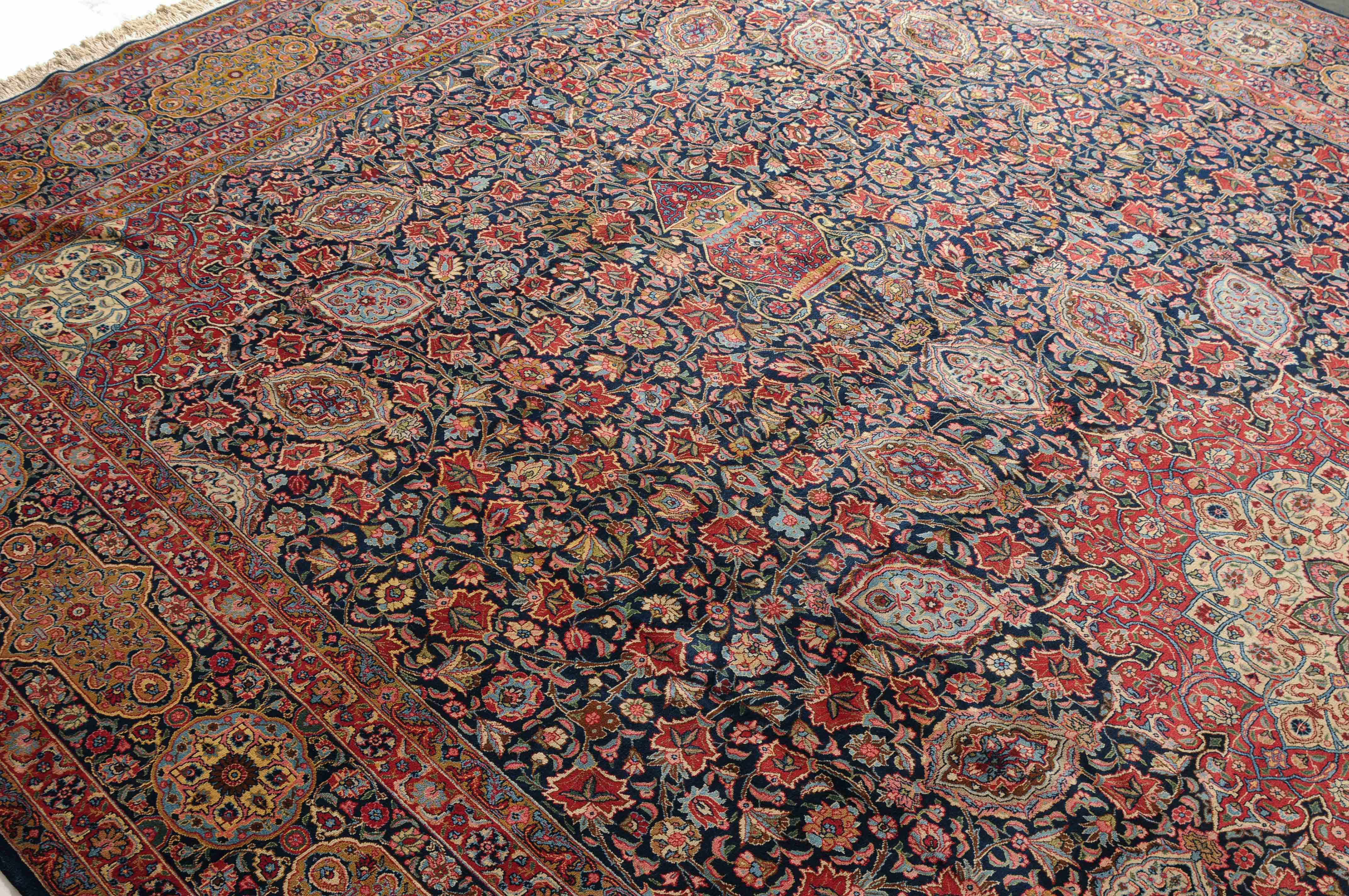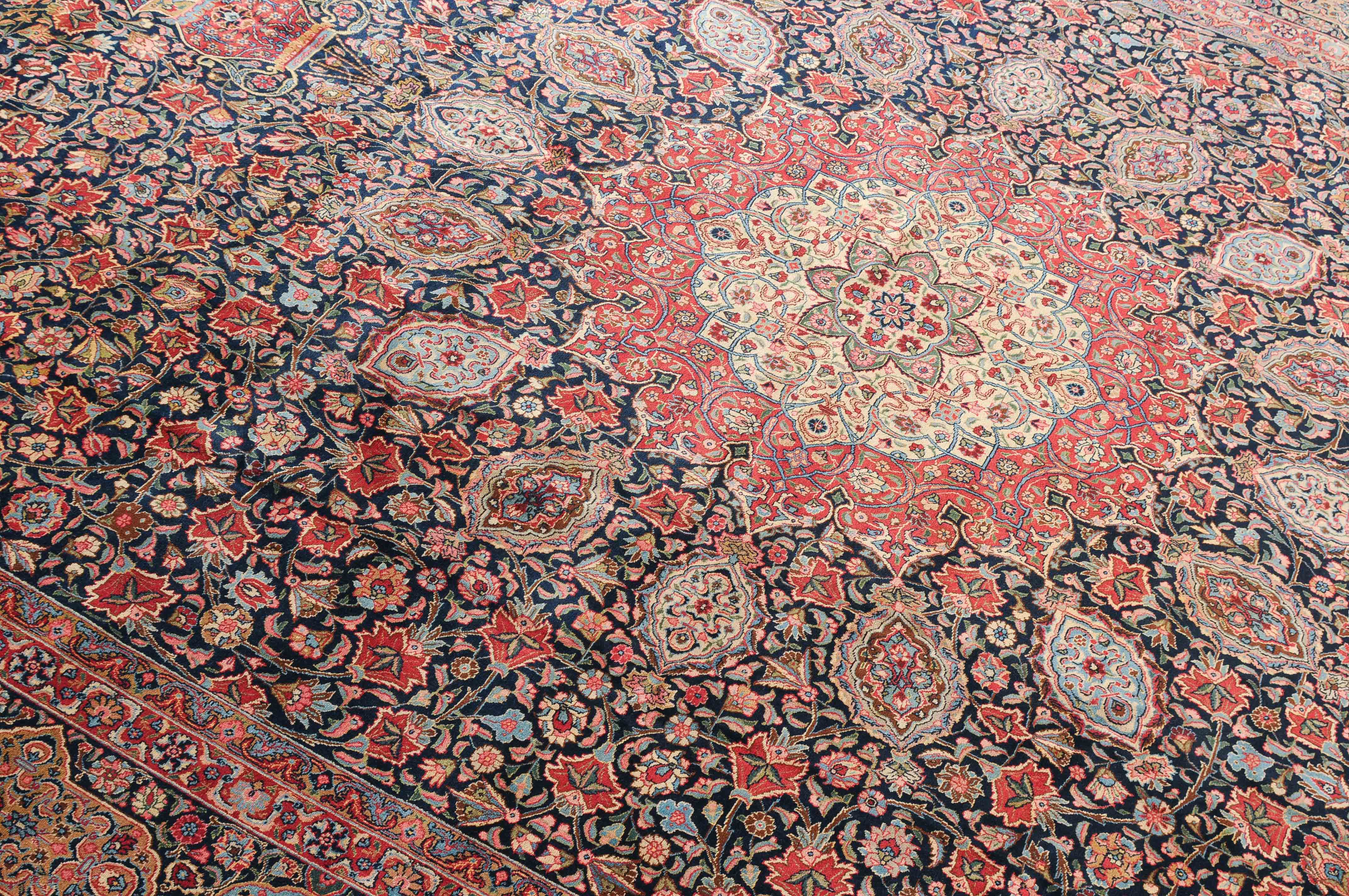 NW-Persien, um 1910. Sog. "Ardebil"-Musterung. Im stilvollen nachblauen Mittelfeld thront ein kunstvoll gestaltetes 16-Pass-Rundmedaillon mit 2 Ampelanhängern, flankiert von einem in unendlichem Rapport angelegten dichten floralen Dekor sowie 4 Eckzwickeln, die je mit einem Viertel des Medaillons belegt sind. 2 elegante Nebenbordüren umlaufen die ebenfalls nachtblaue, mit Kartuschen und Blütenmedaillons auf dekorative Weise geschmückte Hauptbordüre. Sehr gute Erhaltung. 395x644 cm (ft. 13x21.2).