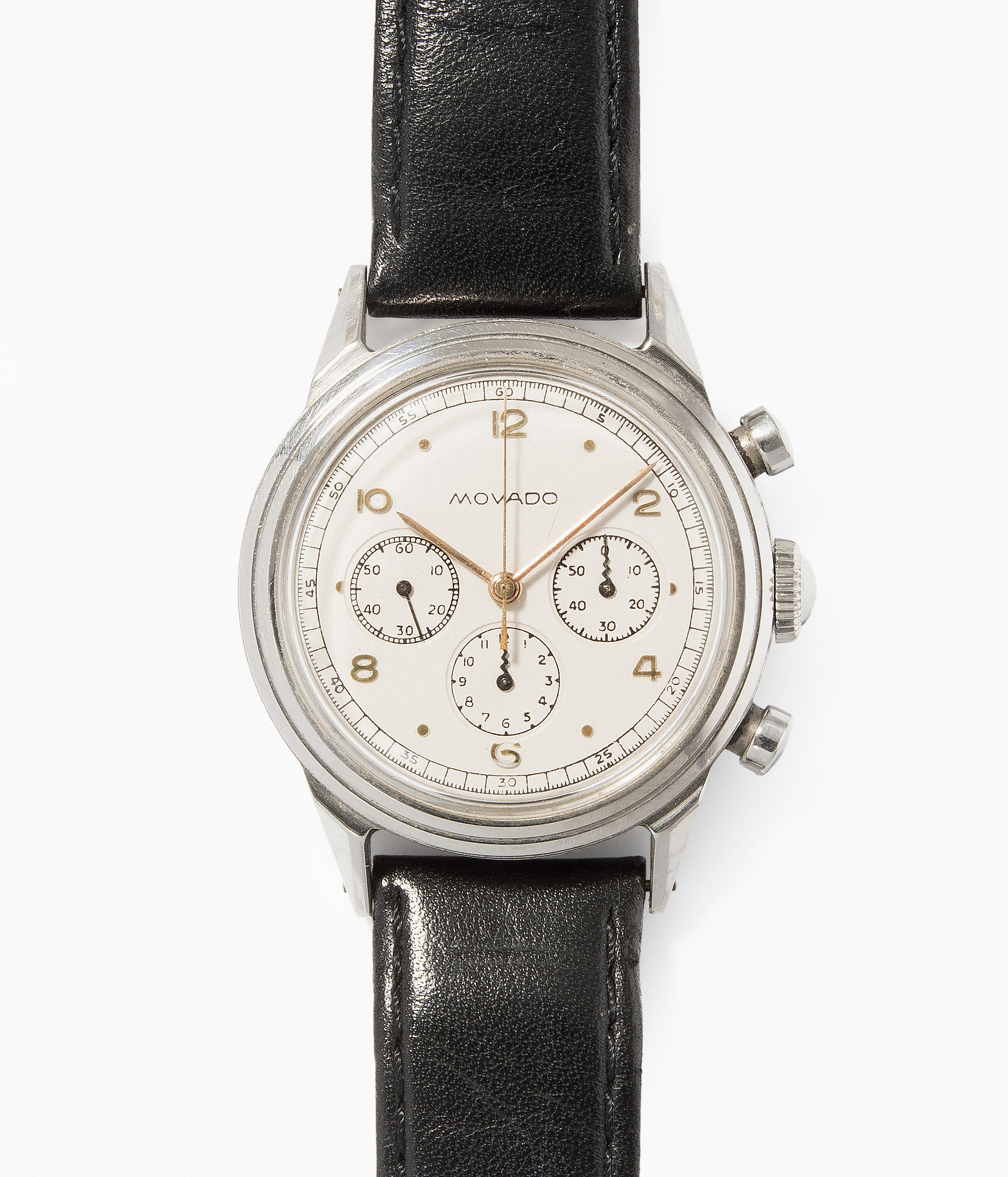 Ref. 19038. Edelstahl Gehäuse Nr. 104428, 34 mm, Schraubboden. Handaufzug Cal. 90. Beigefarbenes Zifferblatt mit teils arabischen Zahlen und Punkten, goldfarbenen Zeigern, drei guillochierte Totalisatoren, zwei davon mit Schlangenzeigern. Schwarzes Lederband mit Dornschliesse. Werk, Zifferblatt und Gehäuseboden signiert. Funktionstüchtig.