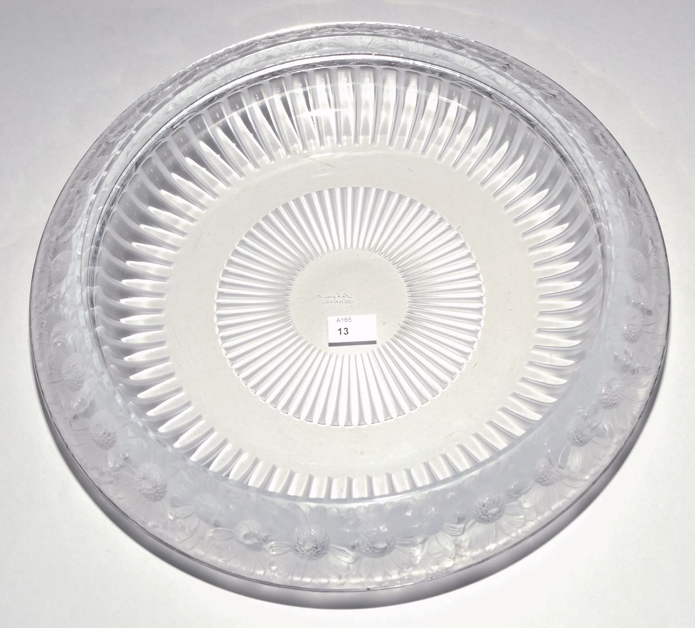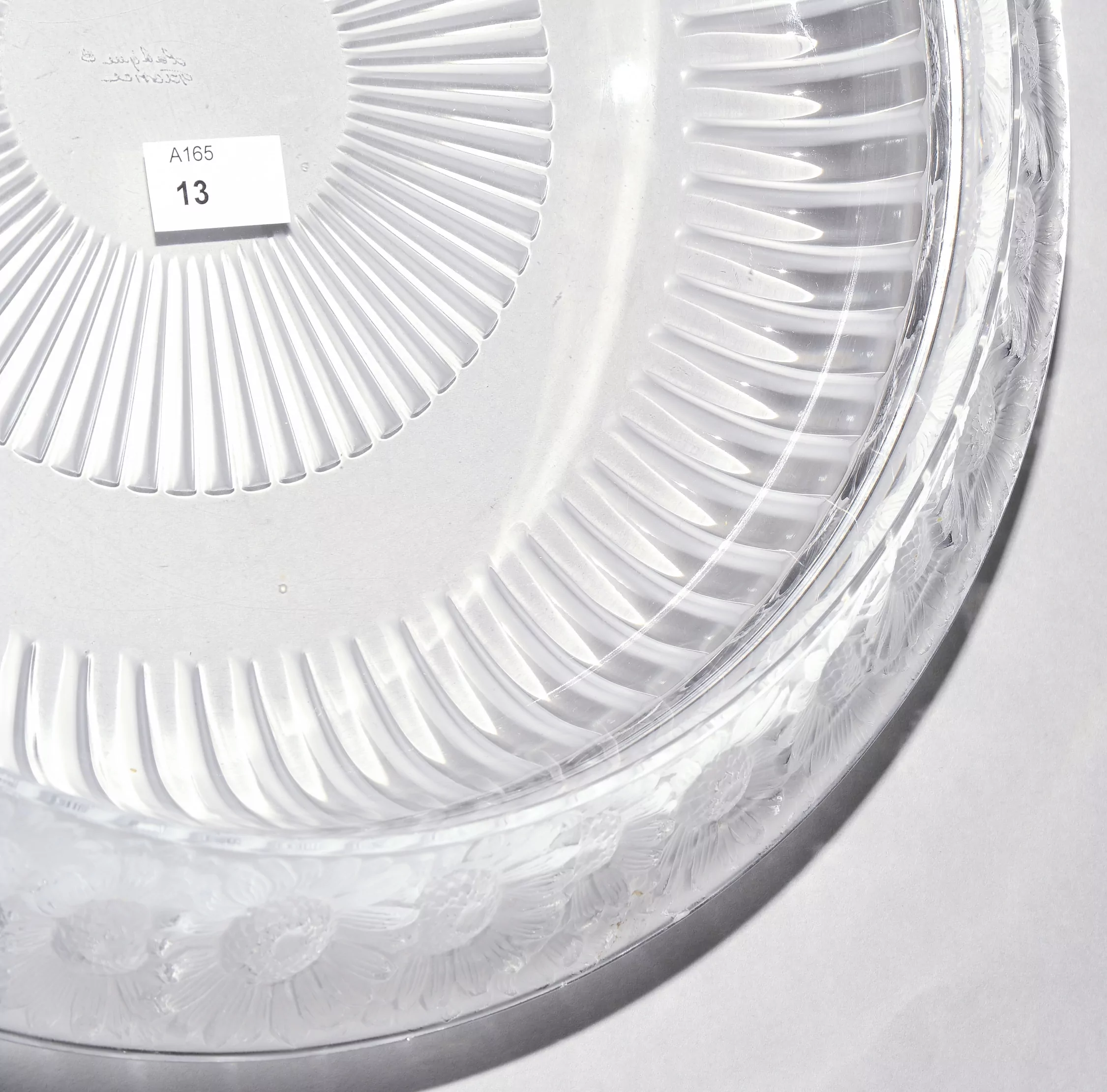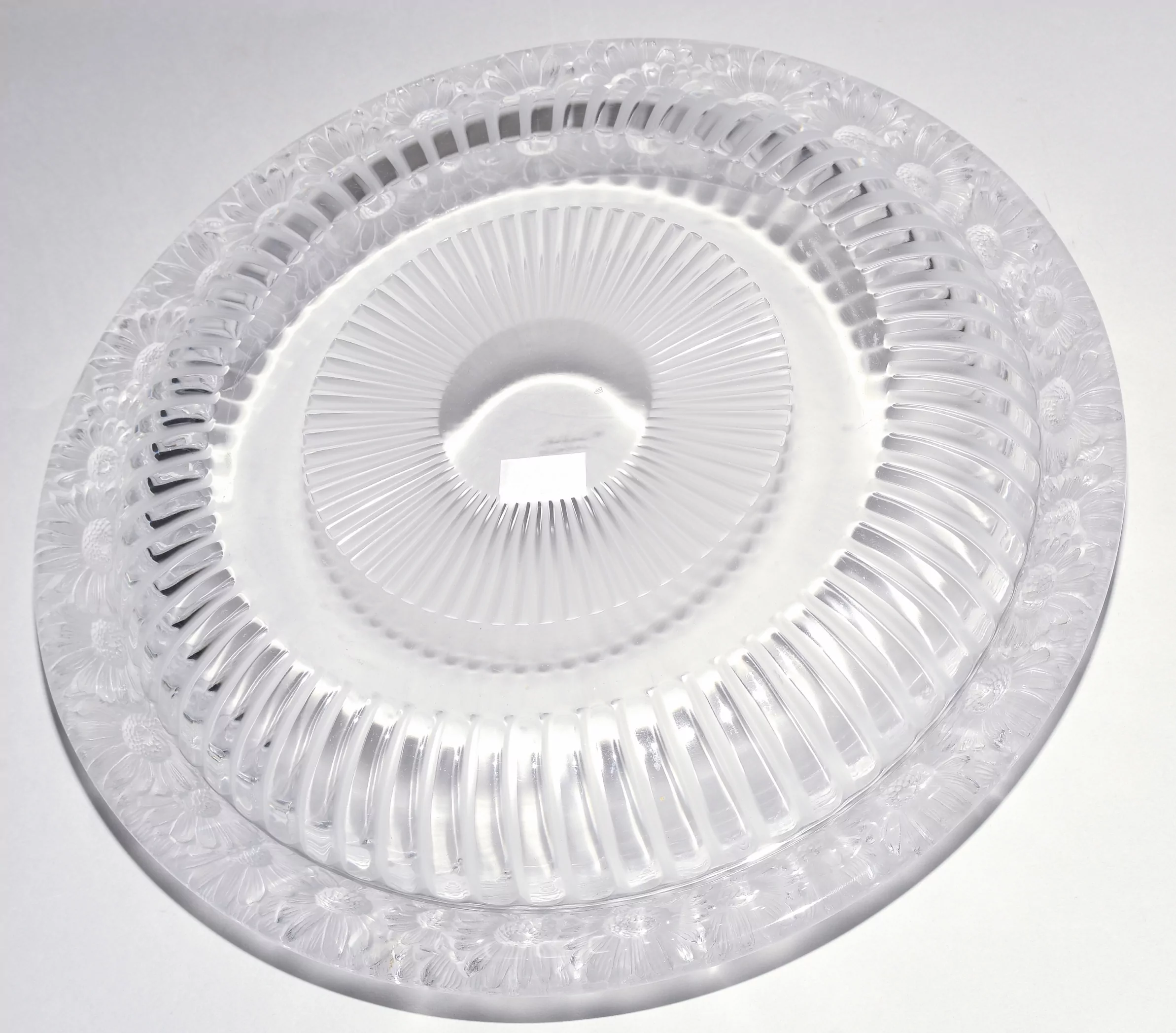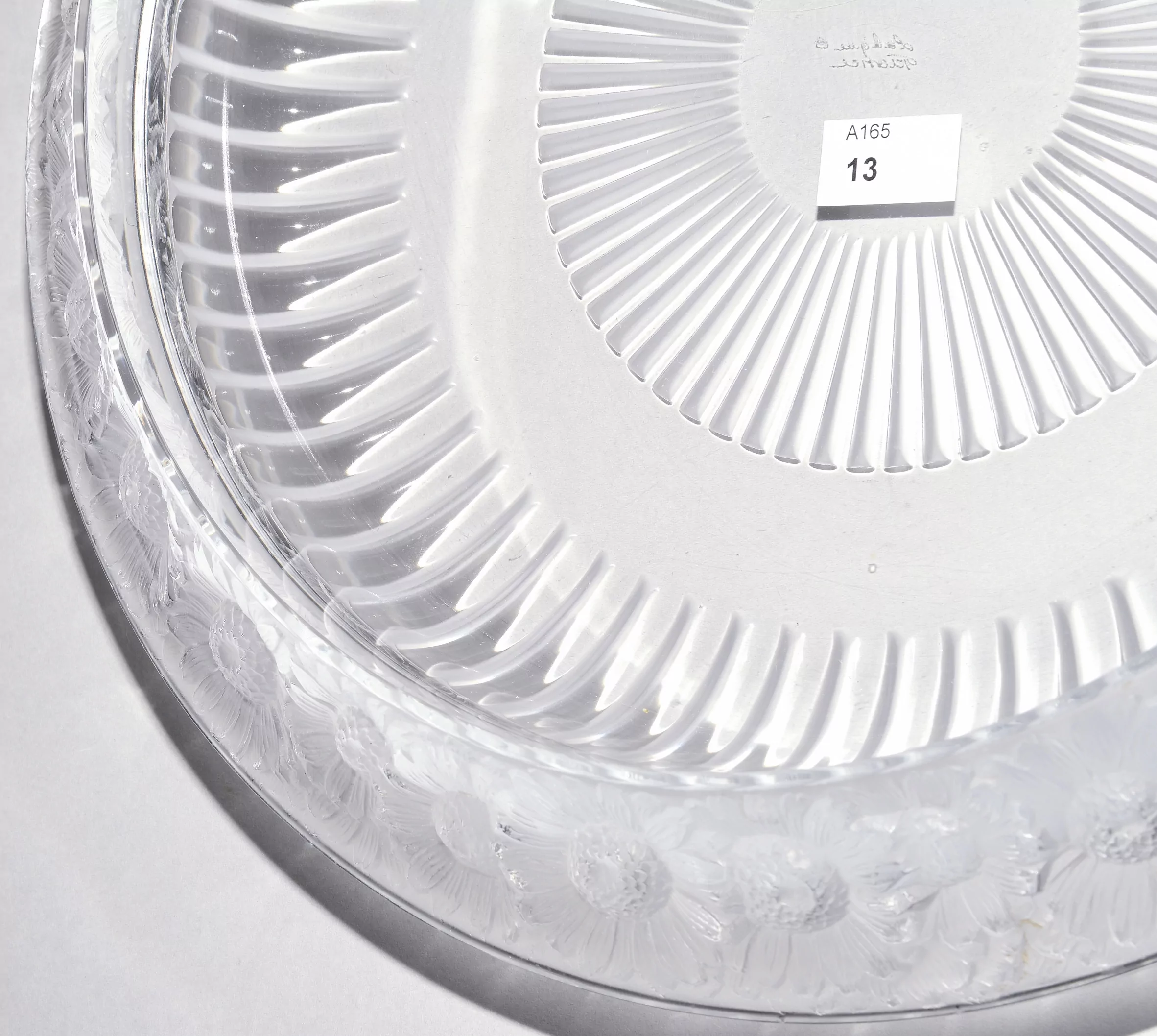 Nach 1945. Farbloses, tlw. mattiertes Glas. Modell von René Lalique, 1933. Dekor mit Margeritenblüten. D 35 cm.