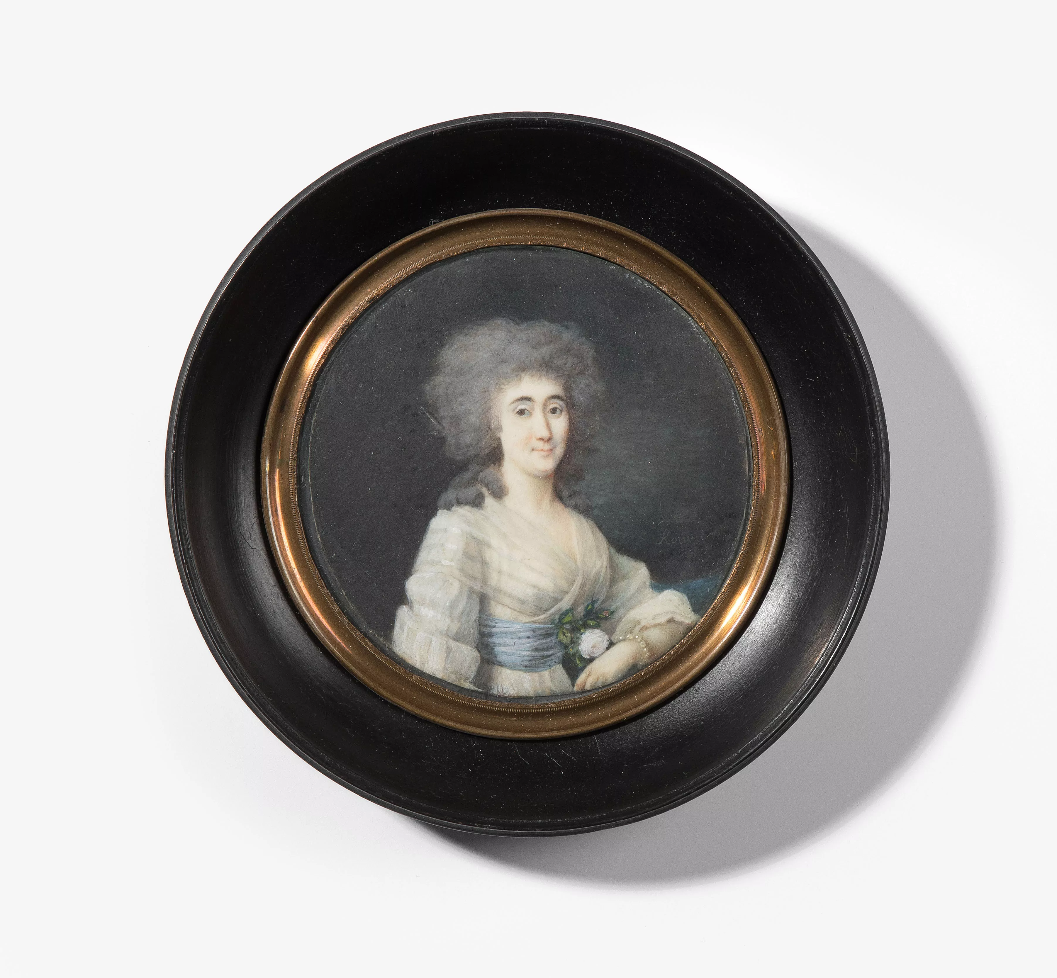 Frankreich, Ende 18.Jh. Gouachemalerei auf Elfenbein, rund. Rechts bez.: Rouvier (Rouvier Pierre ?). Dame mit üppiger Puderfrisur, in weissem Kleid mit blauem Band. Gerahmt. D 7 cm.