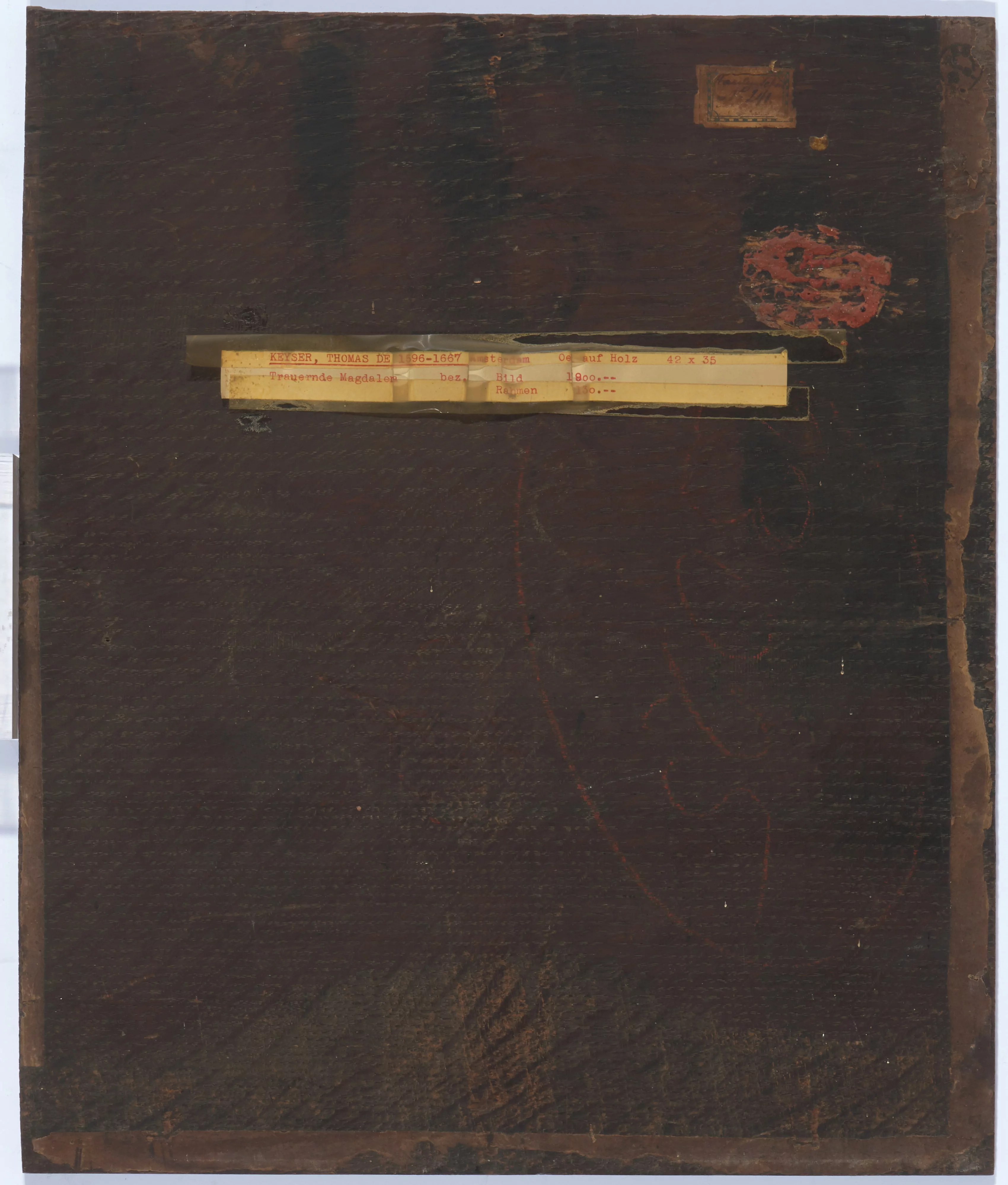 Dieses schöne Kabinettgemälde der büssenden Maria Magdalena wurde zuletzt im November 1950 auf einer Auktion bei Fischer in Luzern gesehen und war seitdem nur durch eine alte Fotografie bekannt. Auf dieser Grundlage hatte Ann Jensen Adams dieses Gemälde als authentisches Werk in ihre Dissertation von 1985 aufgenommen. Nun hat sie in einer E-Mail die Echtheit des Gemäldes anhand einer hochaufgelösten digitalen Fotografie bestätigt.