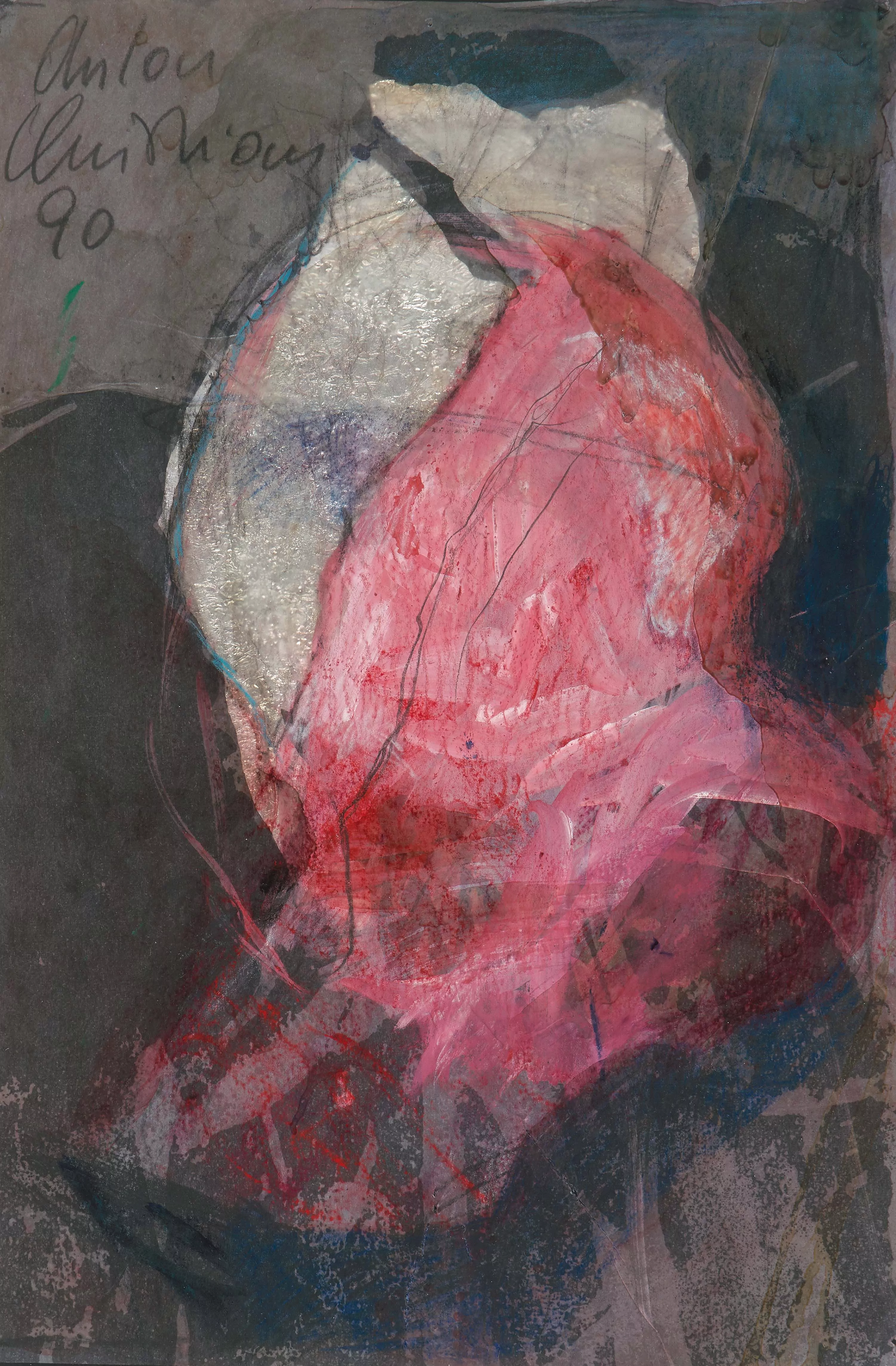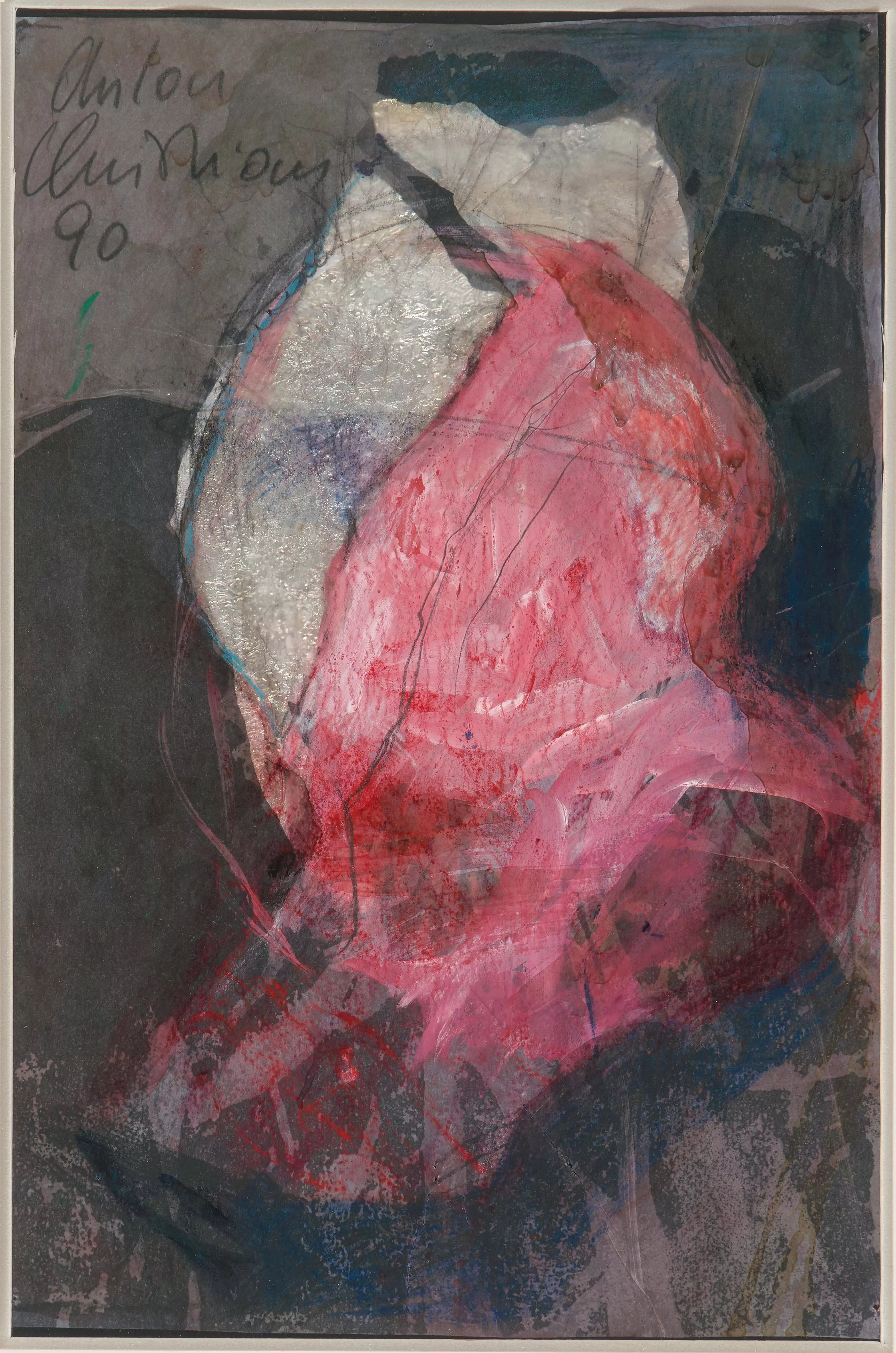 Ohne Titel. 1990. Mischtechnik auf Pergamentpapier mit Aluminium unterlegt auf schwarzem Untergrund. Oben rechts in Bleistift signiert und datiert. Lichtmass 33,5x21,5 cm. Gerahmt.