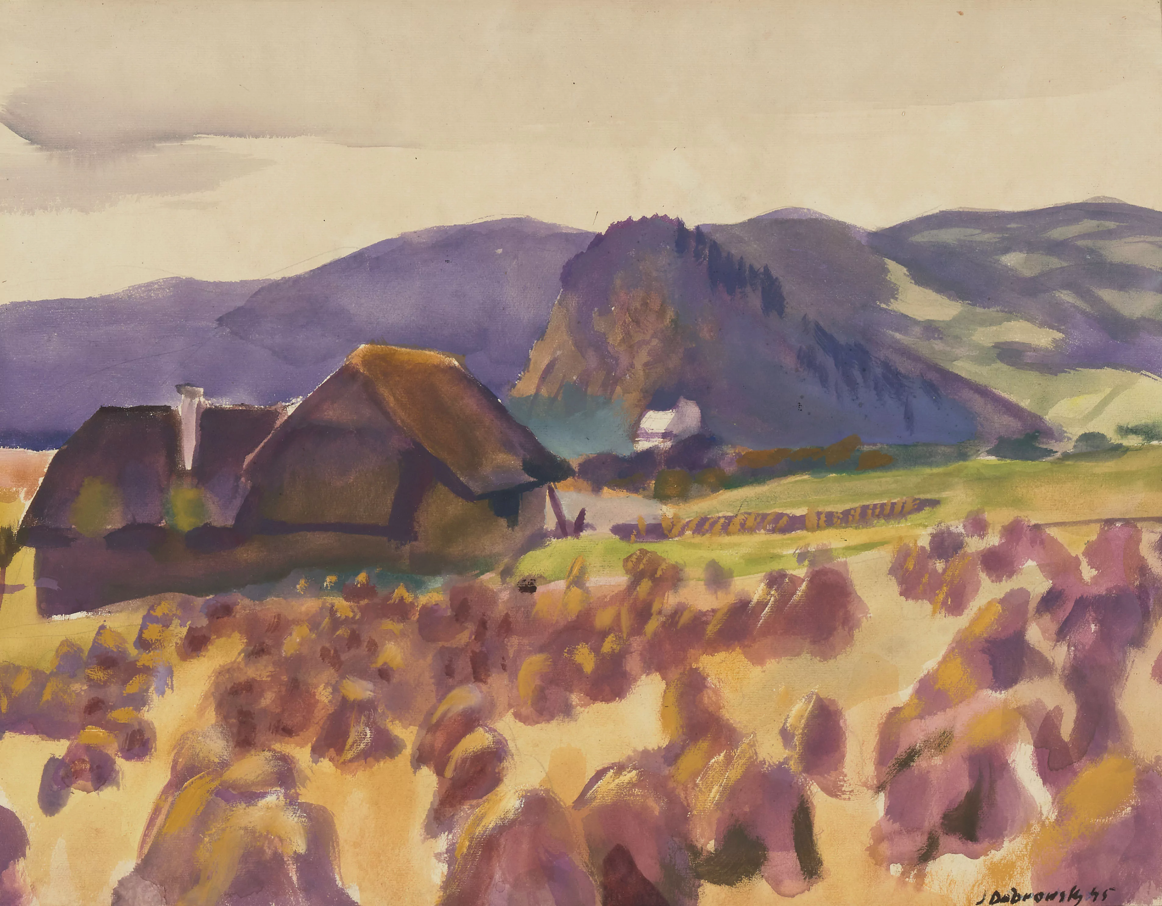 Landschaft. 1945. Aquarell und Bleistift auf Papier. Unten rechts in Tusche signiert. Blattgrösse 47,8x61,1 cm. Gerahmt.