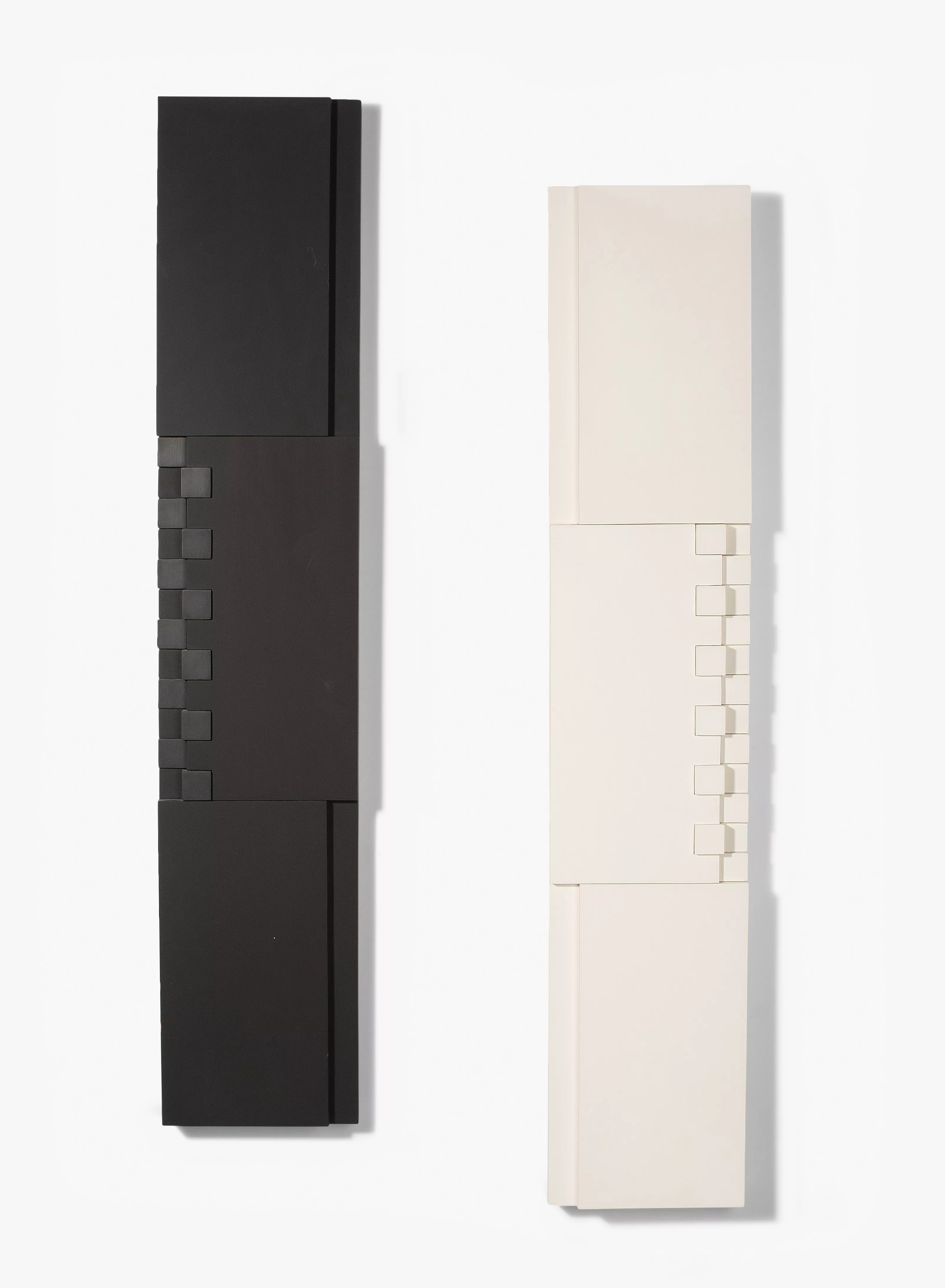 Ohne Titel. 2002. Lot zwei Reliefs, schwarz und weiss bemalt. Auf dem schwarzen hinten mit Etikett bezeichnet: "Helga Spieker" und datiert. Je 93x18,5x5 cm.