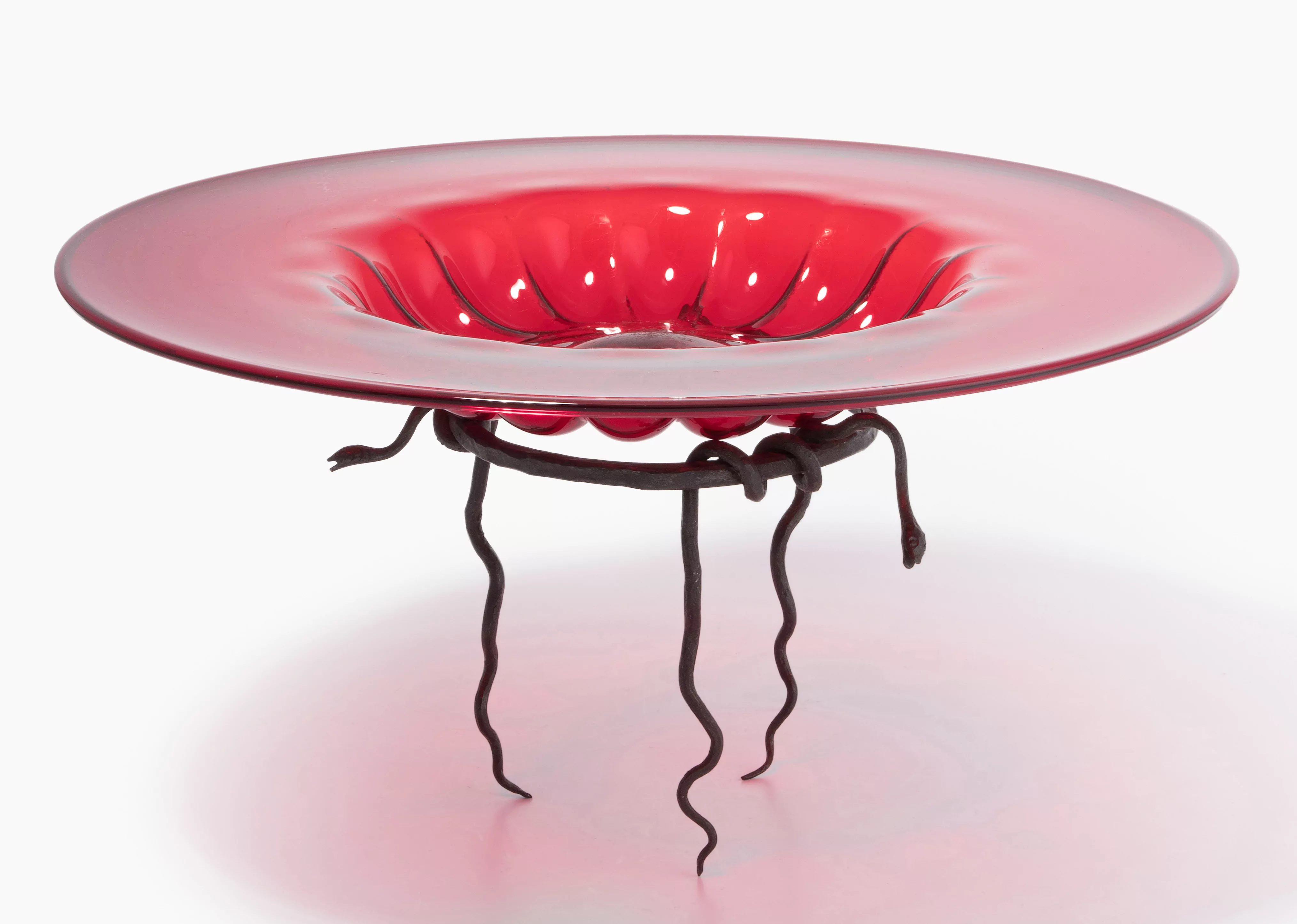 Entwurf um 1930 für Venini, Murano. Rot getöntes Glas, in die Form geblasen. Unbezeichnet. D 38 cm. Schmiedeeisenfuss, wohl von Umberto Bellototo. H 15 cm.