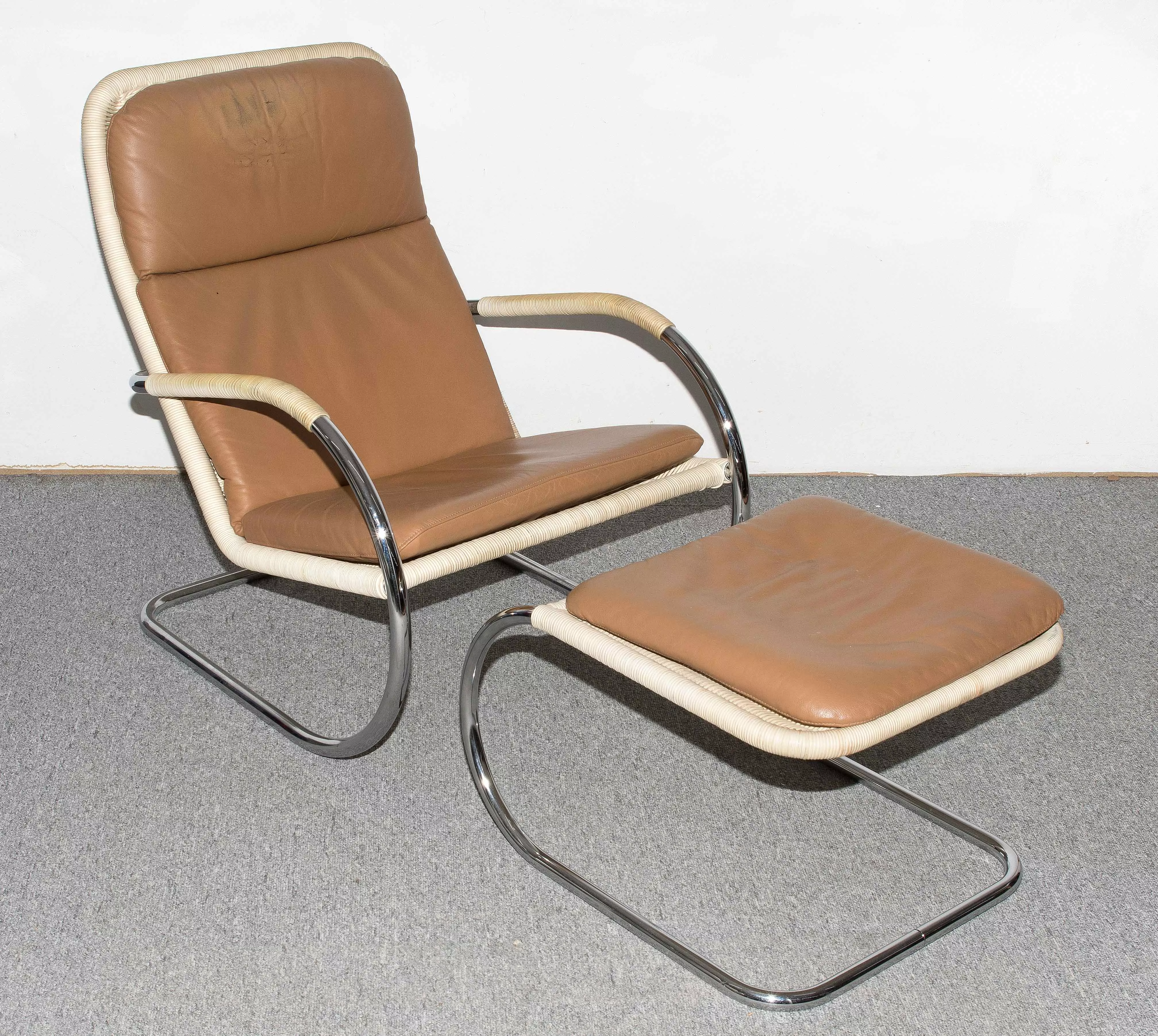 Entwurf von 1932. Lizenzierte Reedition von Tecta, nach 1987. Verchromtes Stahlrohrgestell mit Rohrgeflecht. Sitzkissen mit beigem Lederbezug. 68x85x88 cm, 54x63x41 cm (Ottoman).