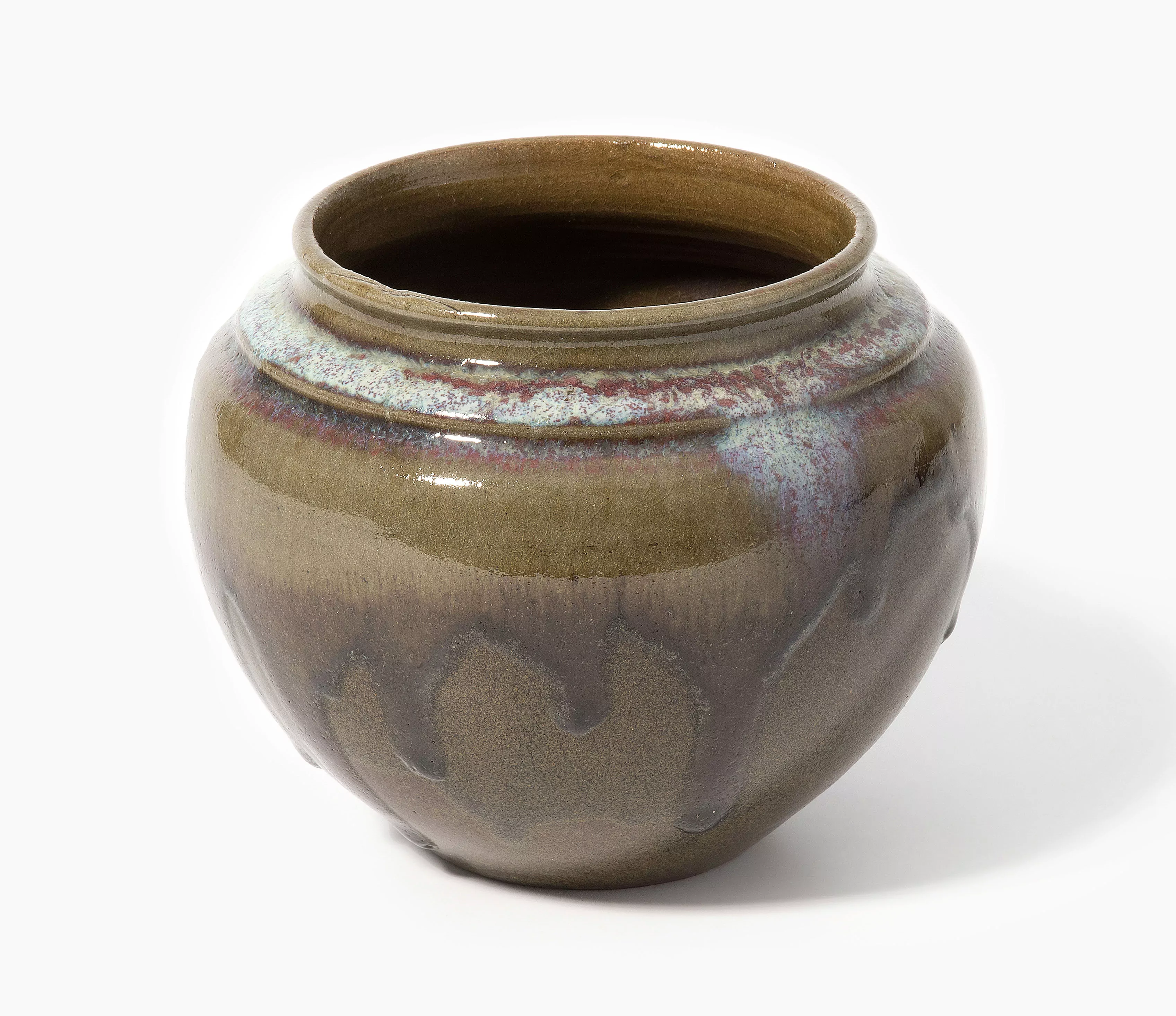 Armentières, um 1894. Steinzeug. Runde, geprägte Künstlersignatur "AUGUSTE DELAHERCHE", Prägenummer 7097. Bauchige Rundform mit mehrfarbiger Laufglasur. H 11 cm.