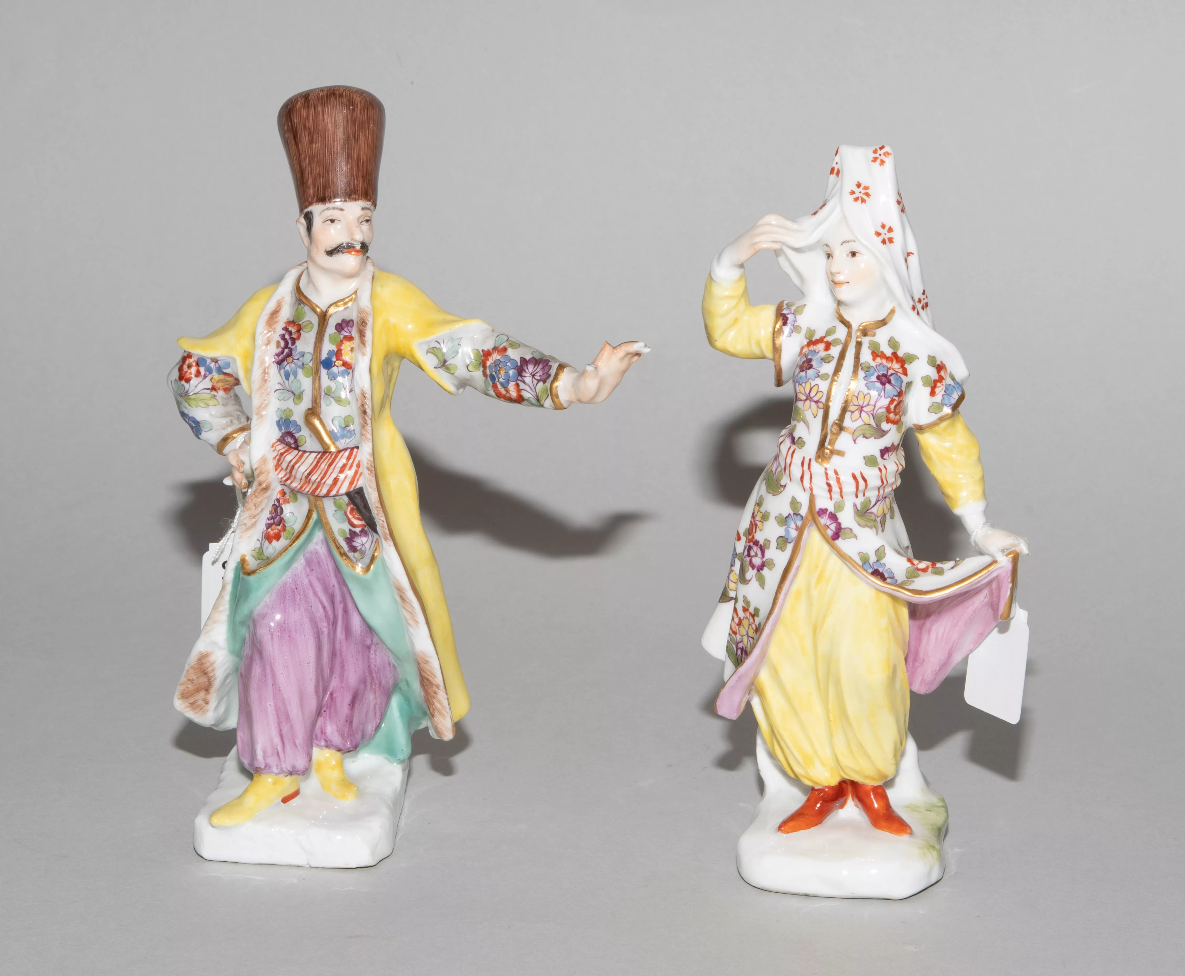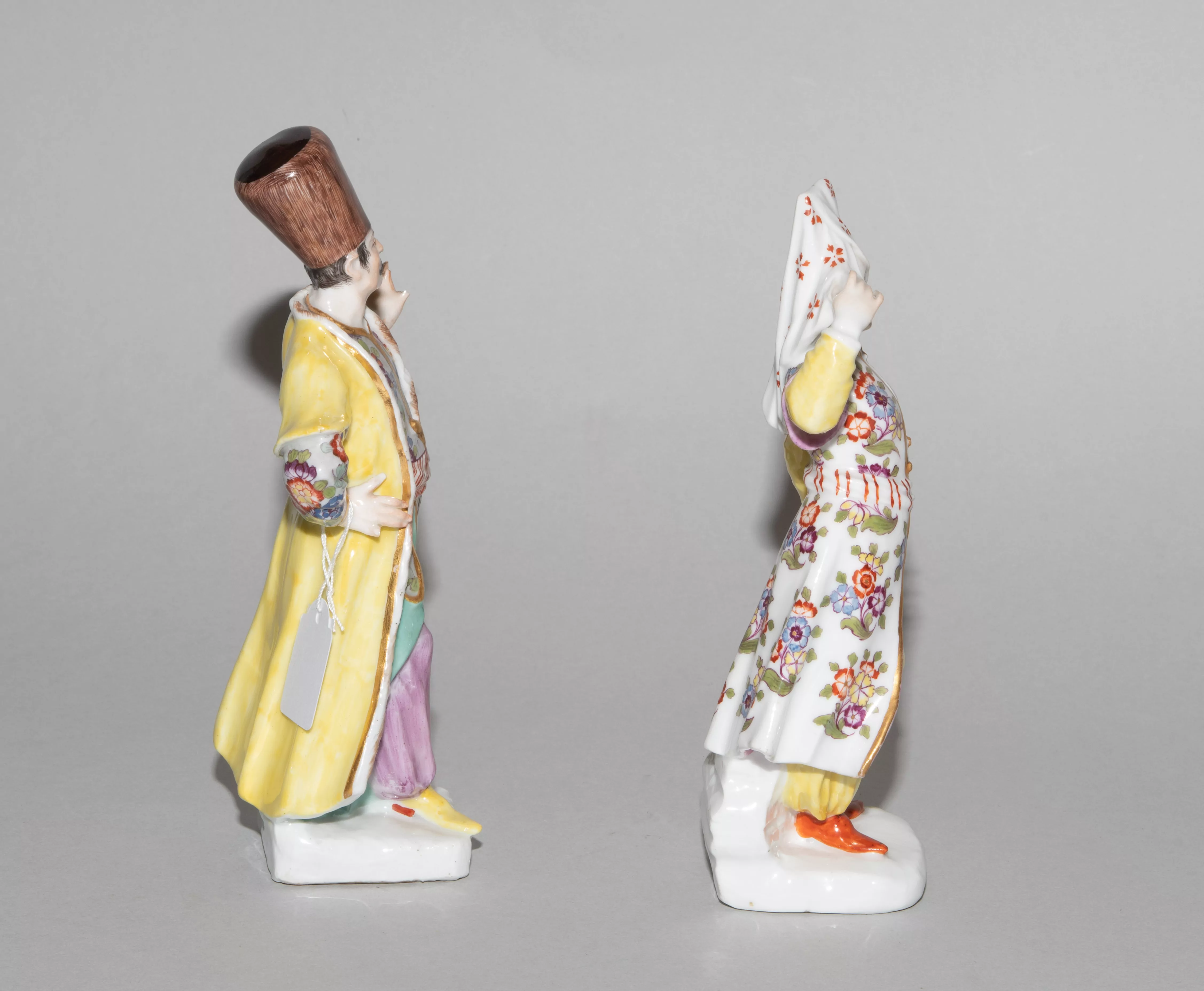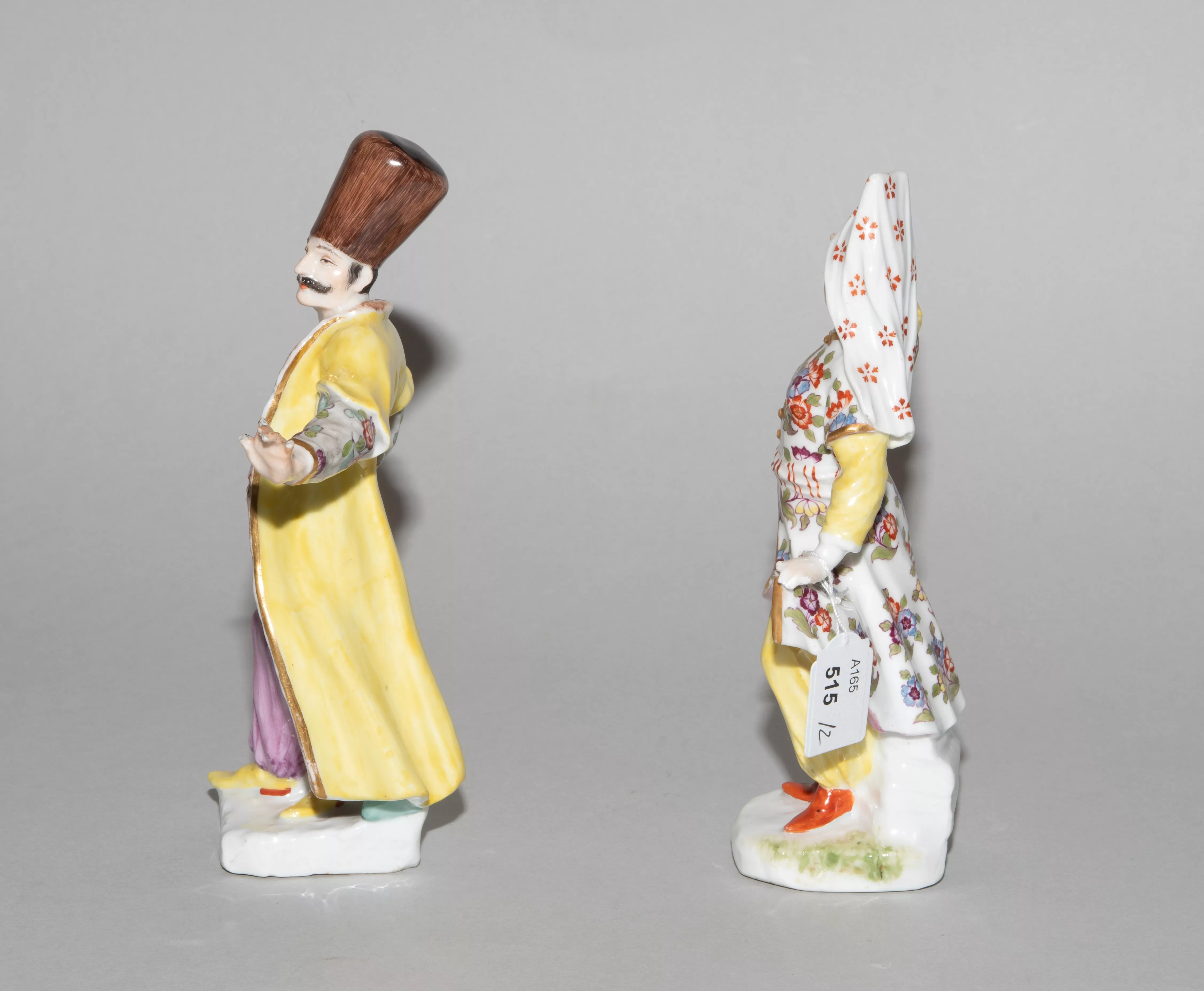 Mitte 18.Jh. Ohne Marken. Porzellan. Farbige Bemalung, tlw. vergoldet. Auf Terrainsockel stehende Figuren "Türke" (nach dem Modell von Peter Reinicke) bzw. "Türkin" (nach dem Modell von Johann Joachim Kaendler). H 16,5 cm bzw. H 16 cm.