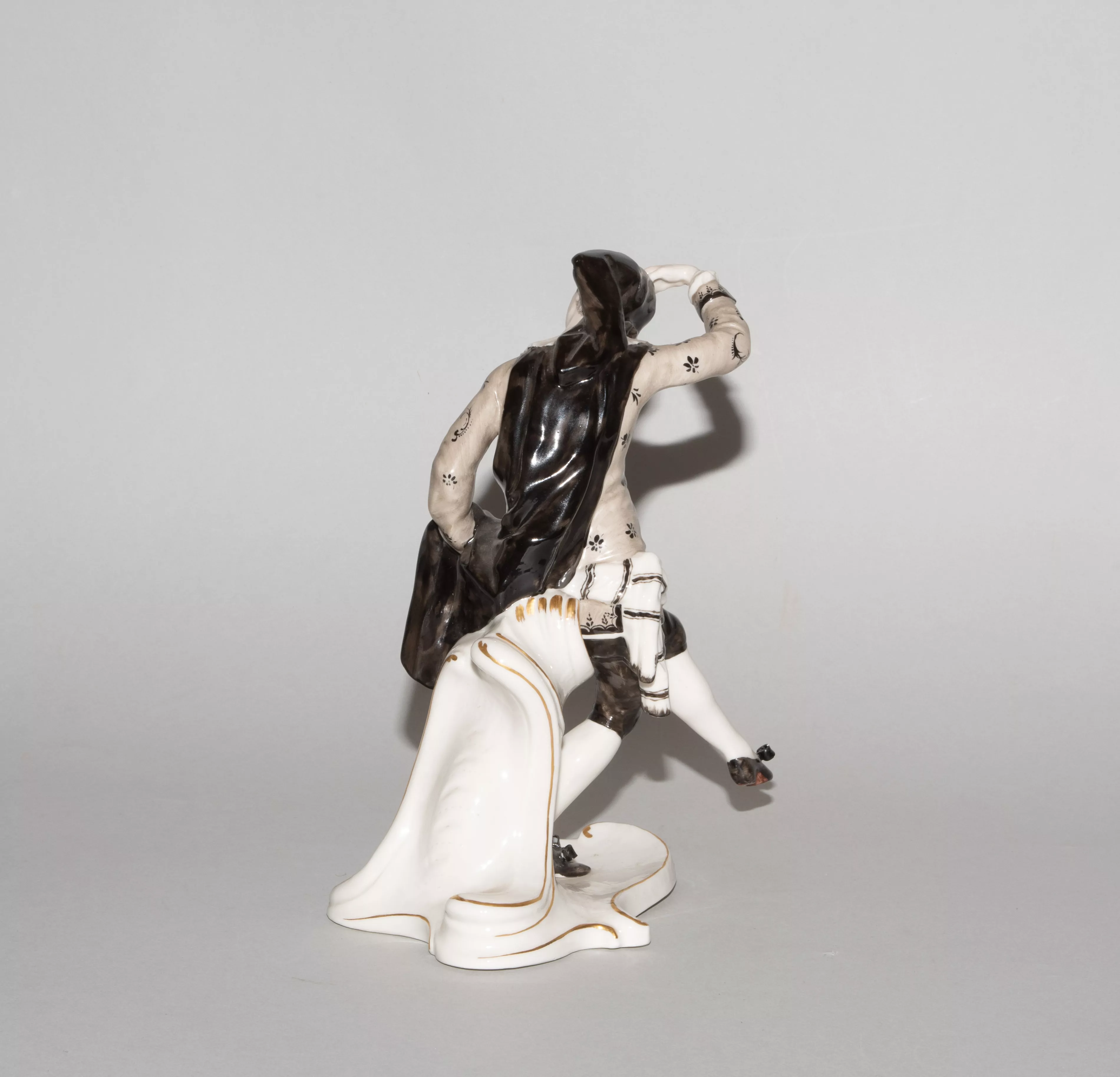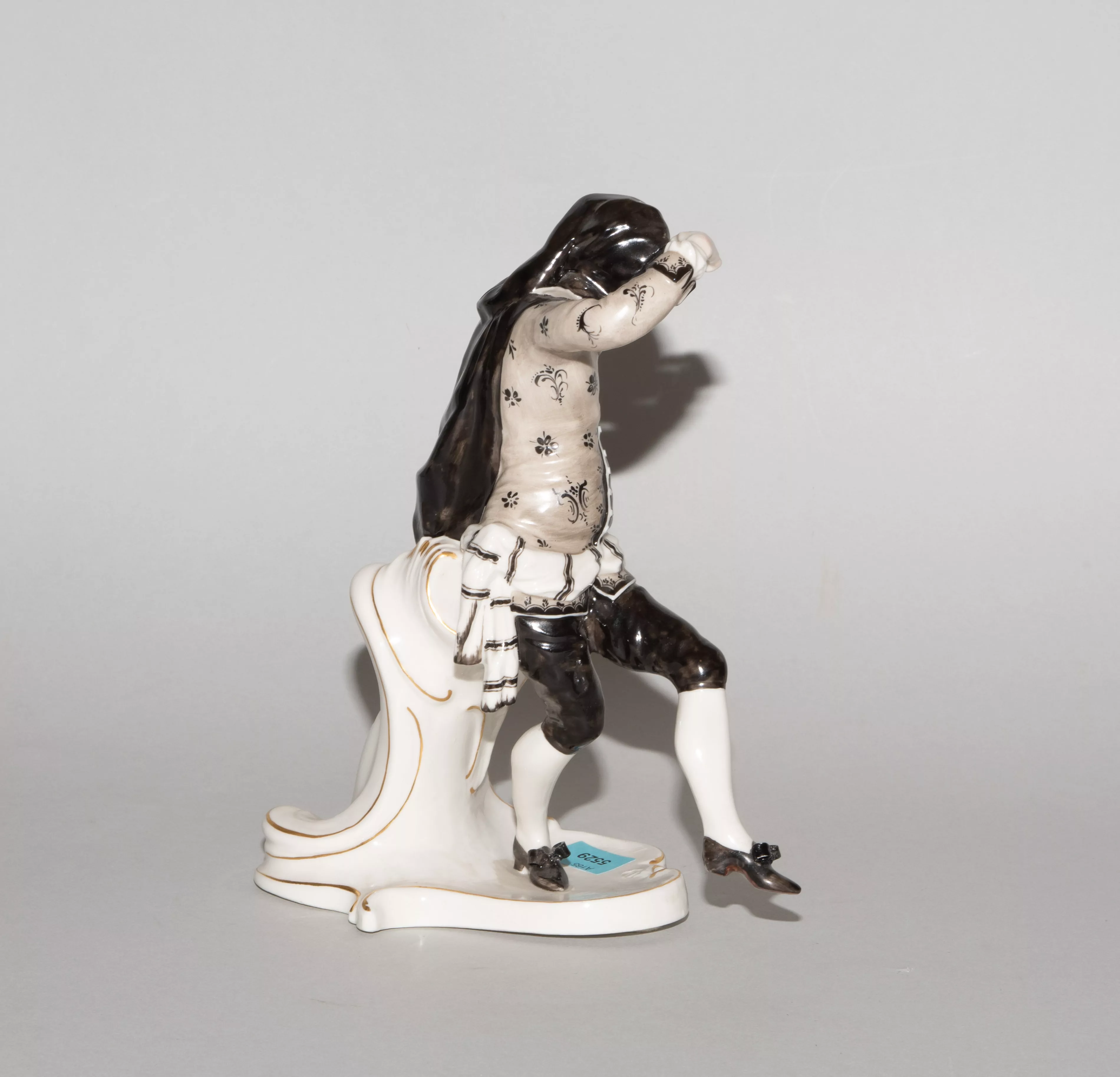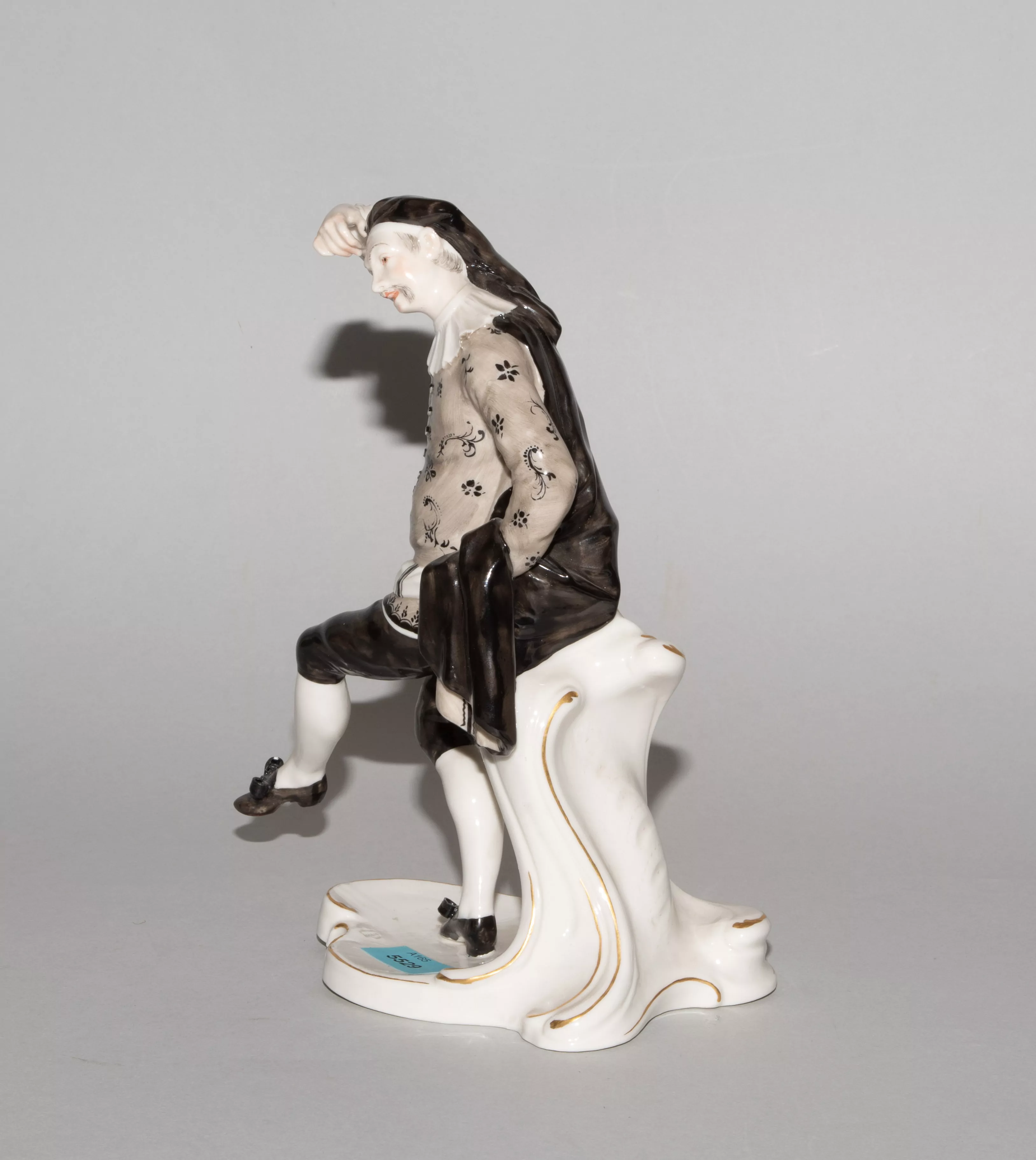20.Jh. Porzellan. Polychrome Bemalung. Goldstaffierung. Modell Franz Anton Bustelli. Aus der Serie "Commedia dell'Arte". Scaramuz. H 21 cm.