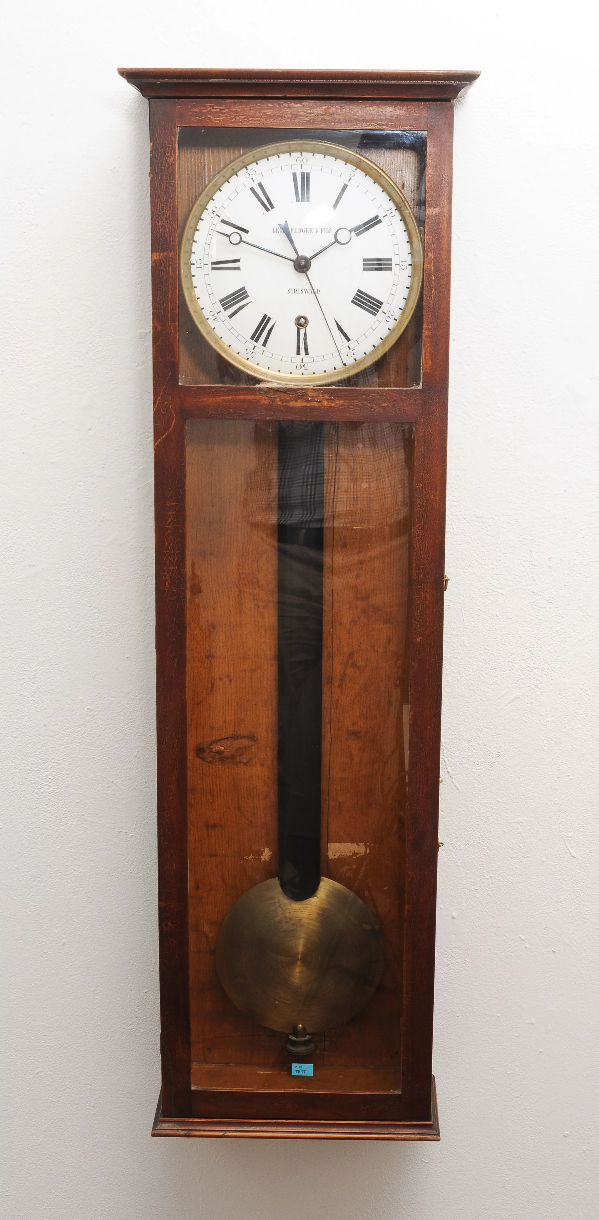 Um 1880. Auf dem Zifferblatt signiert "Leuenberger & Fils, Sumiswald". Gehäuse aus braun lackiertem Weichholz. Verglaste Fronttüre. Emailzifferblatt mit römischen Stunden- und arabischen Minutenzahlen. Gebläute Stahlzeiger. Zentrale, springende Sekunde. Messinglünette. Meter-Sekundenpendel. Pendelstange aus ebonisiertem, feinjährigem Tannenholz. Messing-Pendellinse. Messingwerk mit Schlüsselaufzug. Gangfähig. Schlüssel vorhanden. H 121 cm.