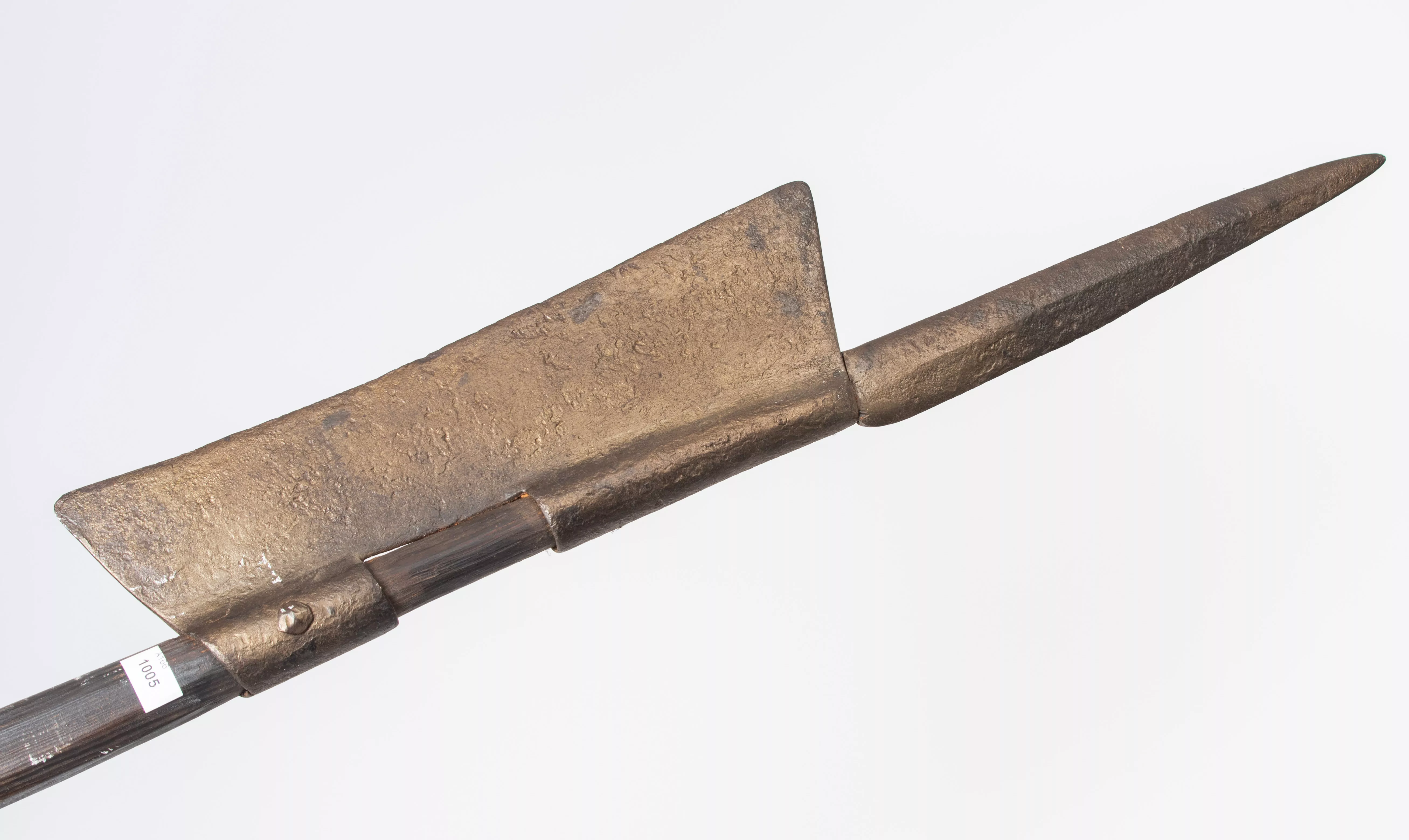 Schweiz / Süddeutschland, im Stil des 15. Jh. Gefertigt durch Atelier Ernst Schmidt (?), München. Oberfläche eines gut erhaltenen Boden- oder Gewässerfundes. Eisen (L 60 cm) mit zweischneidiger Blattspitze mit Mittelgrat und hochrechteckigem Axtblatt. Diese Spitze ist in das konische Ende der oberen Schafttülle eingenietet. Die Schneide verläuft leicht konkav. Zwei Schafttüllen befinden sich am Rücken. Die untere ist mittels zweier Schaftnägel am Schaft befestigt. Das Axtblatt inklusive der Tüllen wurde aus einer Platte aus inhomogenem Raffinierstahl durch Umfalzen geschmiedet. Vierkantschaft mit gerundeten Kanten. L 208 cm.