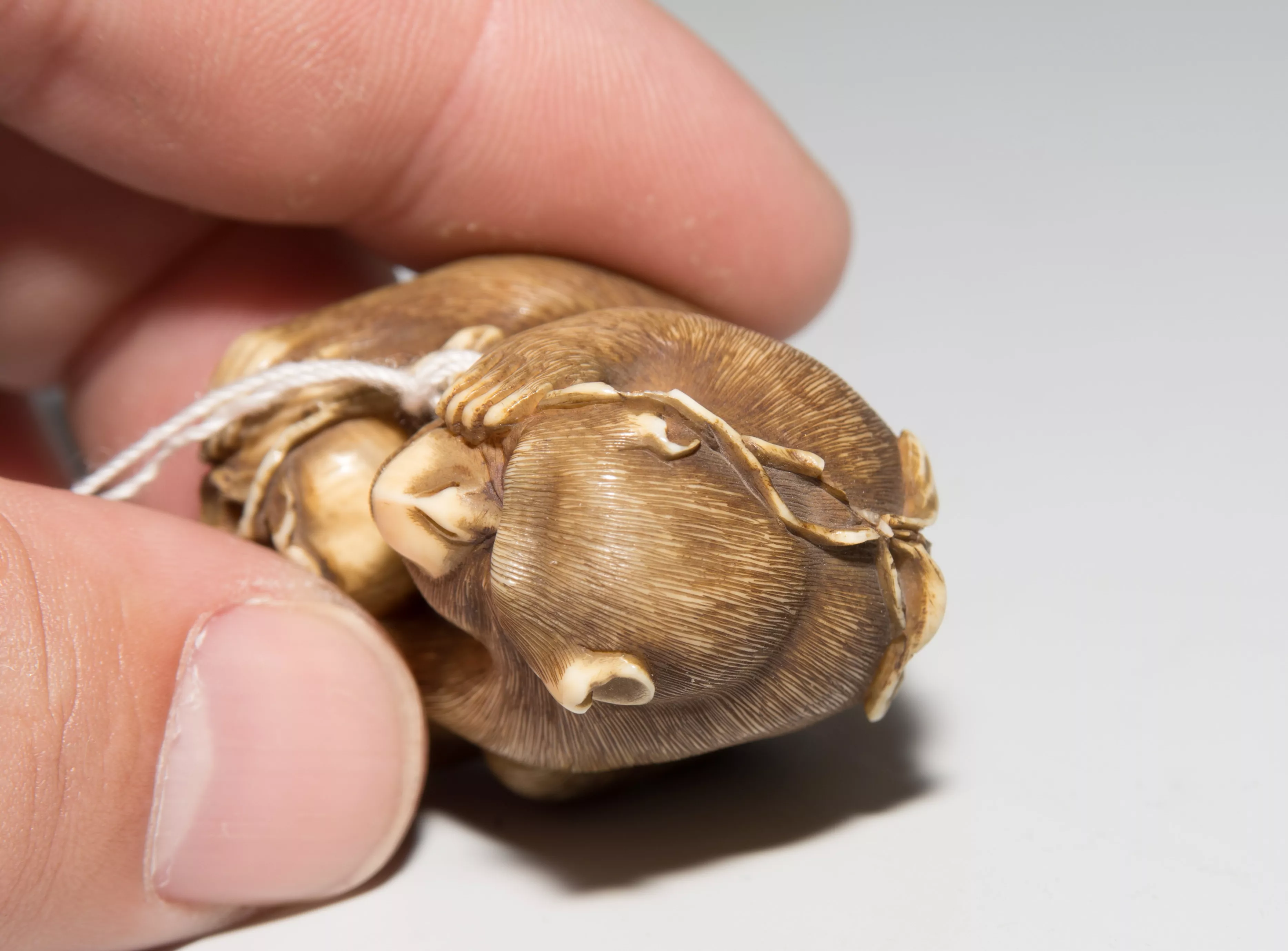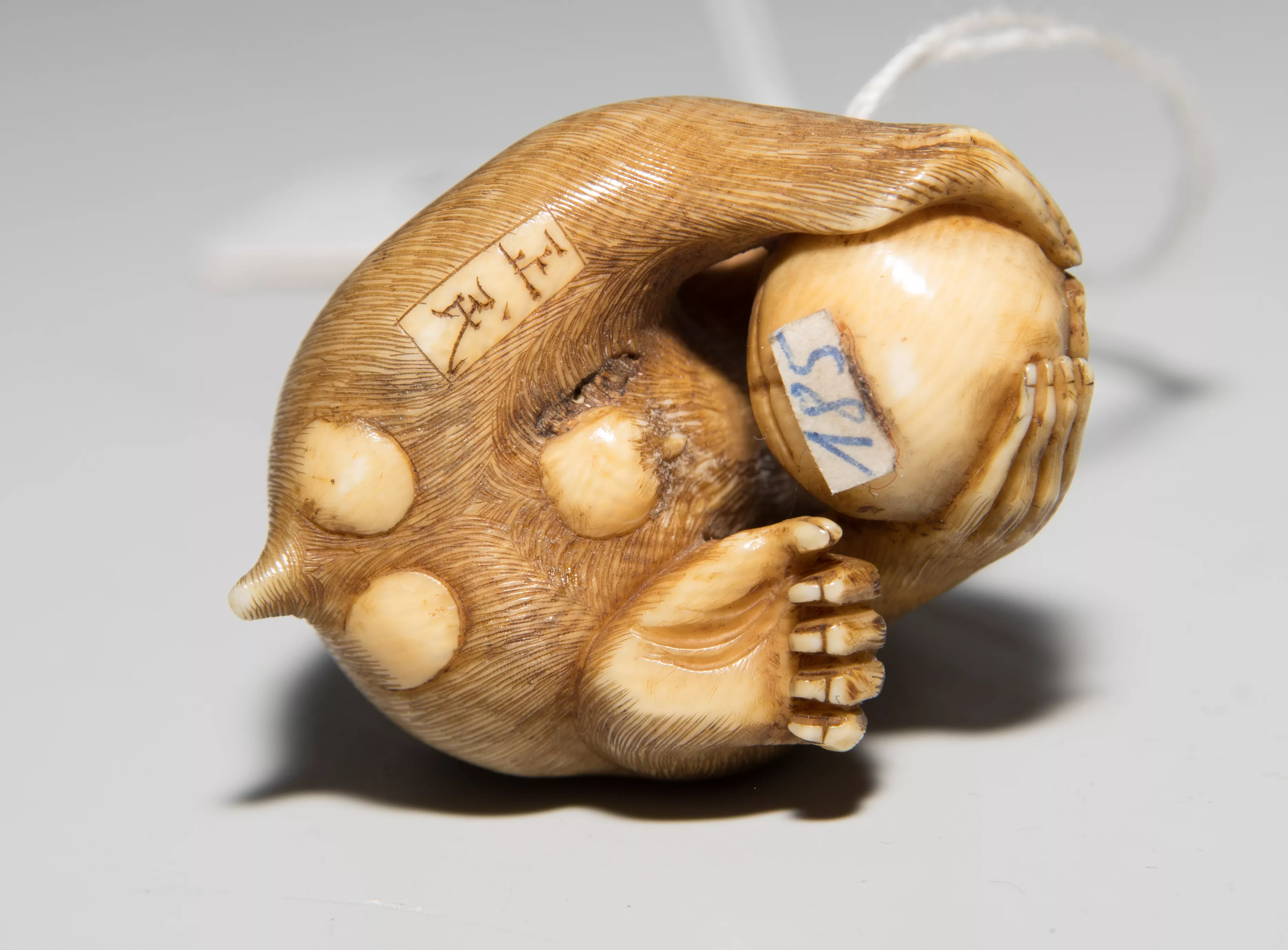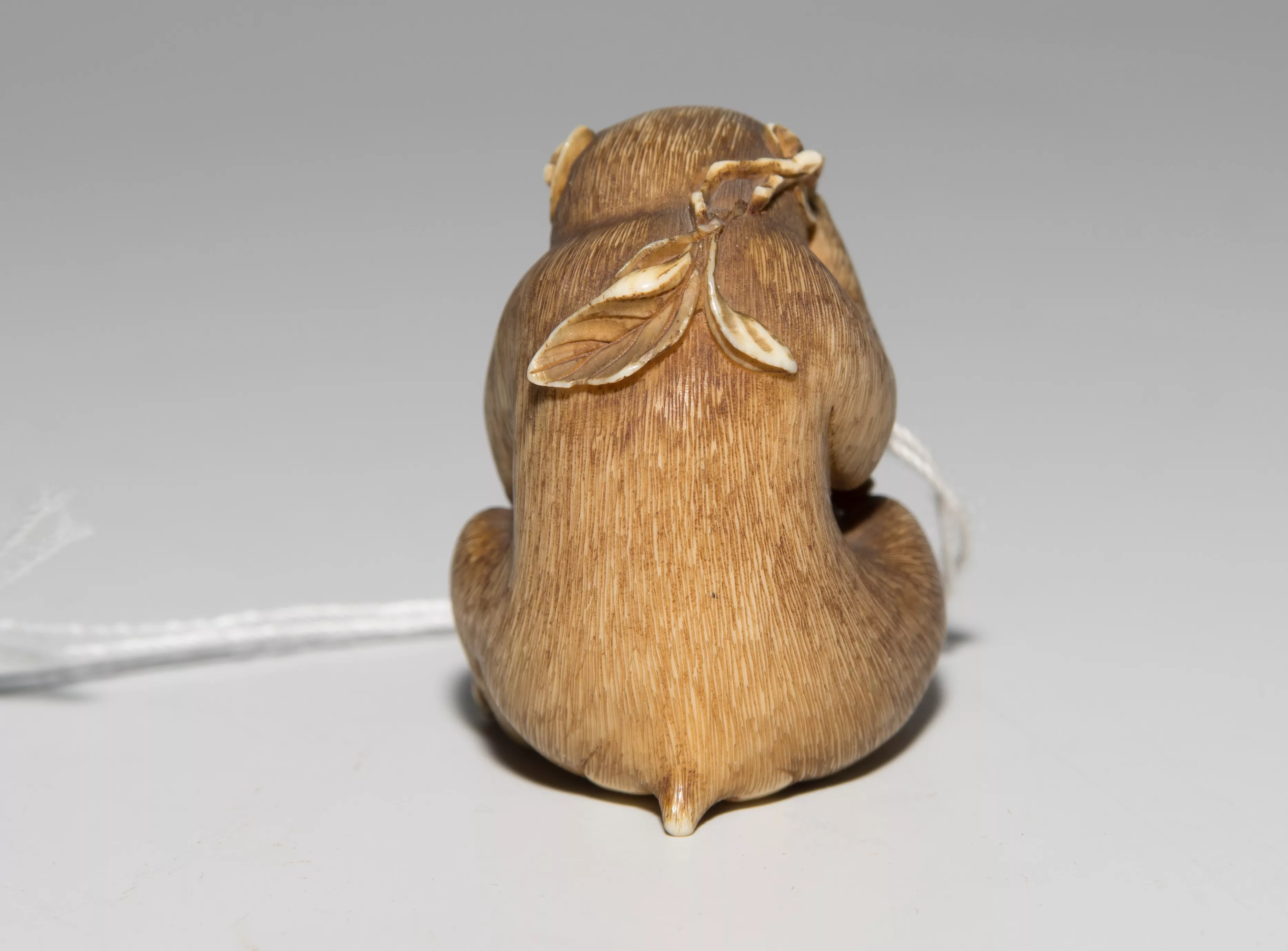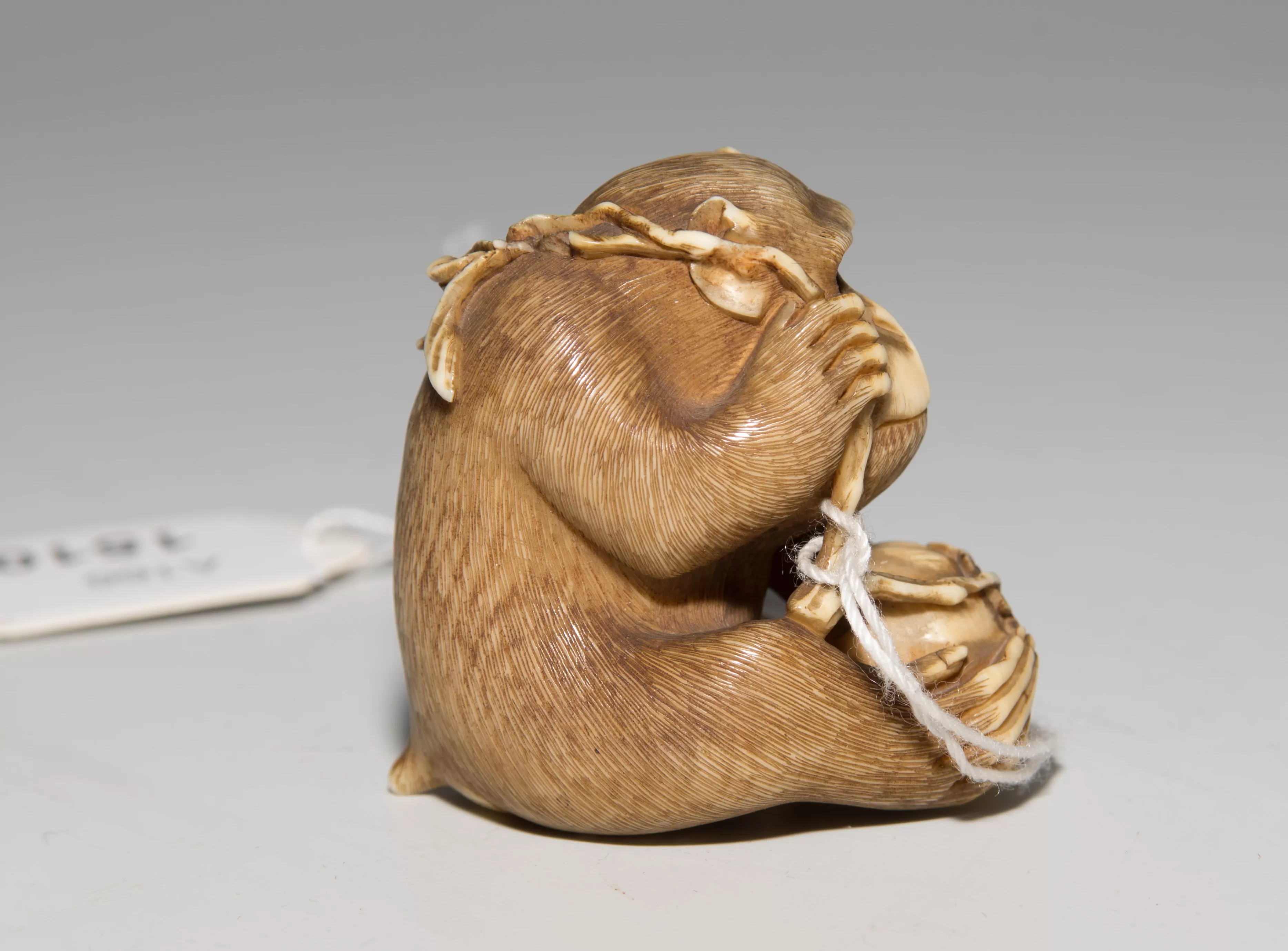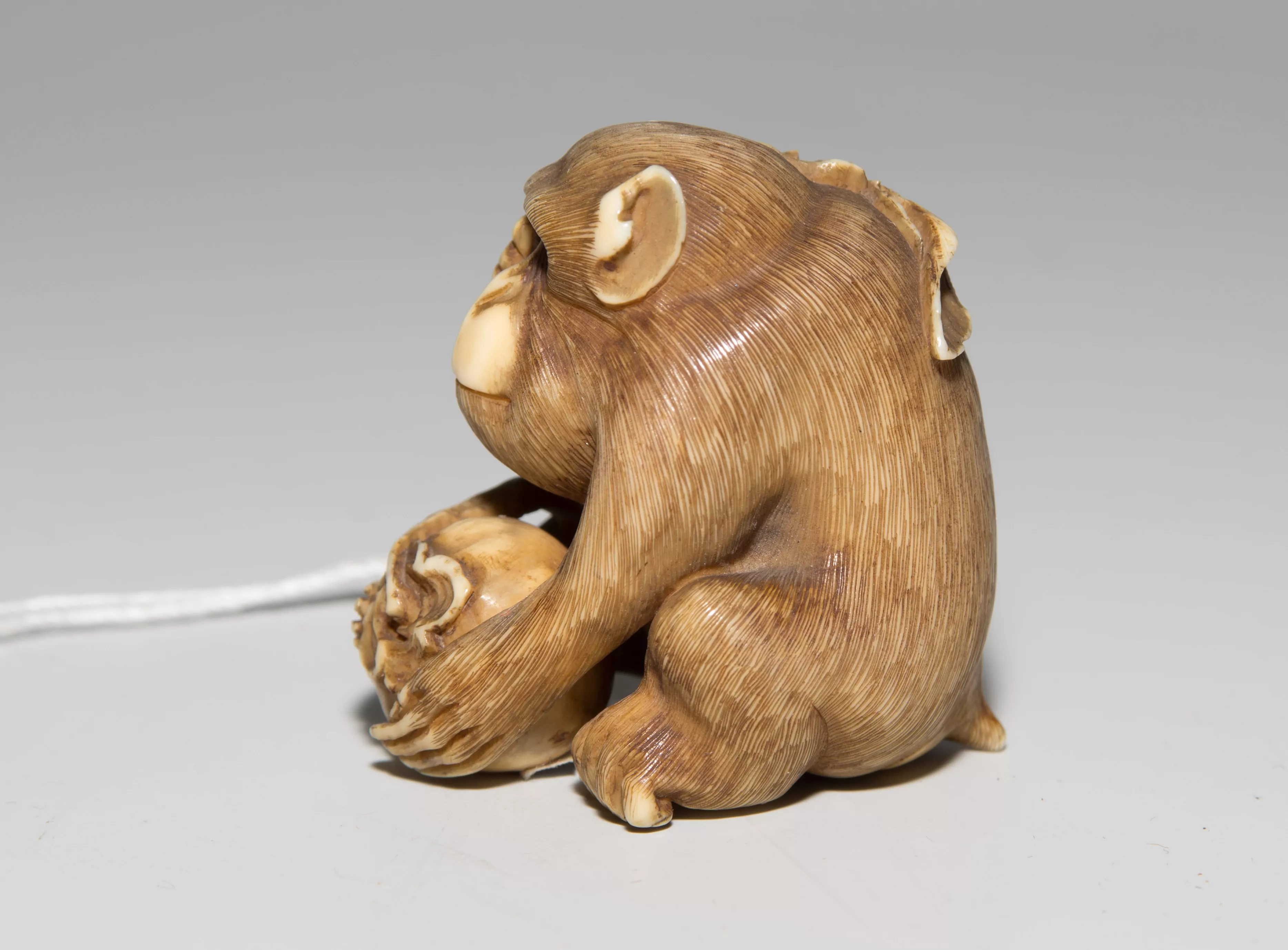Japan, 19.Jh. Elfenbein. Signiert Masatami. Sitzender Affe, der eine Kaki-Frucht in Händen hält. H 3,5 cm.