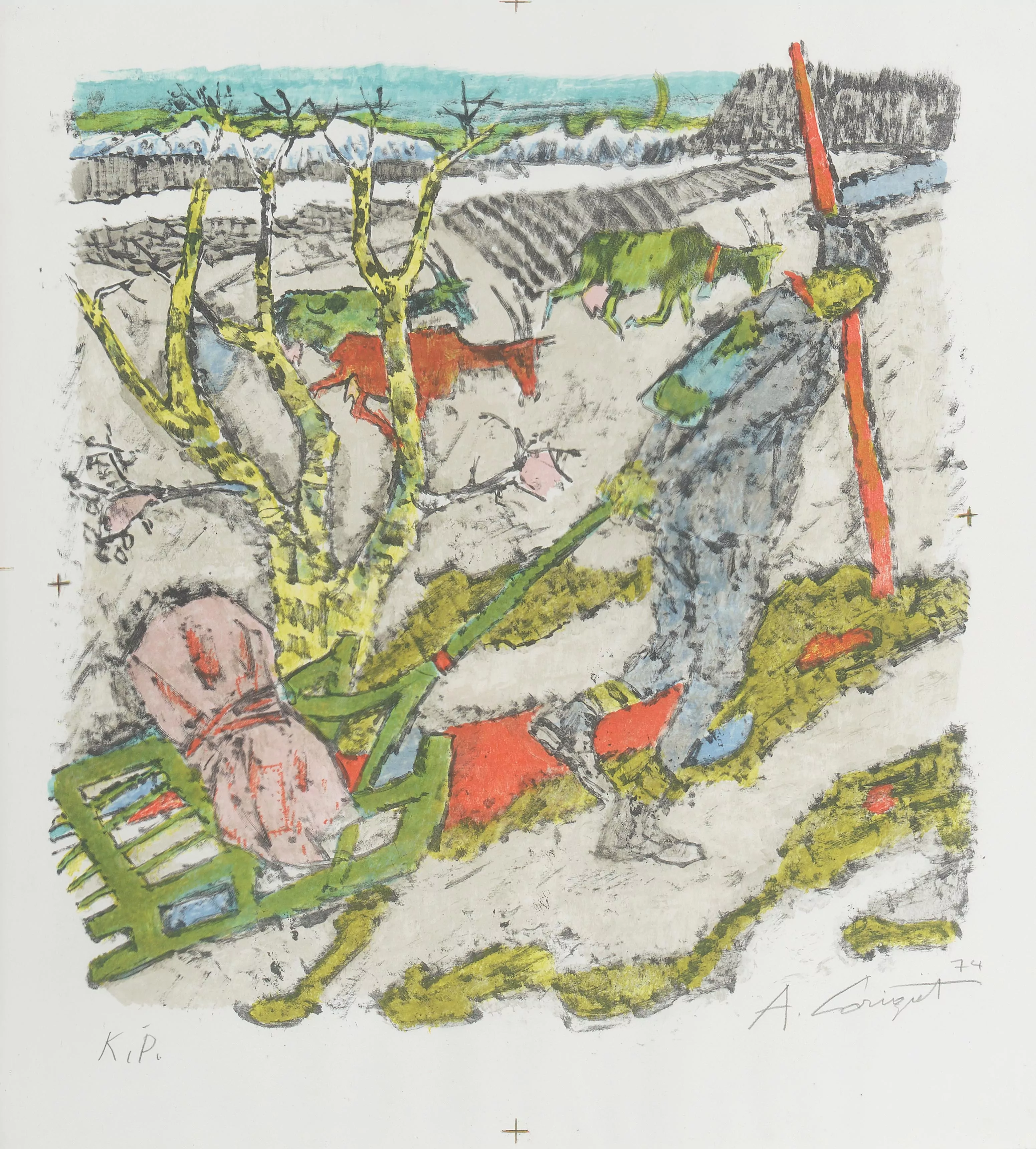 Hirte mit Schlitten. 1974. Farblithographie. K.P. Unten rechts in Bleistift signiert und datiert. Blattgrösse 62,8x56,3 cm. Gerahmt.