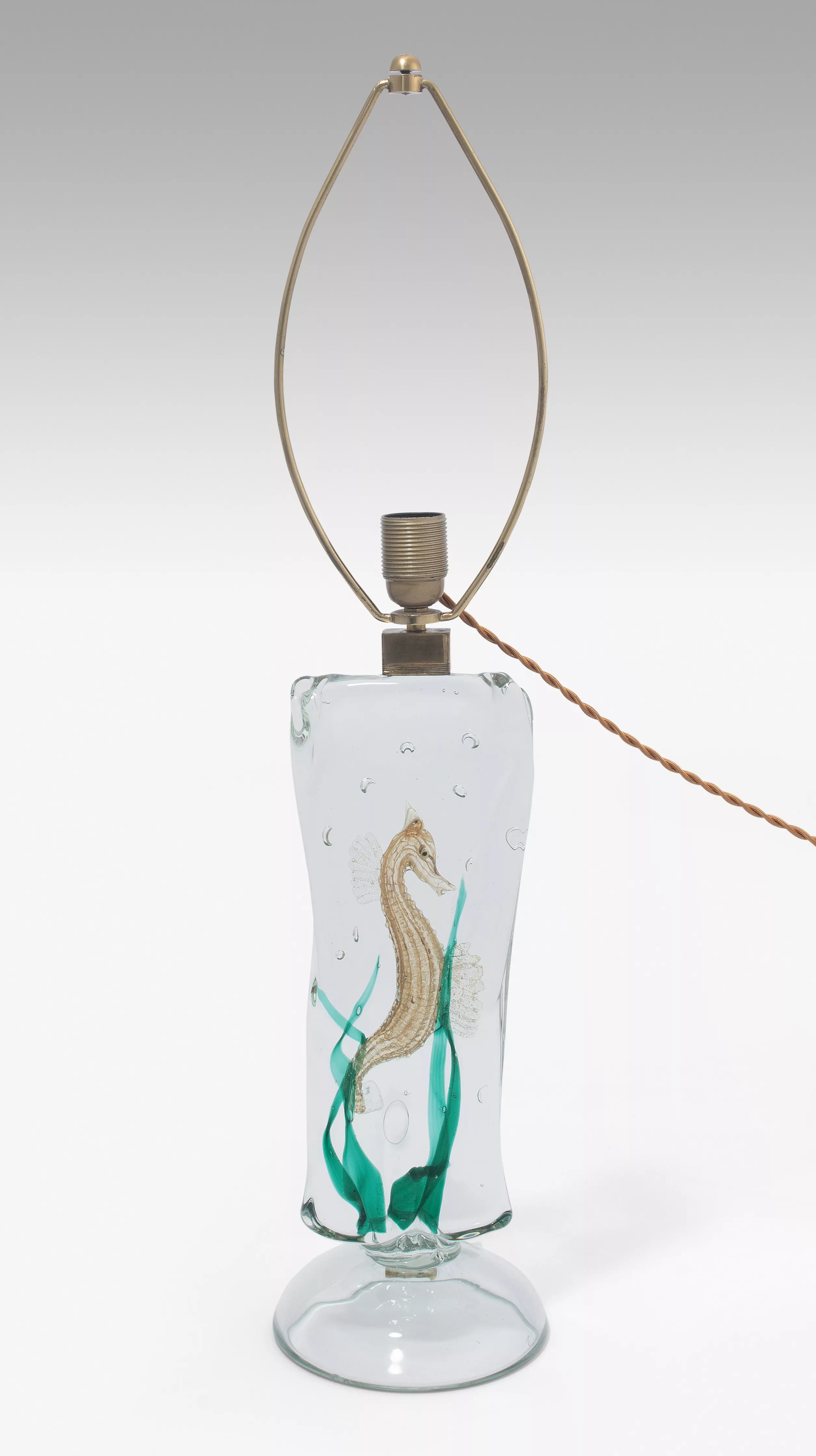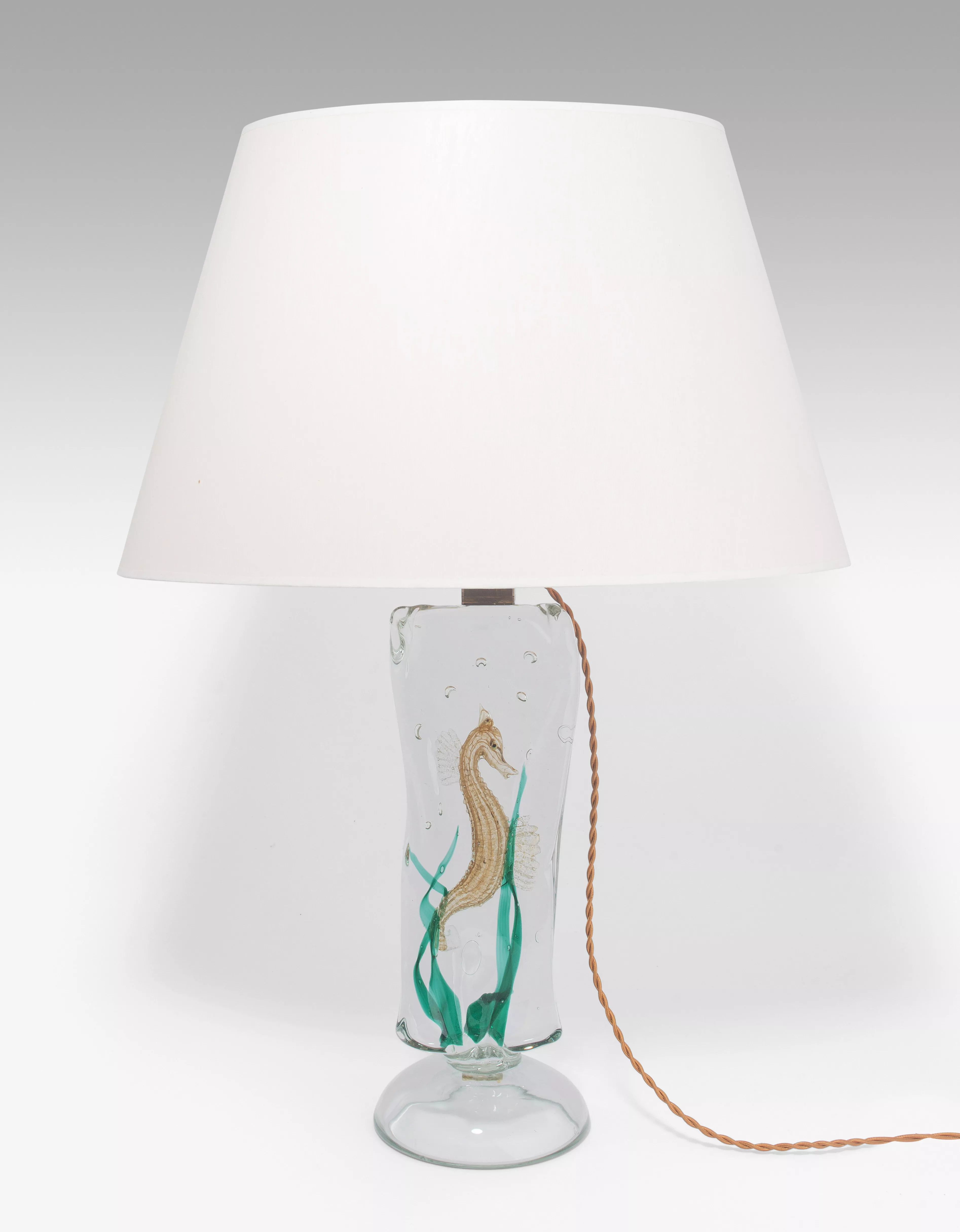 Um 1955. Ausführung von Cenedese, Murano. Farbloser Glasblock mit eingewschmolzenem Seepferdchen-Motiv aus mehrfarbigem Glas, gesprengter Goldfolie und eingestochenen Luftblasen. Mit Herstelleretikett. Beiger Stoffschirm. Funktionstüchtig. H 78 cm.