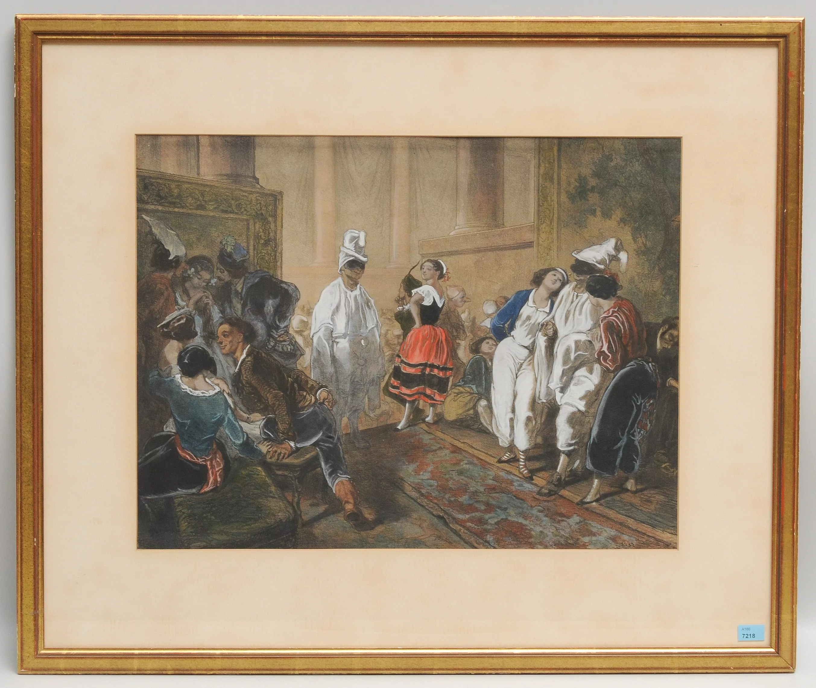 Karneval in Venedig mit Pulcinella und Saltimbanchi. Kol. Lithographie, 1832. 38,3x50 cm. Gerahmt.