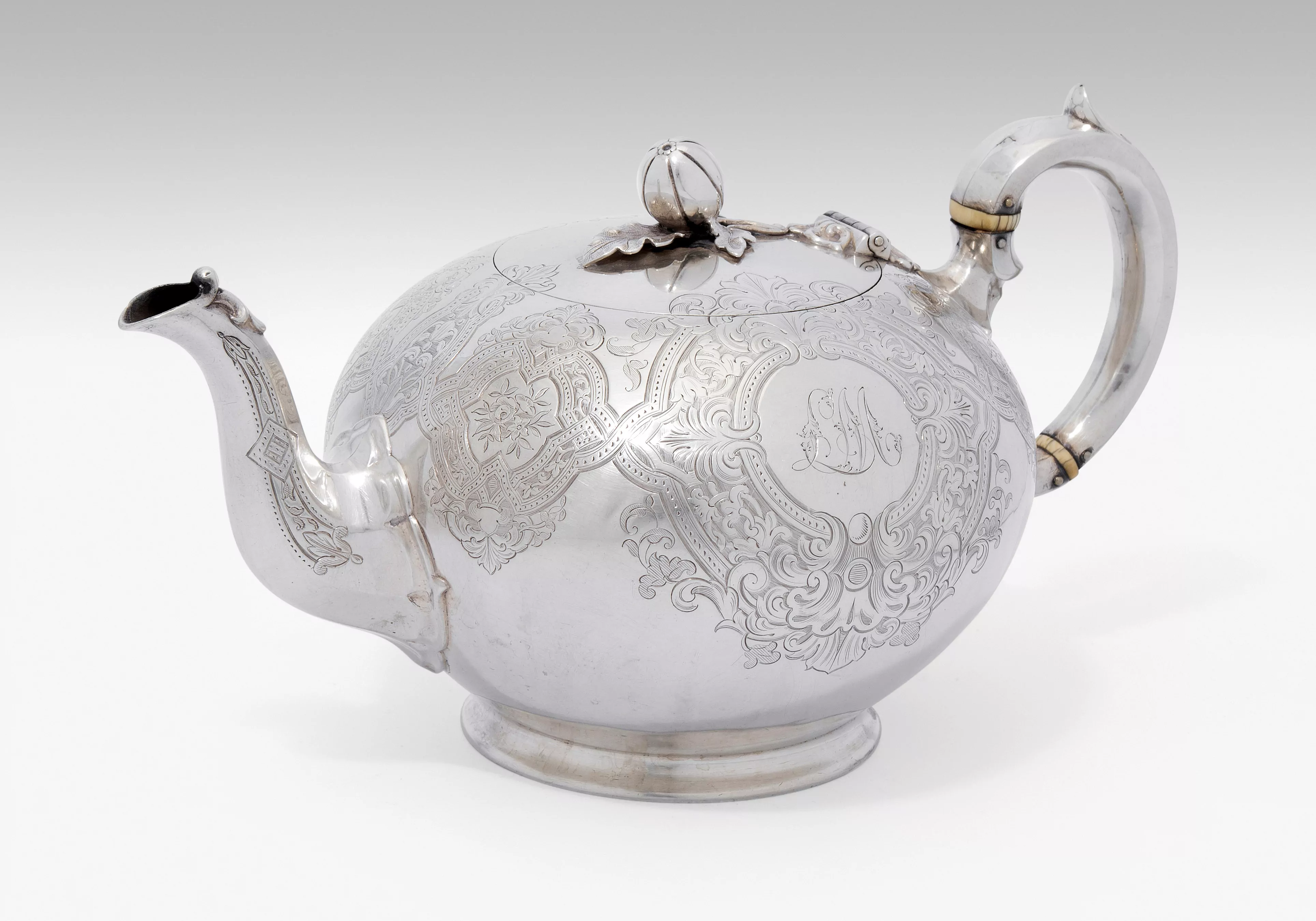 1874. Silber. Meistermarke Edward & John Barnard. Kugelige Form über ausgestelltem Stand. Rocaillenhenkel, Deckelknauf in Form einer Haselnuss. Wandung ornamental graviert mit Kartuschendekor und Ligaturinitialen. Garantiemarke. H 14 cm, ca. 619 g.
