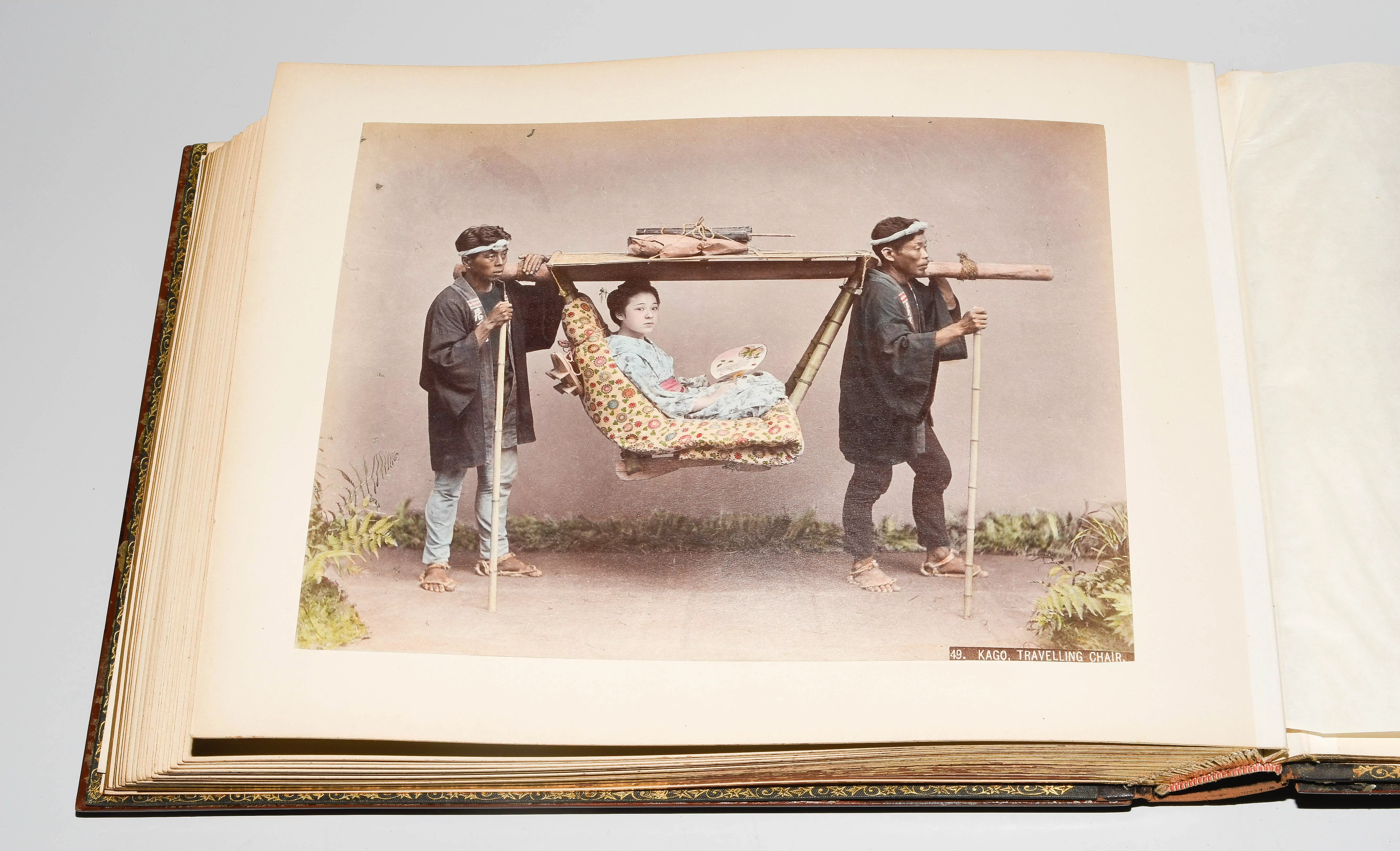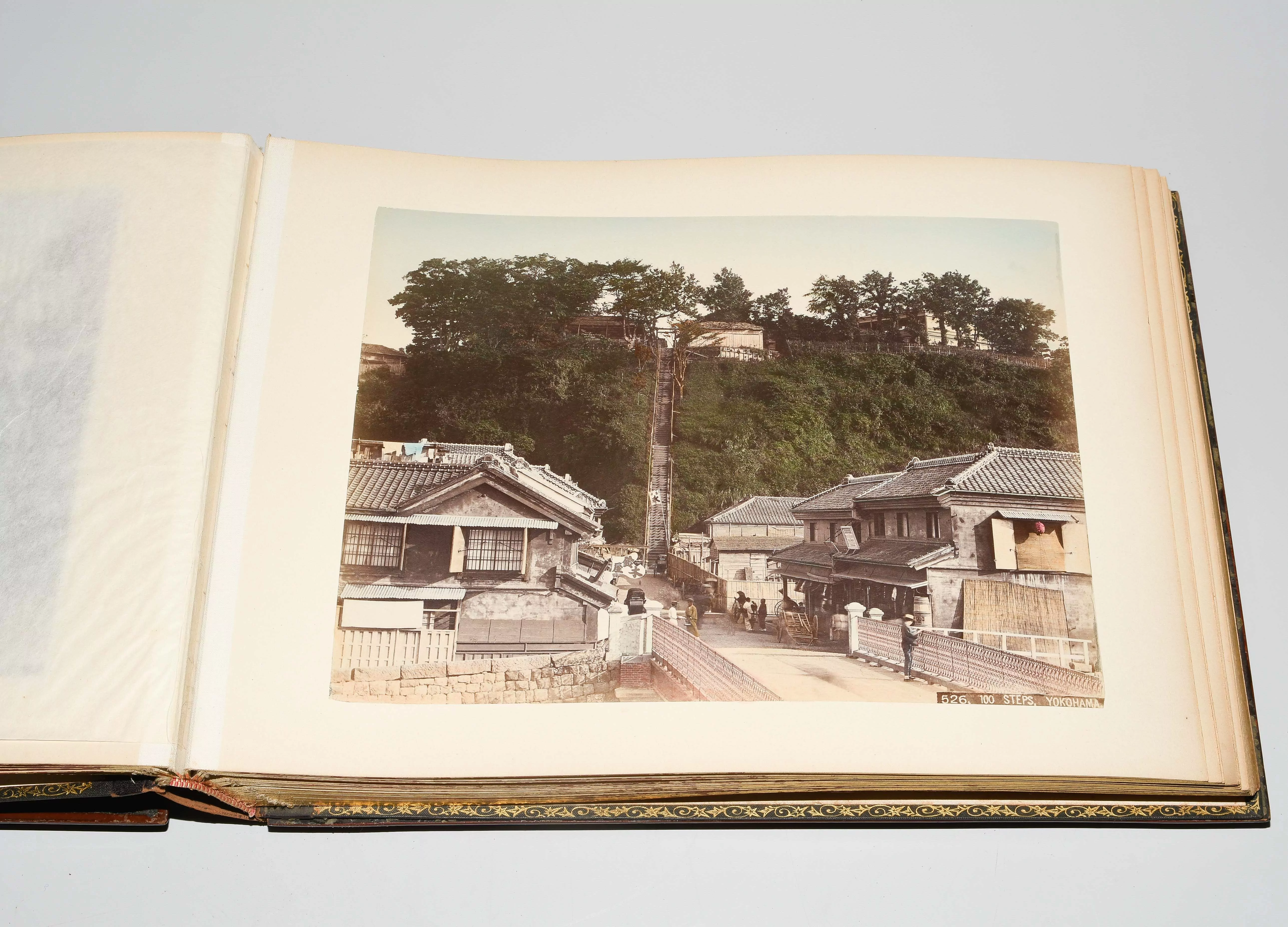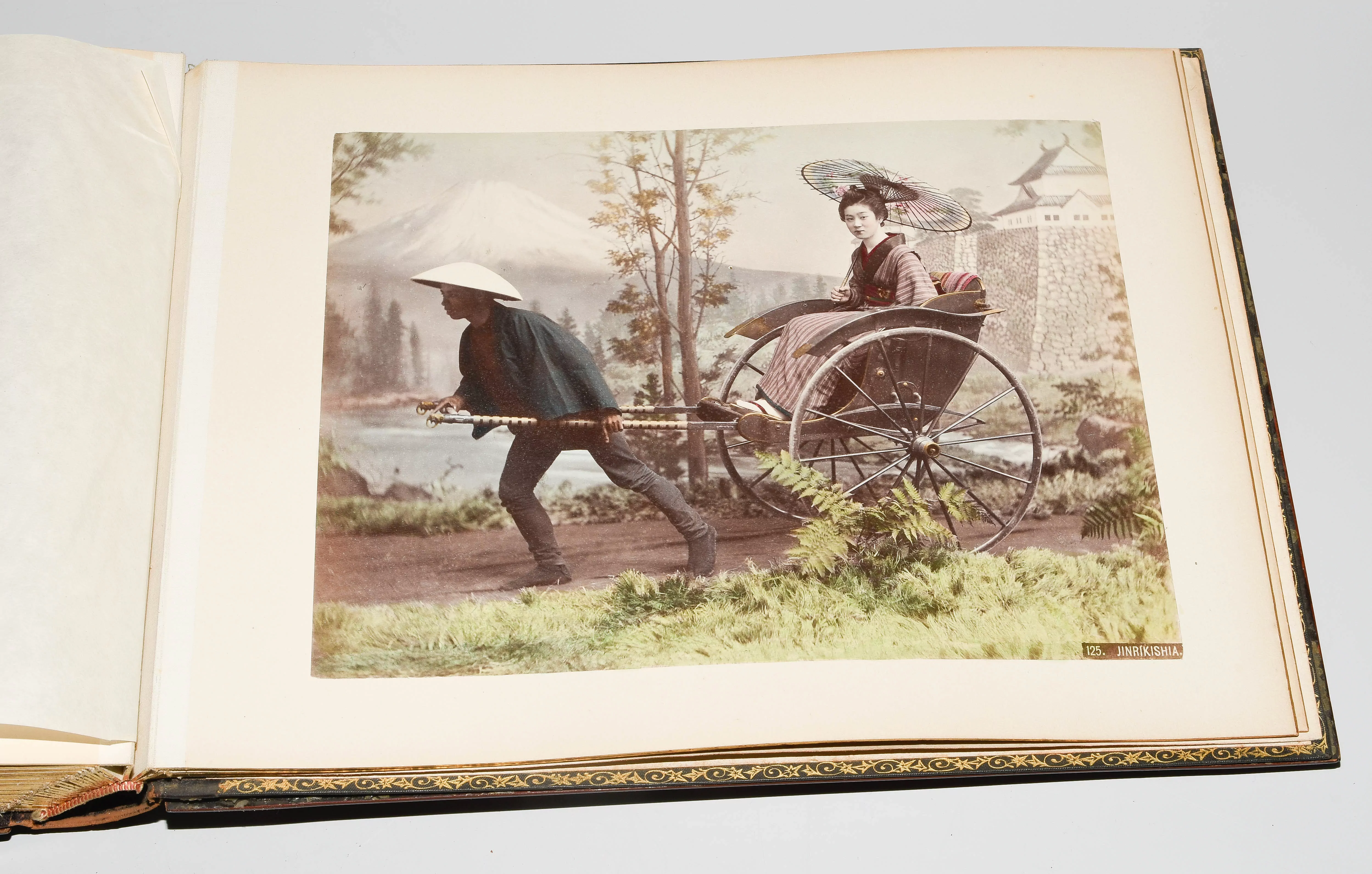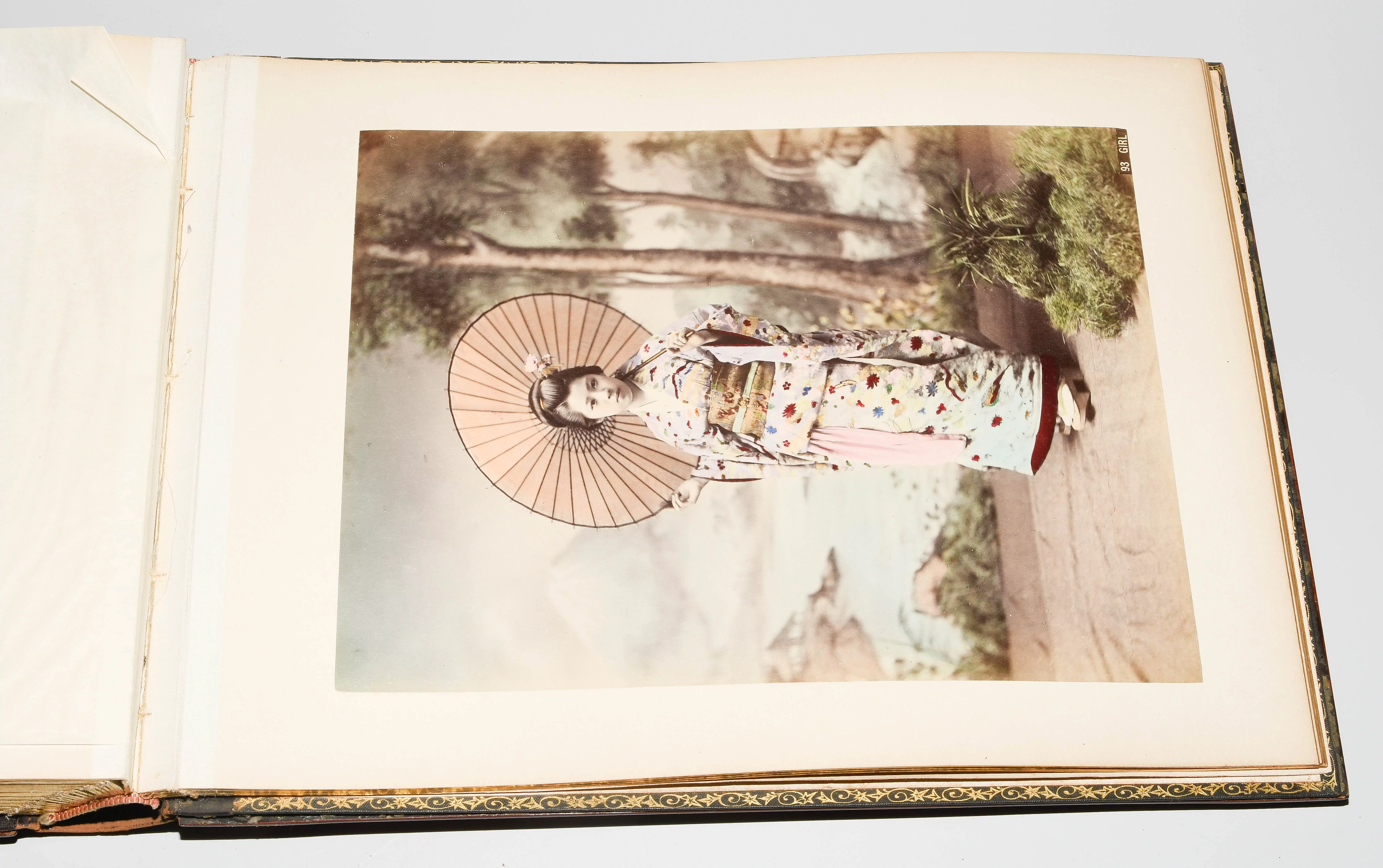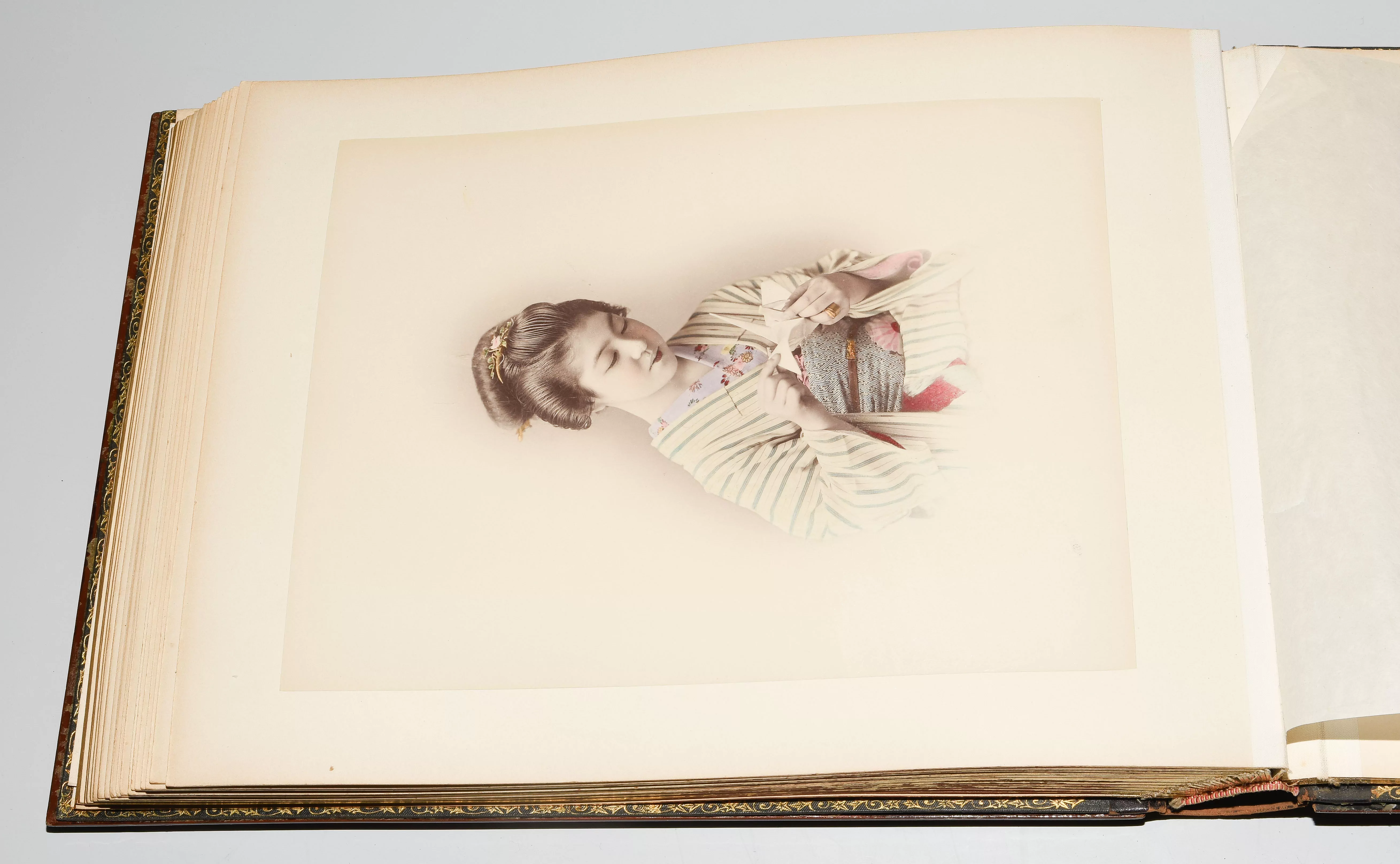 Japan, um 1880. Insgesamt 50 handkolorierte Fotos. Portraitdarstellungen sowie Ansichten des ländlichen und städtischen Japans. Je 26,5x20 cm. In dekorativem Lack-Fotoalbum mit Perlmuttdekor, brauner Lederrücken. Ca. 36x27x6 cm. Auf Innenseite Stempel von K Kimbei, Yokohama.