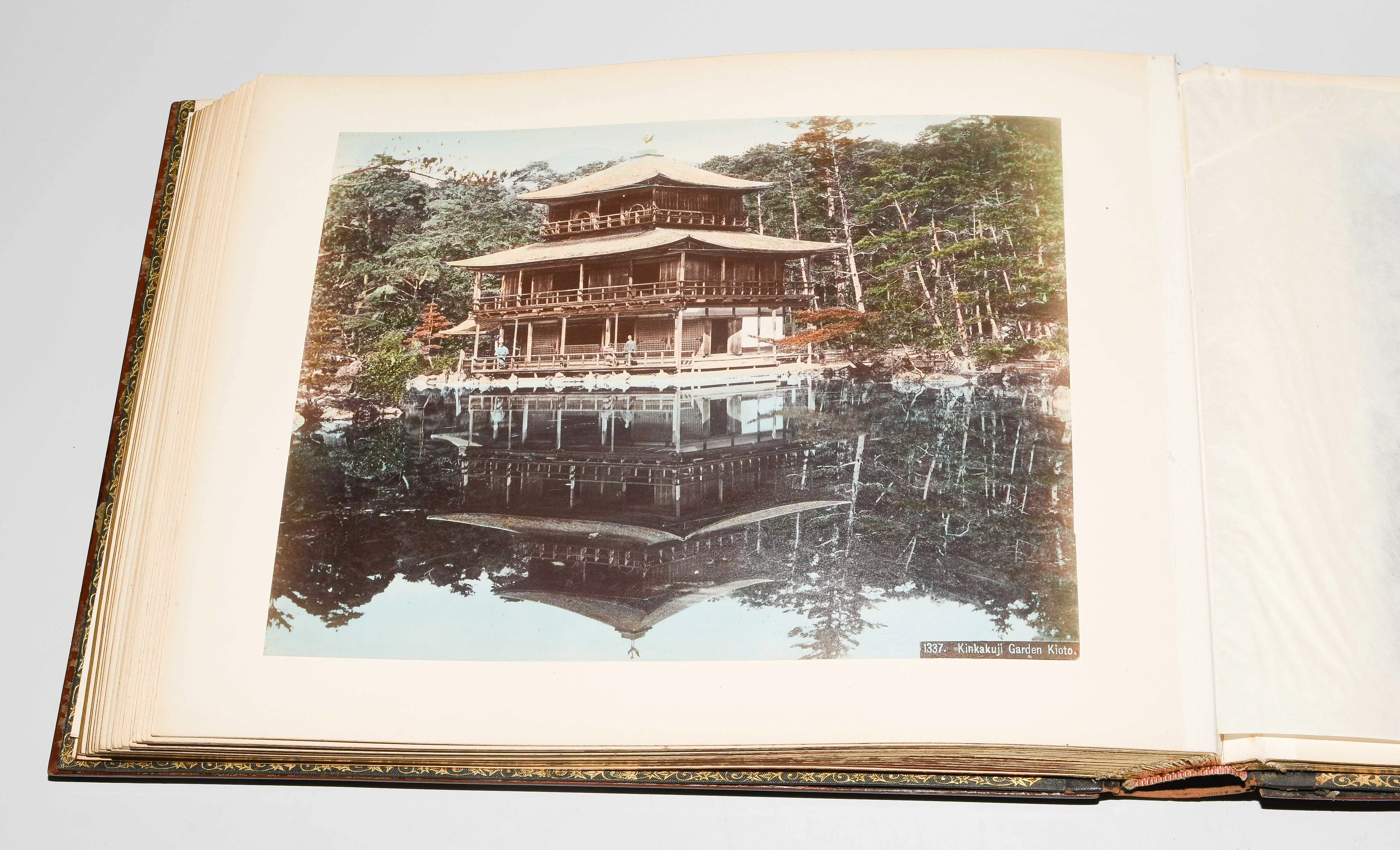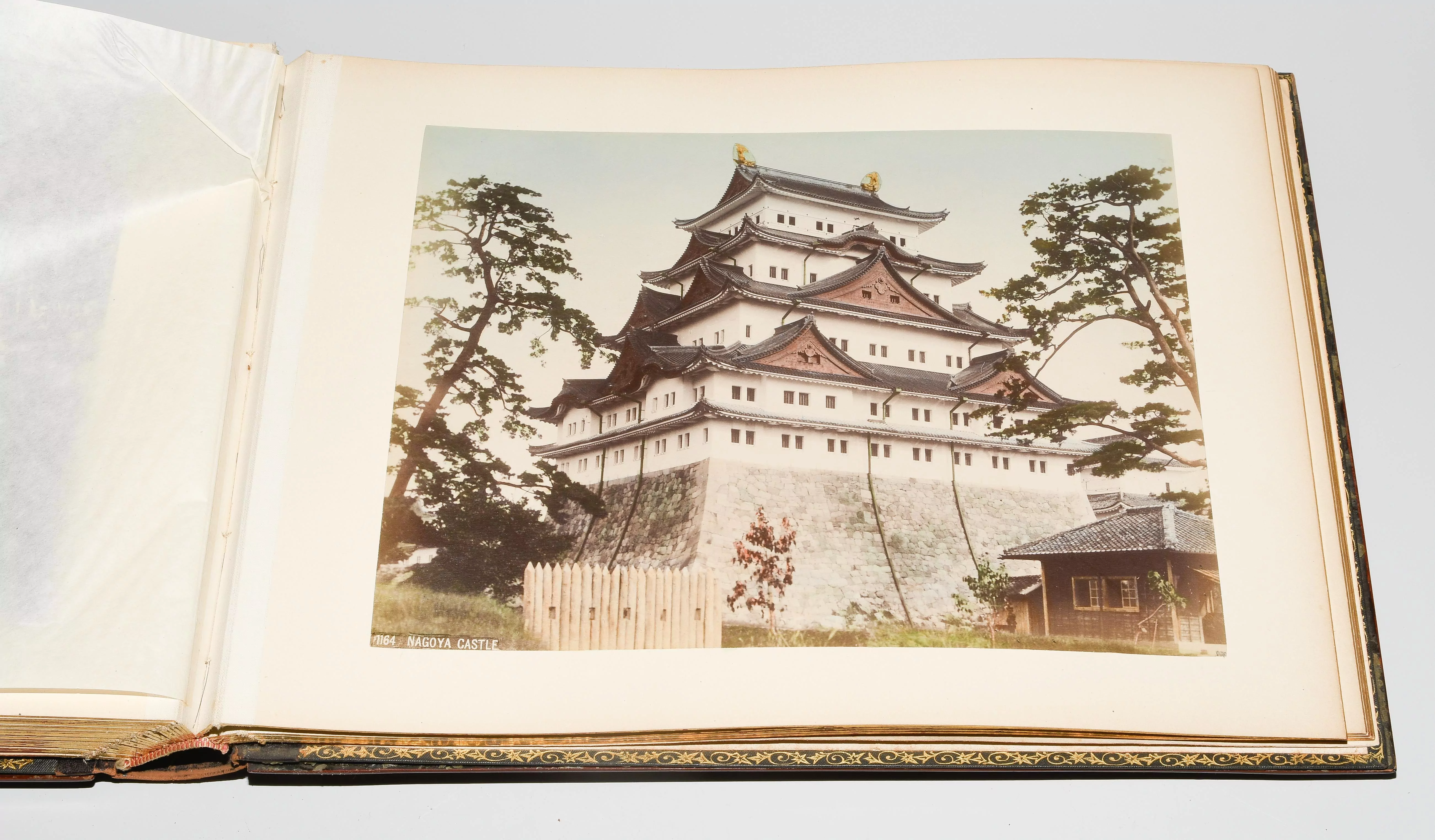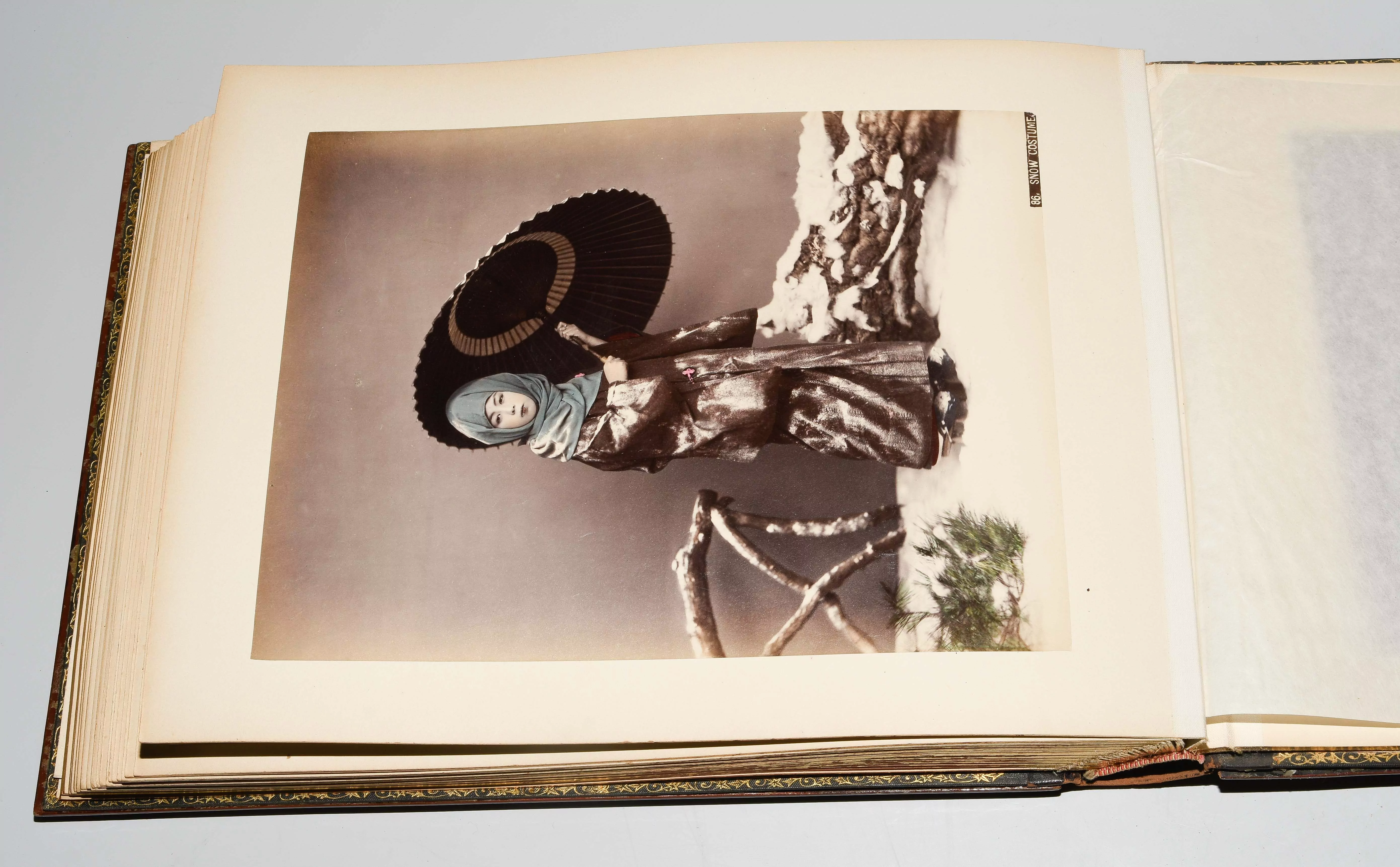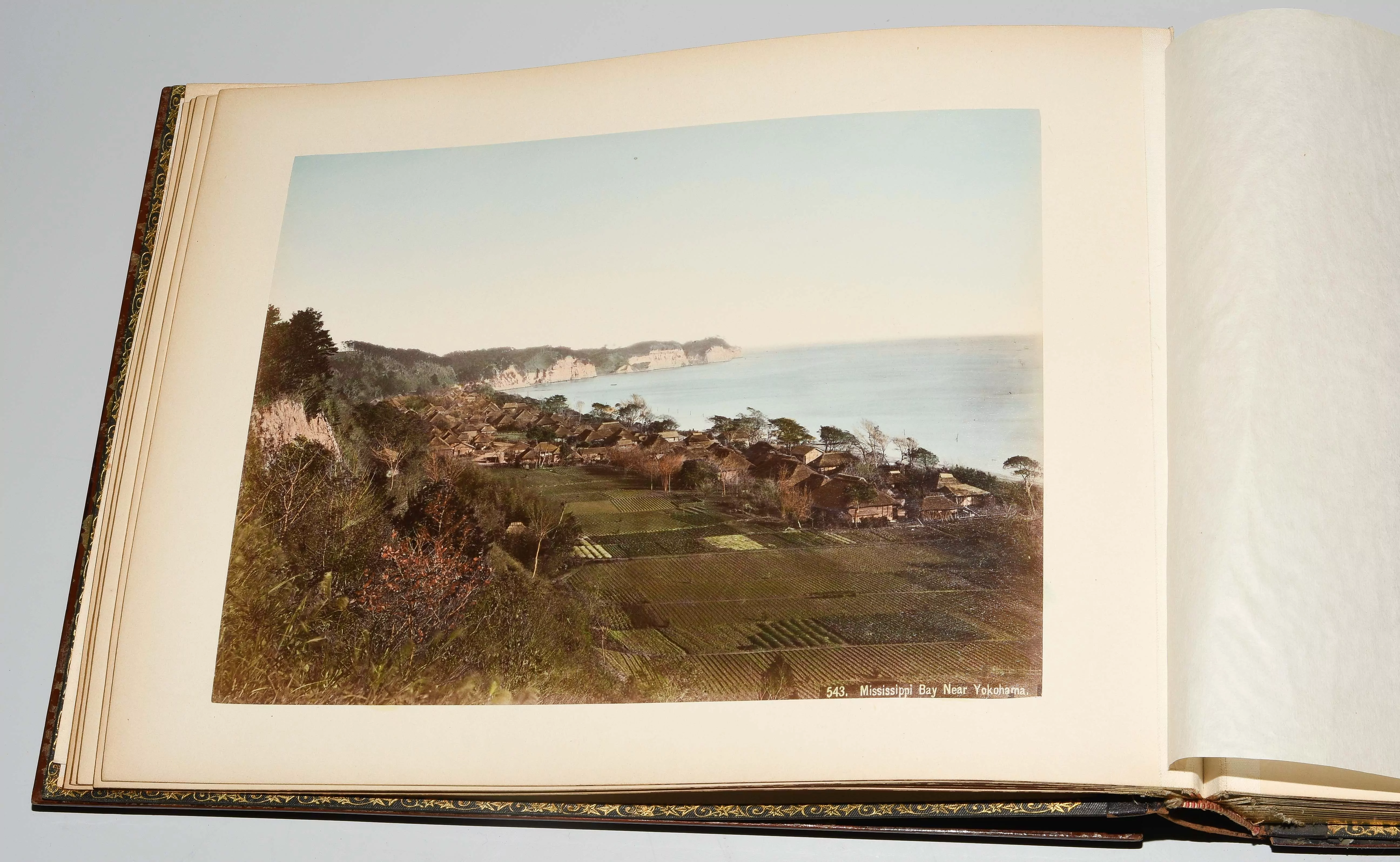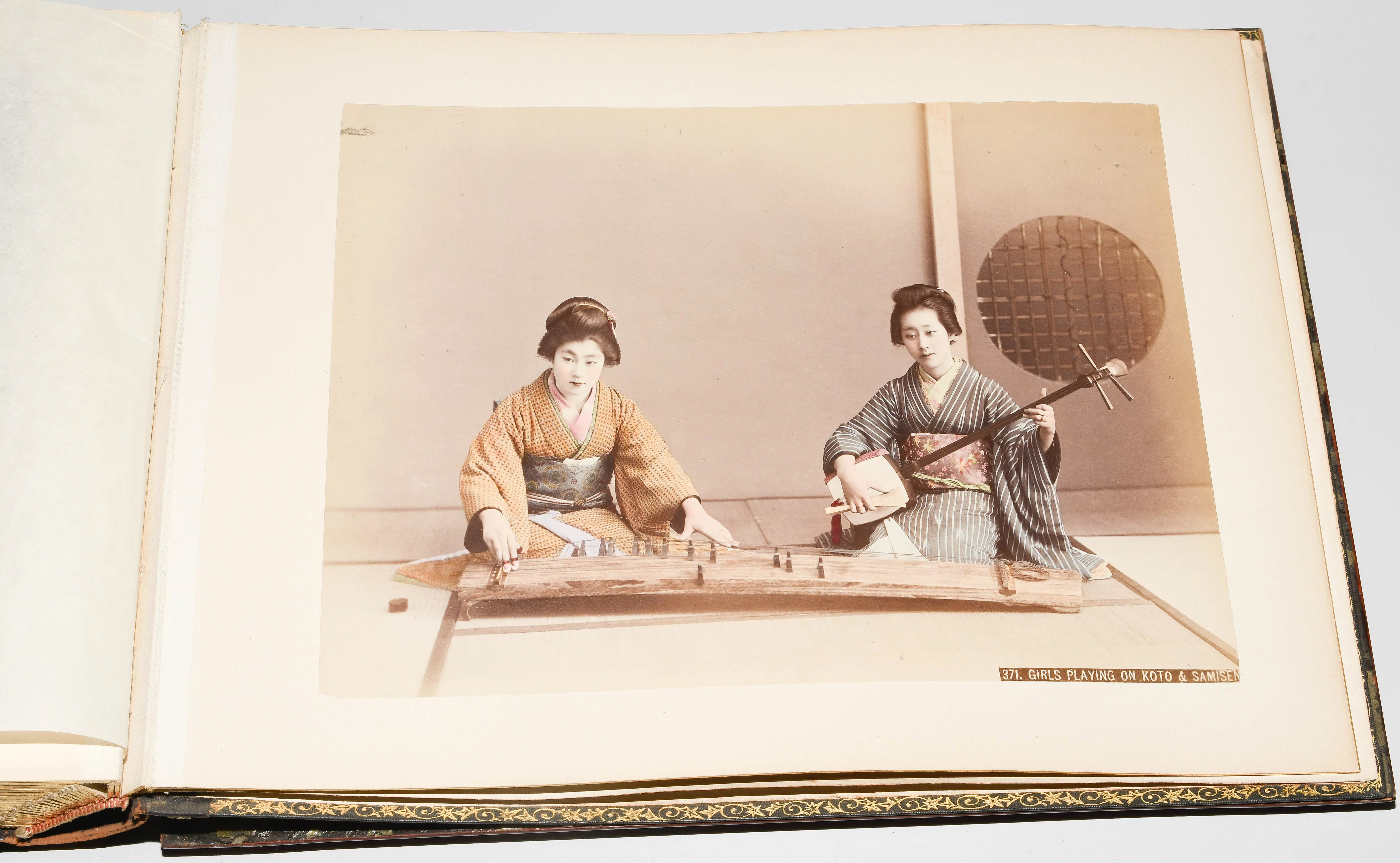 Japan, um 1880. Insgesamt 50 handkolorierte Fotos. Portraitdarstellungen sowie Ansichten des ländlichen und städtischen Japans. Je 26,5x20 cm. In dekorativem Lack-Fotoalbum mit Perlmuttdekor, brauner Lederrücken. Ca. 36x27x6 cm. Auf Innenseite Stempel von K Kimbei, Yokohama.