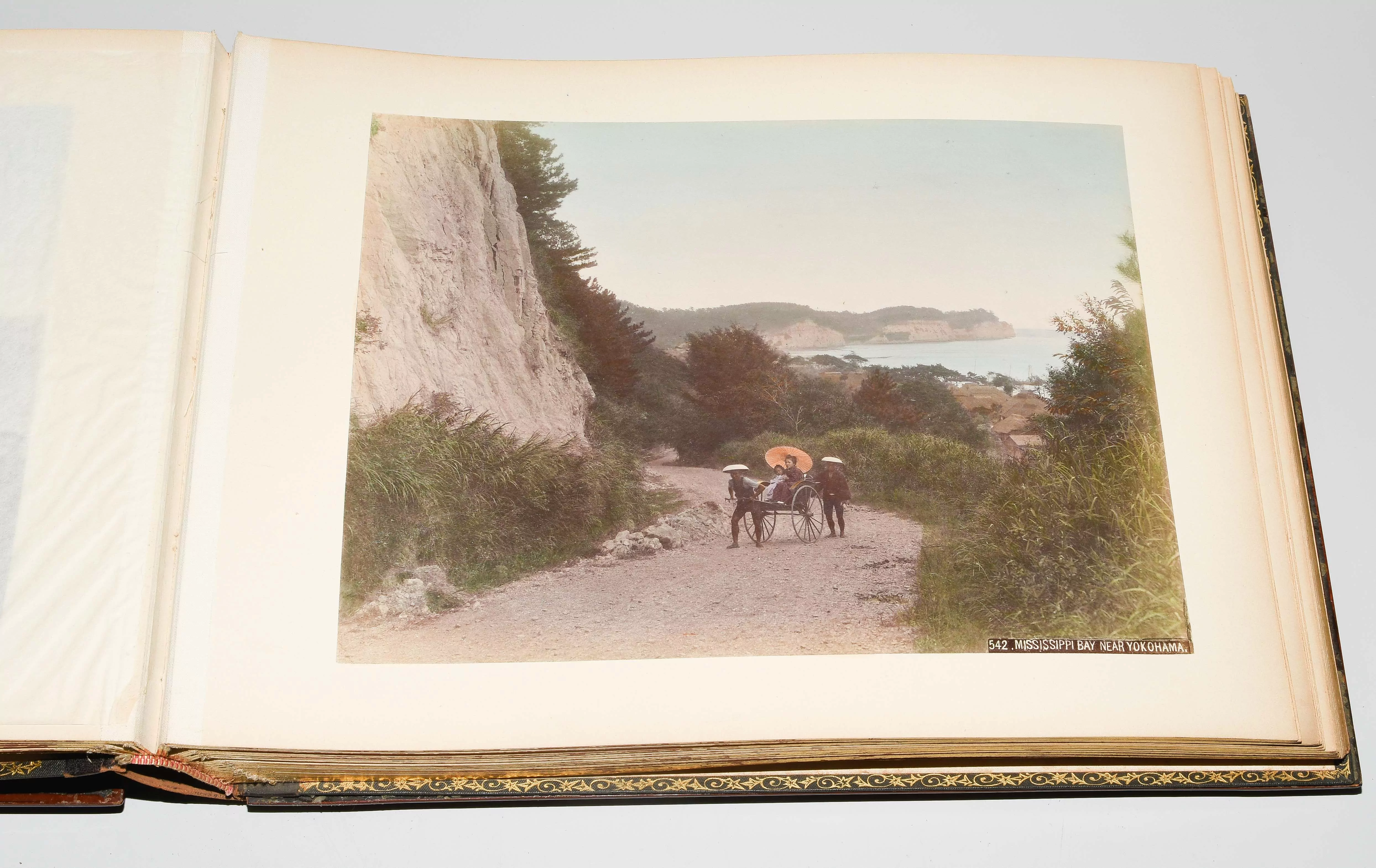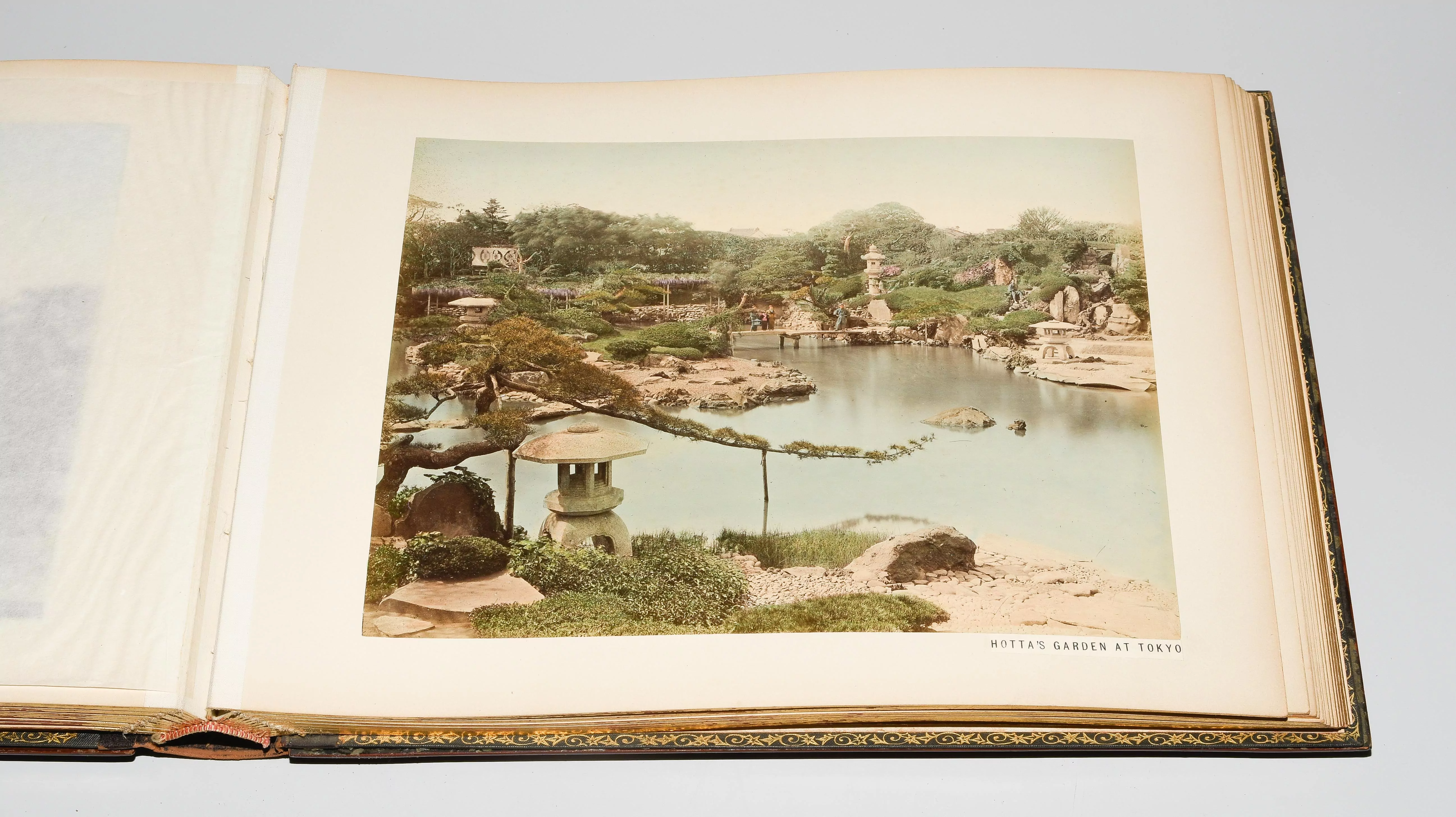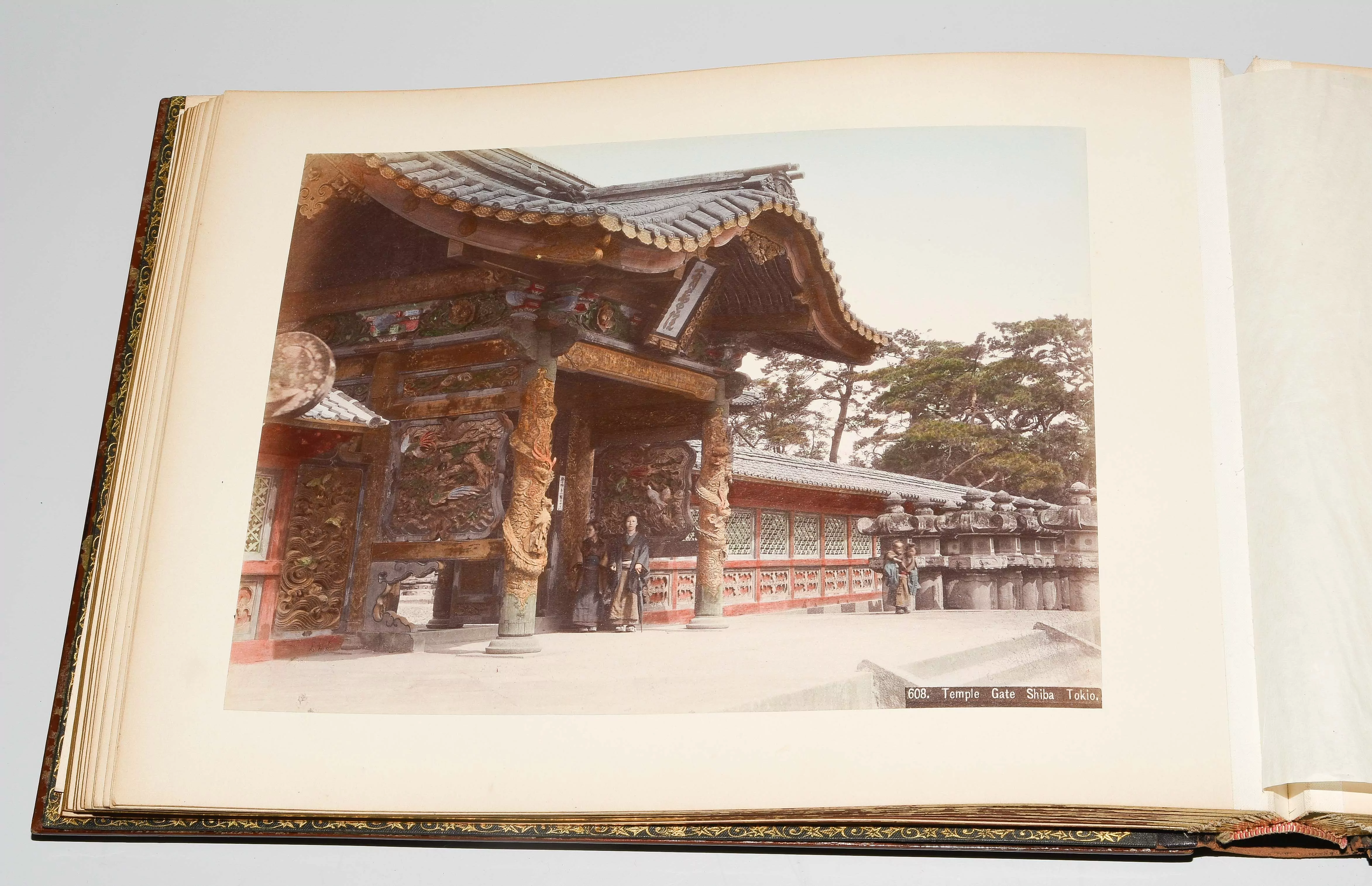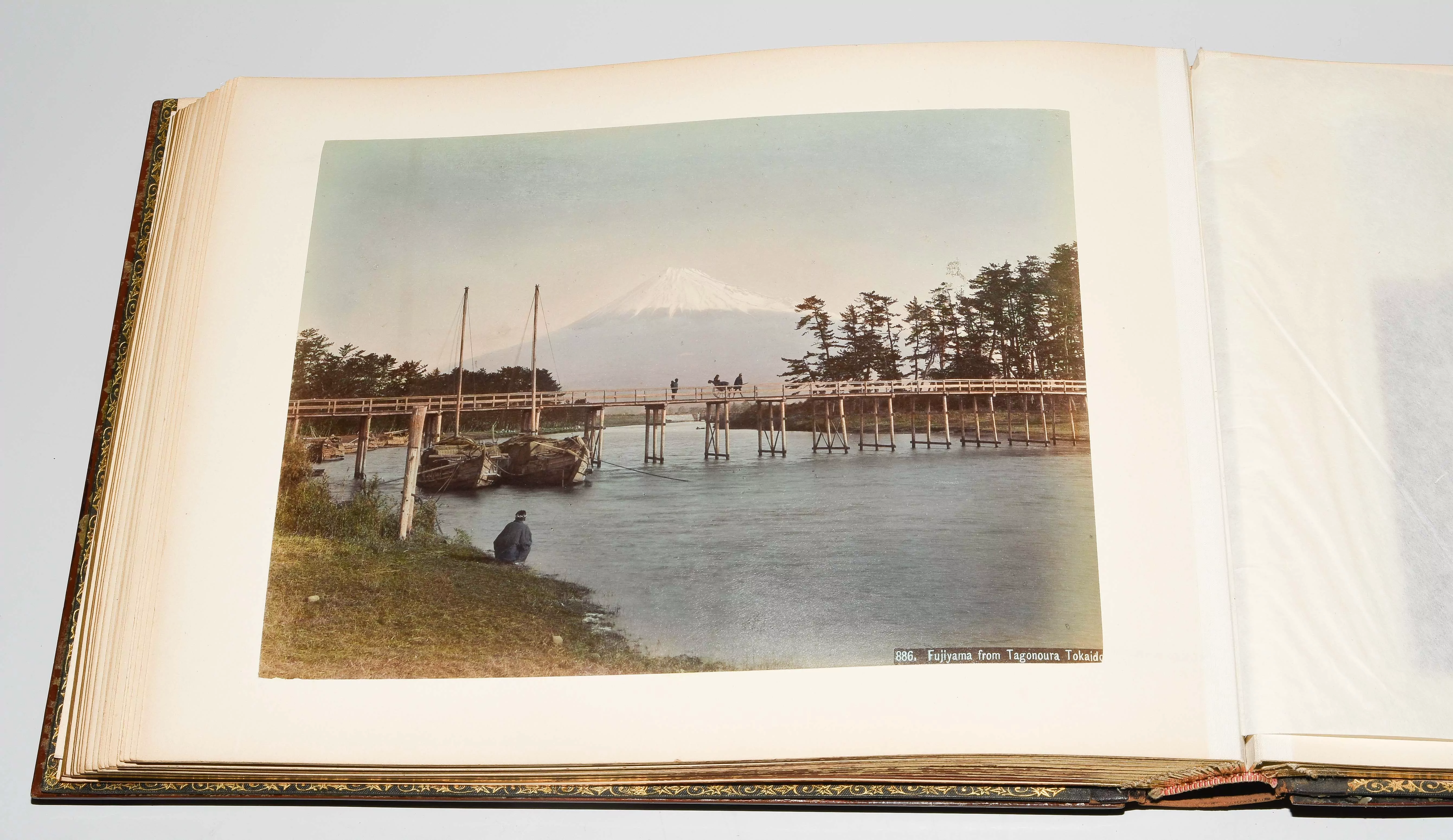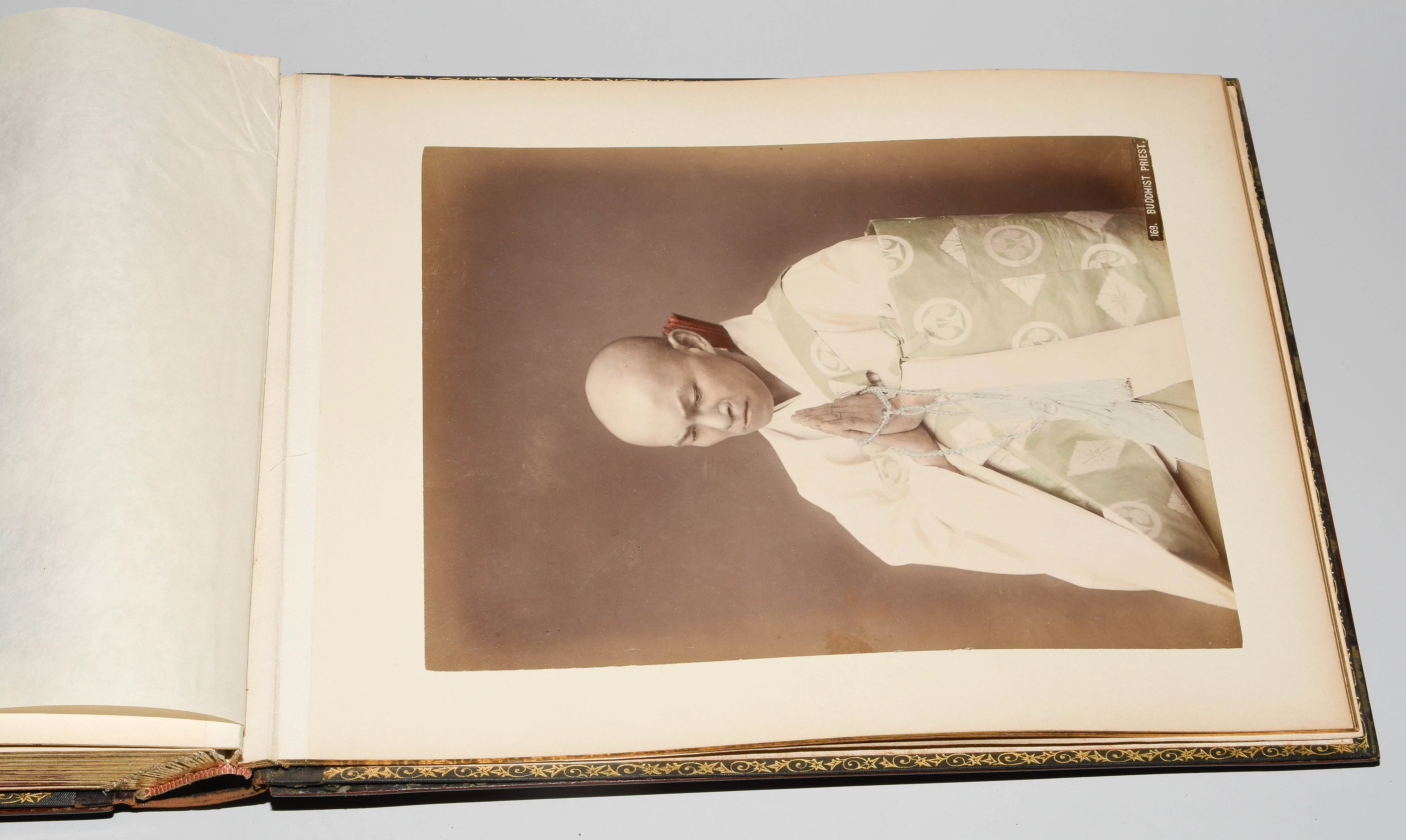 Japan, um 1880. Insgesamt 50 handkolorierte Fotos. Portraitdarstellungen sowie Ansichten des ländlichen und städtischen Japans. Je 26,5x20 cm. In dekorativem Lack-Fotoalbum mit Perlmuttdekor, brauner Lederrücken. Ca. 36x27x6 cm. Auf Innenseite Stempel von K Kimbei, Yokohama.