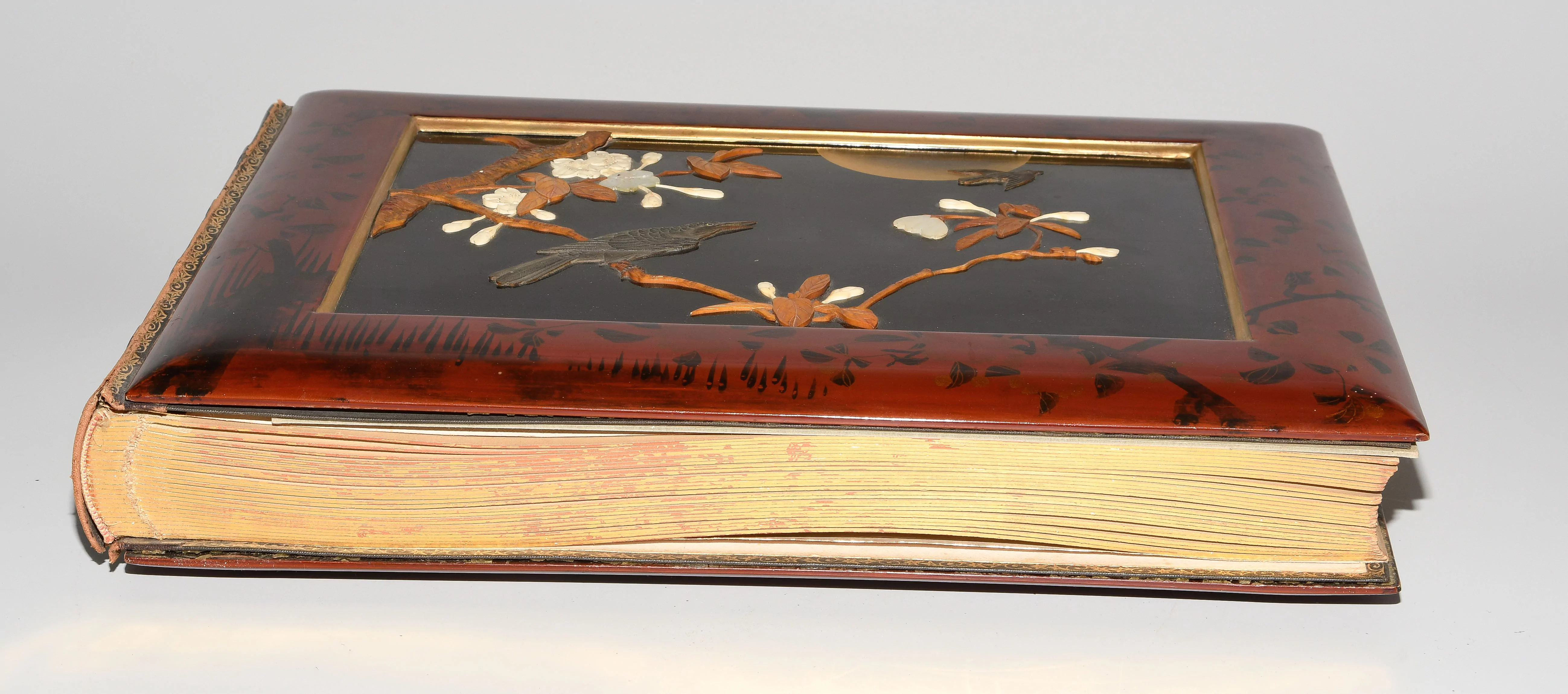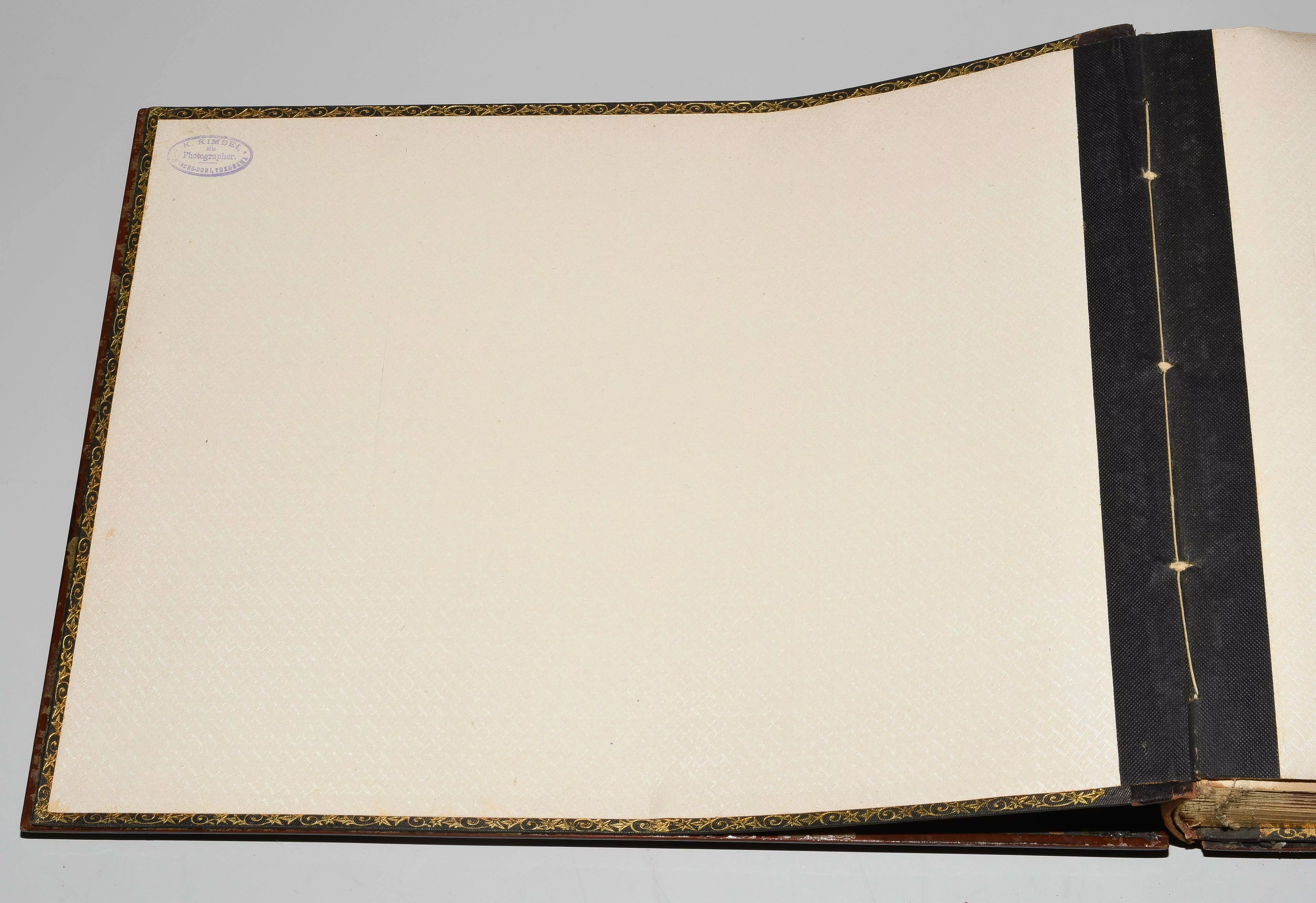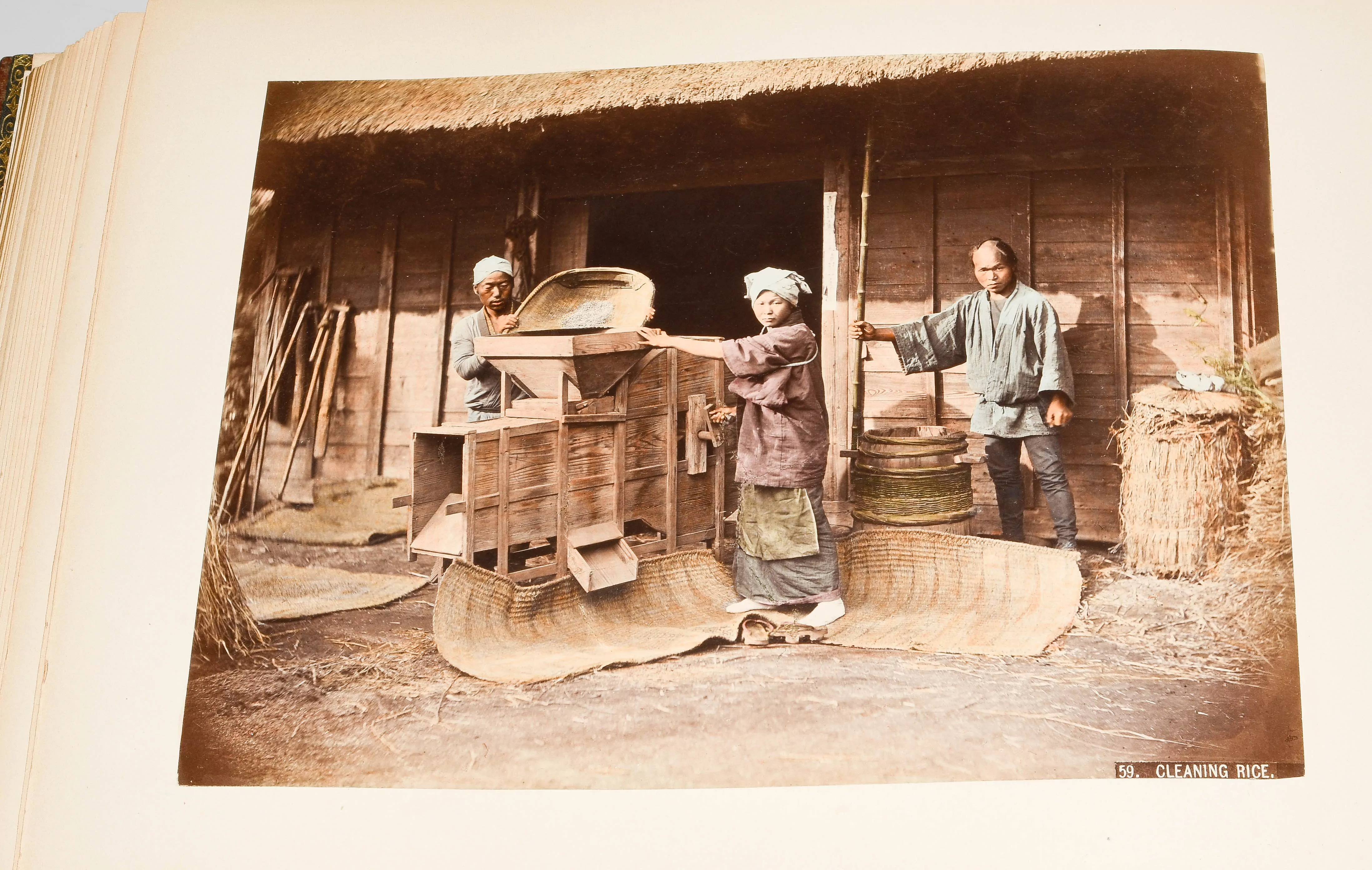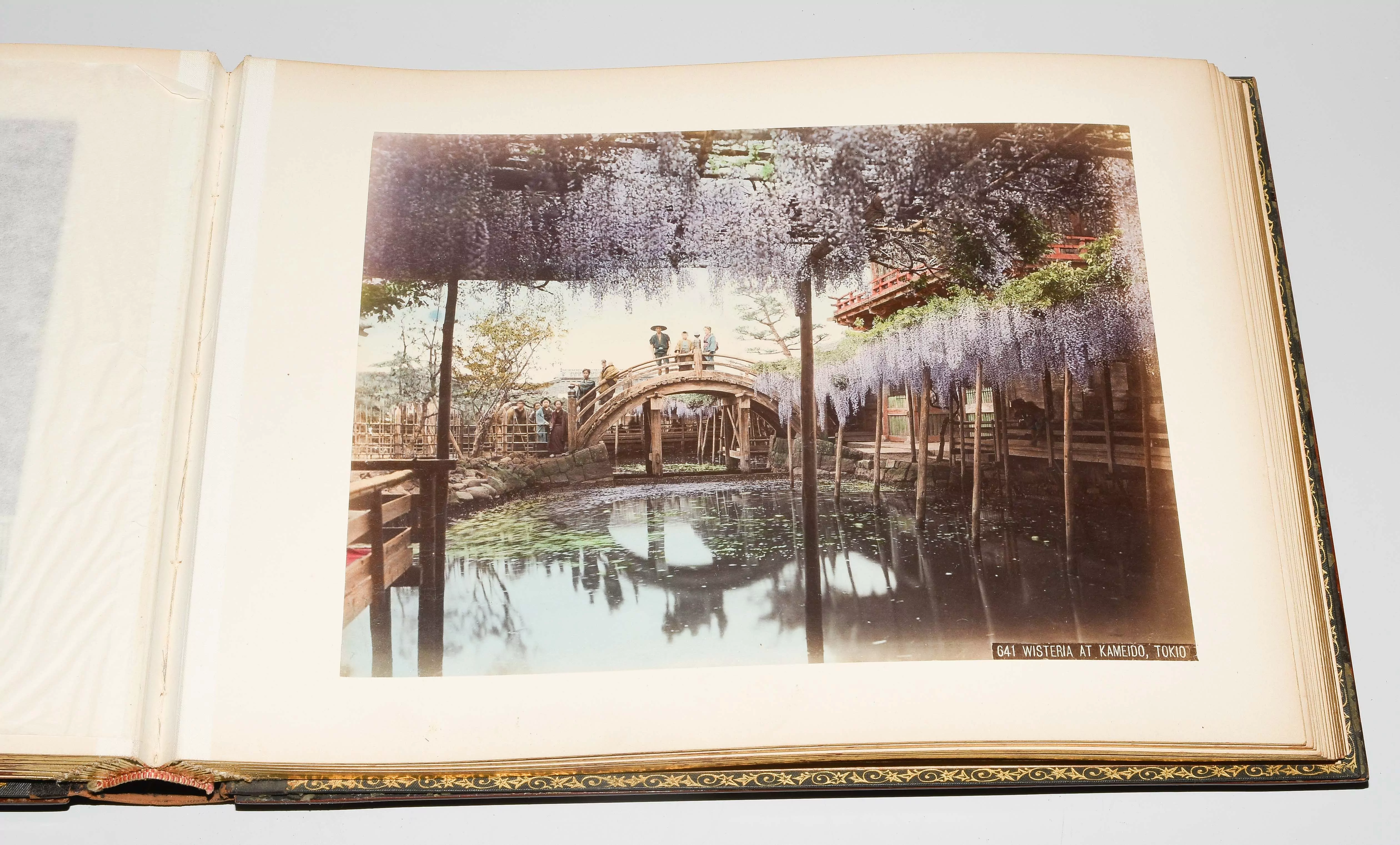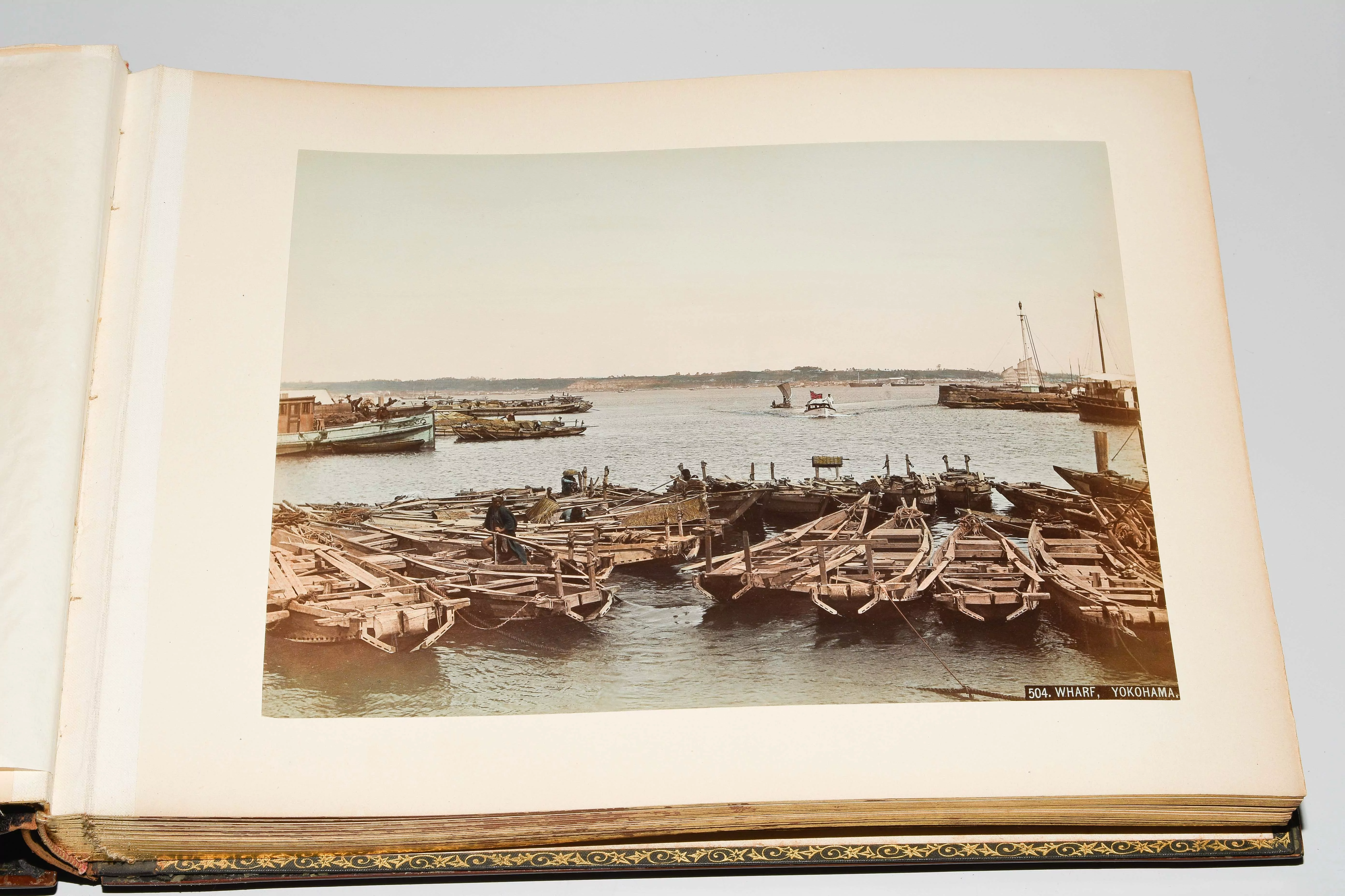 Japan, um 1880. Insgesamt 50 handkolorierte Fotos. Portraitdarstellungen sowie Ansichten des ländlichen und städtischen Japans. Je 26,5x20 cm. In dekorativem Lack-Fotoalbum mit Perlmuttdekor, brauner Lederrücken. Ca. 36x27x6 cm. Auf Innenseite Stempel von K Kimbei, Yokohama.