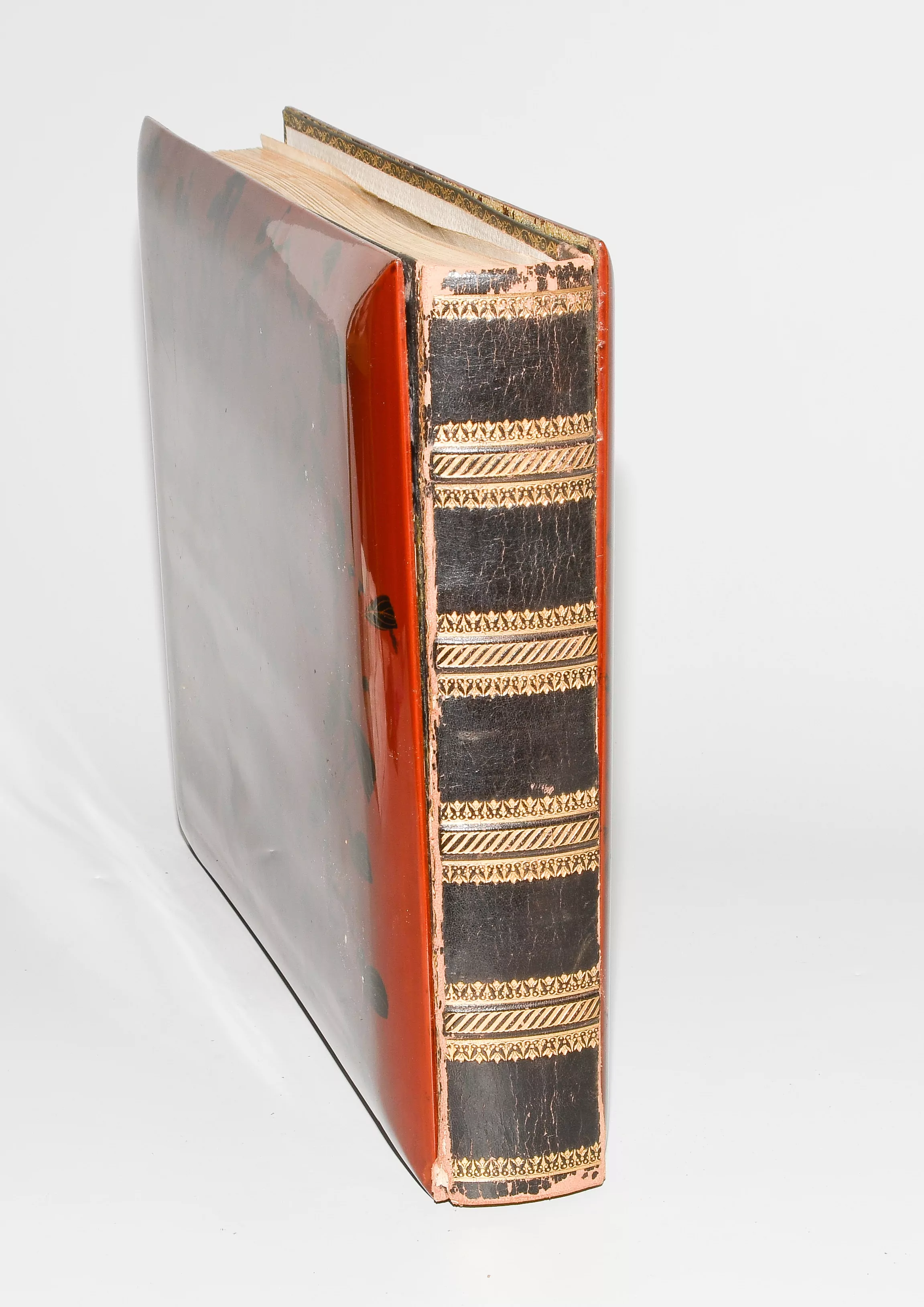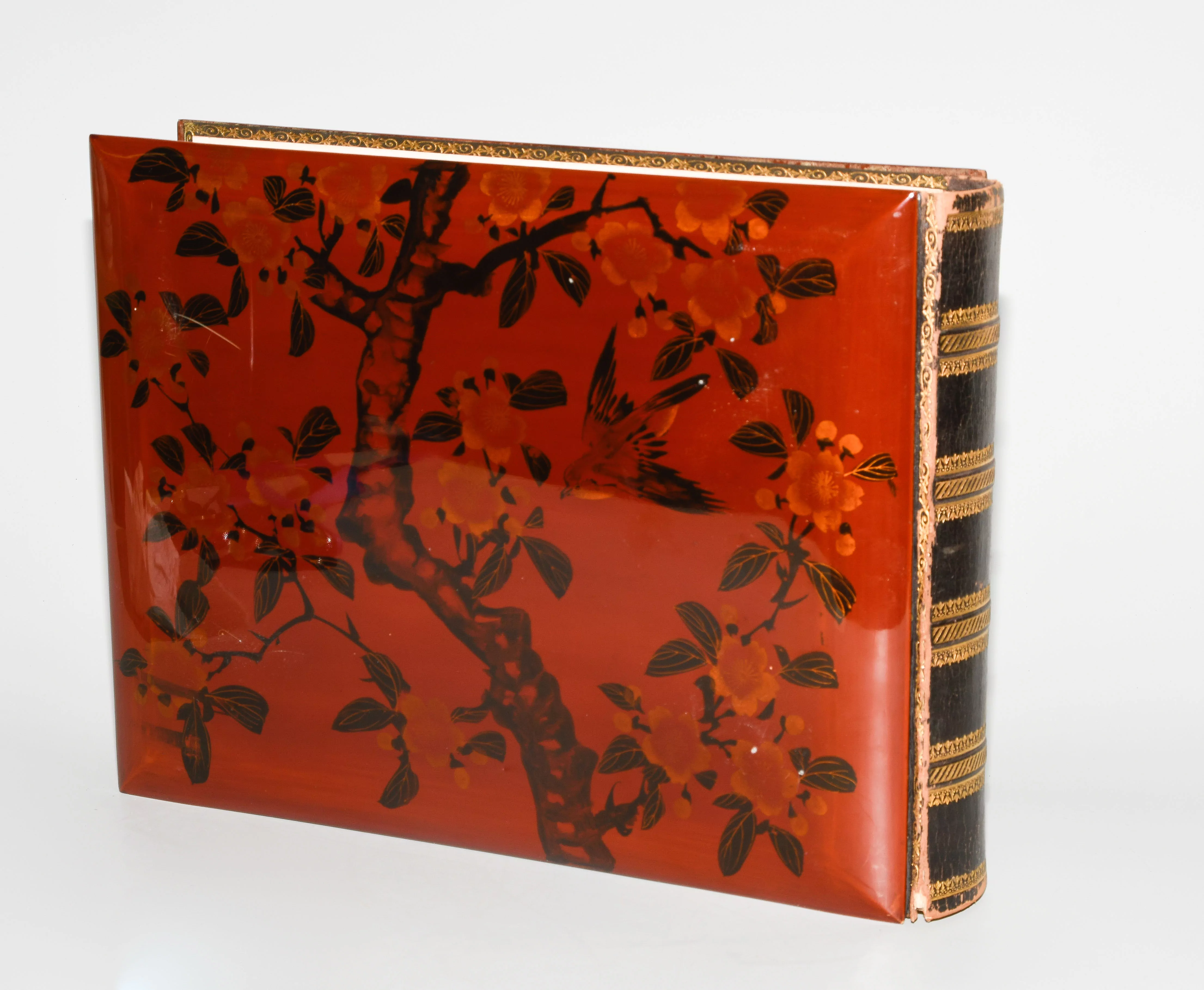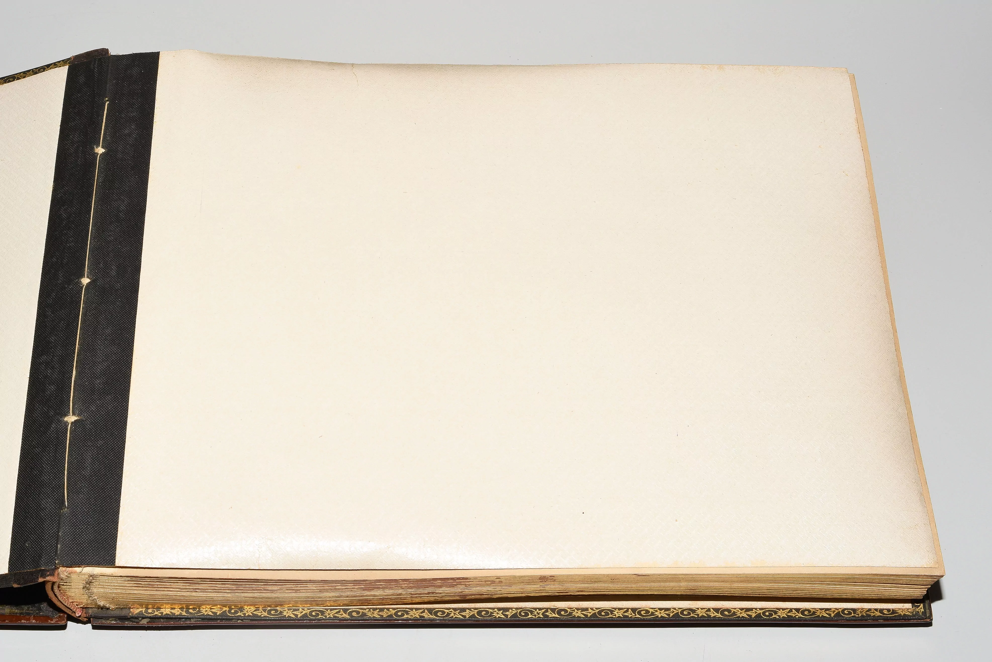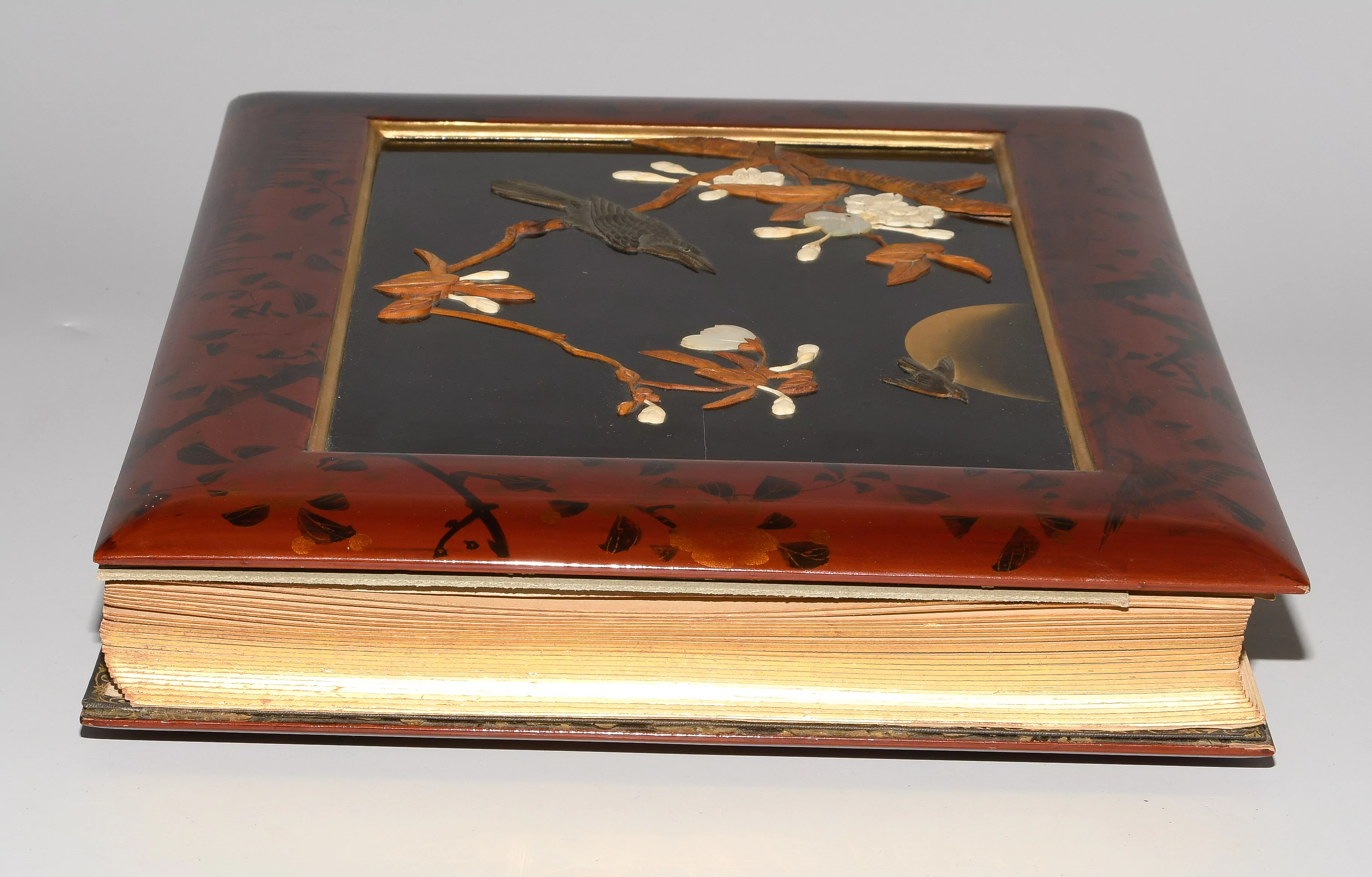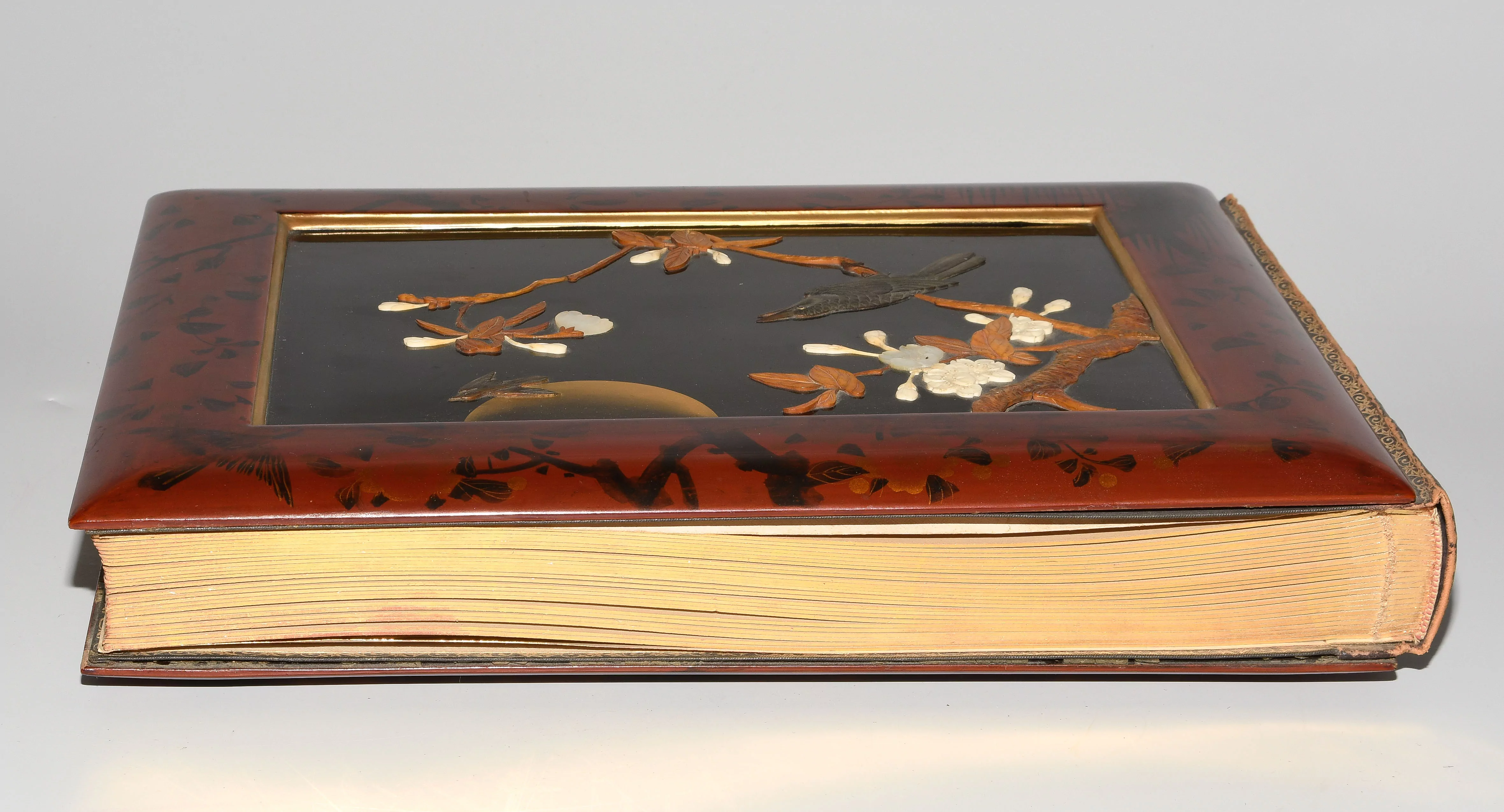 Japan, um 1880. Insgesamt 50 handkolorierte Fotos. Portraitdarstellungen sowie Ansichten des ländlichen und städtischen Japans. Je 26,5x20 cm. In dekorativem Lack-Fotoalbum mit Perlmuttdekor, brauner Lederrücken. Ca. 36x27x6 cm. Auf Innenseite Stempel von K Kimbei, Yokohama.