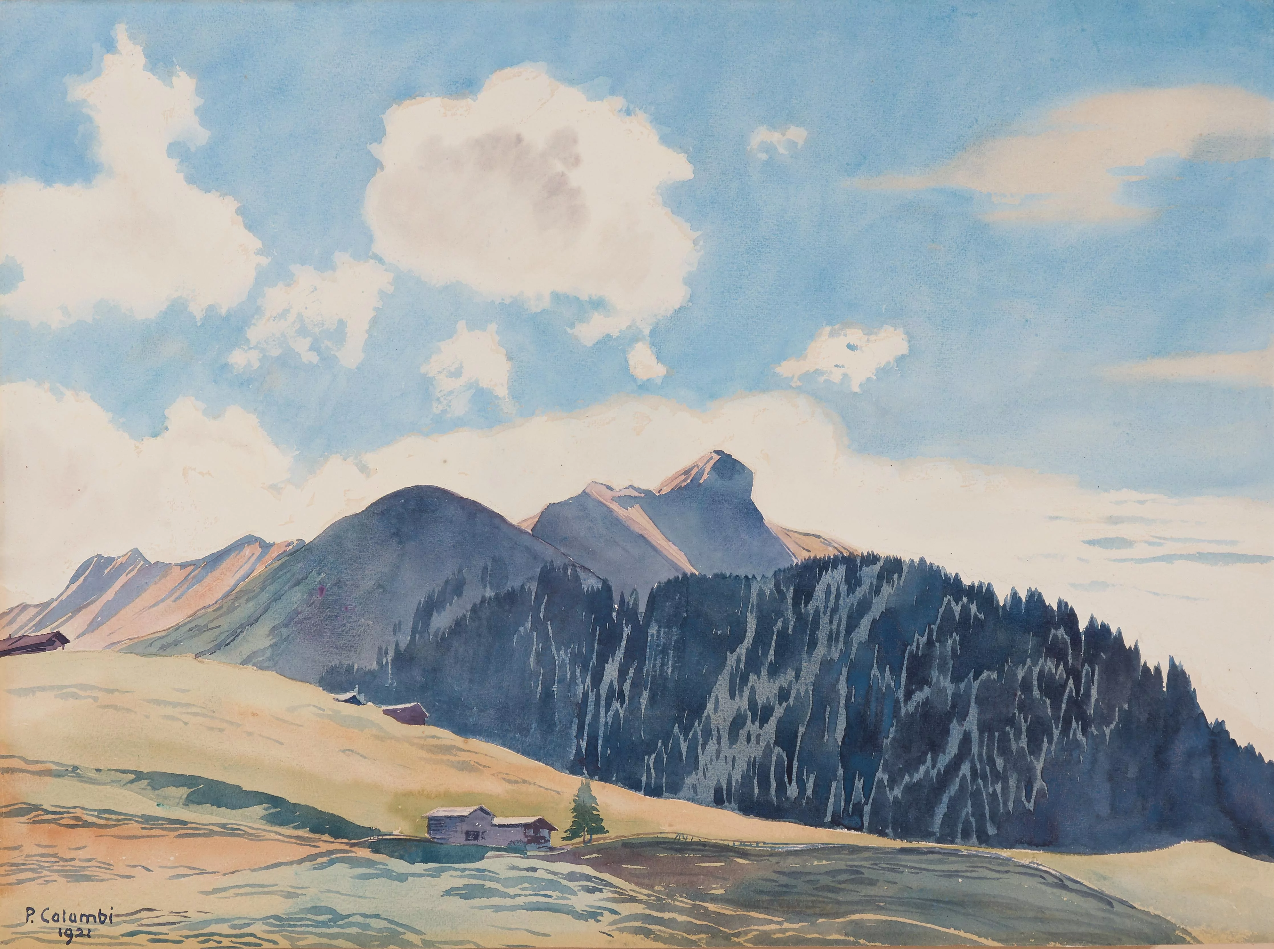 Berglandschaft. 1921. Aquarell auf Papier. Unten links signiert und datiert. Blattgrösse 51,7x69,9 cm. Gerahmt.