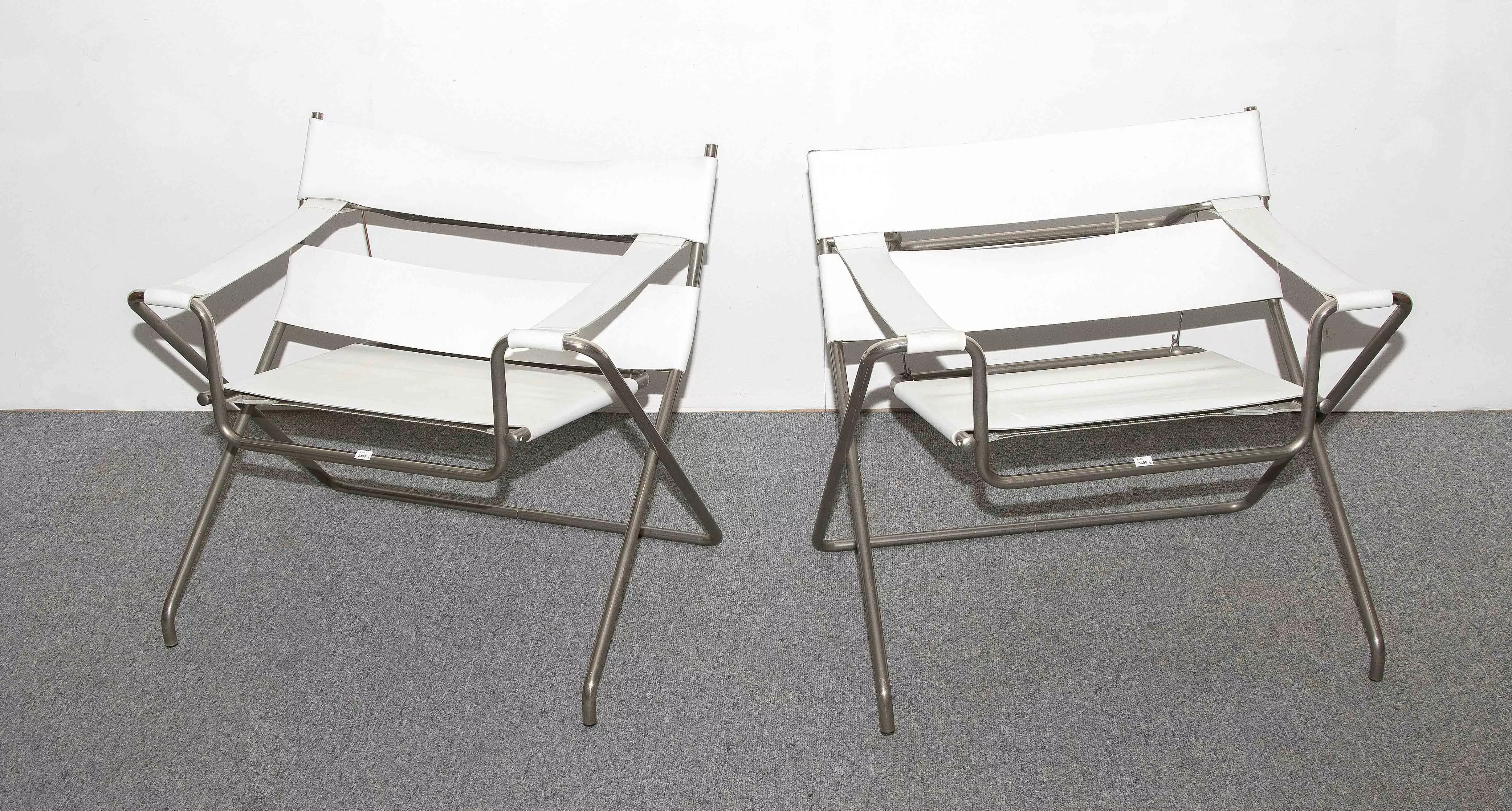 Entwurf von 1926/27 für Standard-Möbel, Berlin. Lizenzierte Reedition von Tecta (Modell "D4") ab 1981. Klappbares Gestell aus verchromtem Stahlrohr. Bespannung aus weissem Leder. Sitzhöhe 40 cm. 78x57x67,5 cm.