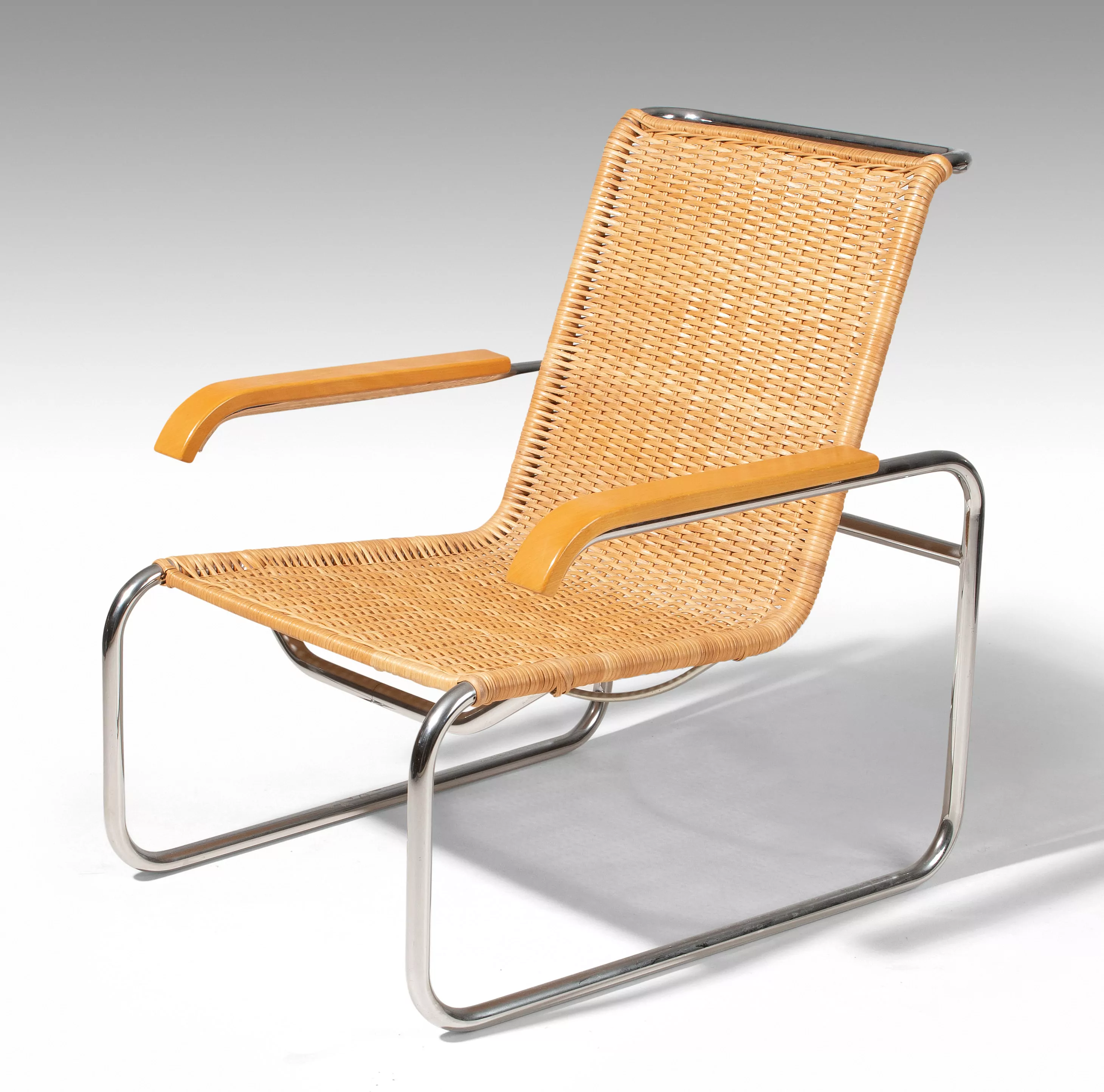 Entwurf von 1929 für Standard-Möbel, Berlin. Ausführung von Thonet, 2.Hälfte 20.Jh. Verchromtes Stahlrohrgestell mit Rohrgeflecht, Armlehnen aus Holz. Herstelleretikett. Sitzhöhe 37 cm. 64,5x79x82 cm.