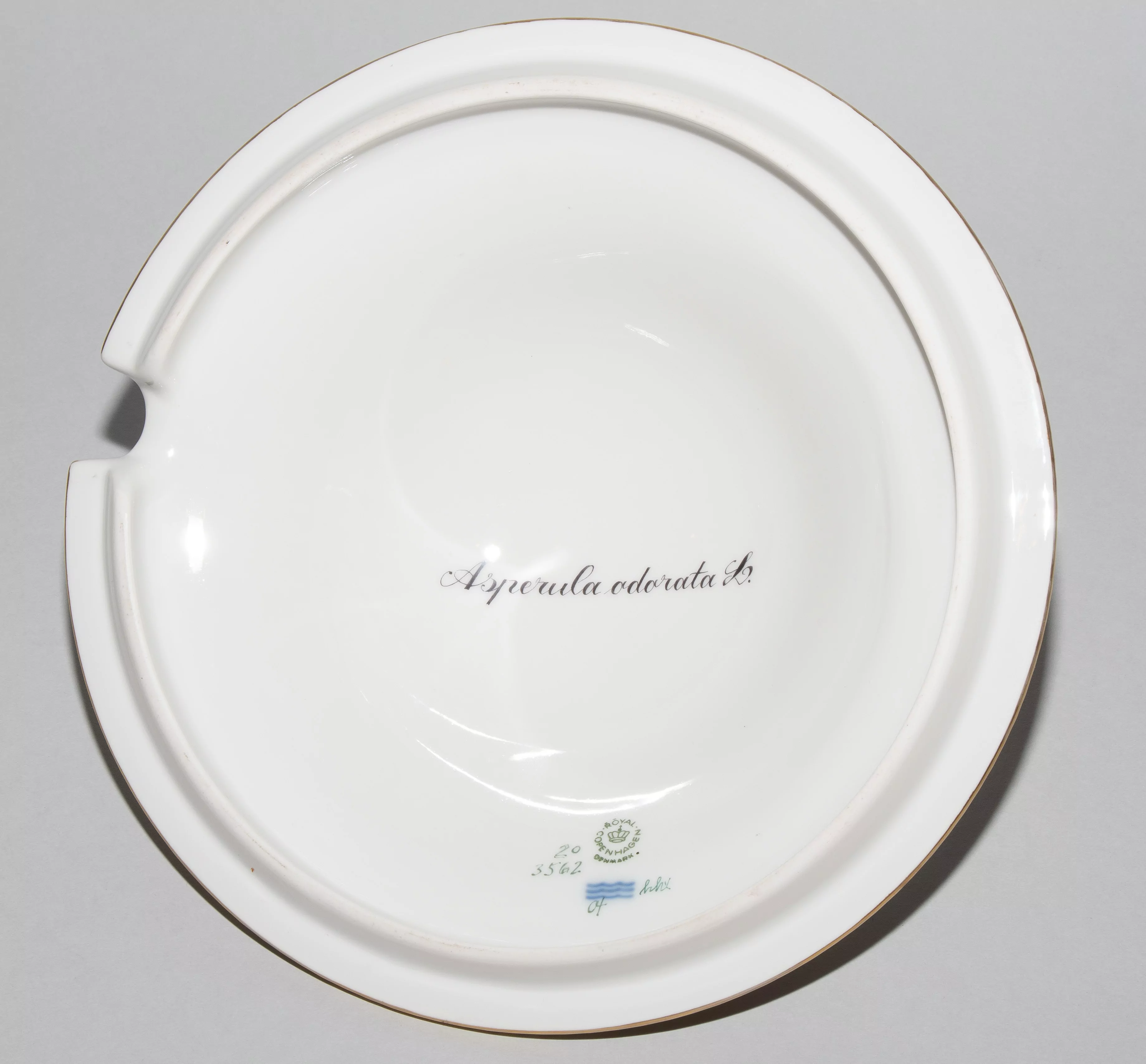 1935. Porzellan. Pflanzendarstellung in polychromer Aufglasurmalerei. Goldstaffierung. Reliefierter Rand. Henkel und Knauf in Form eines Rosenzweigs. Auf Deckel bezeichnet "Asperula odorata L." Auf der Rückseite "Dracocephalum ruyschiana L. " und "Ranunculus philonotis Ehrh.". Manufakturmarke, grüne Nummern 20, 3562. H 24,5 bzw. D 29 (mit Henkel) und 25 (ohne Henkel) cm.