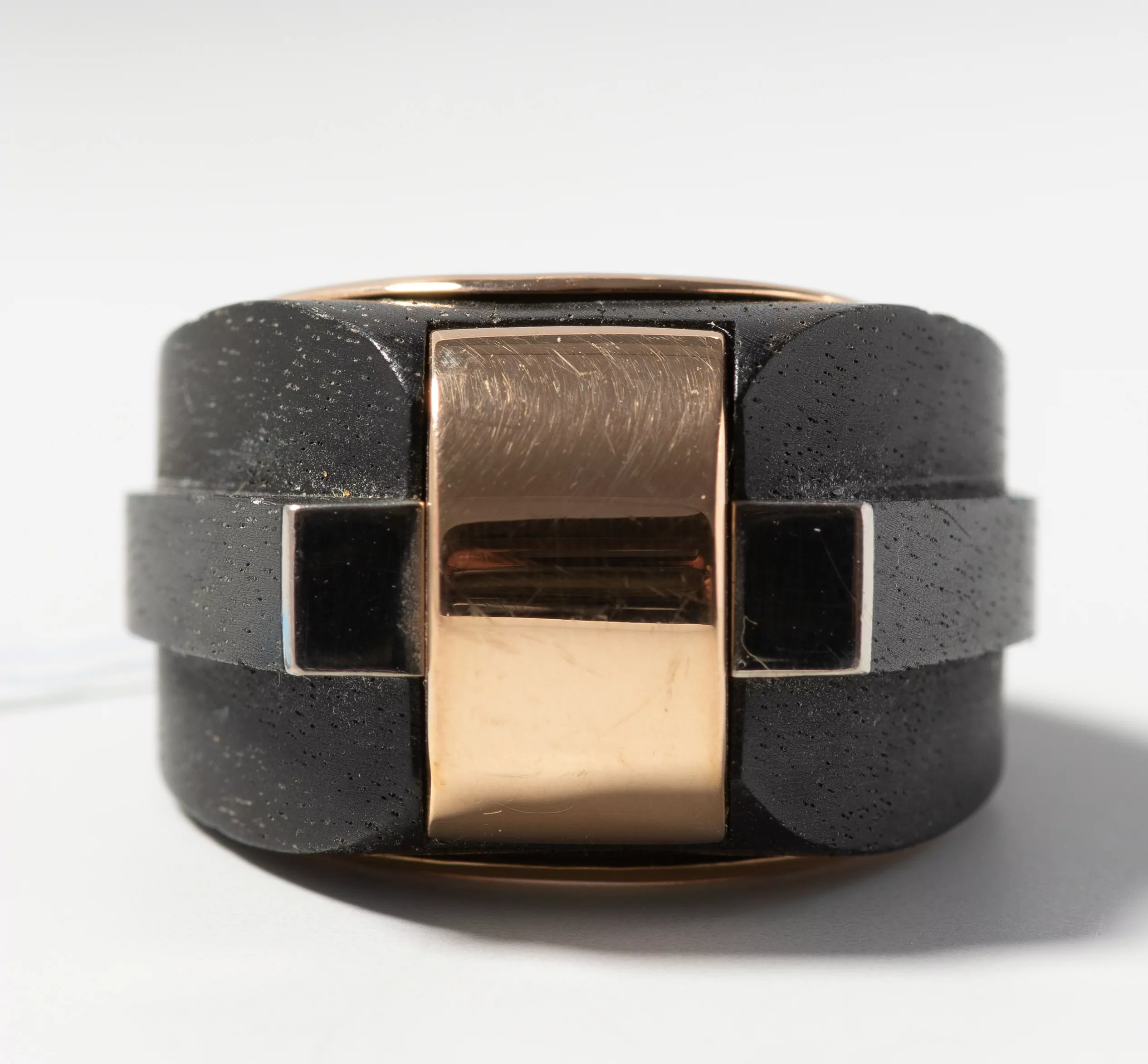Signiert "Koenig". 750 Rosé-/Weissgold, Innenfutter Roségold. Gestufter Ring aus Ebenholz. Gr. 59, 16 g.