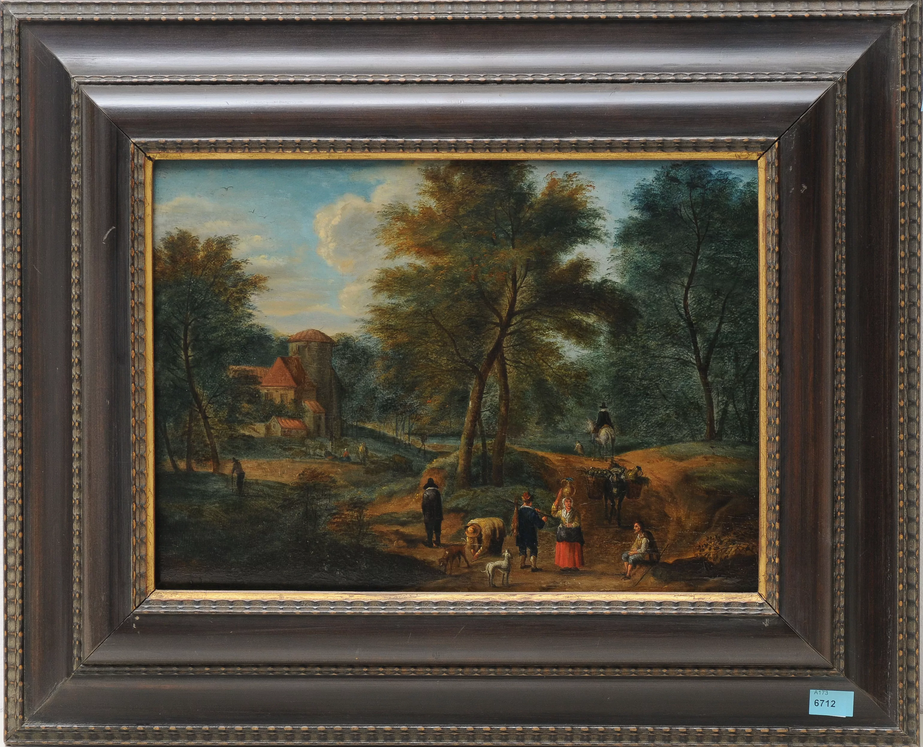 Landschaft mit Lastesel und Staffage. Öl auf Holz. 26x36 cm. Gerahmt.