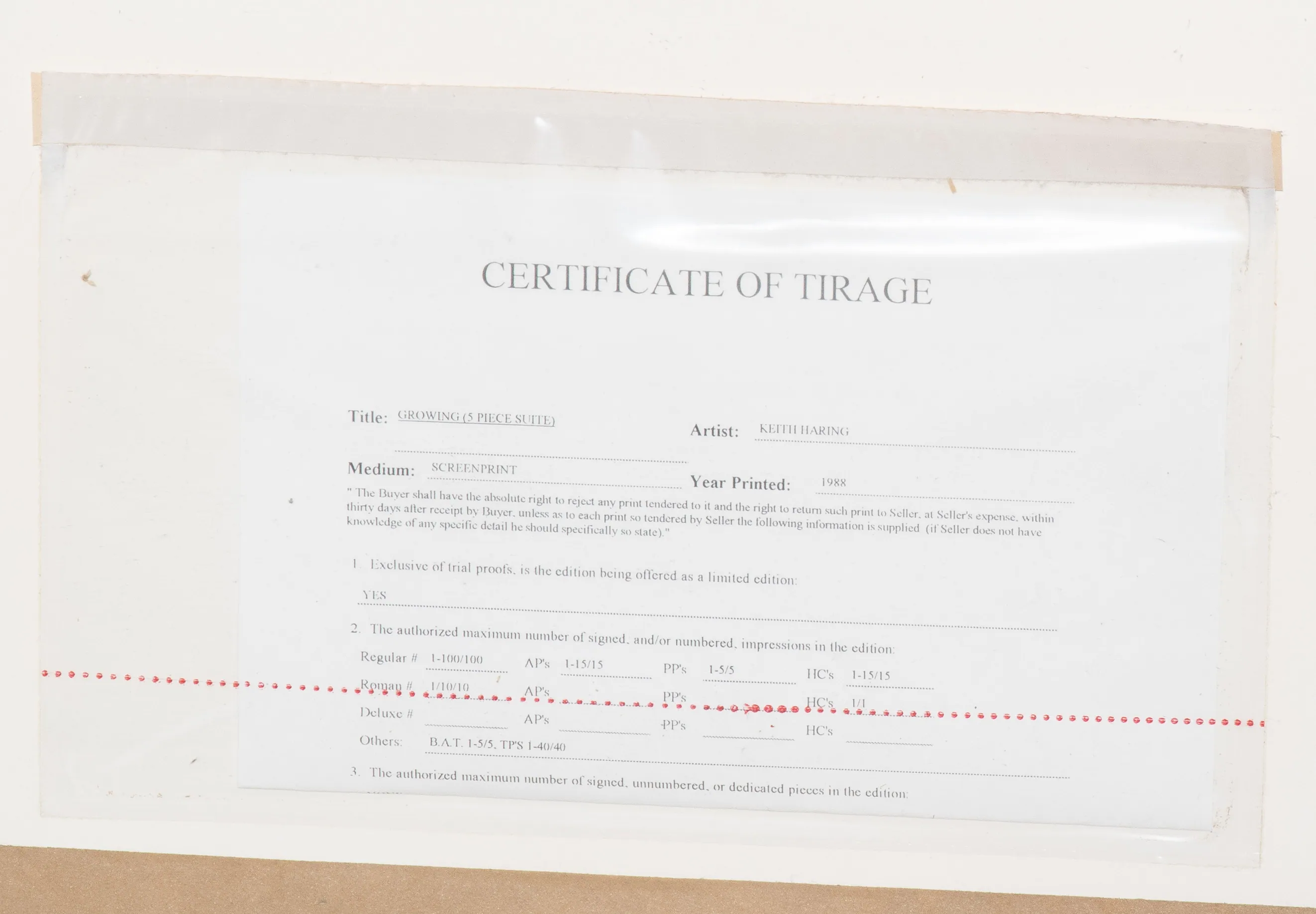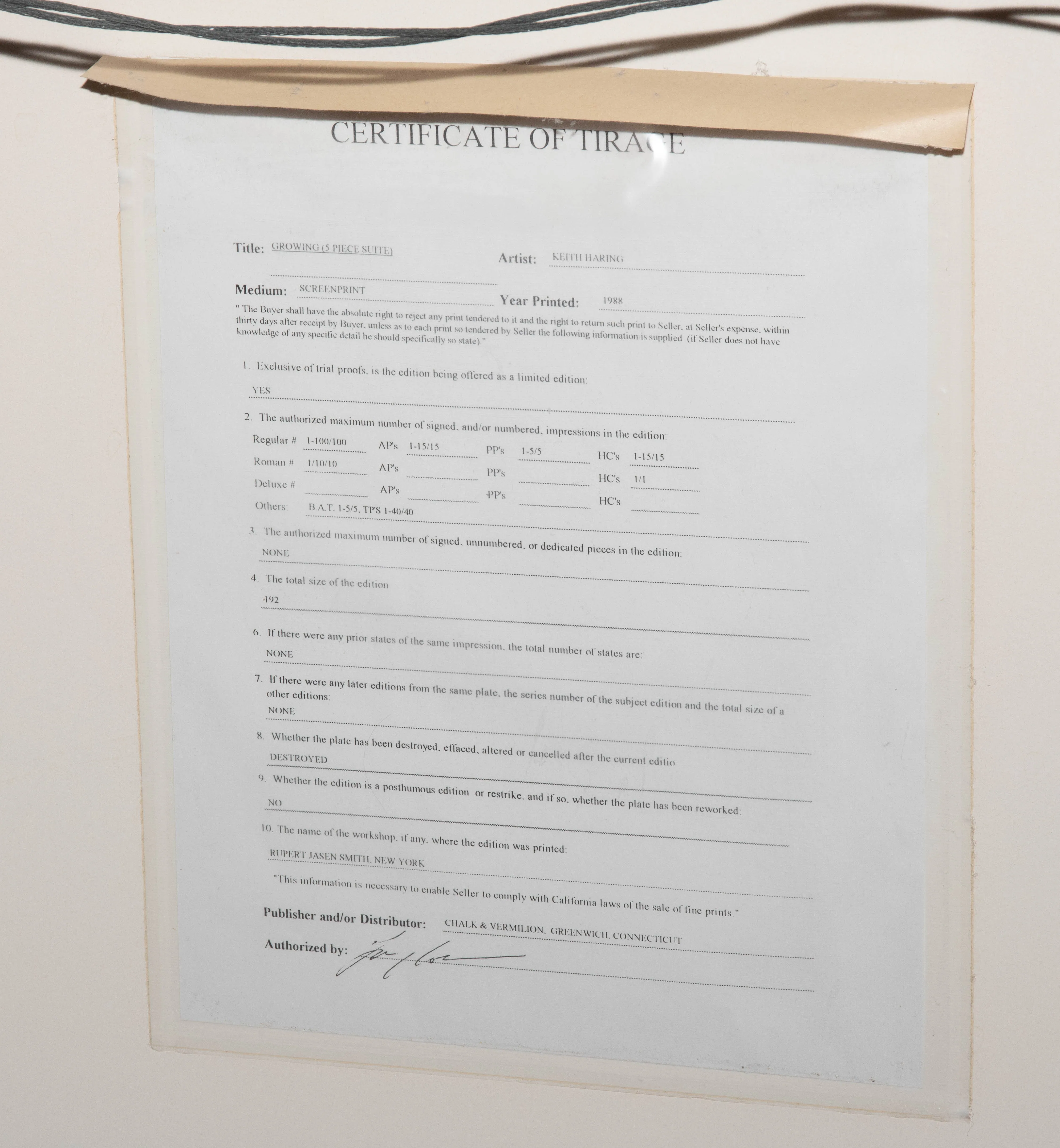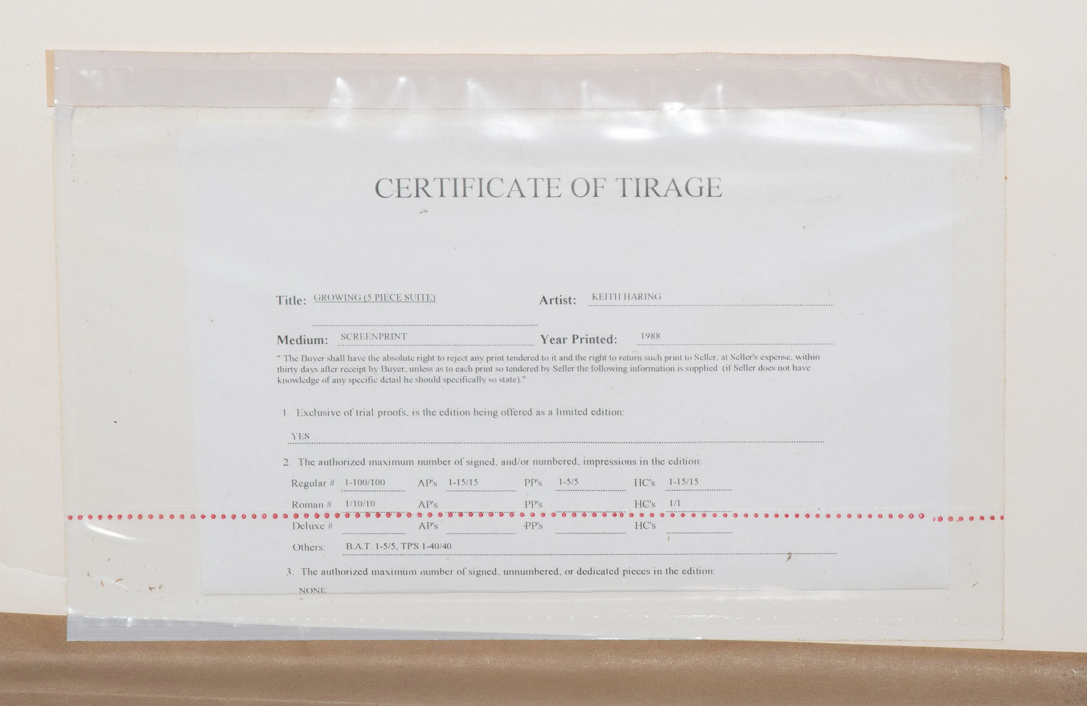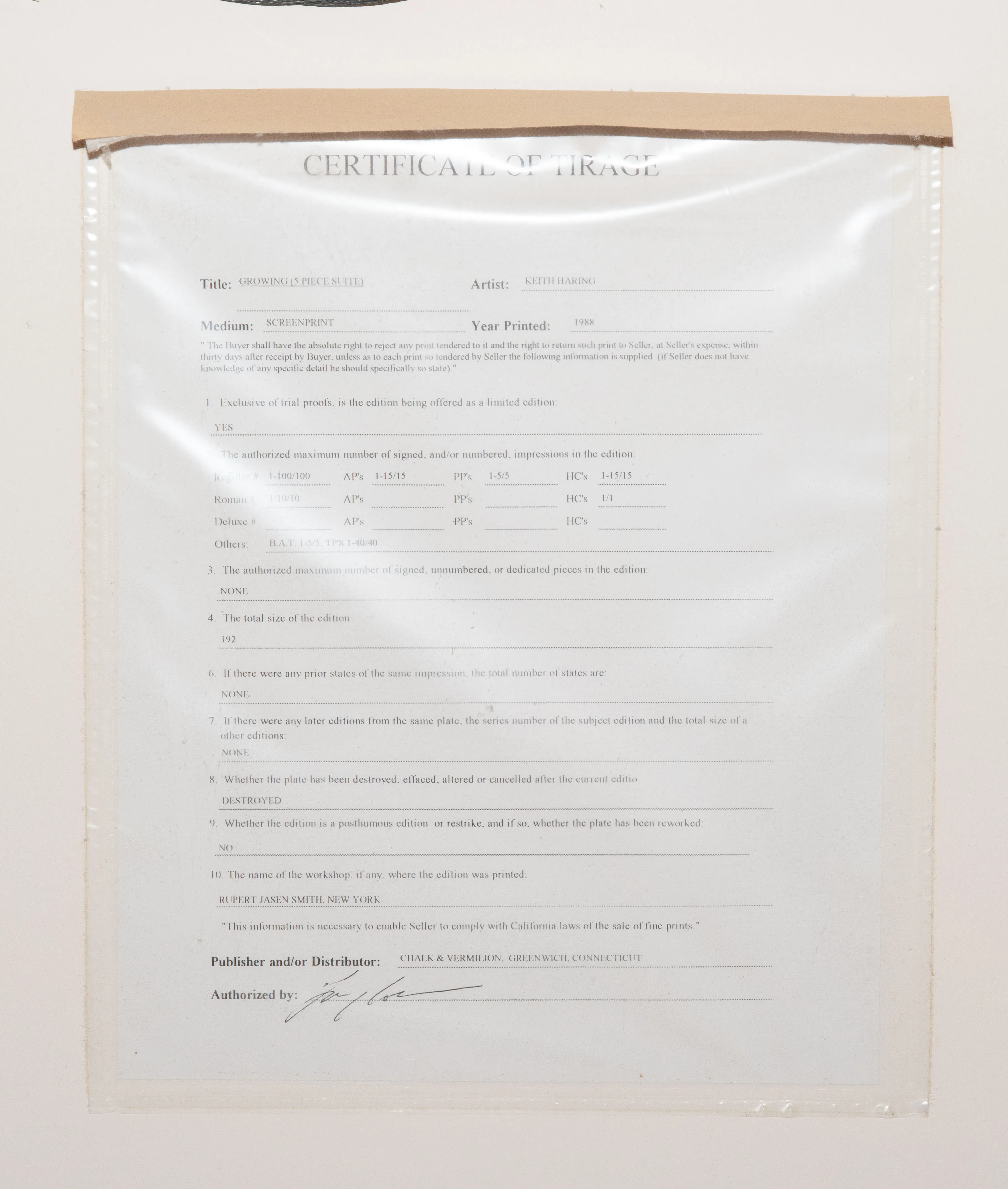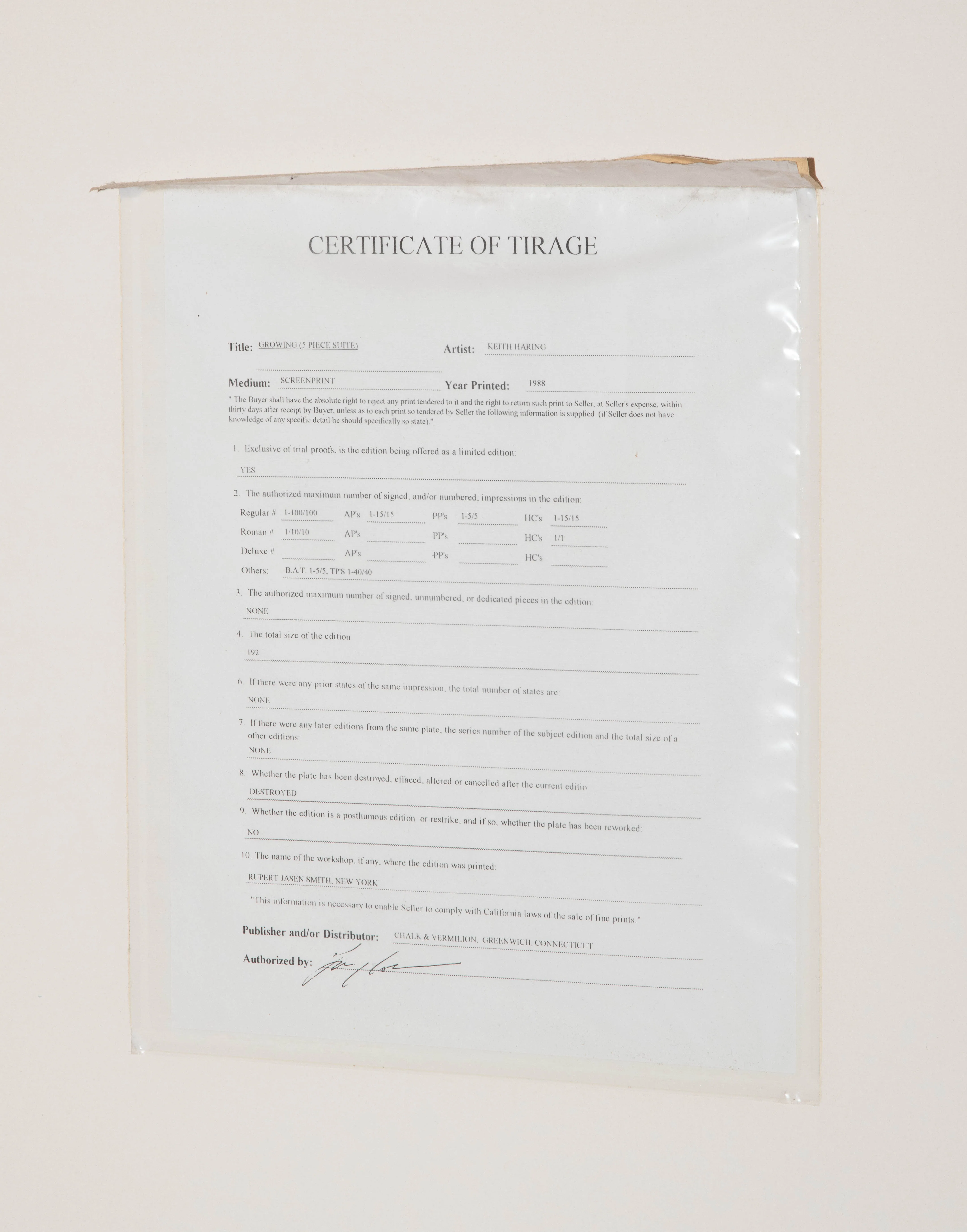 Growing # 1-5. 1988. Lot von 5 Farbserigrafien. BAT 2/5. Alle Blätter signiert und datiert. Alle unten links mit Prägestempel von Rupert Jasen Smith und "MLLE © 1988". Alle verso mit Etikett der Martin Lawrence Limited Editions, Inc. Blattgrösse je 76x102 bzw. 102x76 cm. Alle gerahmt.